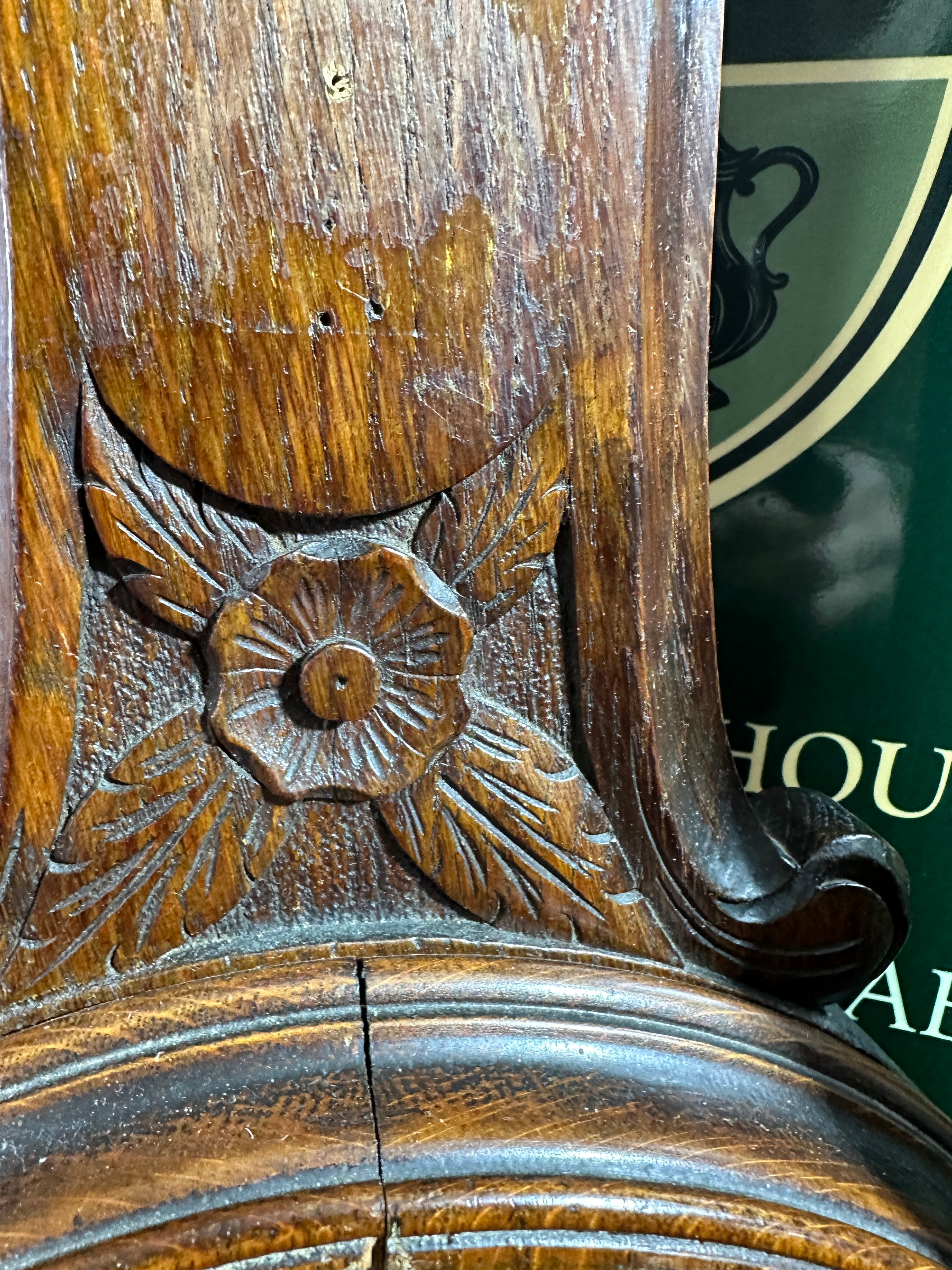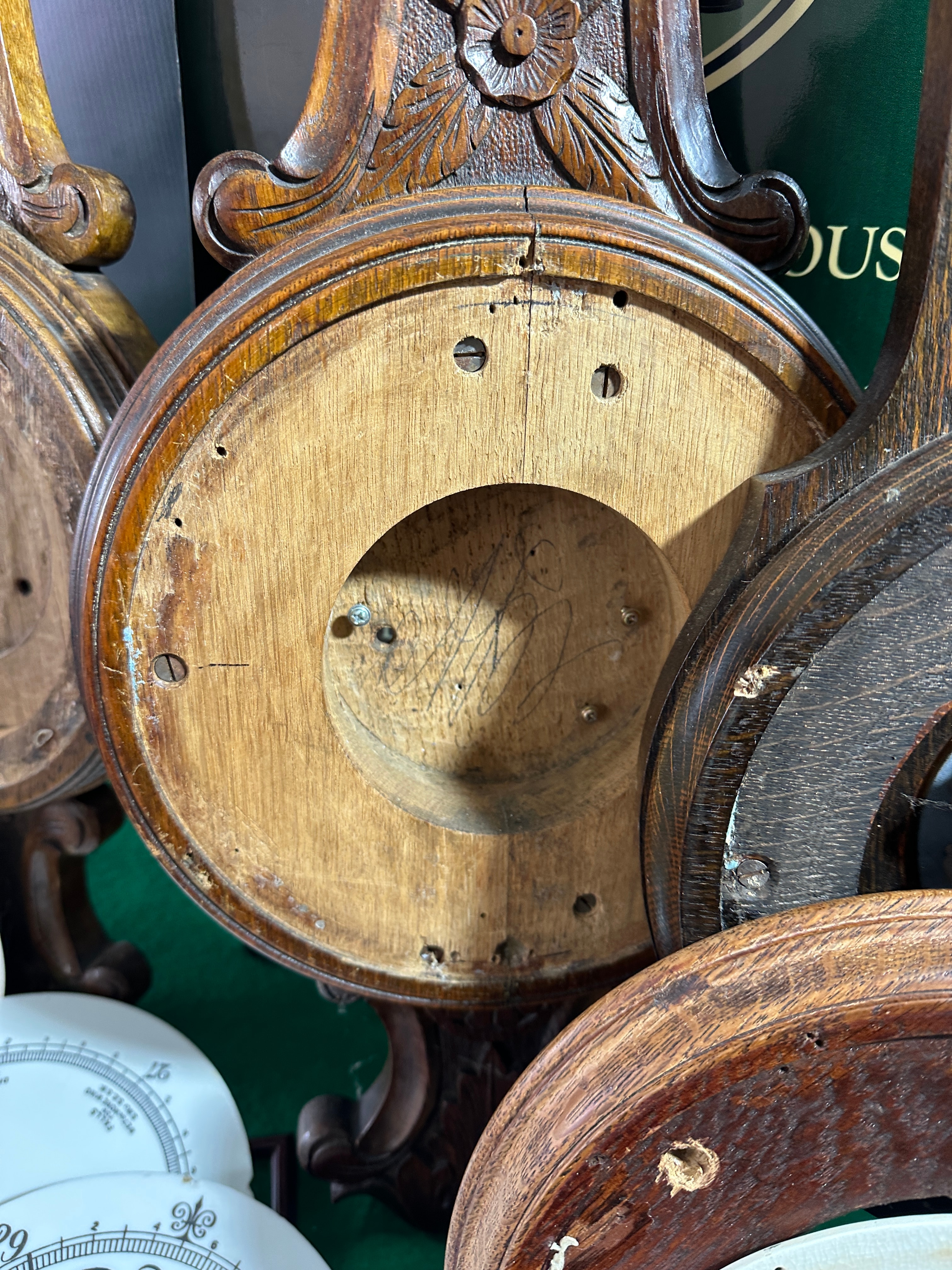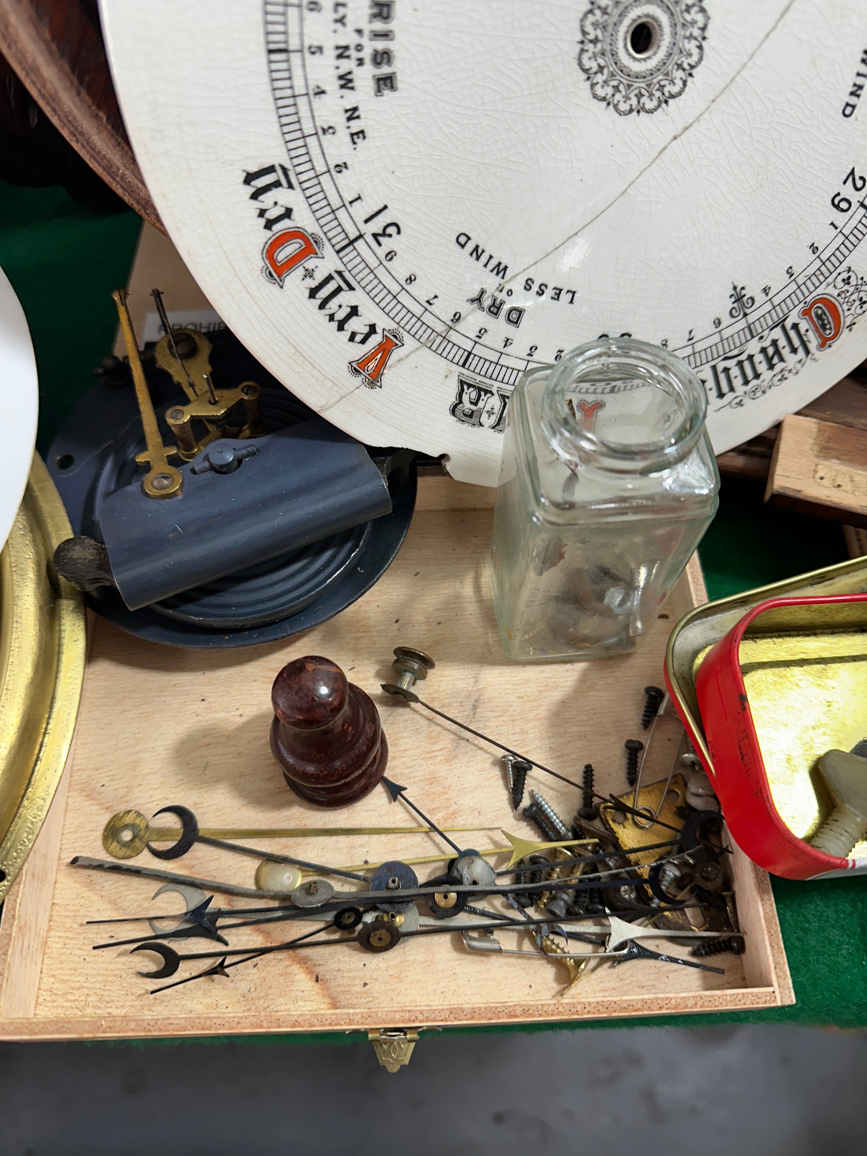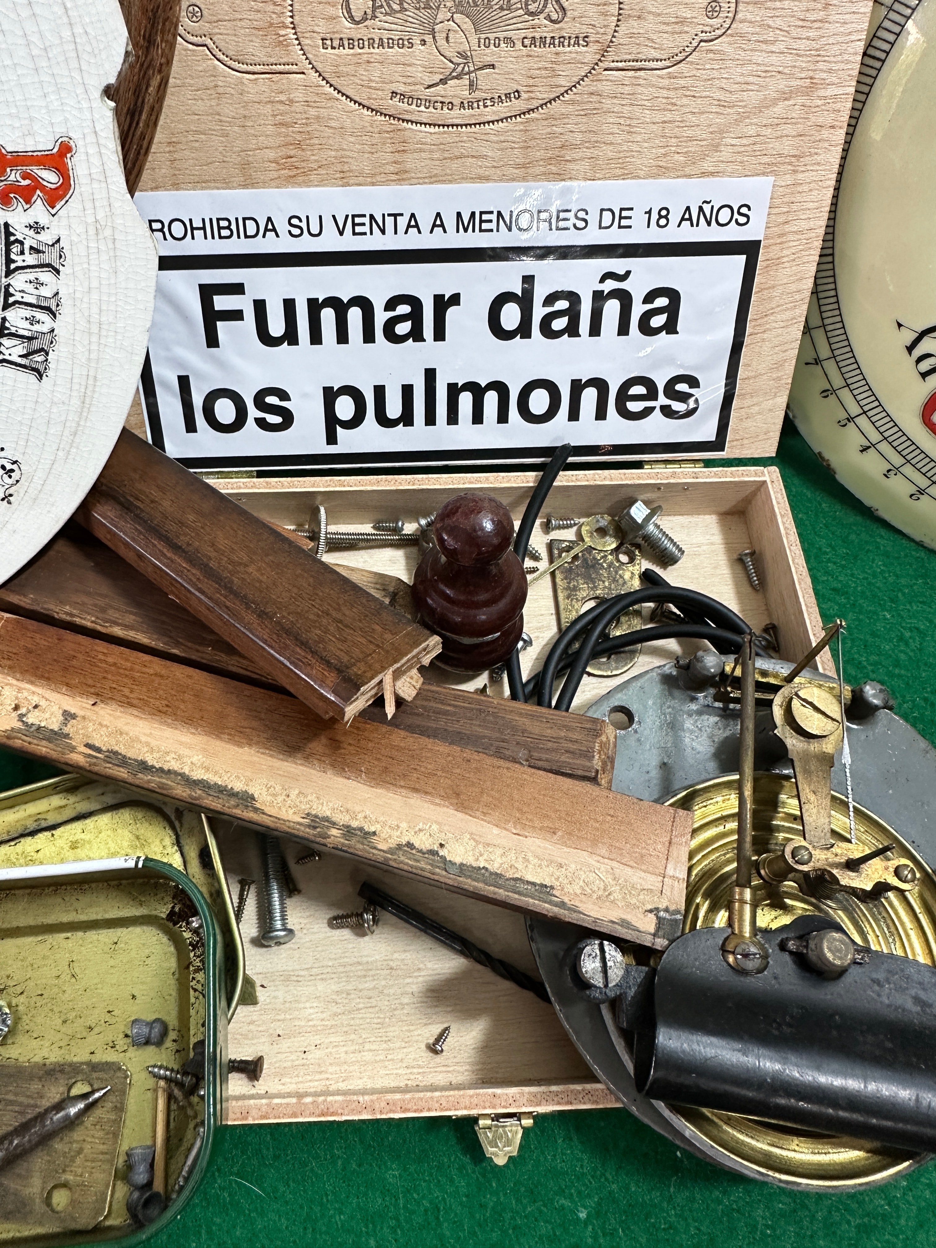 This lot comprises a collection of disassembled aneroid barometer components. It includes at least four ornate, carved wooden wall-mount backings, likely dating from the late 19th to early 20th-century, featuring decorative scrolling and foliate motifs in dark-stained hardwood. Accompanying these are numerous circular white enamel or porcelain dials, some marked “MADE IN ENGLAND,” displaying meteorological terms such as “RAIN,” “Stormy,” “Changeable,” “FAIR,” “Very Dry,” and pressure scales ranging from approximately 28 to 31 inches, with additional indicators for “RISE,” “FALL,” and wind directions. Further components include several brass bezels, a small aneroid mechanism visible within one wooden backing, and a wooden tray containing miscellaneous parts such as various barometer/clock hands, screws, small weights, a glass jar, and a red metal tin. A wooden cigar box, marked in Spanish “ELABORADOS A MANO 100% CANARIAS” (Handmade 100% Canary Islands) and bearing a warning “Fumar daña los pulmones” (Smoking damages the lungs), also holds some parts.