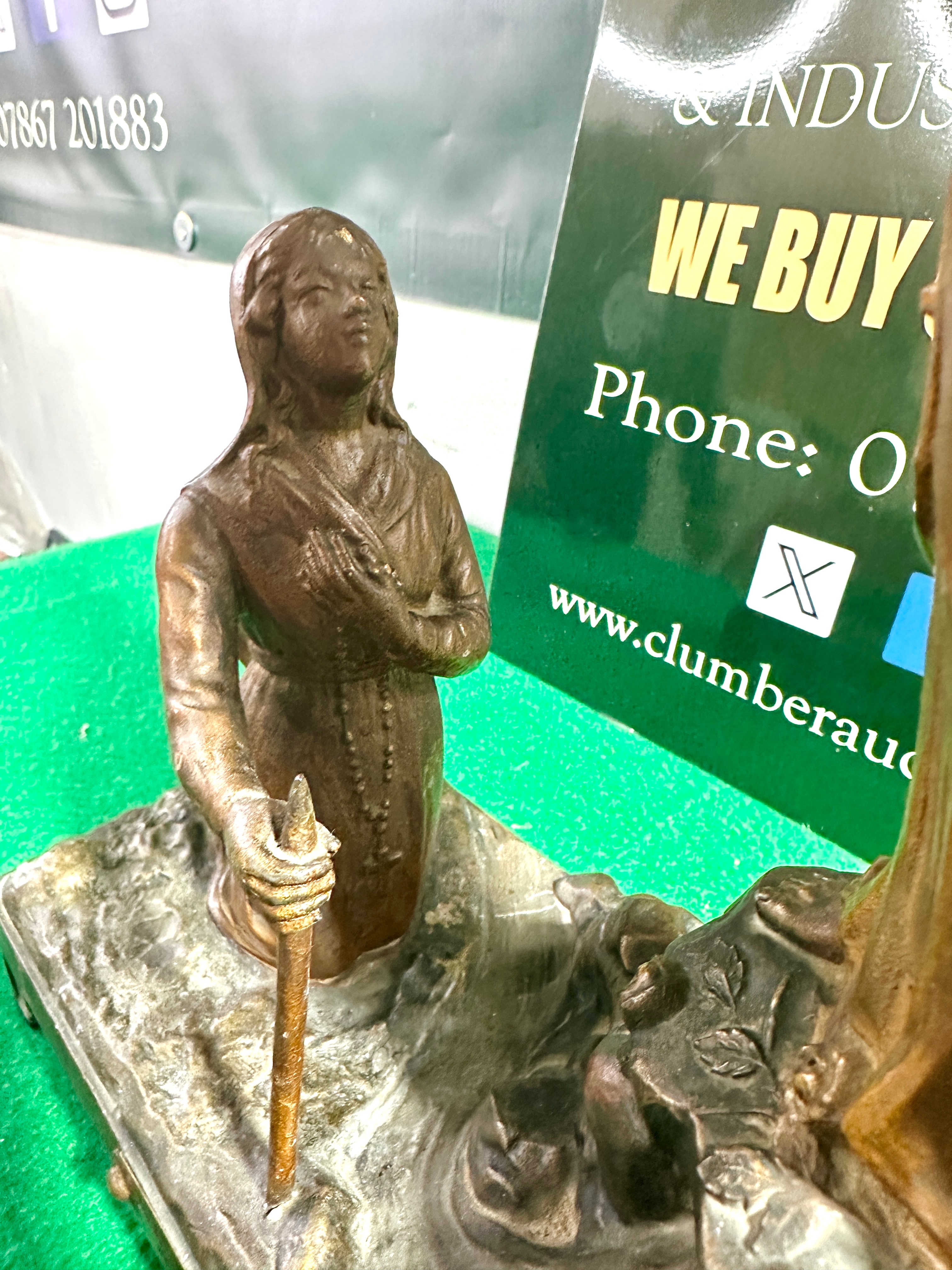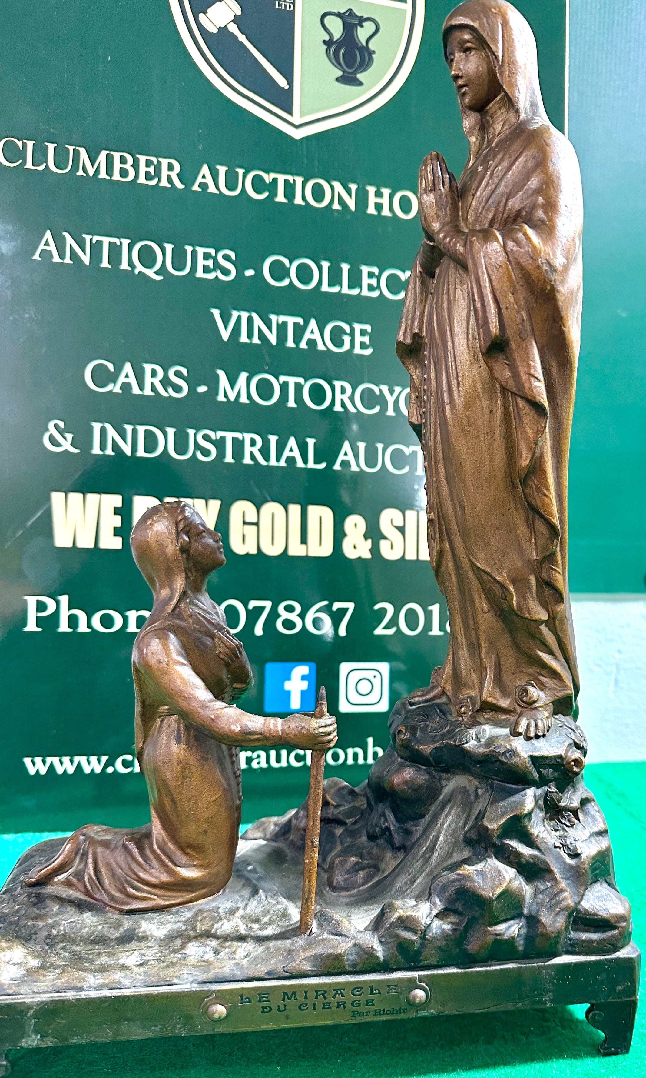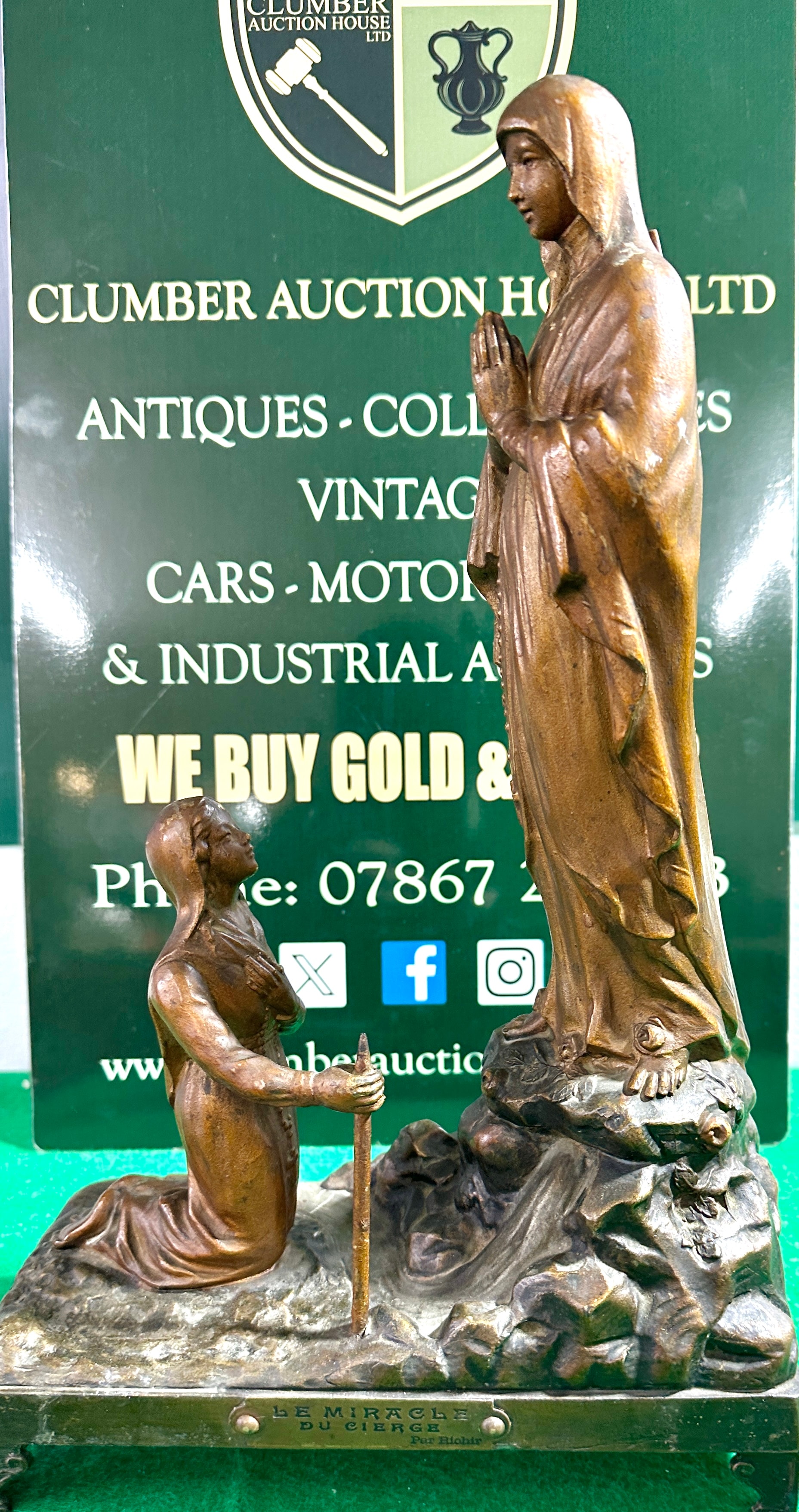 An Art Nouveau cast bronze sculpture depicting the apparition of Our Lady of Lourdes, often incorporating a music box mechanism. The sculpture features a taller, standing figure of the Virgin Mary, heavily draped with hands clasped in prayer, standing upon a rocky base. Kneeling before her on a rectangular plinth is a smaller figure, likely Saint Bernadette Soubirous, holding a staff or taper and looking upwards. The plinth bears the inscribed text: “LE MIRACLE DU CIERGE” (The Miracle of the Candle/Taper) and partially “Par B***”. Crafted in cast bronze, the item exhibits an aged patination consistent with its apparent material and age.