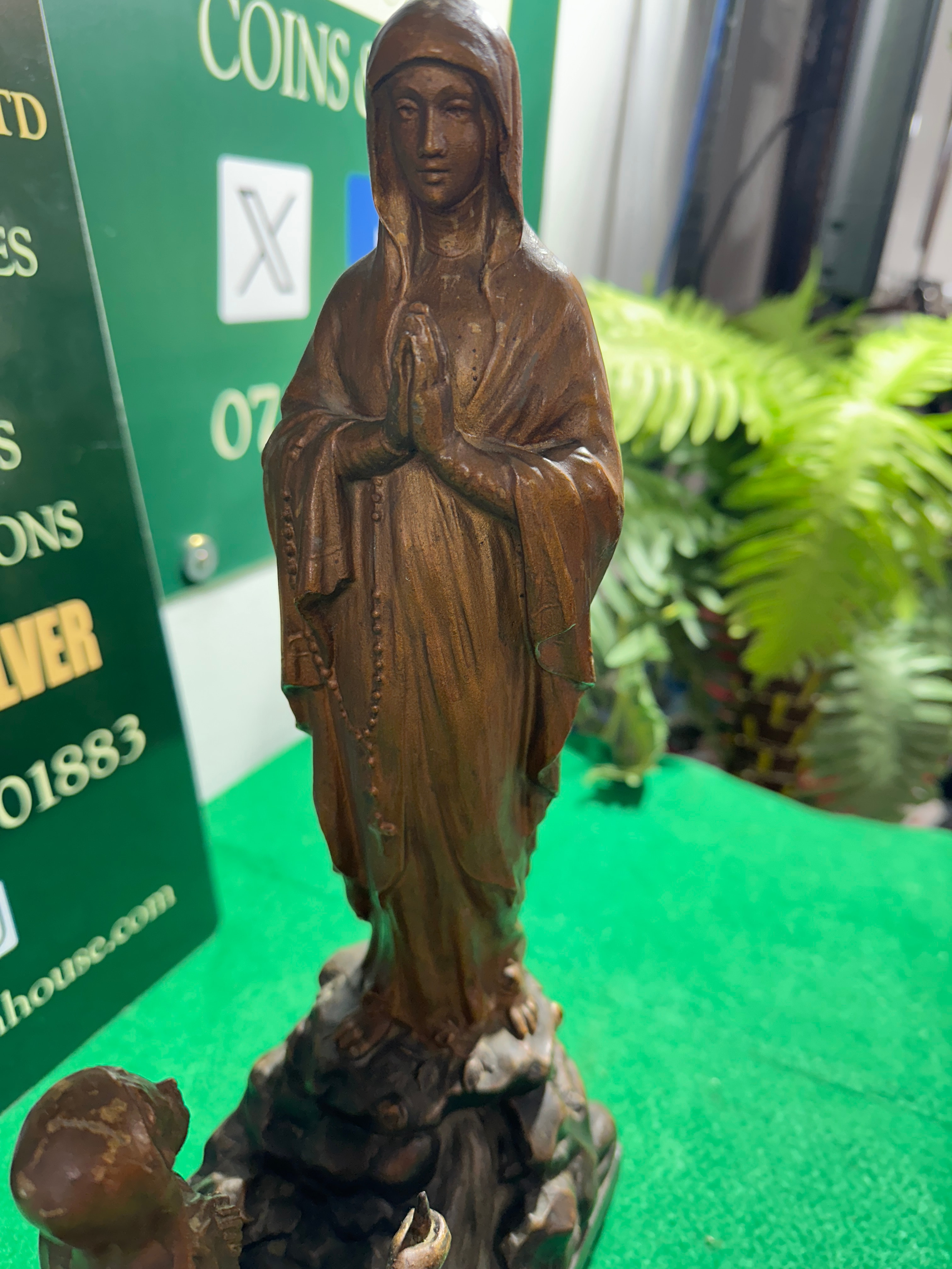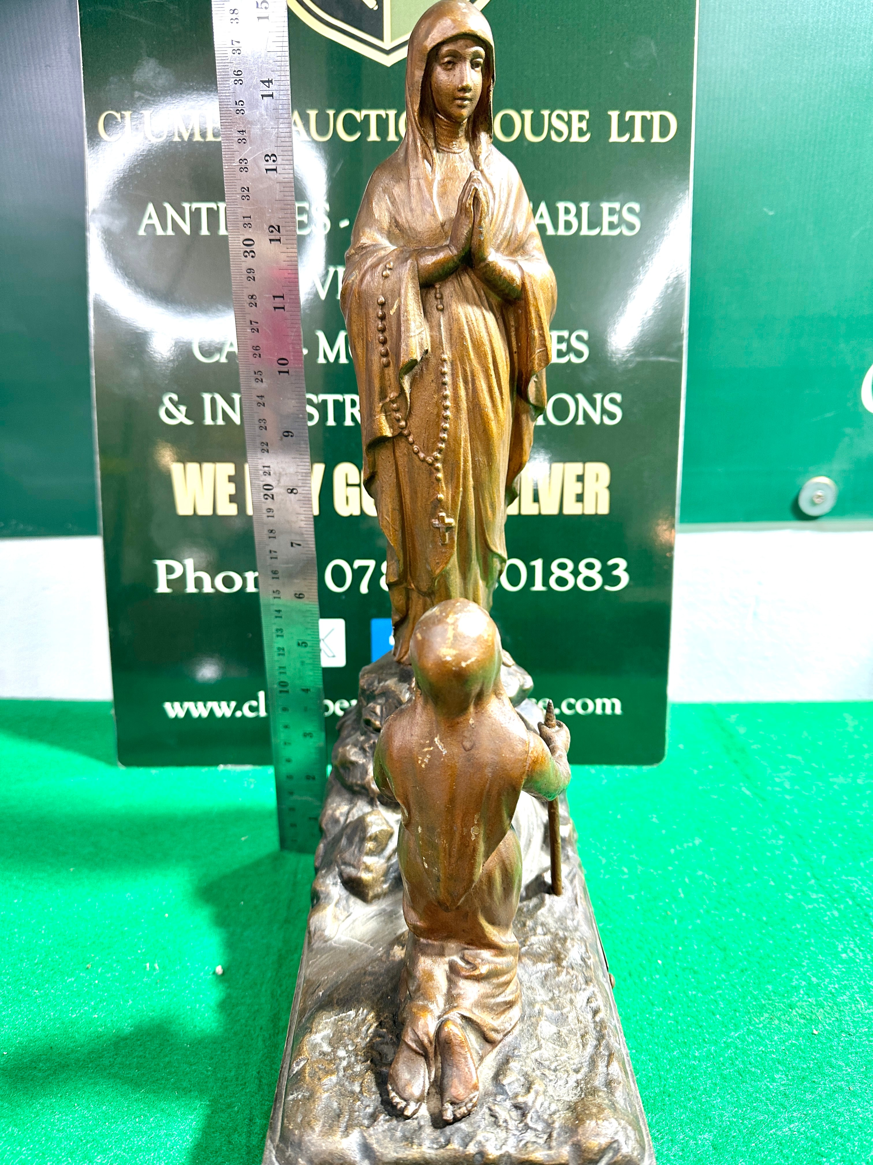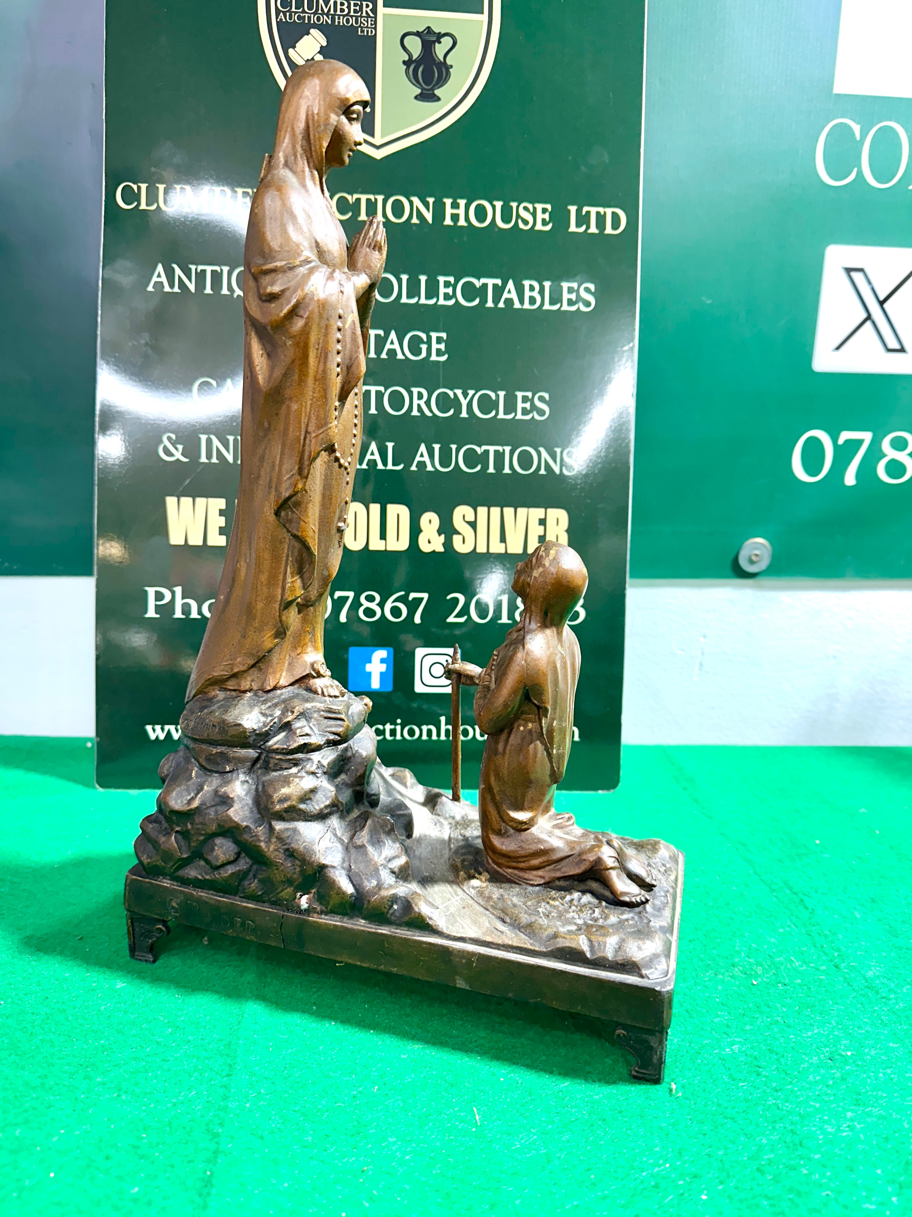 An Art Nouveau cast bronze sculpture depicting the apparition of Our Lady of Lourdes, often incorporating a music box mechanism. The sculpture features a taller, standing figure of the Virgin Mary, heavily draped with hands clasped in prayer, standing upon a rocky base. Kneeling before her on a rectangular plinth is a smaller figure, likely Saint Bernadette Soubirous, holding a staff or taper and looking upwards. The plinth bears the inscribed text: “LE MIRACLE DU CIERGE” (The Miracle of the Candle/Taper) and partially “Par B***”. Crafted in cast bronze, the item exhibits an aged patination consistent with its apparent material and age.
