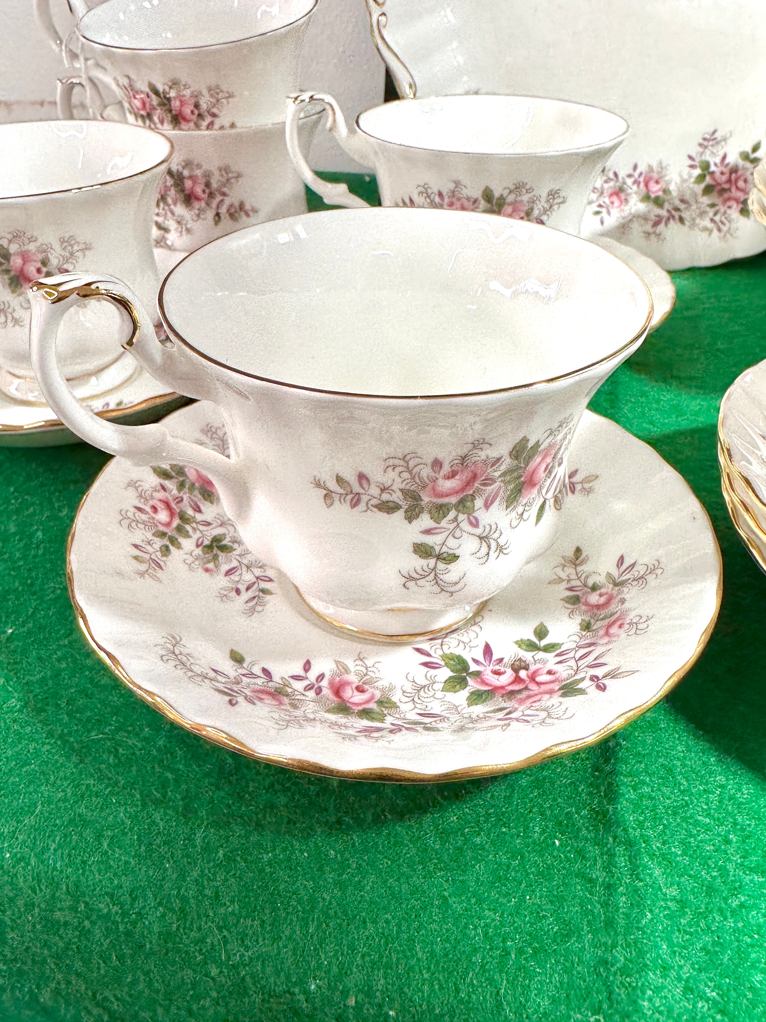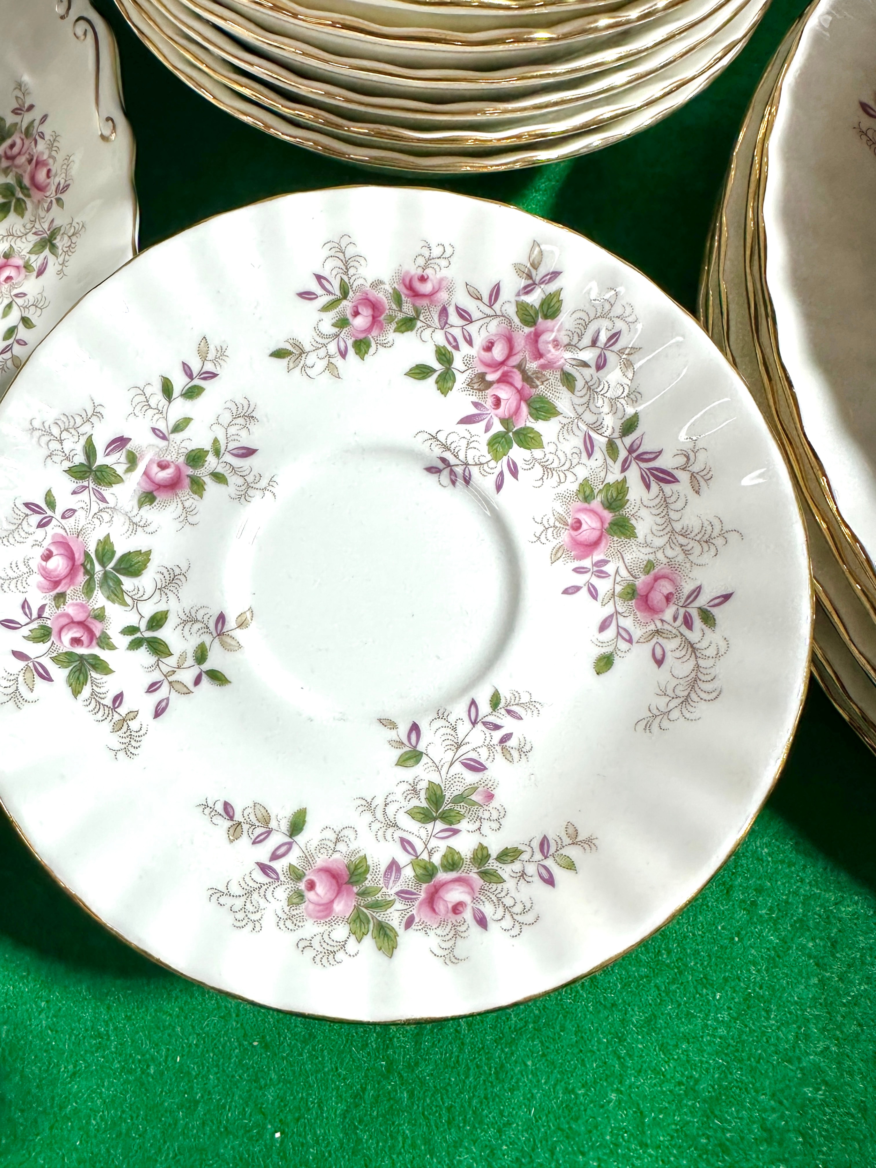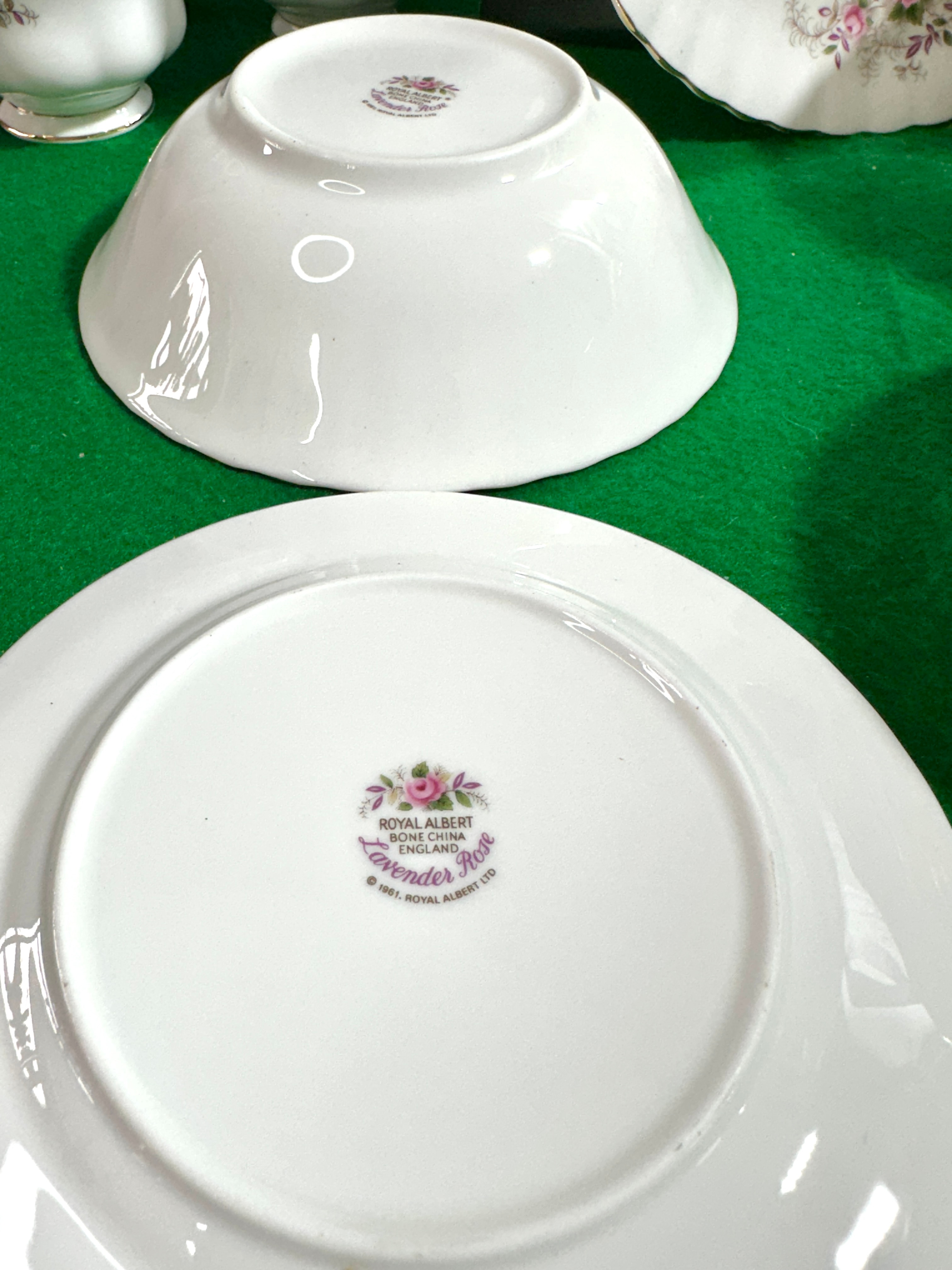 A large collection of Royal Albert ‘Lavender Rose’ pattern dinnerware and tea ware. Crafted from bone china in England, dated 1961. The pieces feature a classic aesthetic with a white ground, scalloped edges, delicate gold trim, and a transferware decoration of pink roses accompanied by green and purple foliage. The collection includes numerous tea cups, saucers, various sizes of dinner and side plates, and bowls.