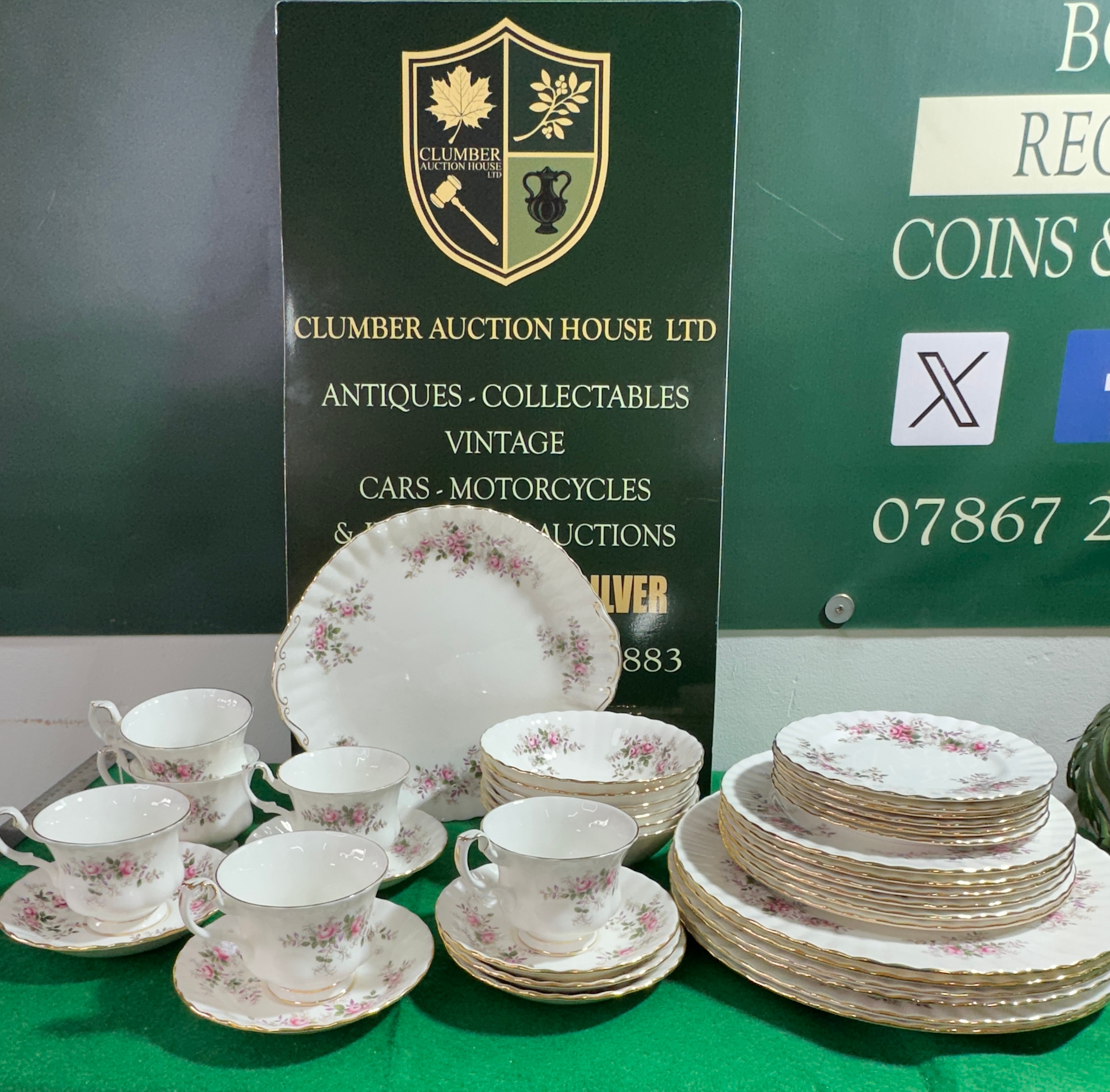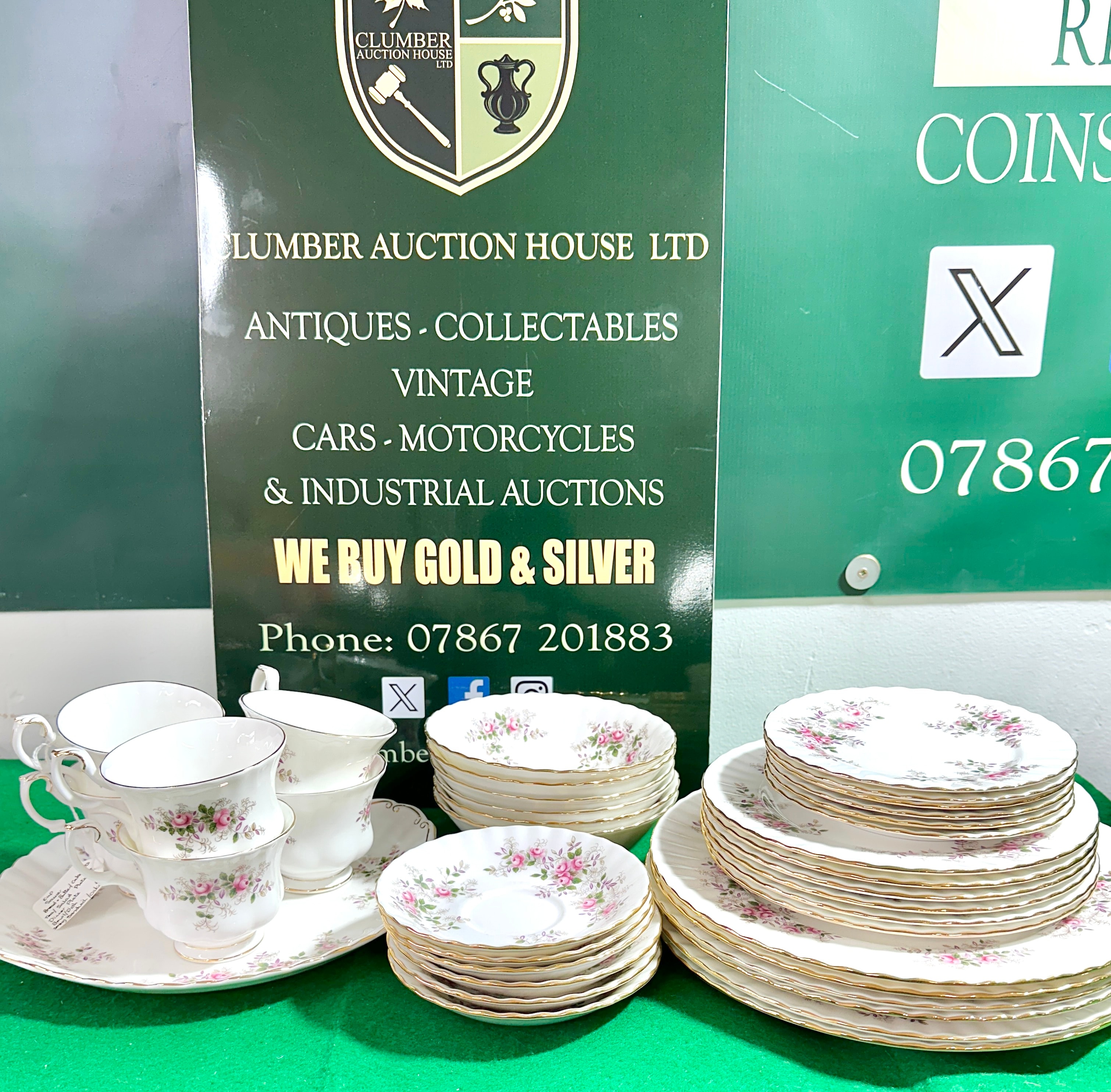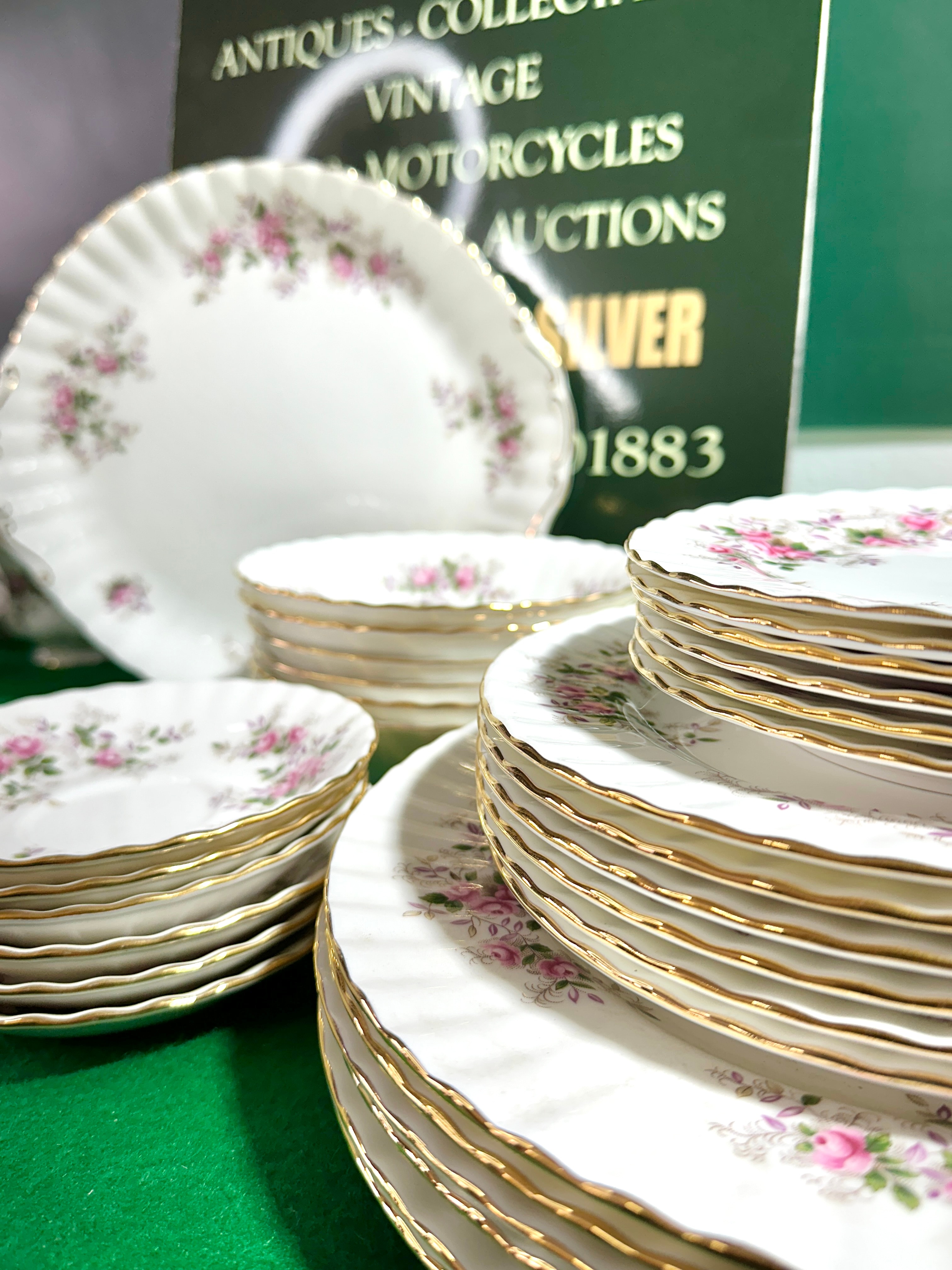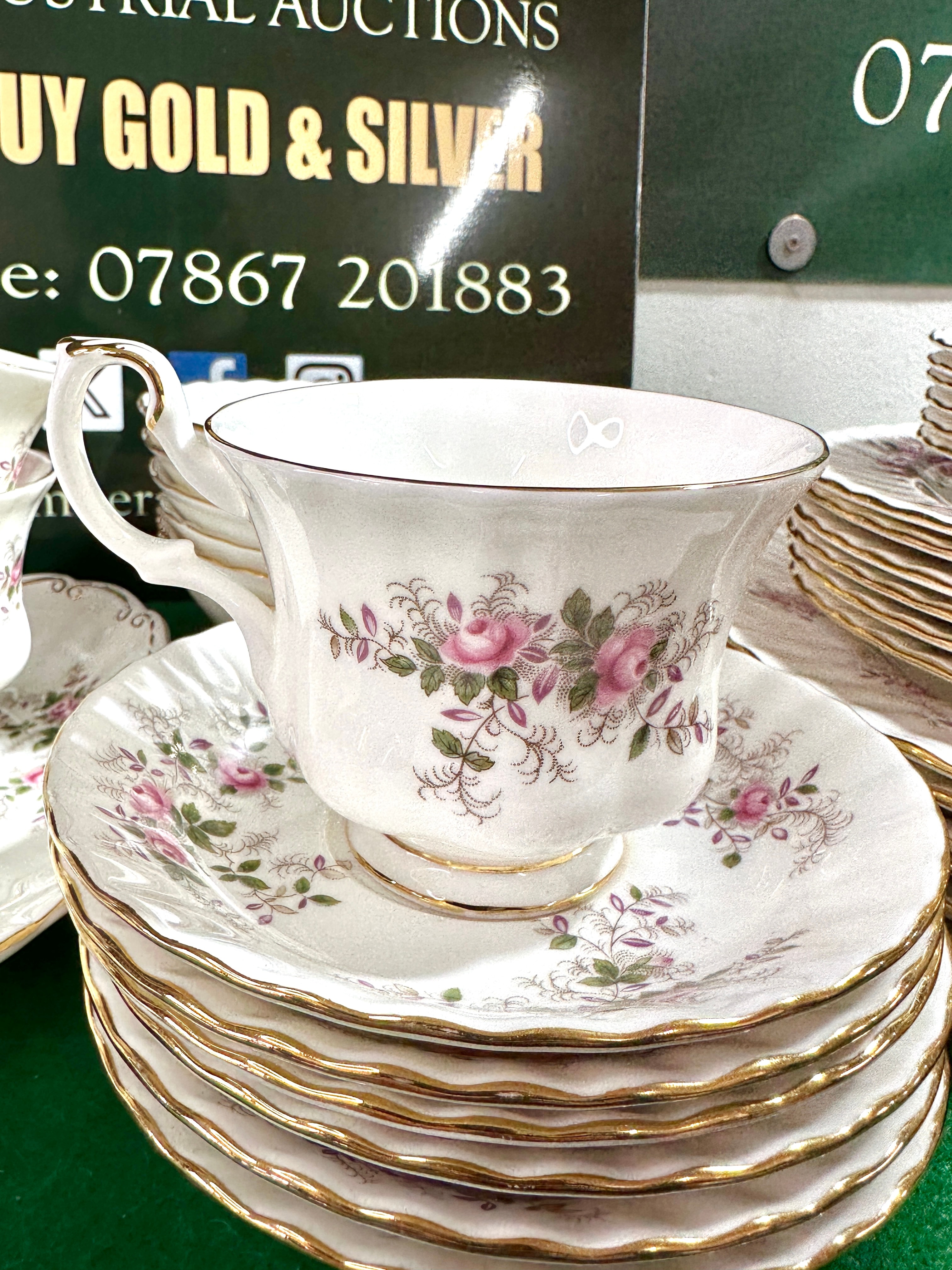 A large collection of Royal Albert ‘Lavender Rose’ pattern dinnerware and tea ware. Crafted from bone china in England, dated 1961. The pieces feature a classic aesthetic with a white ground, scalloped edges, delicate gold trim, and a transferware decoration of pink roses accompanied by green and purple foliage. The collection includes numerous tea cups, saucers, various sizes of dinner and side plates, and bowls.