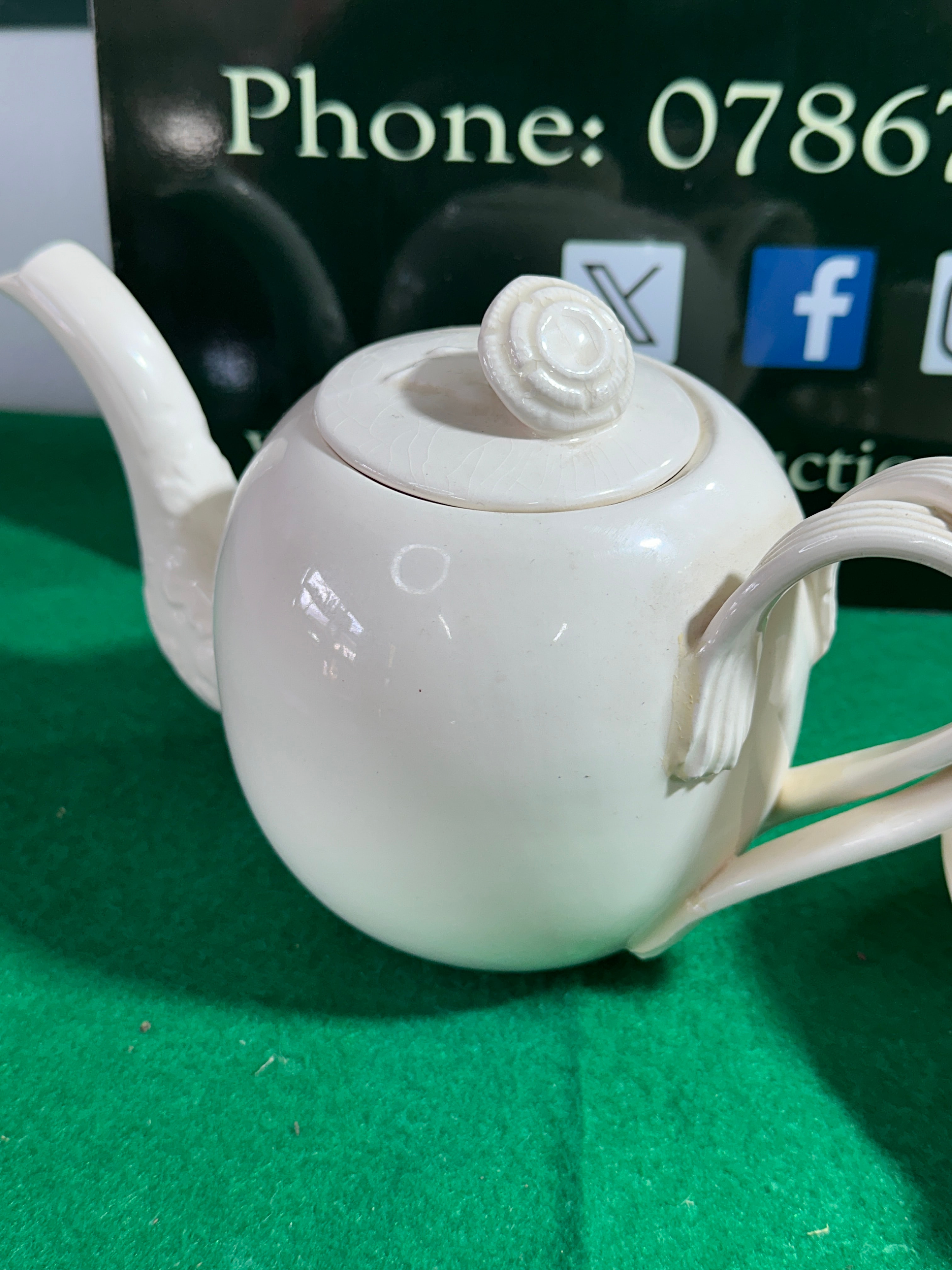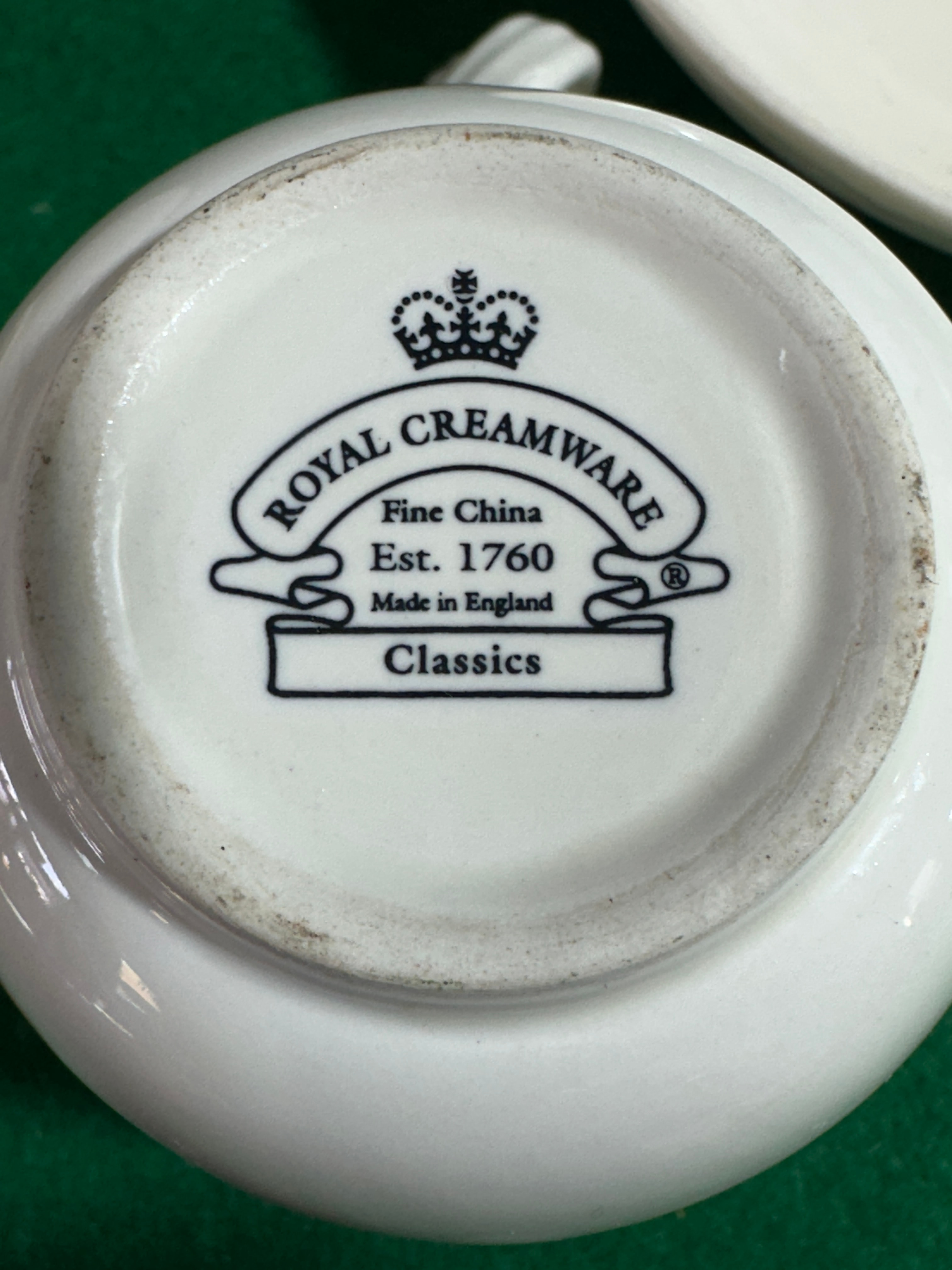 A Royal Creamware three-piece tea set, comprising a teapot with its lid, a teacup, and a saucer, all crafted from cream-colored ceramic with a glazed finish. The design features distinctive braided or twisted ribbon-like handles on both the teapot and teacup, with an additional relief decoration visible beneath the cup’s handle. The underside of one piece bears a black printed mark with a crown logo, reading “ROYAL CREAMWARE,” “Fine China,” “Est. 1760,” “Made in England,” and “Classics.”