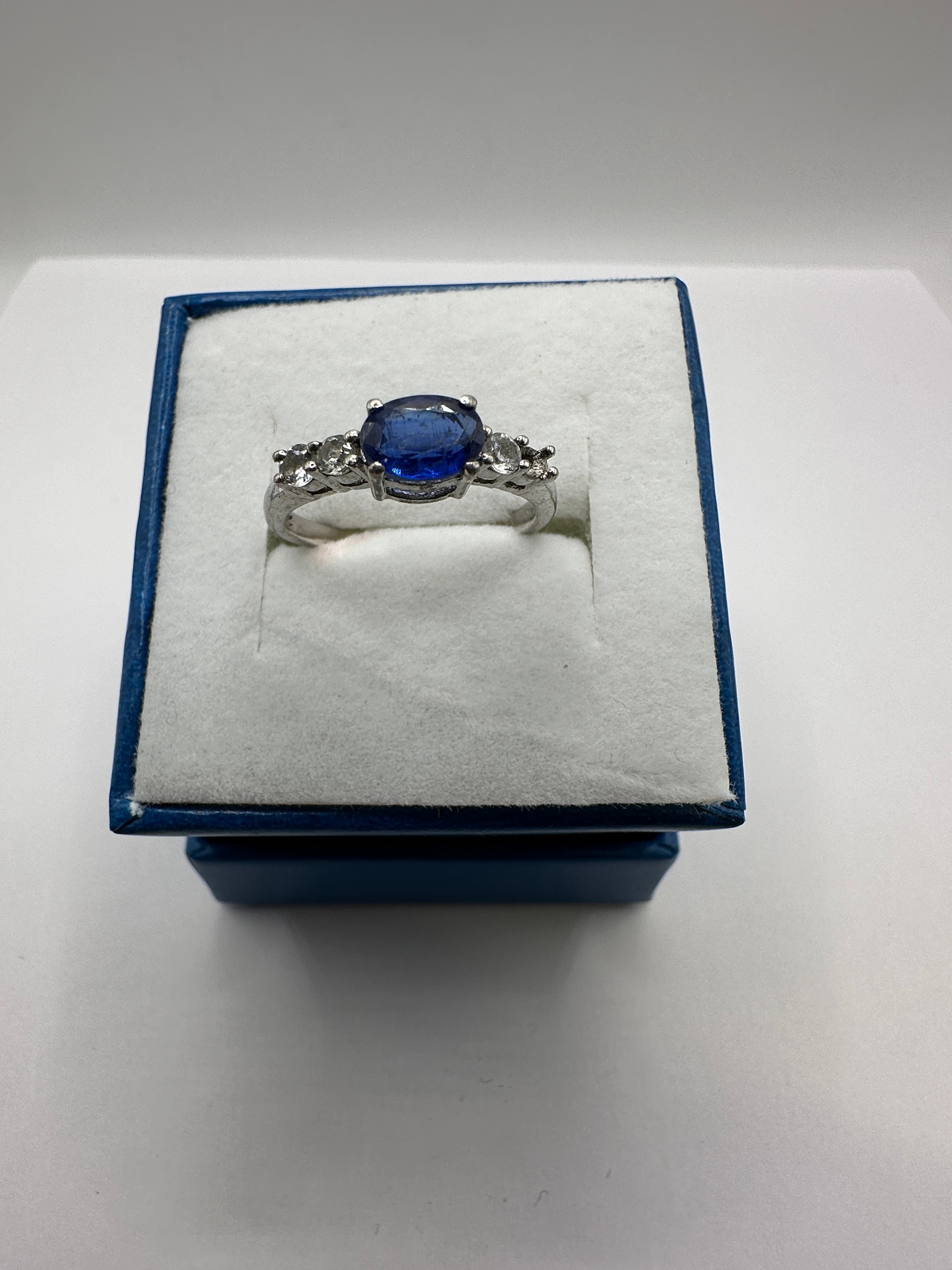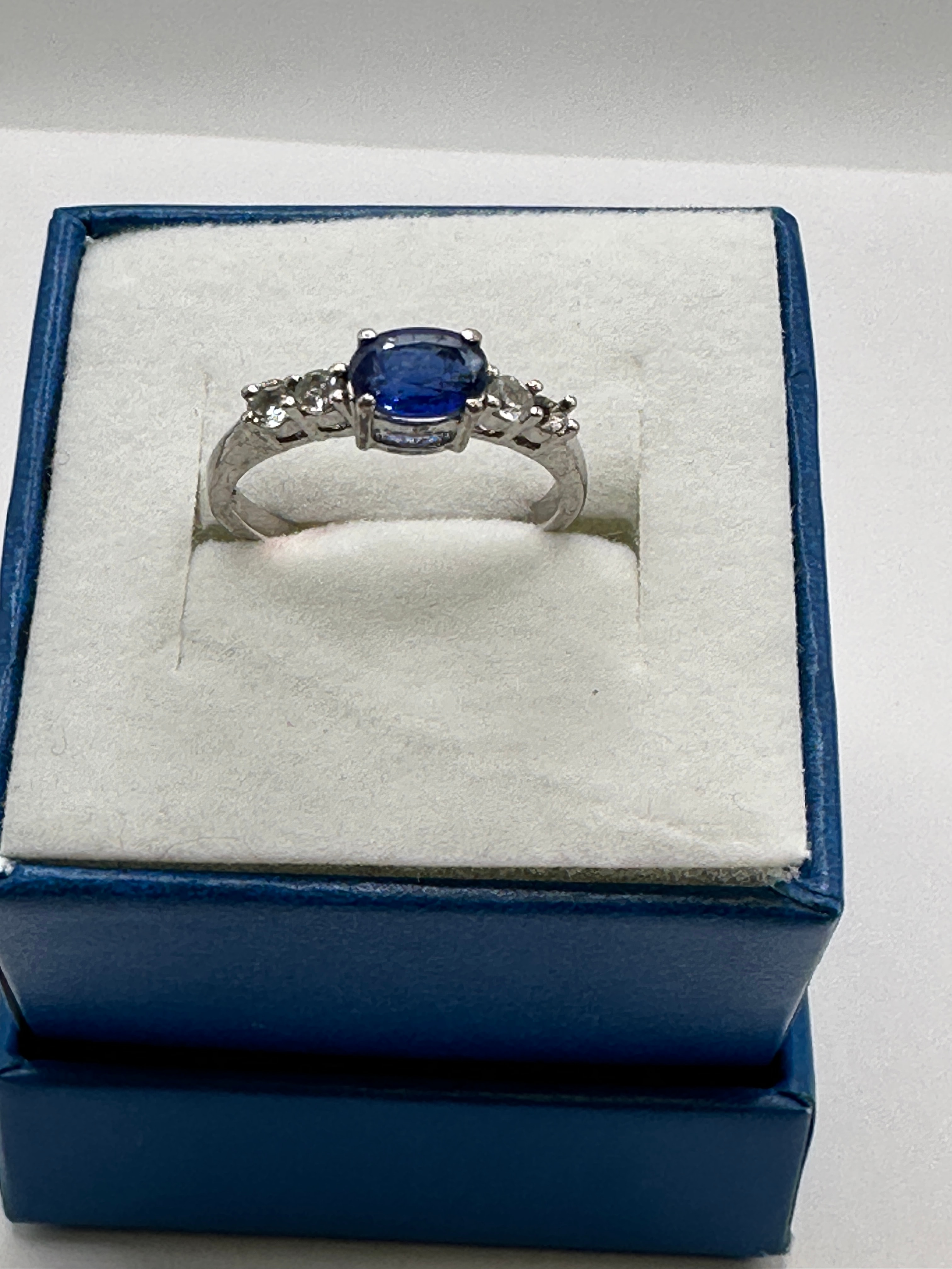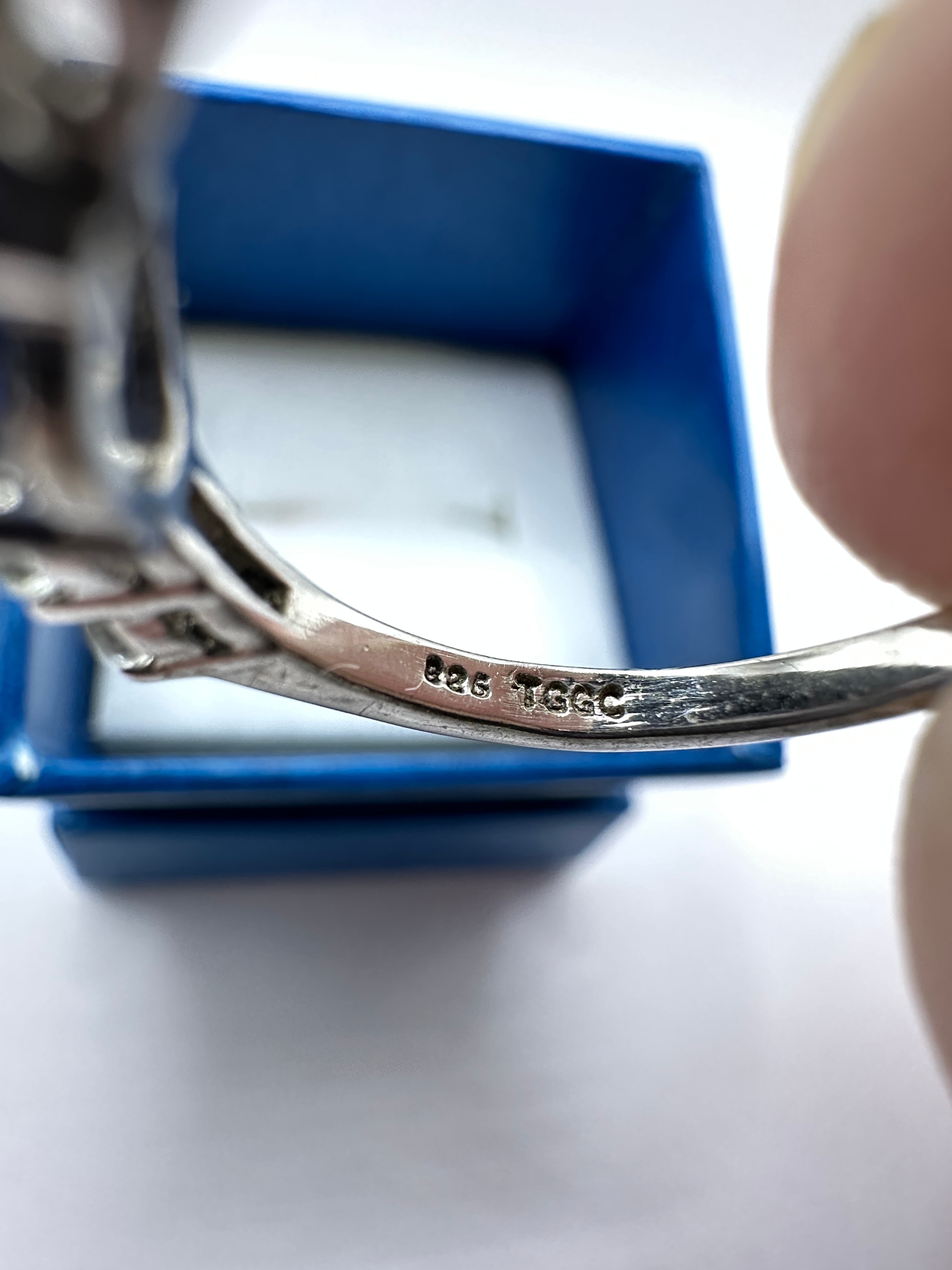 A TGGC sterling silver ring. The ring features a central oval-cut, deep blue gemstone, likely a sapphire. It is flanked on each shoulder by three smaller, round-cut colorless gemstones, likely diamonds or simulants, totaling six side stones. The interior of the band is stamped with ‘925’ and ‘TGGC’. The ring is presented in a blue jewelry box with a white velvet-lined interior.
