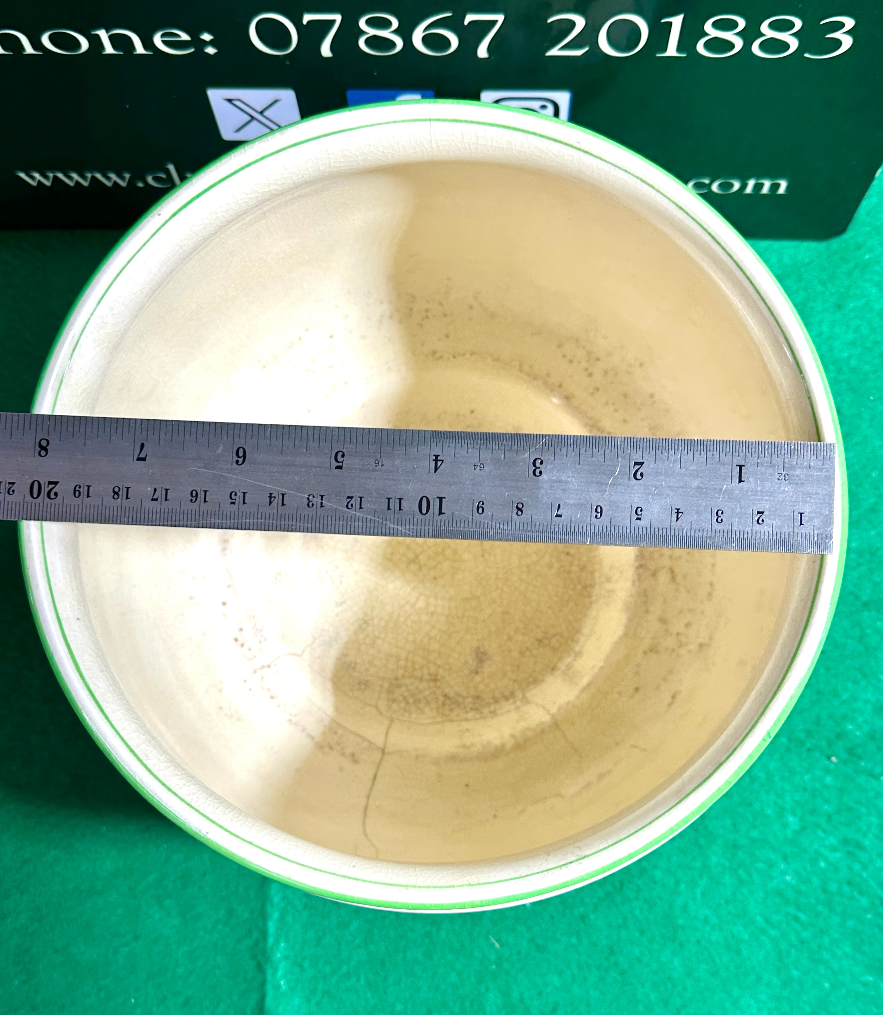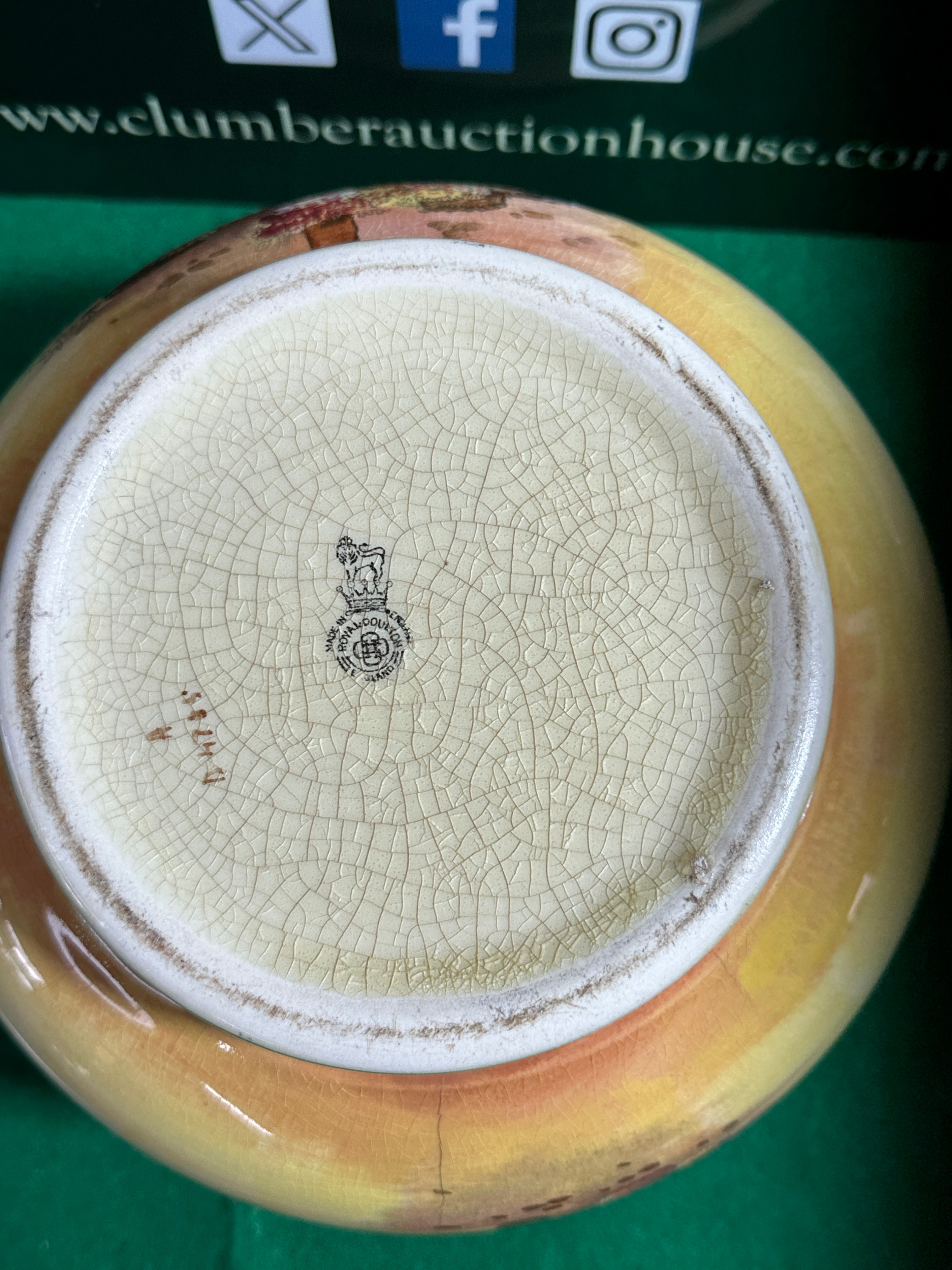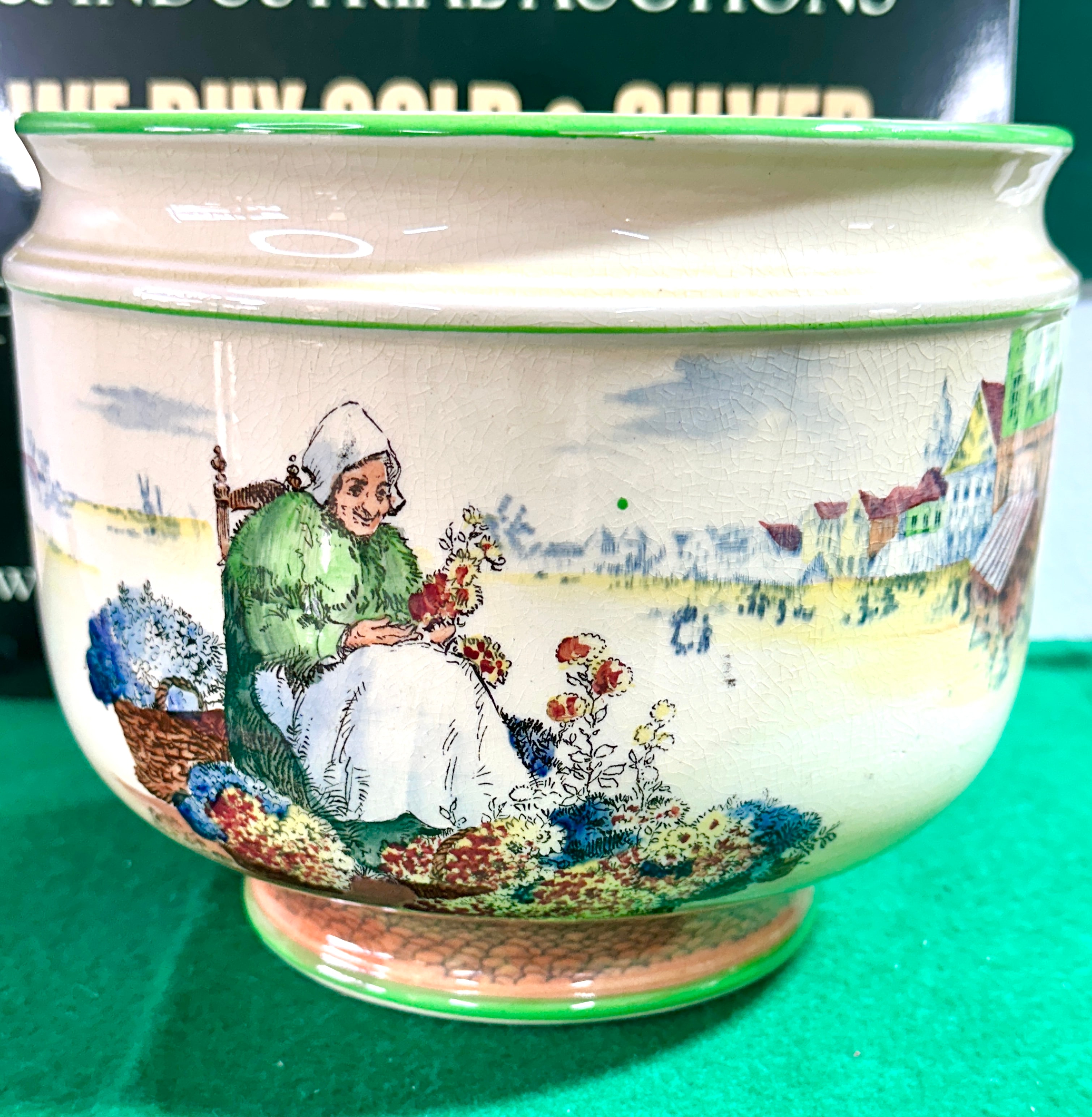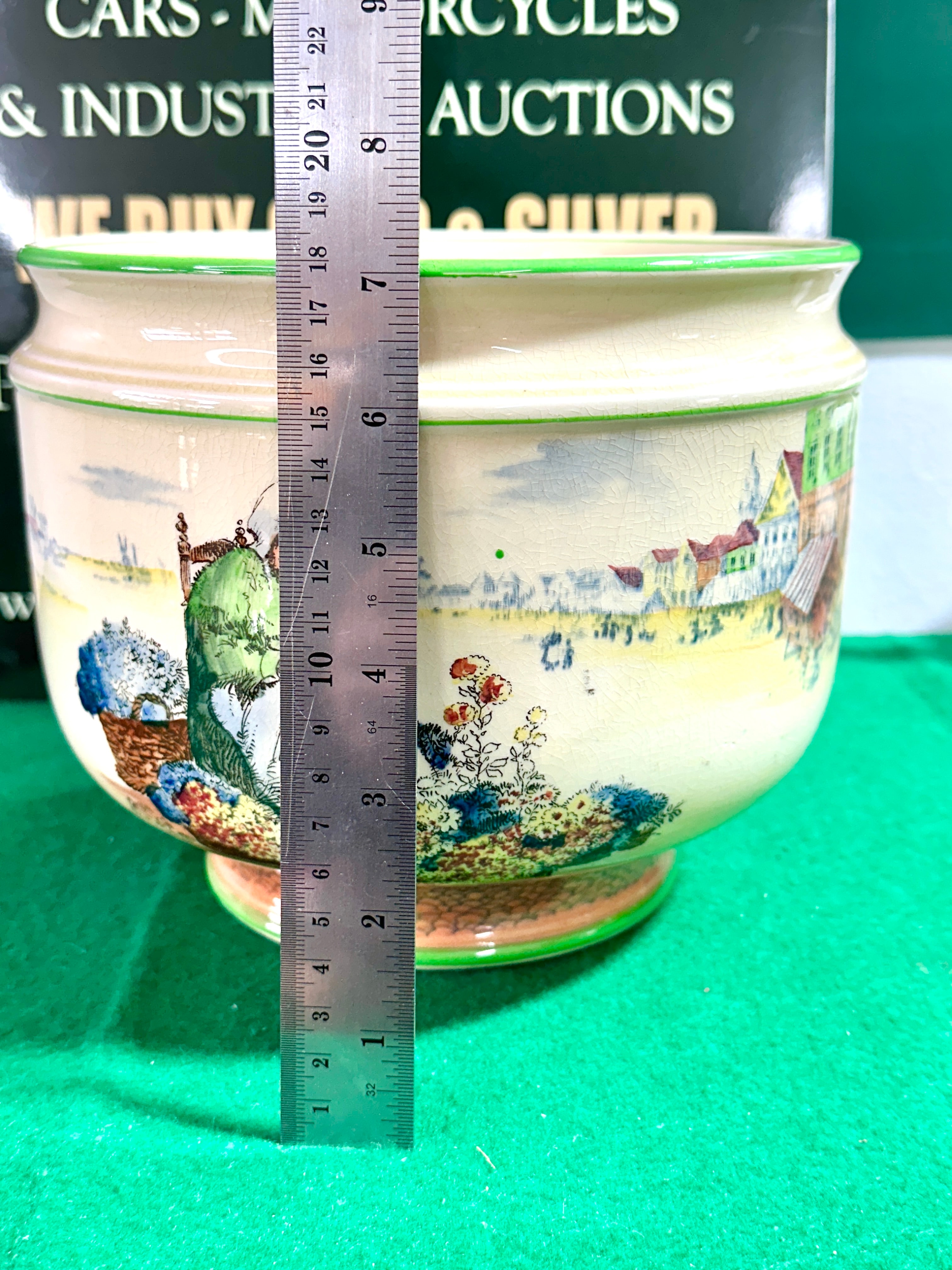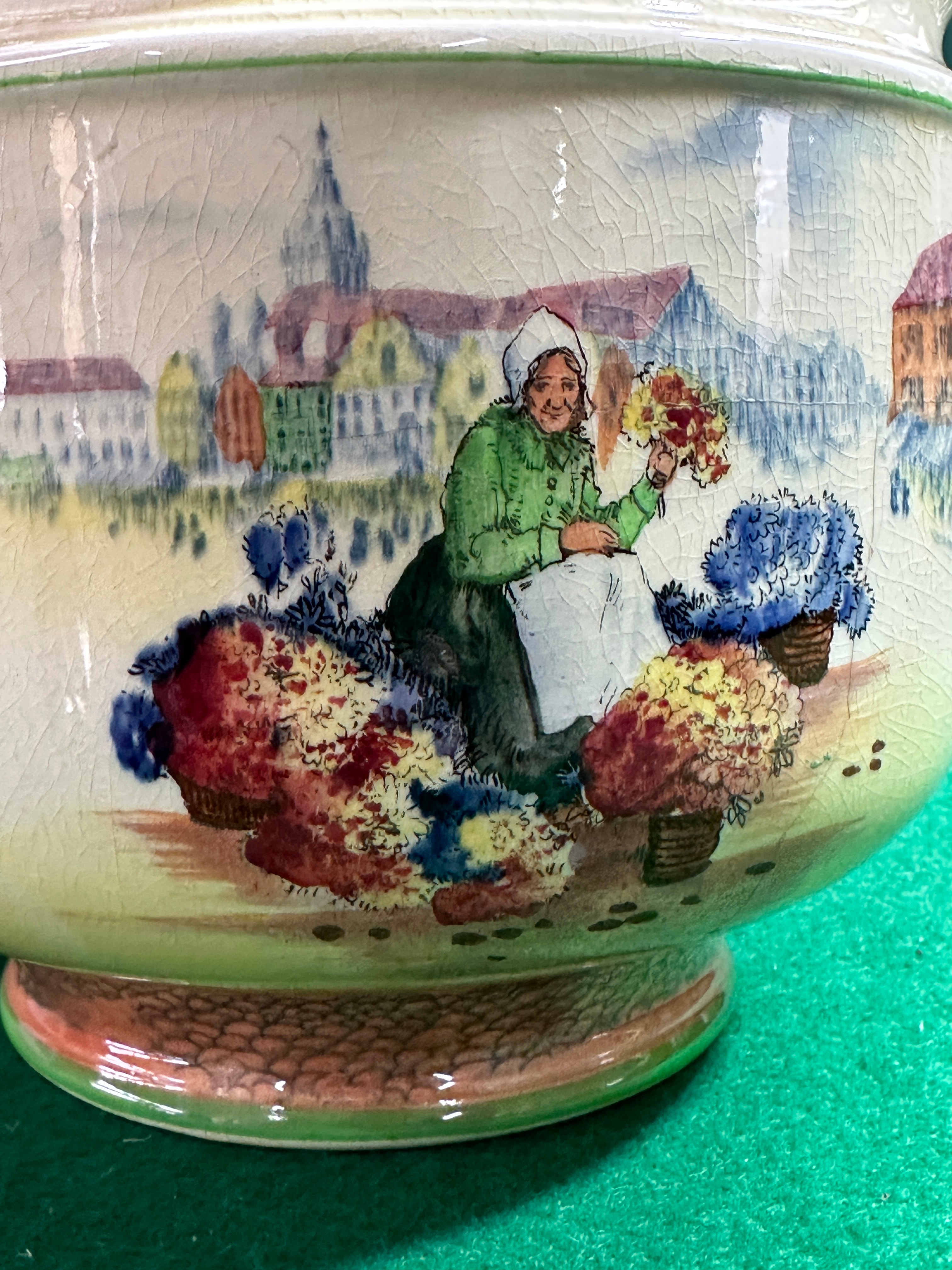 A footed ceramic jardiniere or bulb pot by Royal Crown Derby. It features a transfer-printed and hand-colored polychrome decoration depicting a bustling market scene with a woman selling flowers in the foreground, set against a backdrop of European-style buildings, all bordered by green lines. The underside bears the backstamp “ROYAL CROWN DERBY / ENGLAND” beneath a crown emblem, alongside a handwritten mark “D4721”.