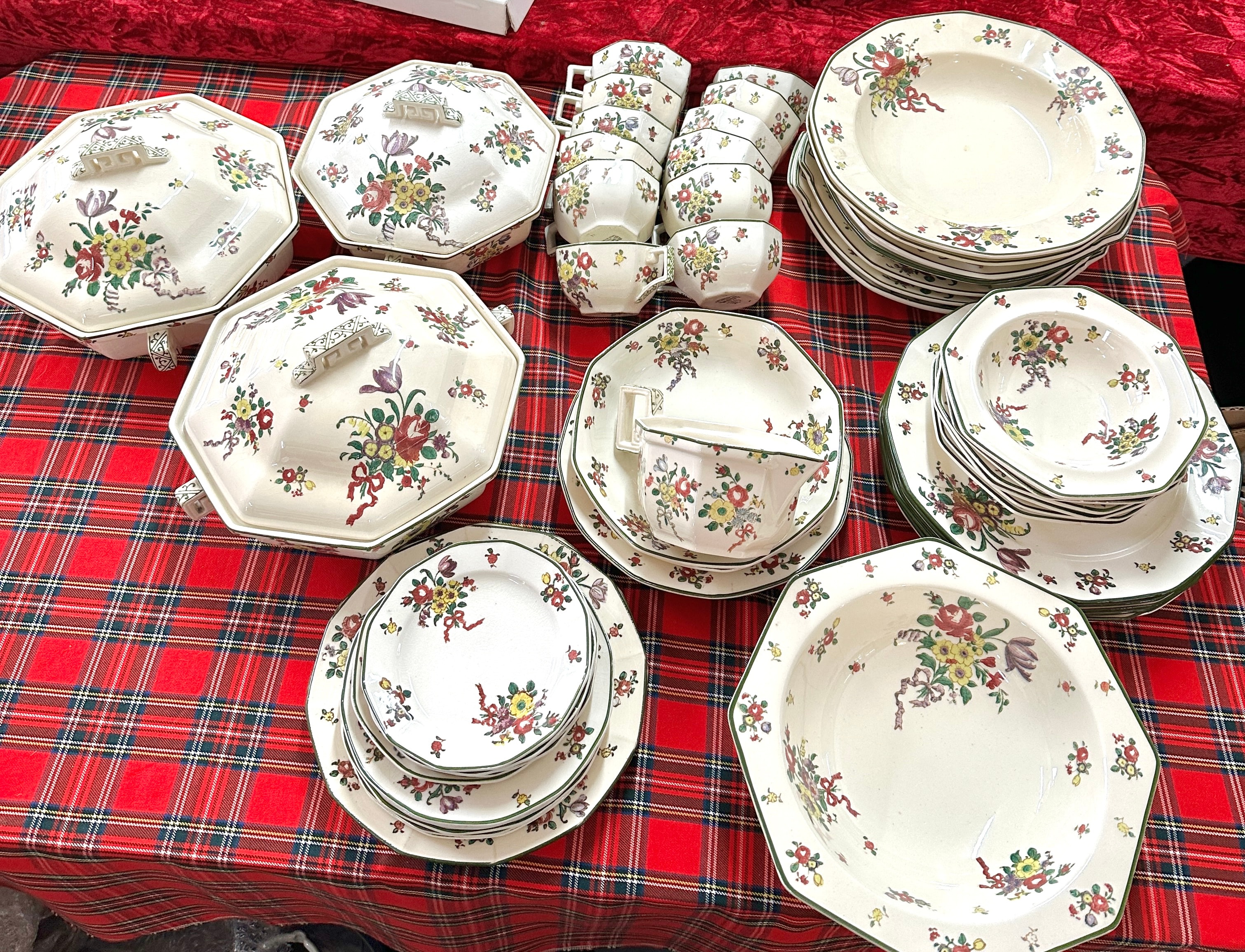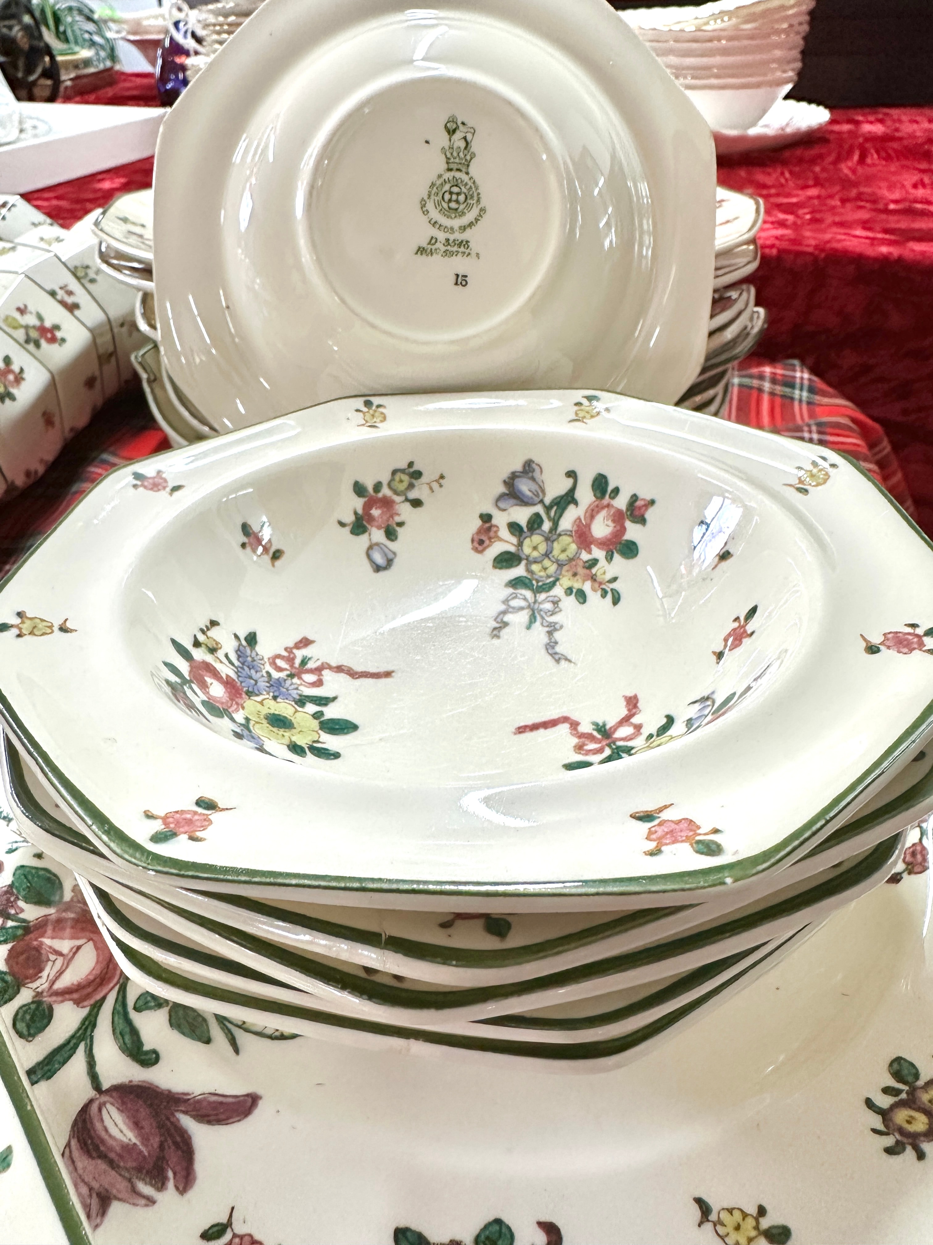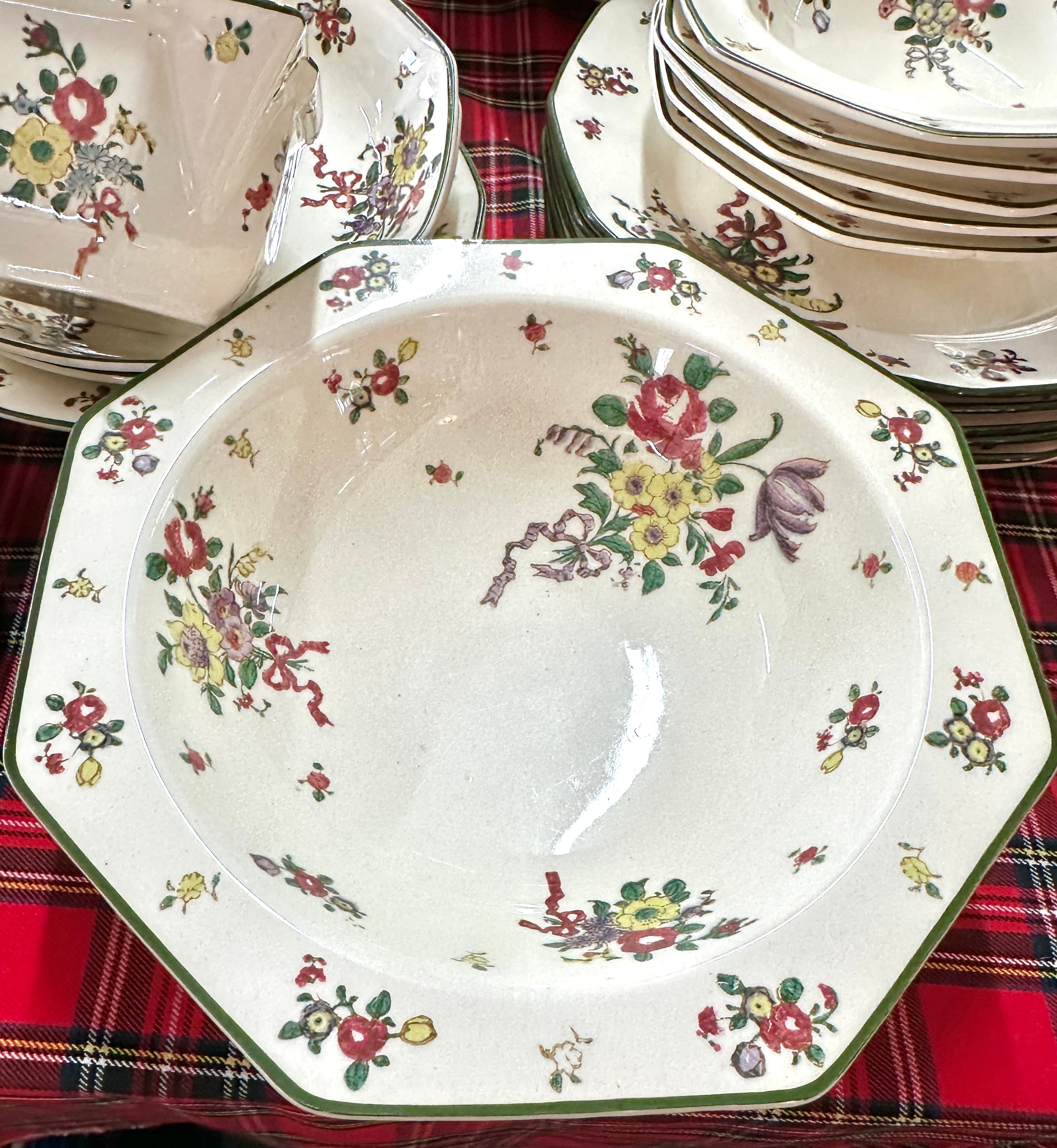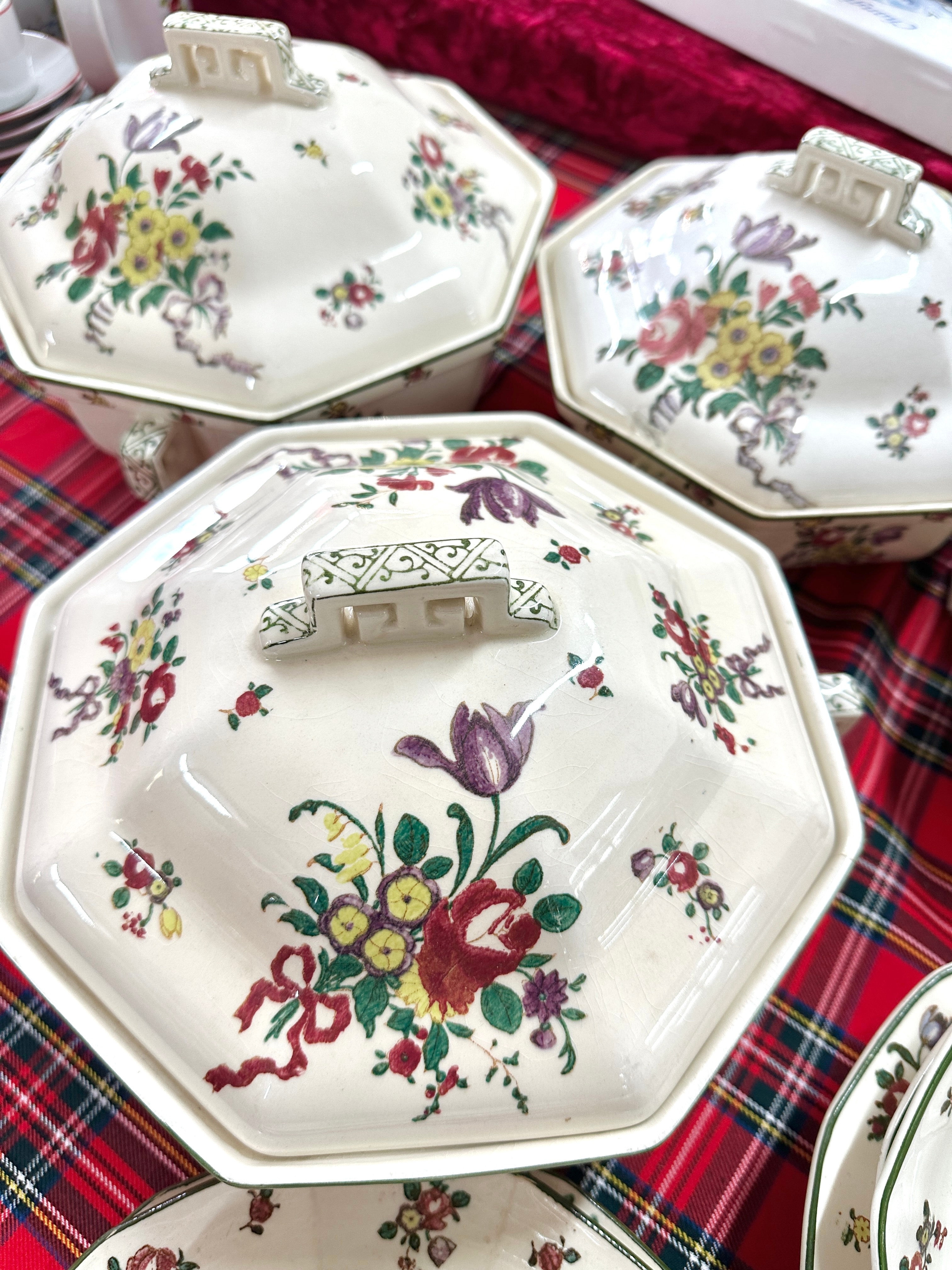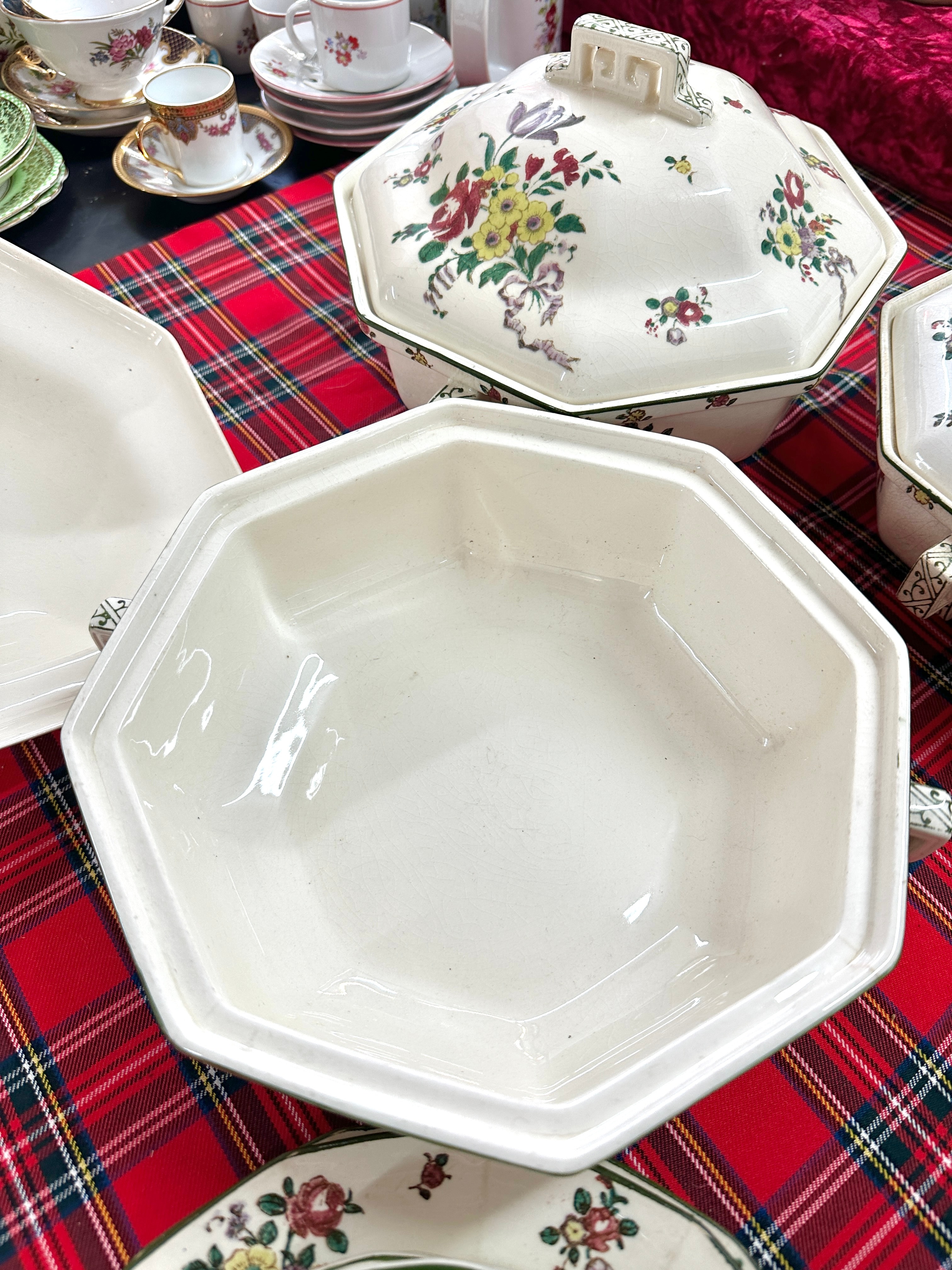 A large set of Royal Doulton ‘Old Leeds Sprays’ octagonal dinnerware and tea/coffee service, pattern D.3548, registered number RNº 597753. This extensive collection comprises numerous octagonal-shaped pieces, including lidded tureens, various plates and bowls, teacups, and a creamer. The collection features a traditional floral pattern depicting multi-colored bouquets and scattered sprigs against a cream-colored ground, accented with a green rim. The material is glazed earthenware, with undersides bearing a green Royal Doulton backstamp confirming its manufacture in England around 1912.