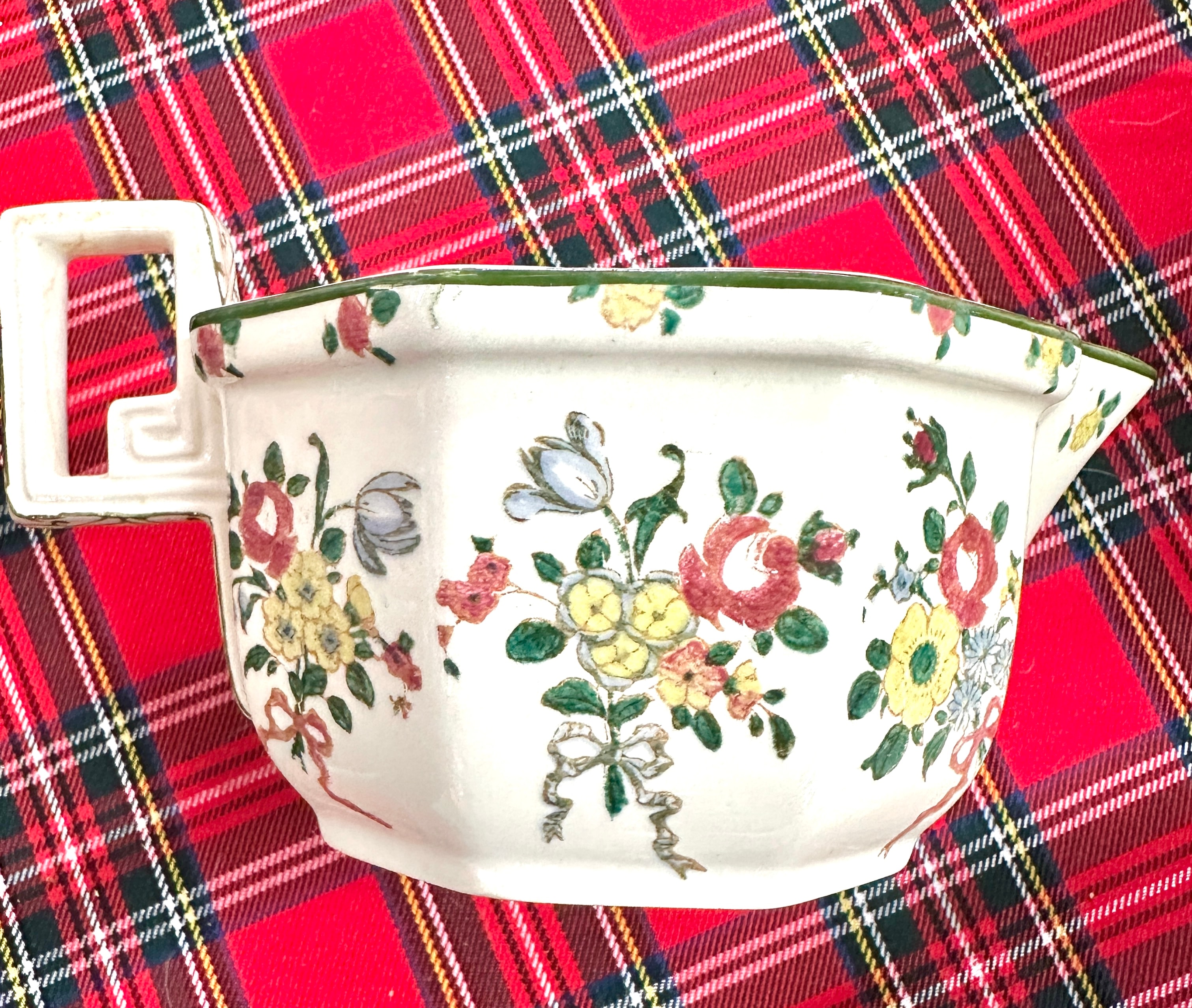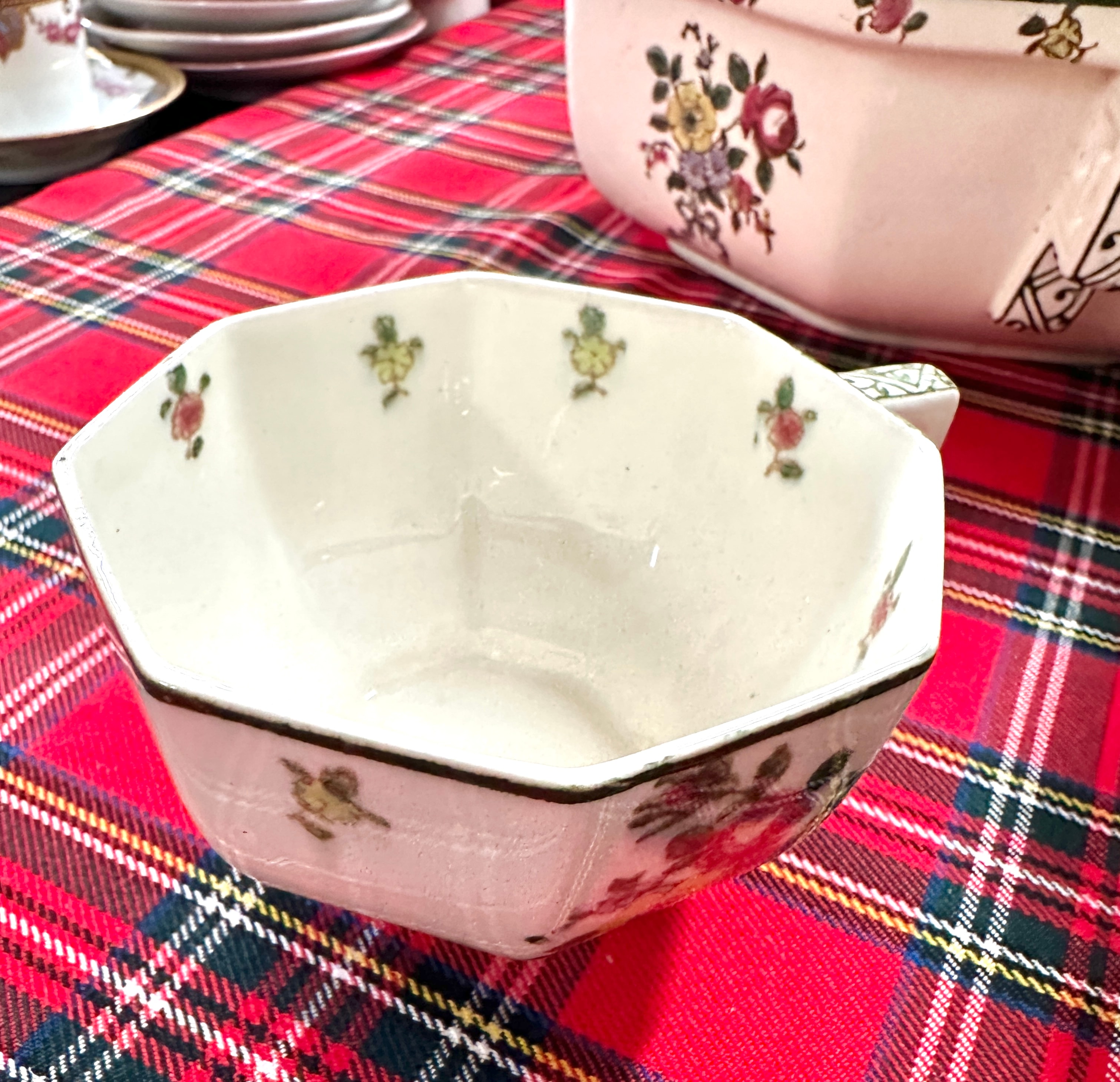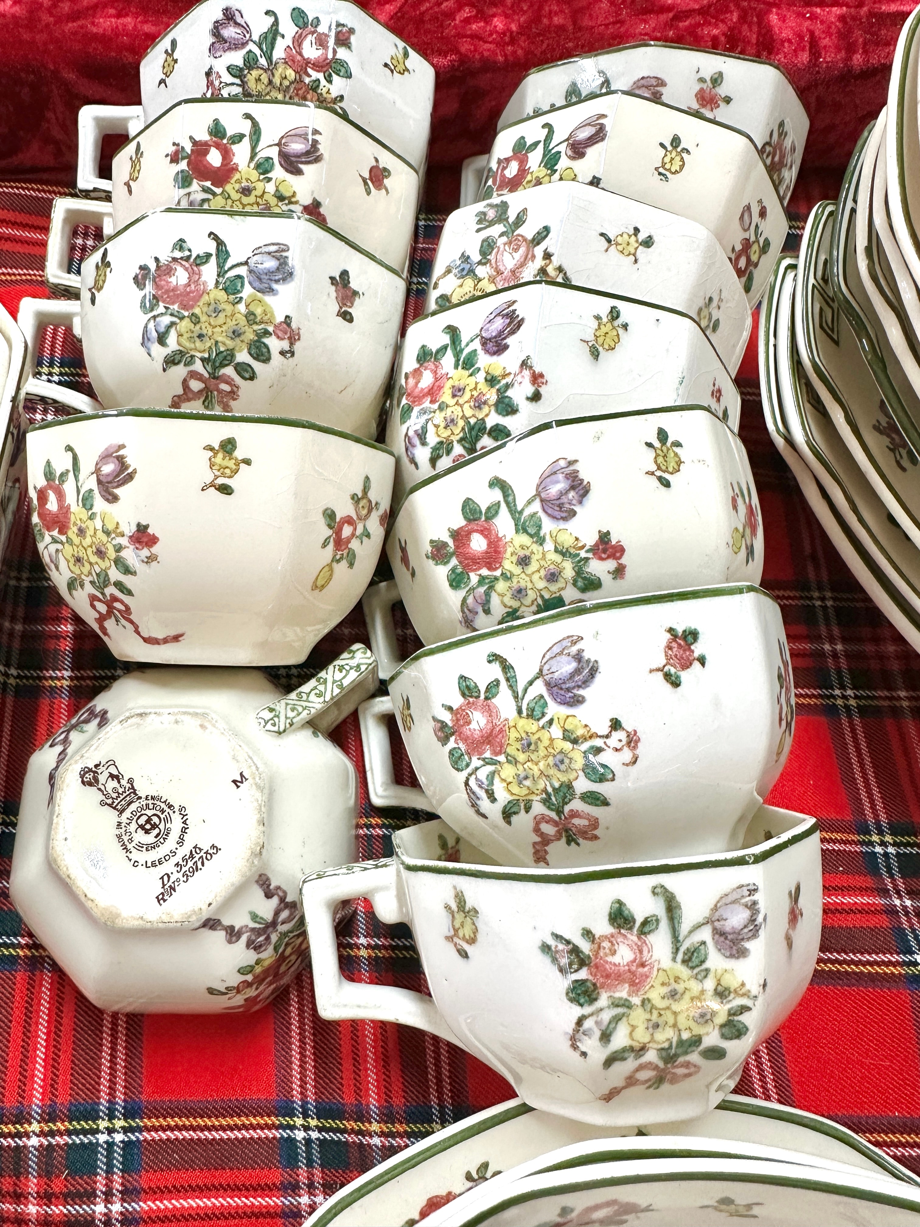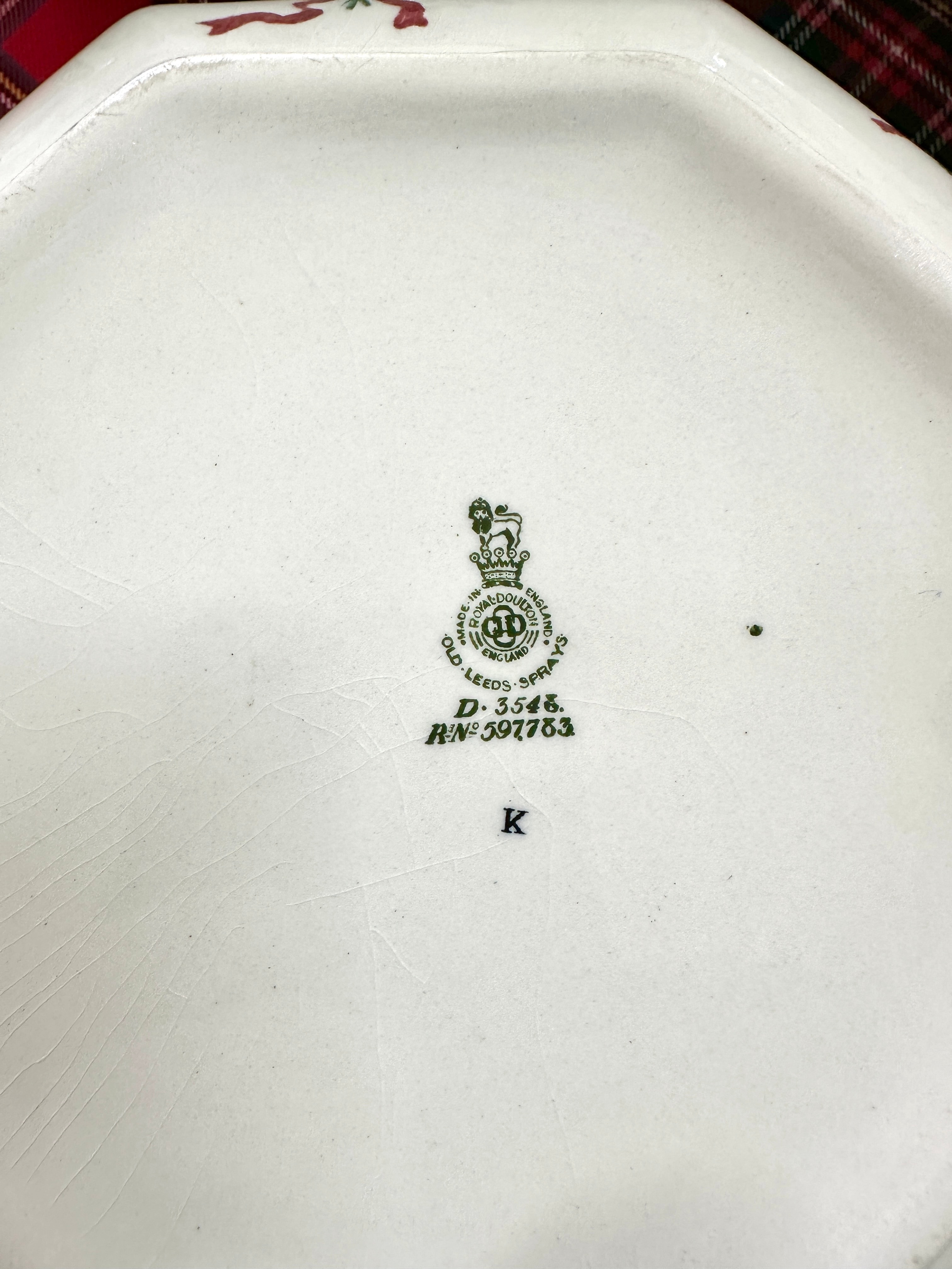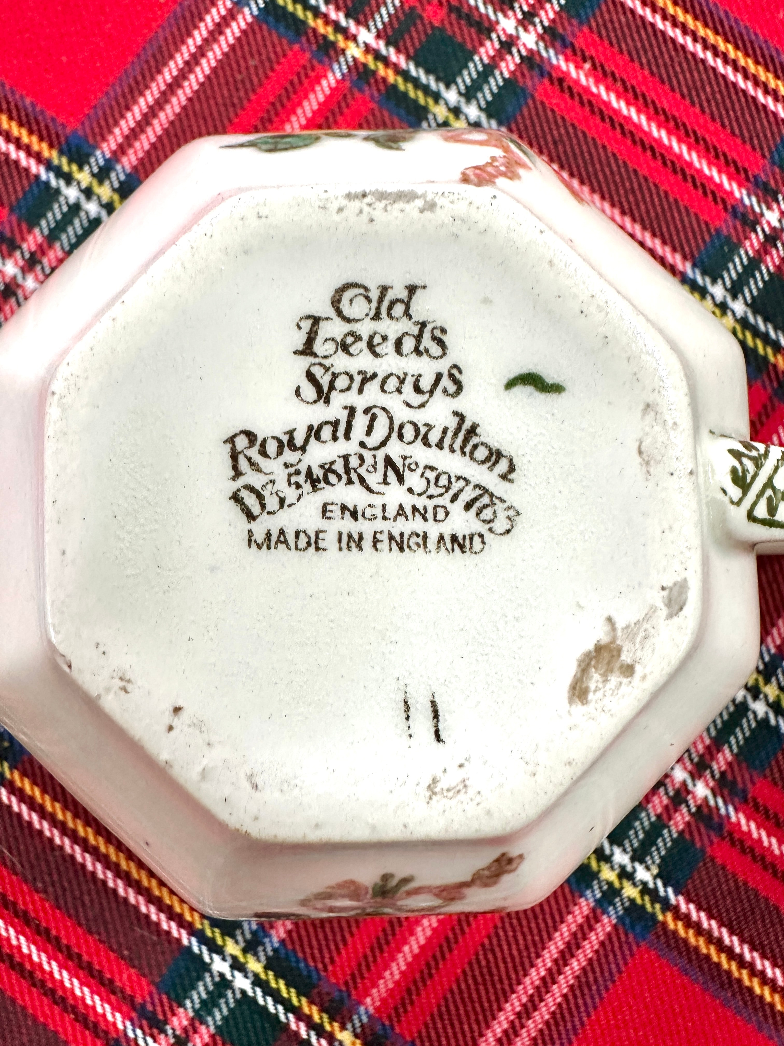 A large set of Royal Doulton ‘Old Leeds Sprays’ octagonal dinnerware and tea/coffee service, pattern D.3548, registered number RNº 597753. This extensive collection comprises numerous octagonal-shaped pieces, including lidded tureens, various plates and bowls, teacups, and a creamer. The collection features a traditional floral pattern depicting multi-colored bouquets and scattered sprigs against a cream-colored ground, accented with a green rim. The material is glazed earthenware, with undersides bearing a green Royal Doulton backstamp confirming its manufacture in England around 1912.