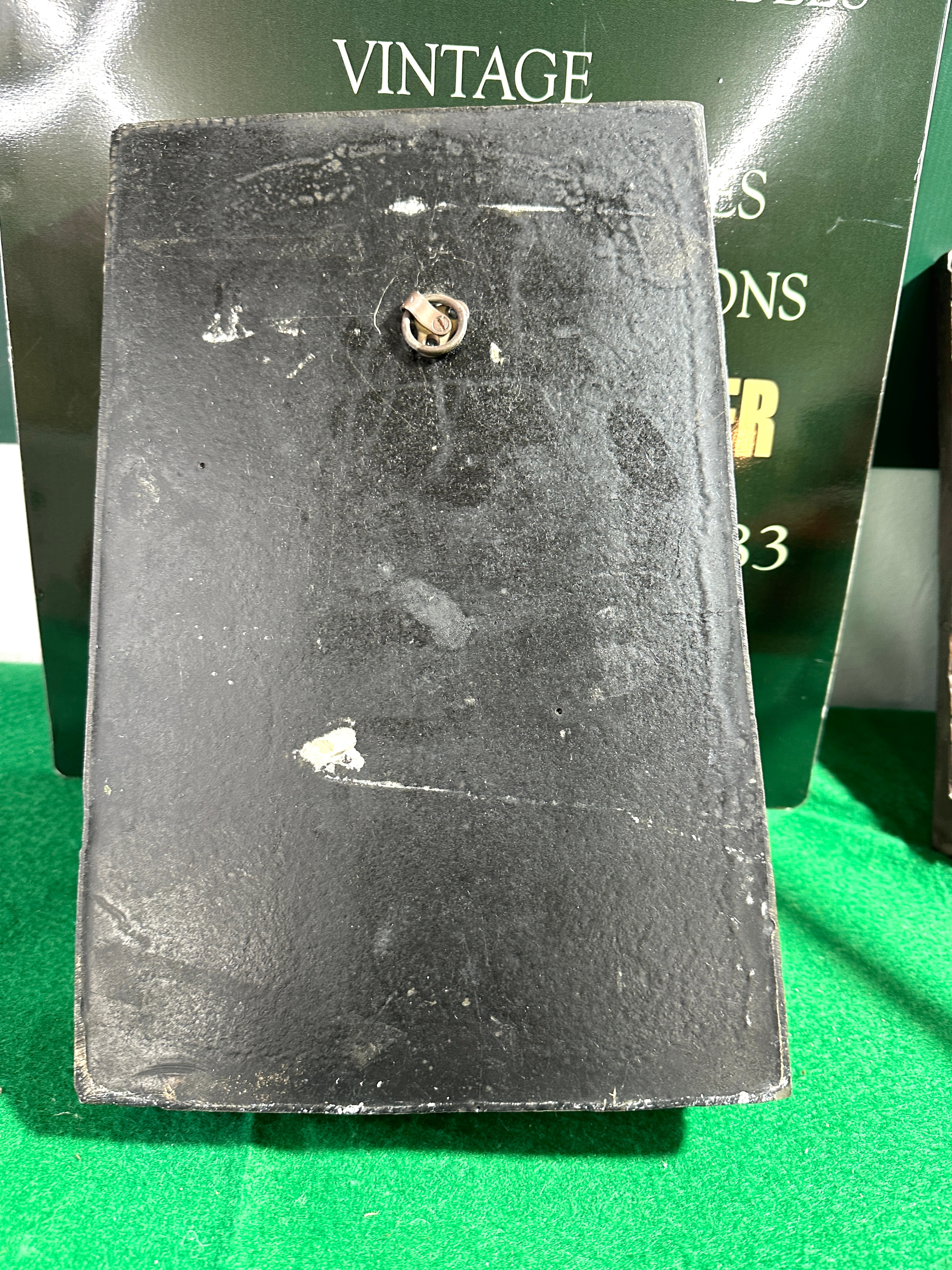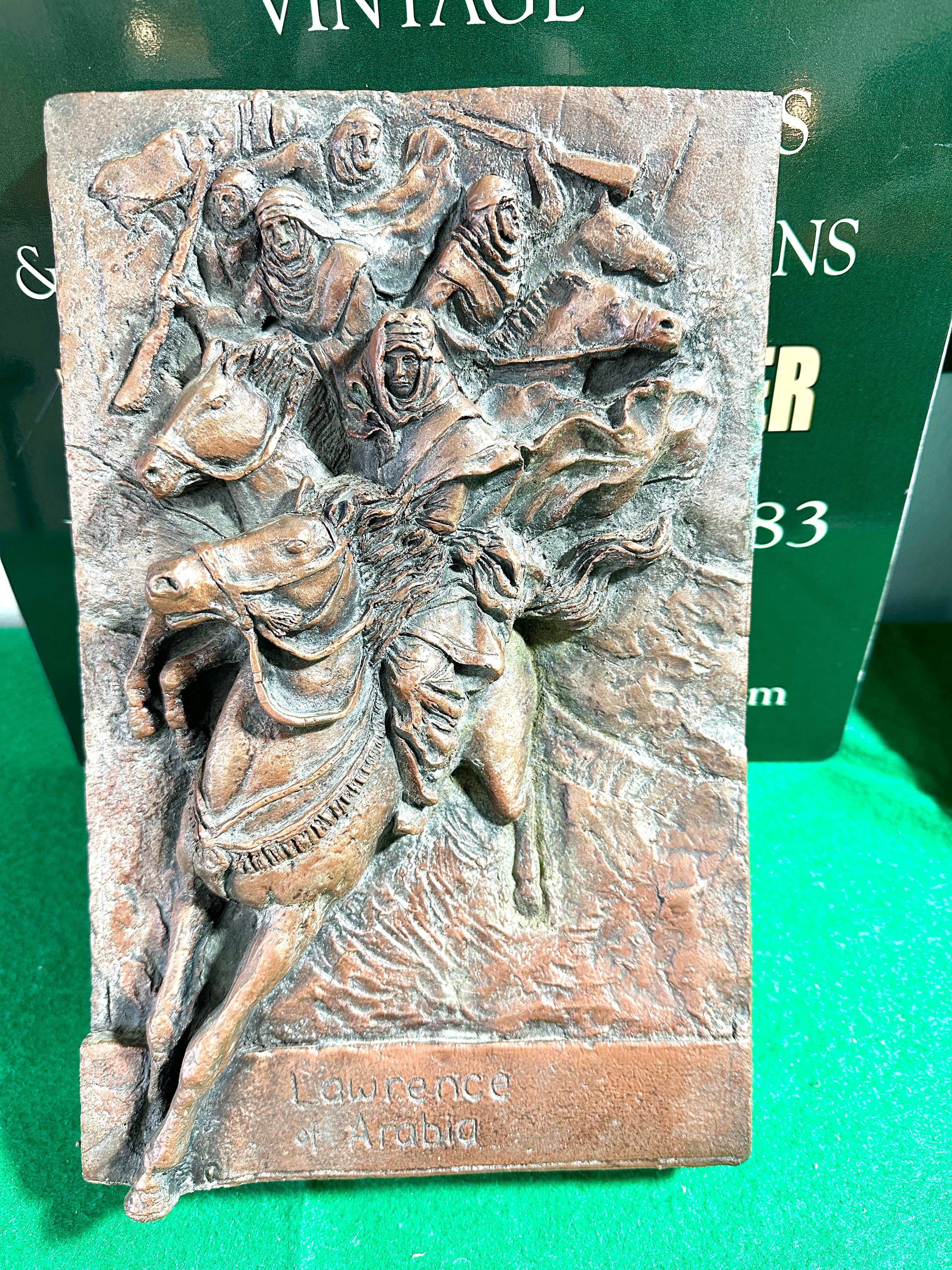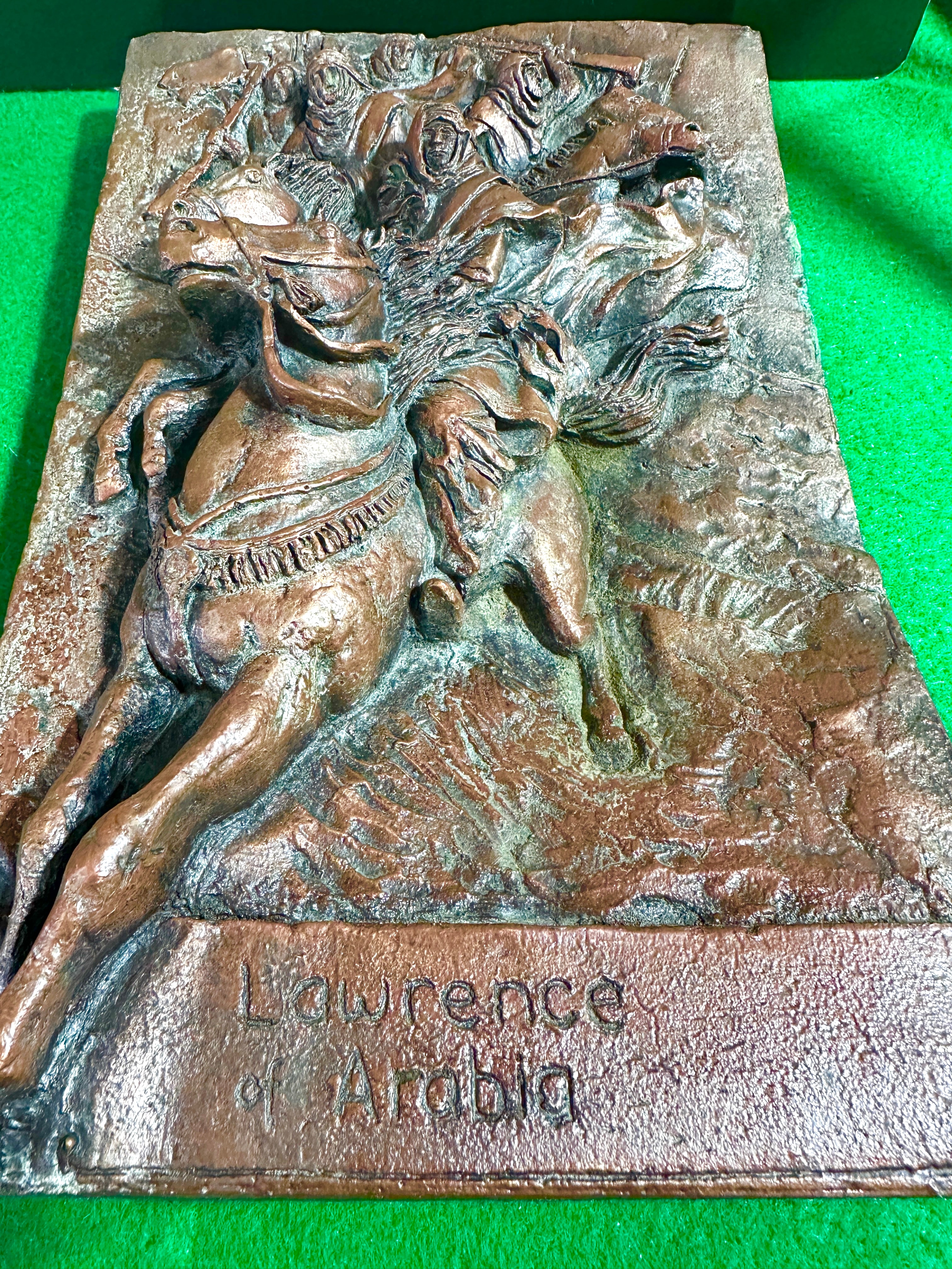 A rectangular wood relief plaque, finished to emulate bronze, depicting a dynamic historical scene. Multiple horse-mounted figures, dressed in Bedouin or Middle Eastern attire, are shown charging across a textured background. The plaque presents reddish-brown tones with green verdigris accents in the recesses, mimicking aged bronze. The embossed text “Lawrence of Arabia” is visible at the bottom of the relief. The reverse is finished in black and fitted with a hanger for display.
