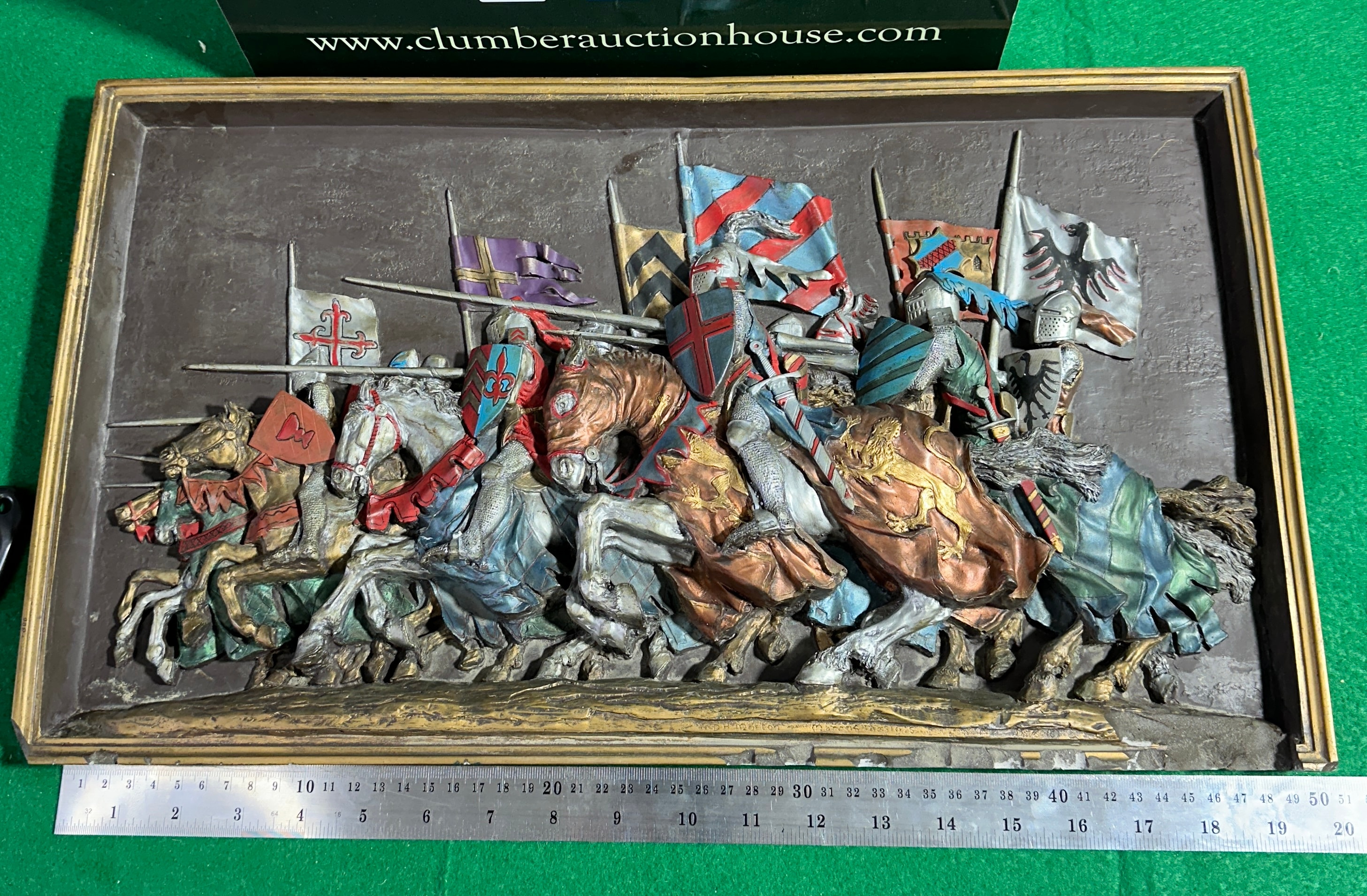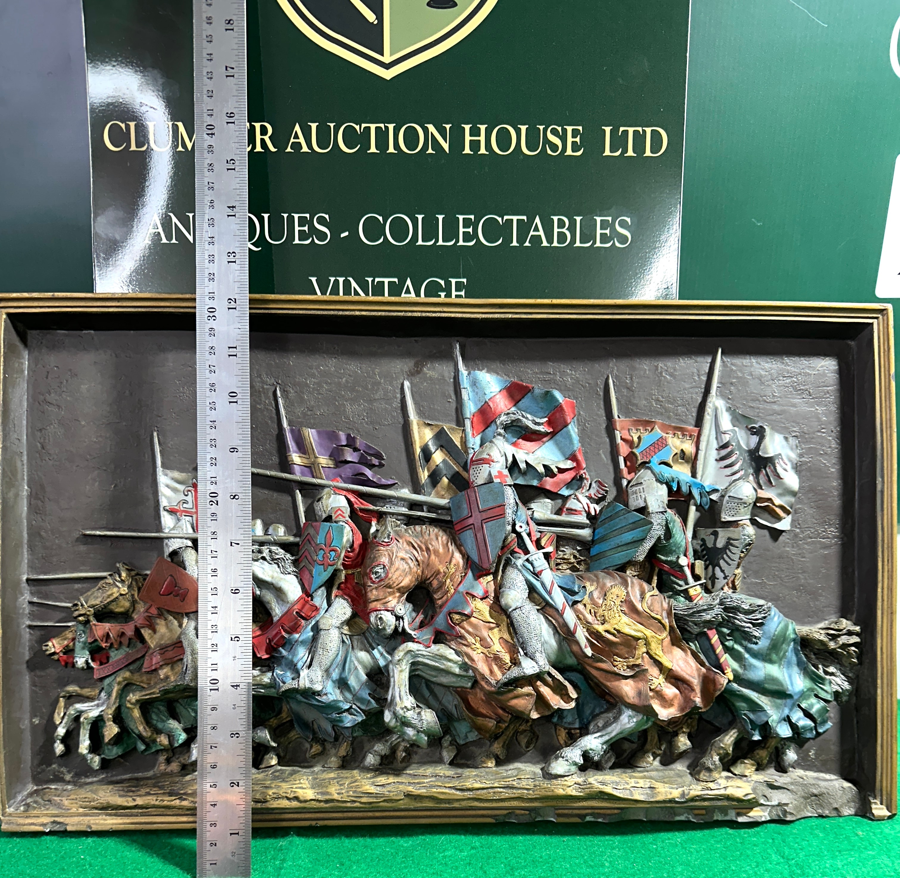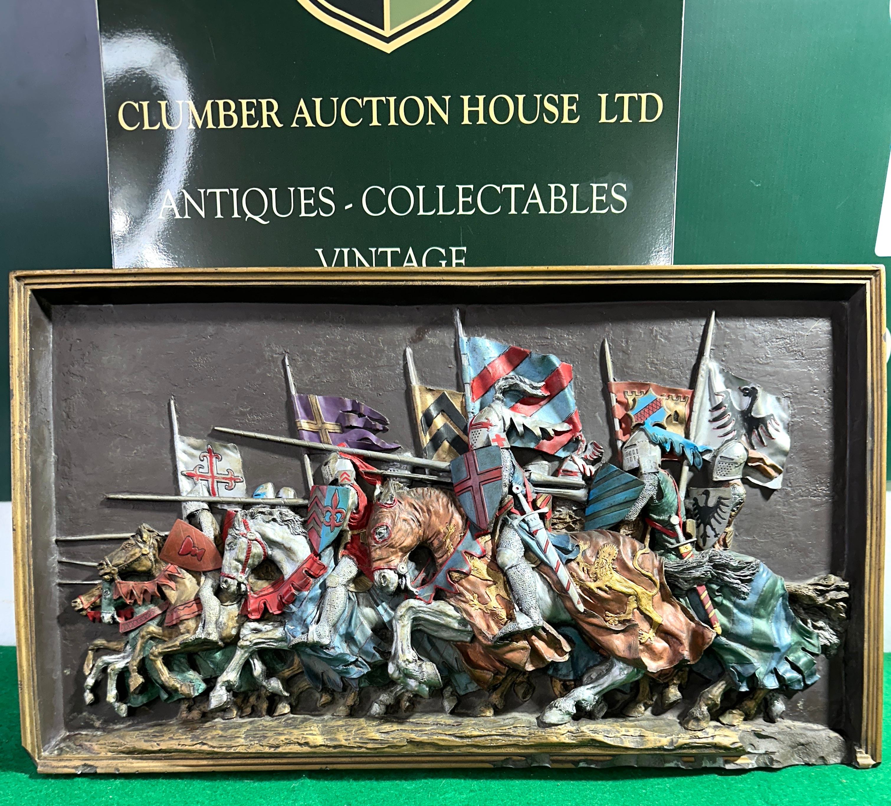 A Marcus Replicas ‘The Charge’ wall plaque, depicting a dynamic charge of medieval knights on horseback. This rectangular, framed high-relief decorative piece is rendered in a detailed, illustrative style with intricate polychrome painting simulating armor, fabric, and horse textures. The plaque is enclosed within a gold-finished frame. The reverse side is felt-covered and bears a ‘CLUMBER’ brand label with a knight motif, stating “Made in England”.