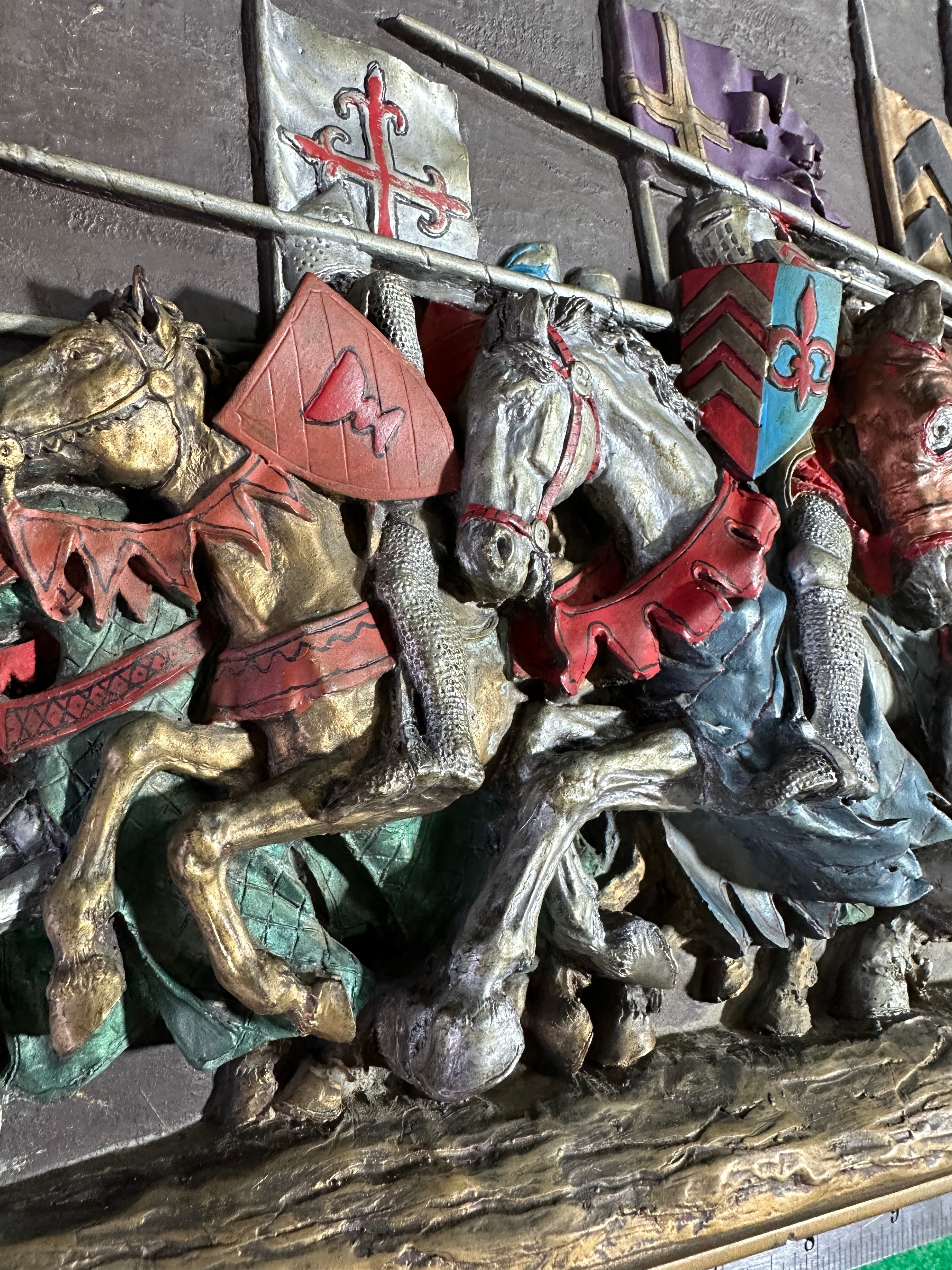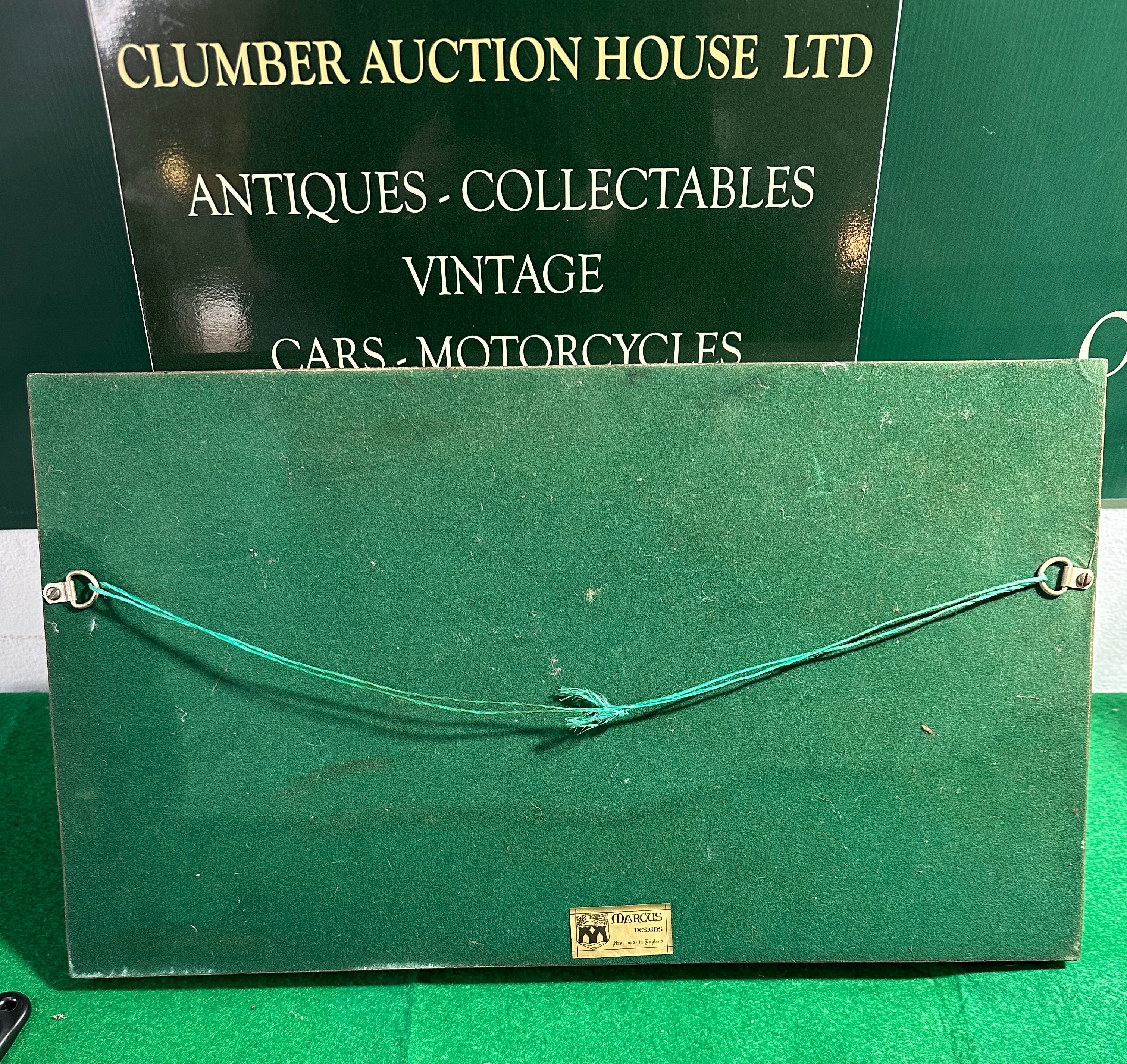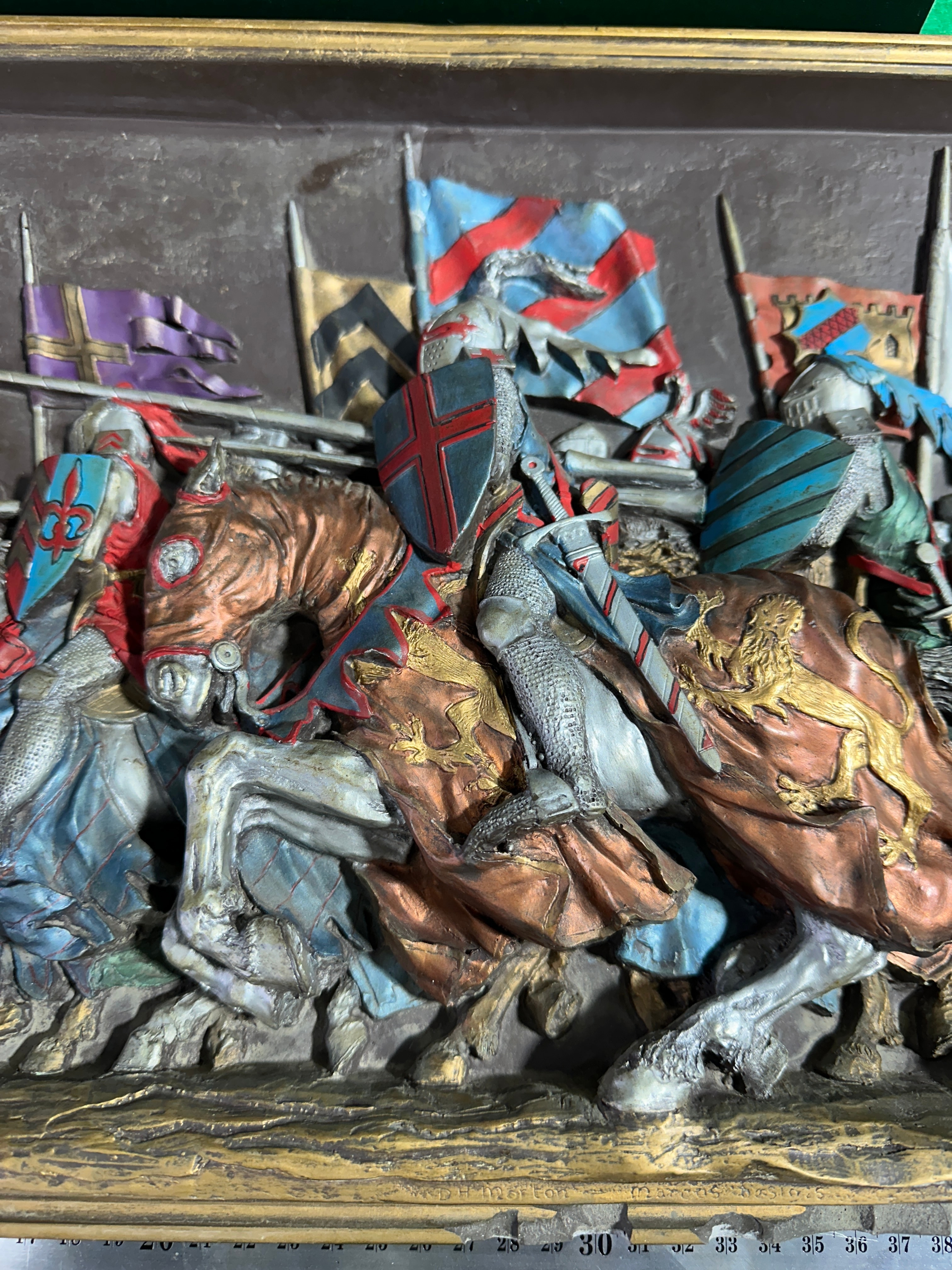 A Marcus Replicas ‘The Charge’ wall plaque, depicting a dynamic charge of medieval knights on horseback. This rectangular, framed high-relief decorative piece is rendered in a detailed, illustrative style with intricate polychrome painting simulating armor, fabric, and horse textures. The plaque is enclosed within a gold-finished frame. The reverse side is felt-covered and bears a ‘CLUMBER’ brand label with a knight motif, stating “Made in England”.