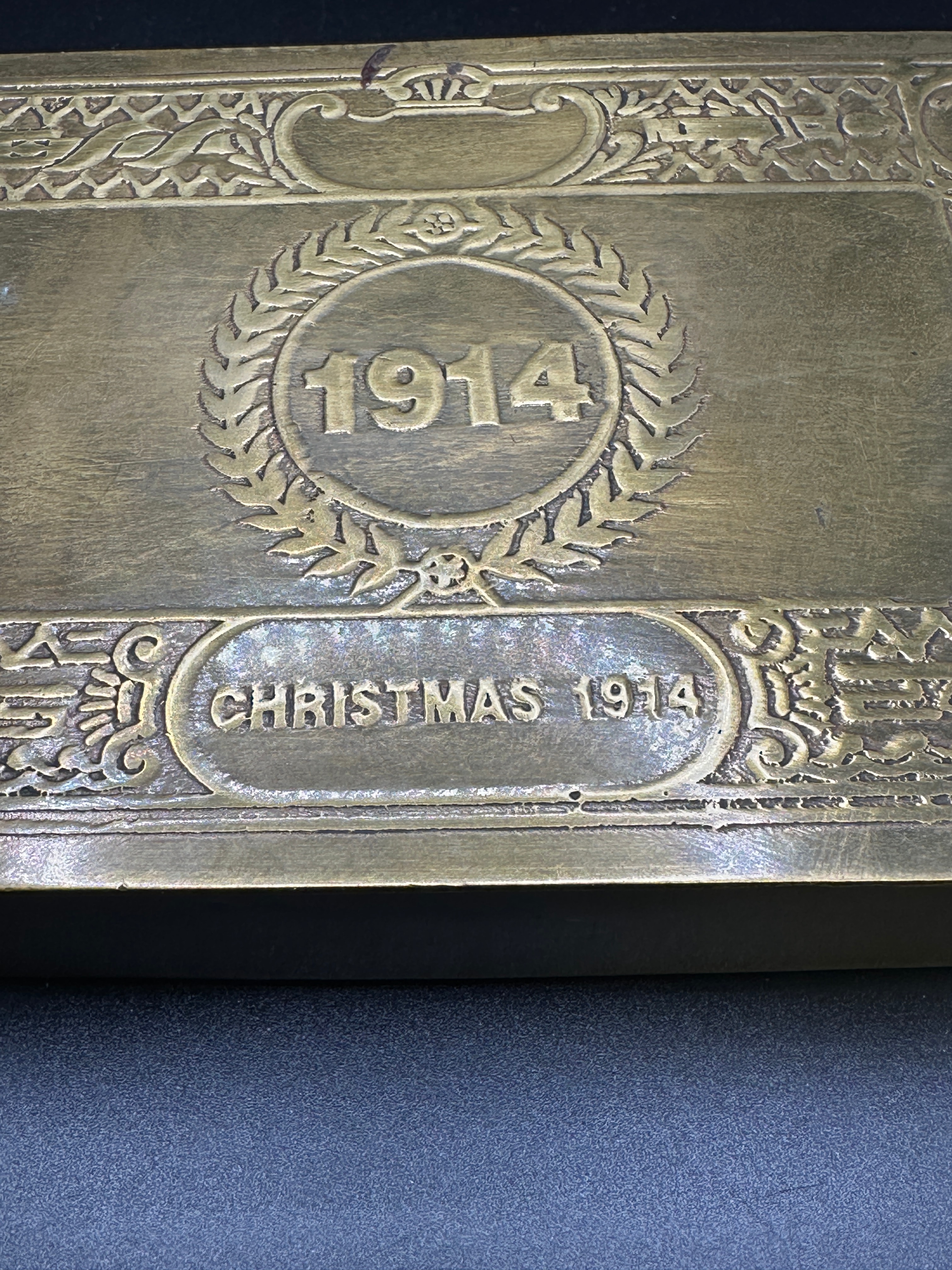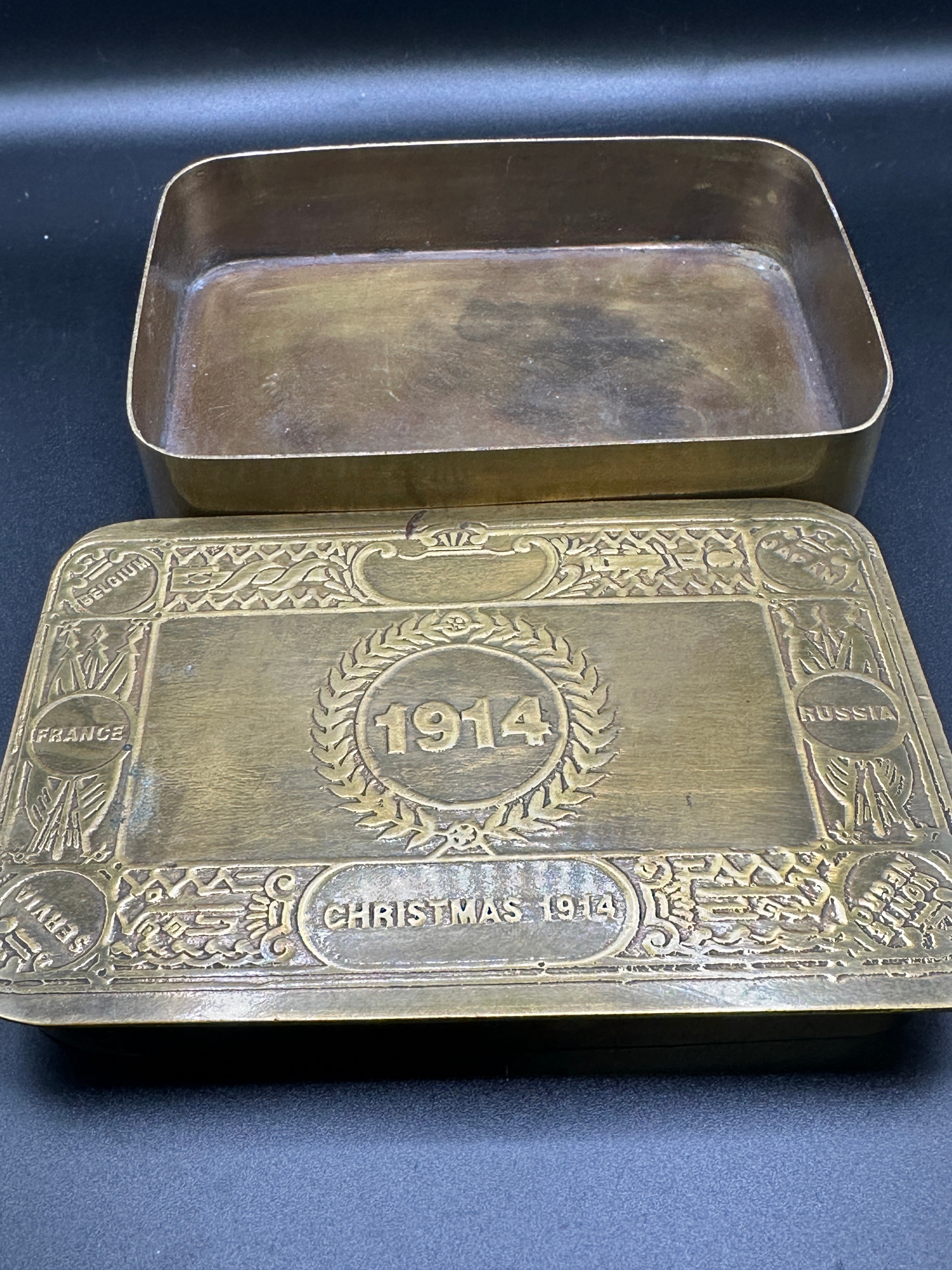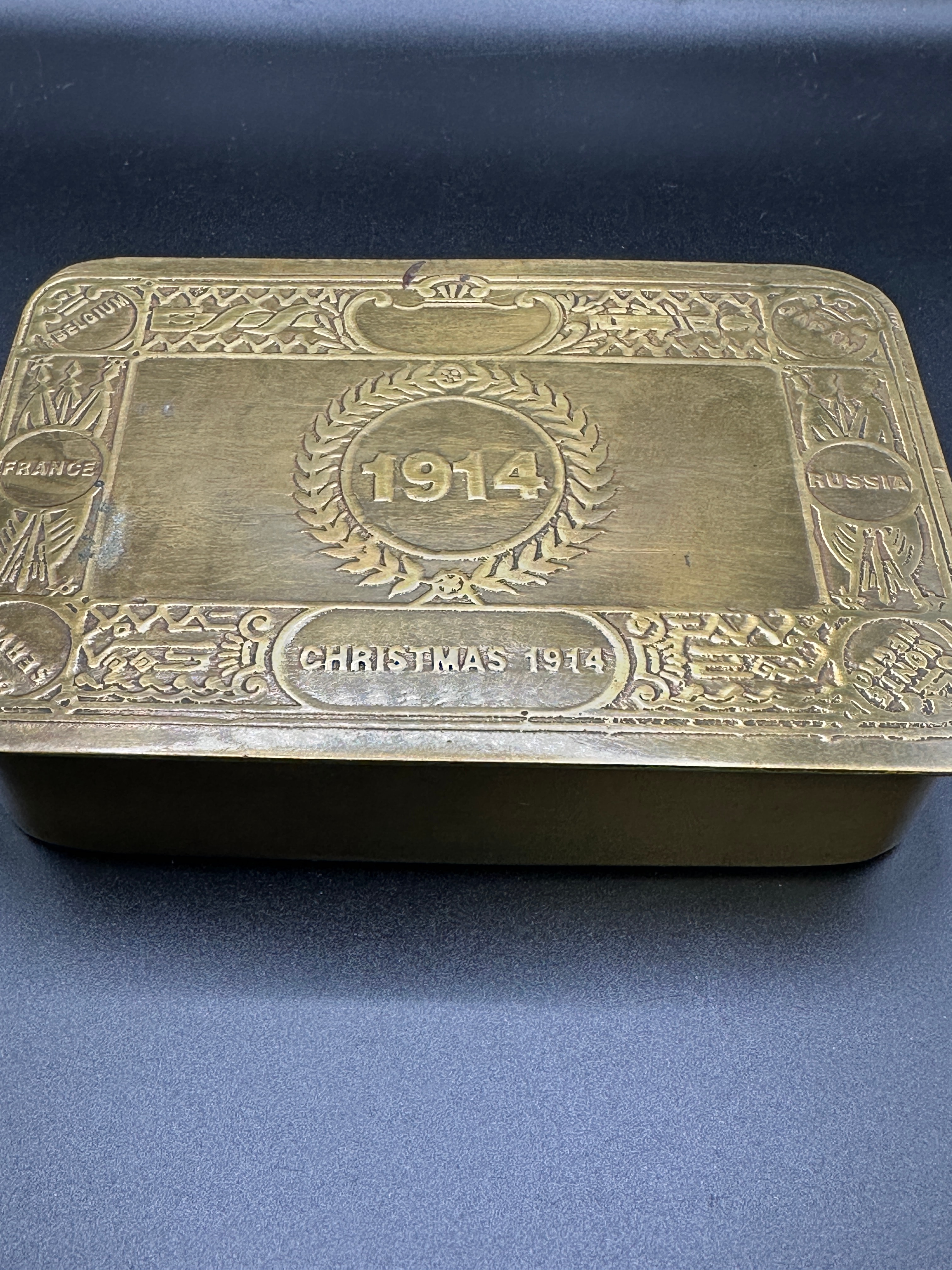 A Princess Mary Christmas Gift Box, 1914. This rectangular, lidded metal box, likely brass or a brass-plated alloy, exhibits a patinated and somewhat tarnished surface. The lid is extensively embossed with a central design featuring “1914” within a laurel wreath, and “CHRISTMAS 1914” in a decorative cartouche below. Around the border, the names of nations are inscribed: “BELGIUM”, “RUSSIA”, “SERBIA”, and “FRANCE”. The visible English text provides clear dating to the Christmas of 1914, strongly associating it with the early period of World War I.