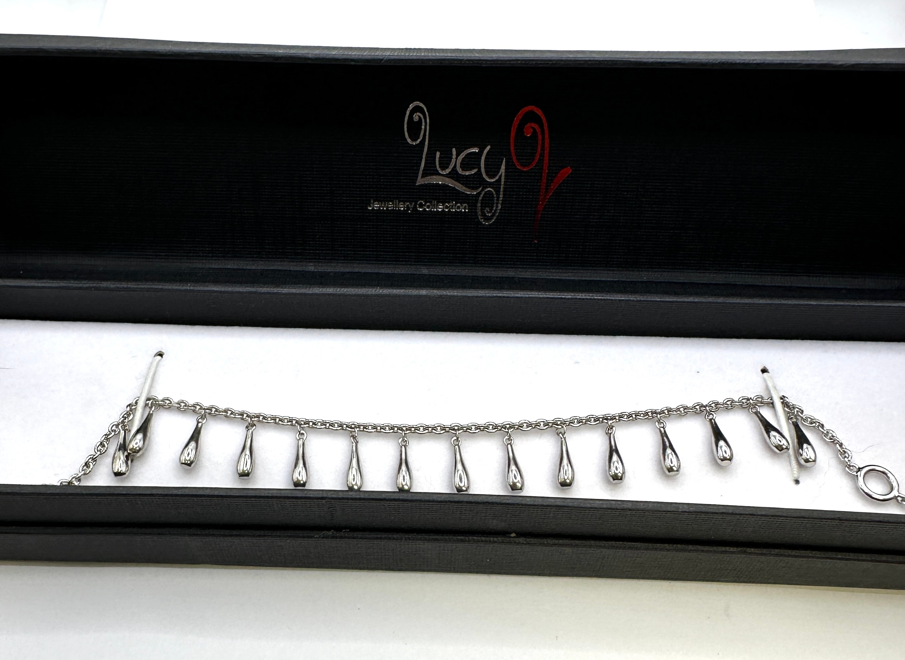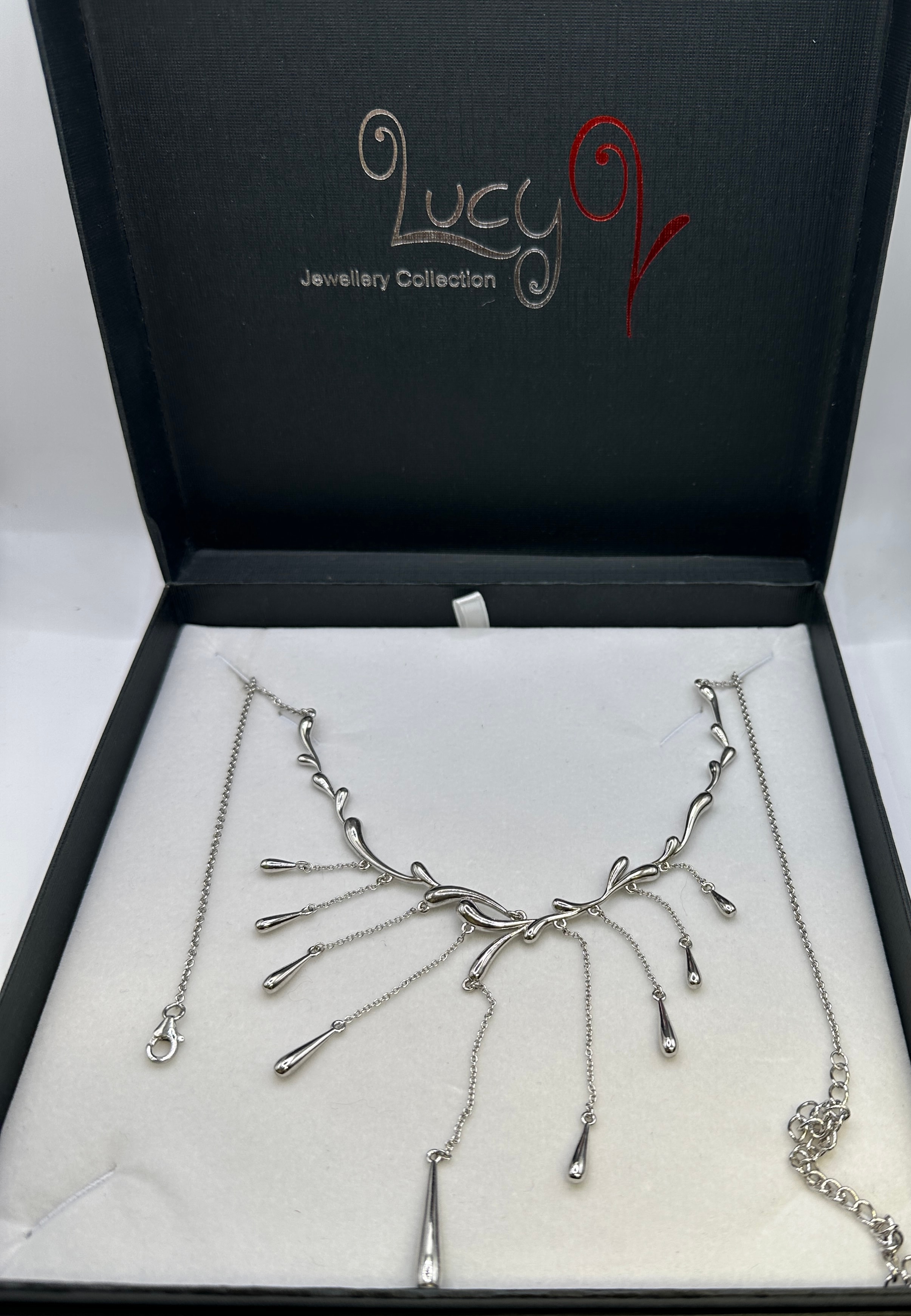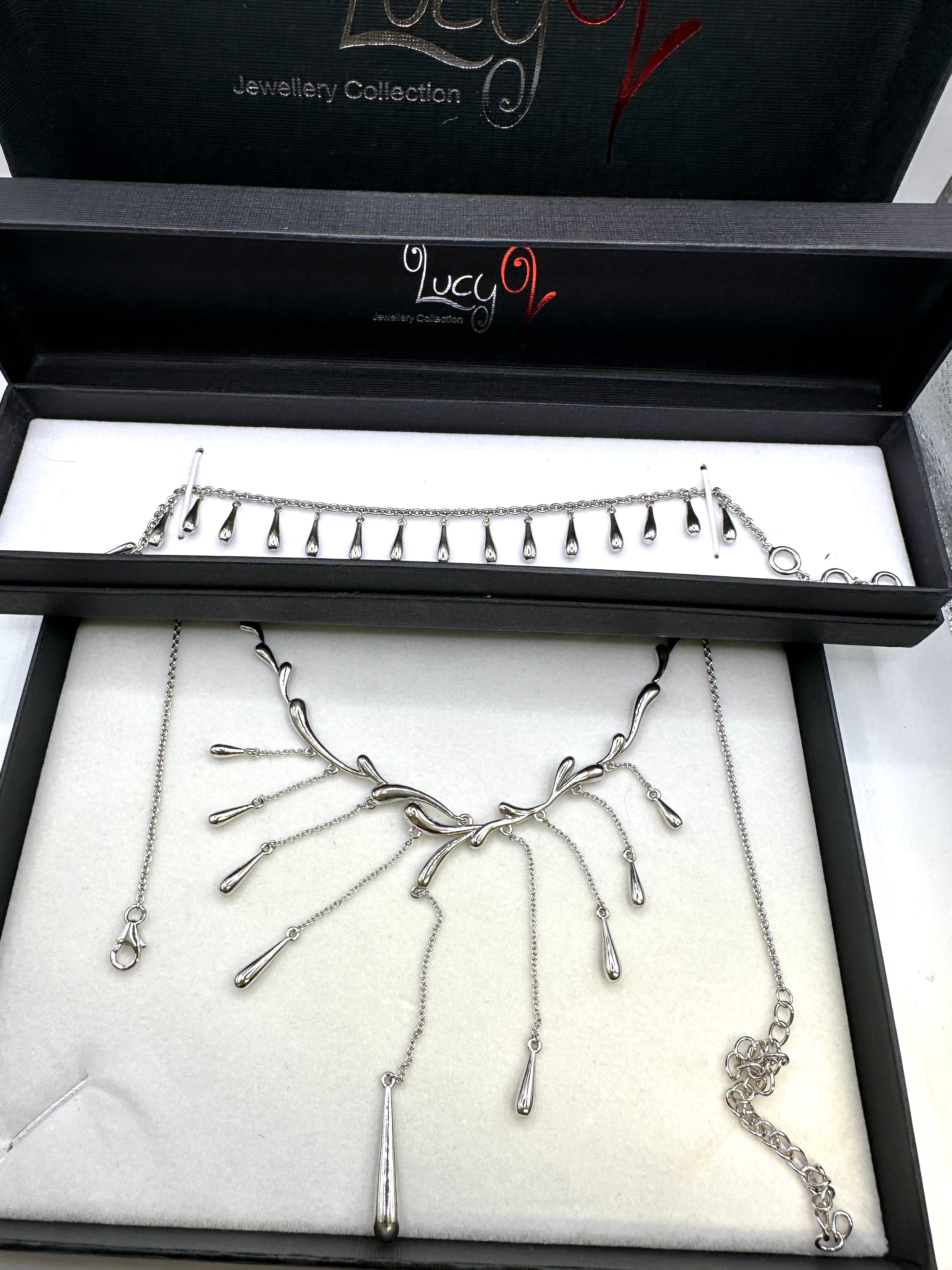 A white metalrmulti-drop necklace and matching bracelet set. Both pieces are crafted from polished rhodium-plated sterling silver. The necklace features an organic, abstract central design with multiple suspended chains terminating in teardrop pendants. The bracelet is a chain-link design adorned with numerous smaller, evenly spaced teardrop pendants. The set is presented in its original black ‘Lucy Q Jewellery Collection’ presentation box.