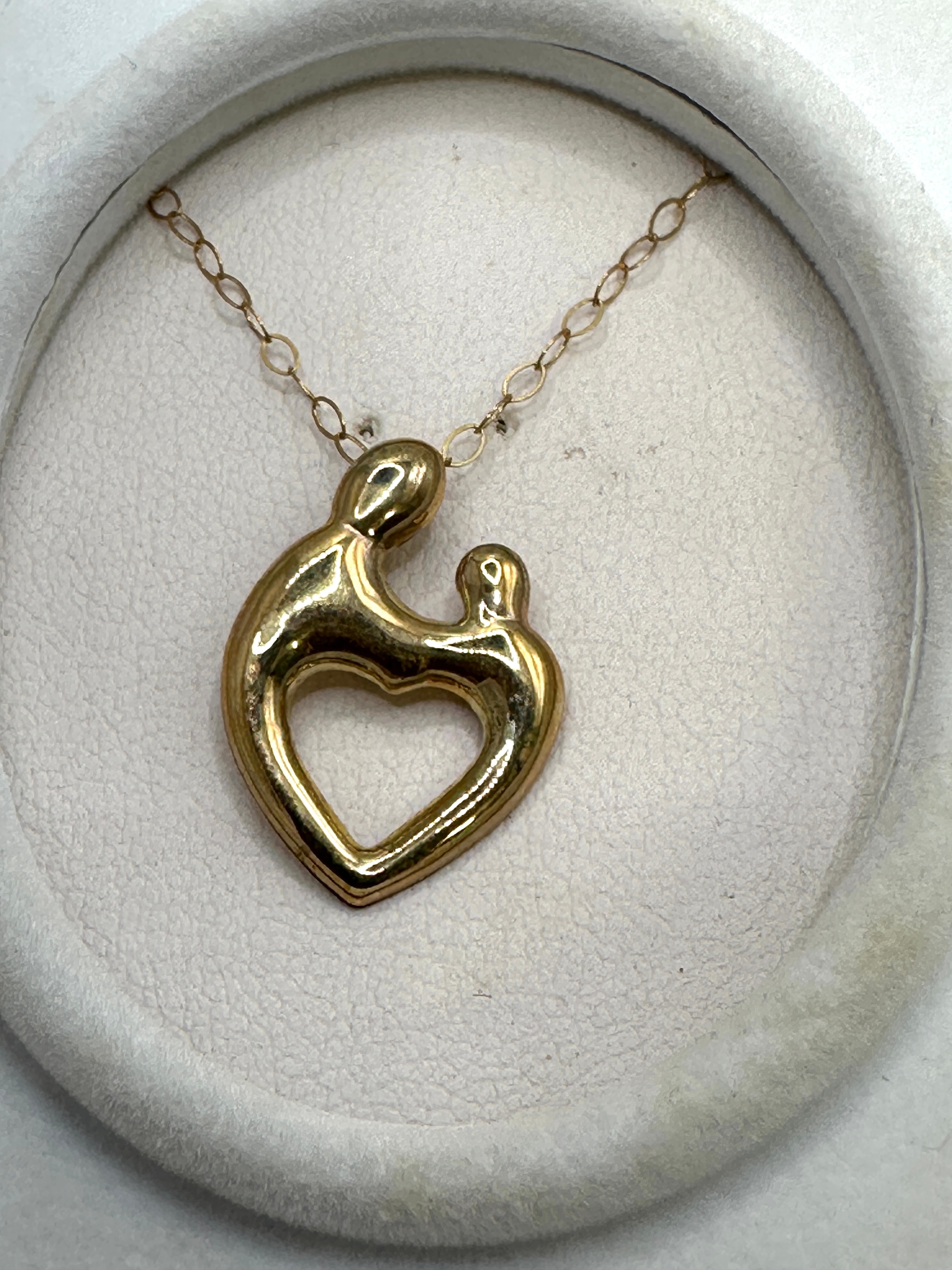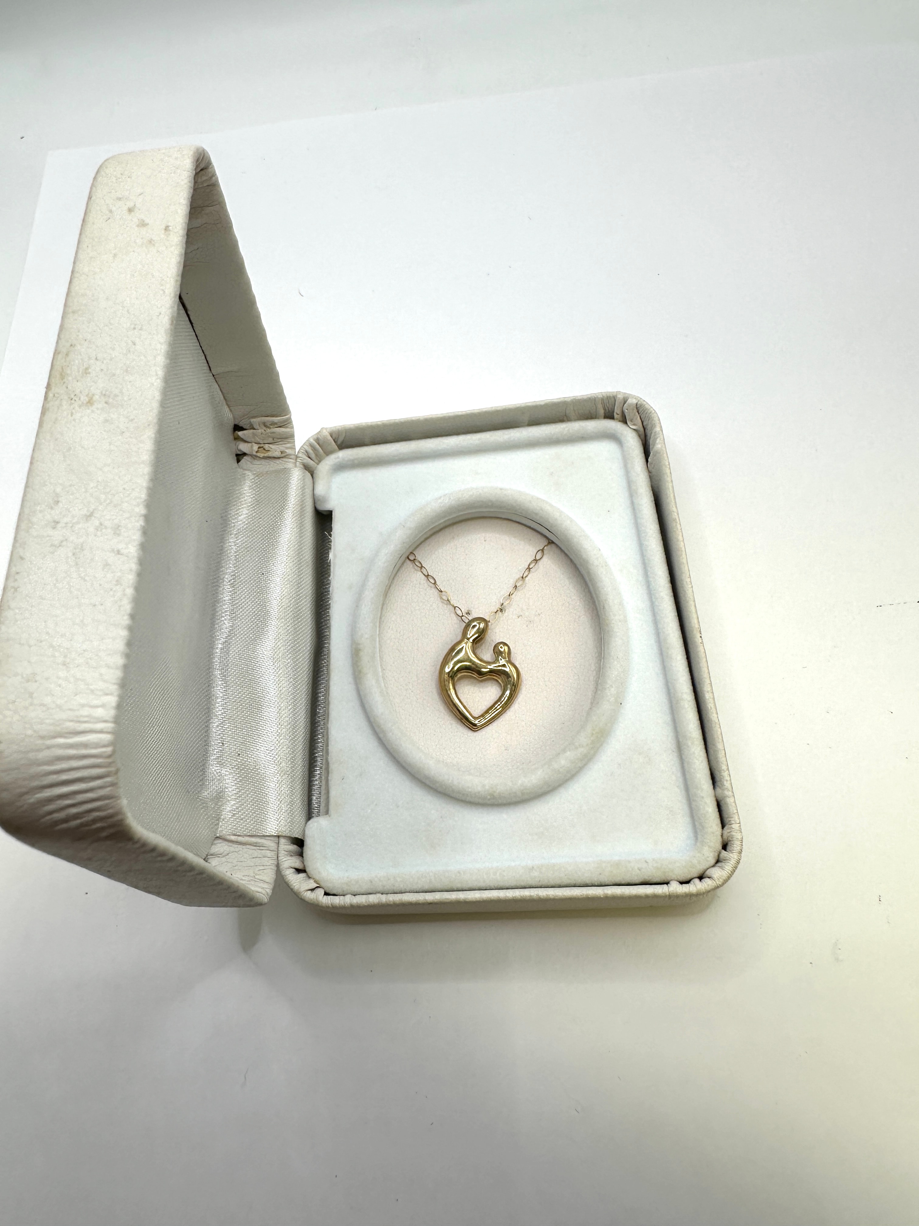 A necklace featuring a figural pendant and chain, crafted from 9k gold, exhibiting a polished finish with minor surface wear. The pendant’s abstract design depicts two intertwined figures, a larger one embracing a smaller one, with the negative space forming a heart shape, commonly associated with a “mother and child” motif. No discernible hallmarks, maker’s marks, or text are visible on the necklace. The necklace is presented within an open, worn white hinged box with a white fabric-lined insert.