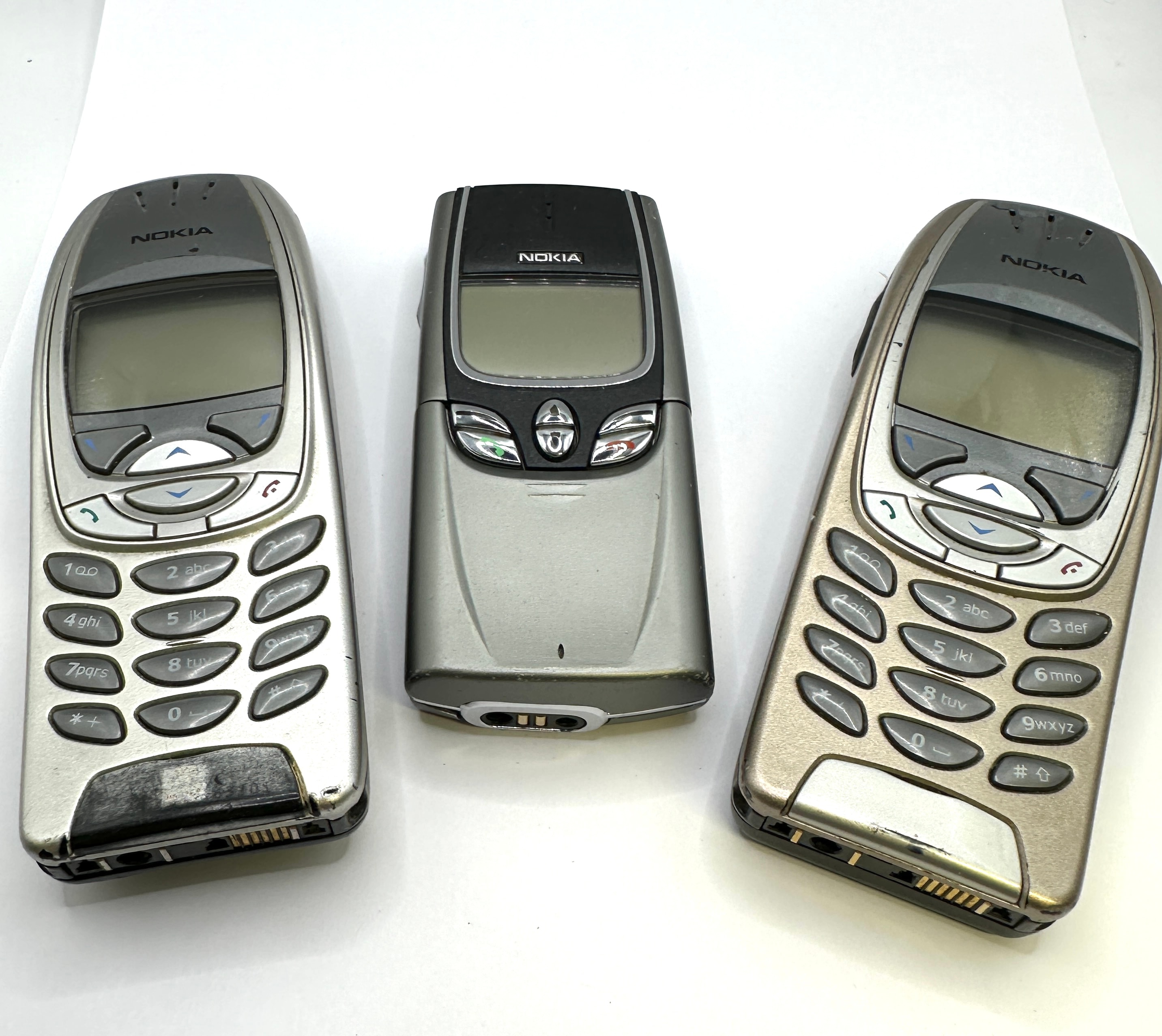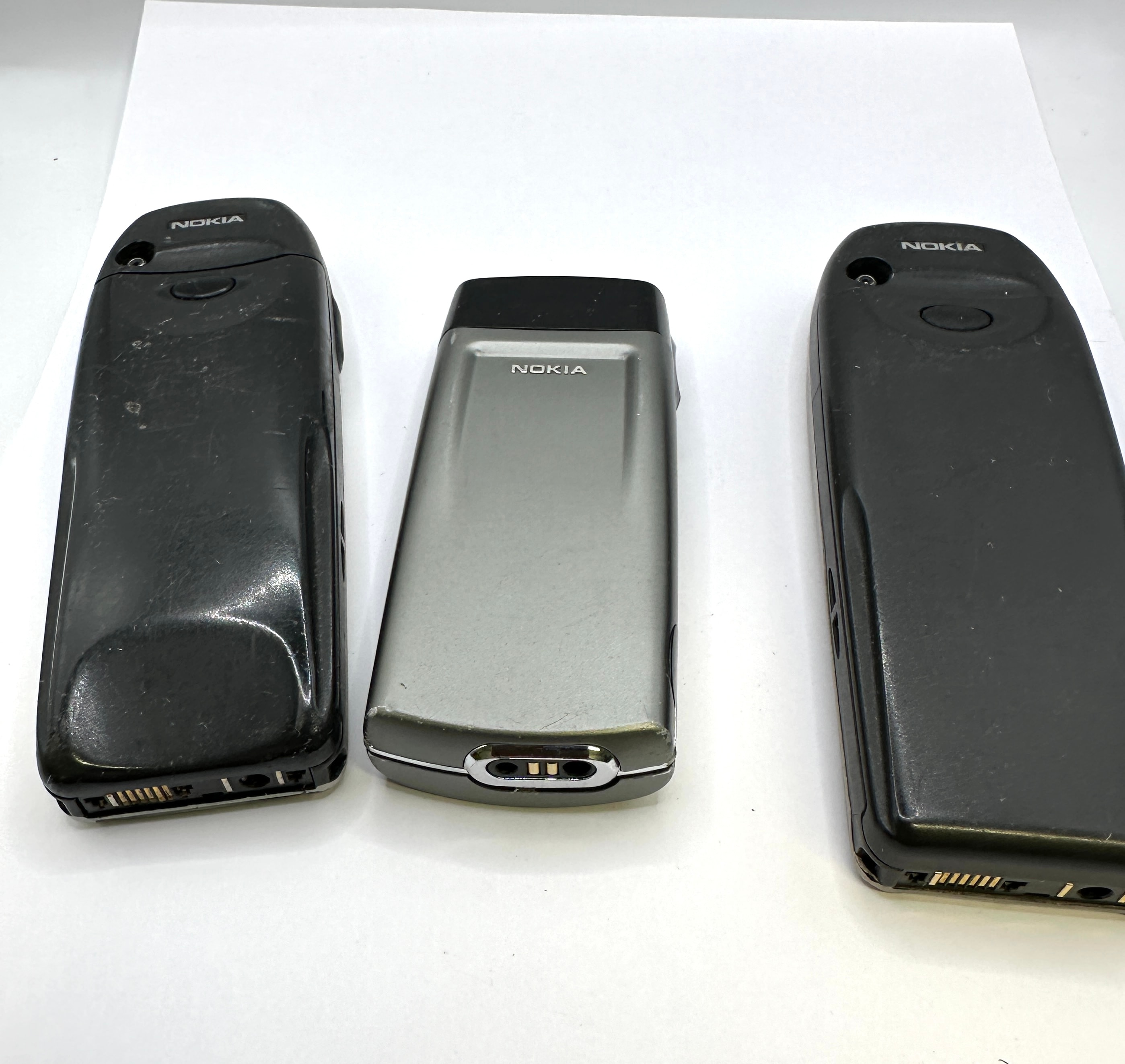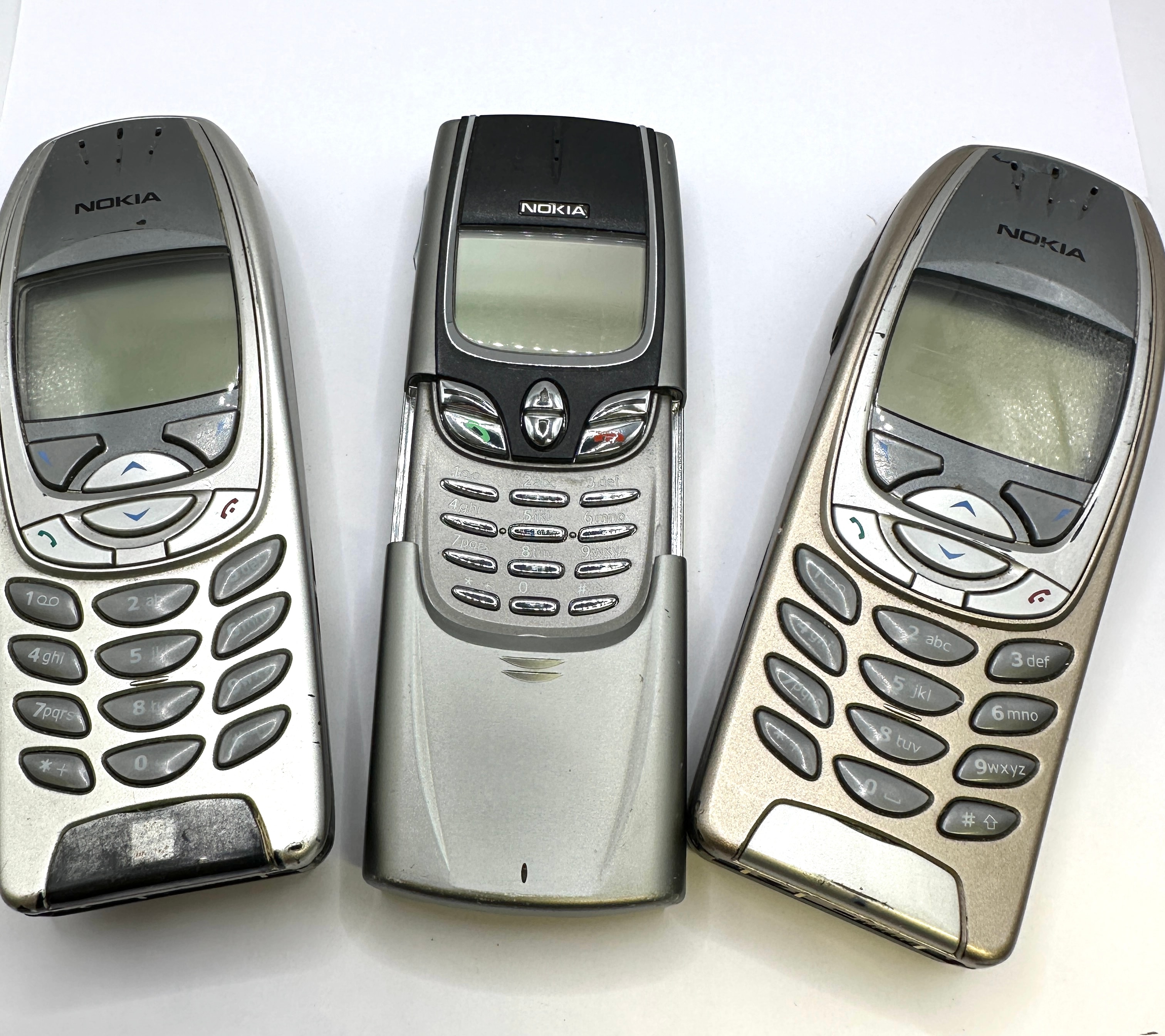 Three Nokia mobile phones. The central unit is a slider model in black and silver-grey, identified through web intelligence as a Nokia 8890. The left and right phones are monoblock designs, presented in silver-grey and champagne-gold finishes respectively, paired with dark grey elements. All units feature monochrome displays, alphanumeric keypads with standard English characters, and are constructed from plastic and metallic-finish materials, typical of late 1990s to early 2000s “feature phone” era designs.