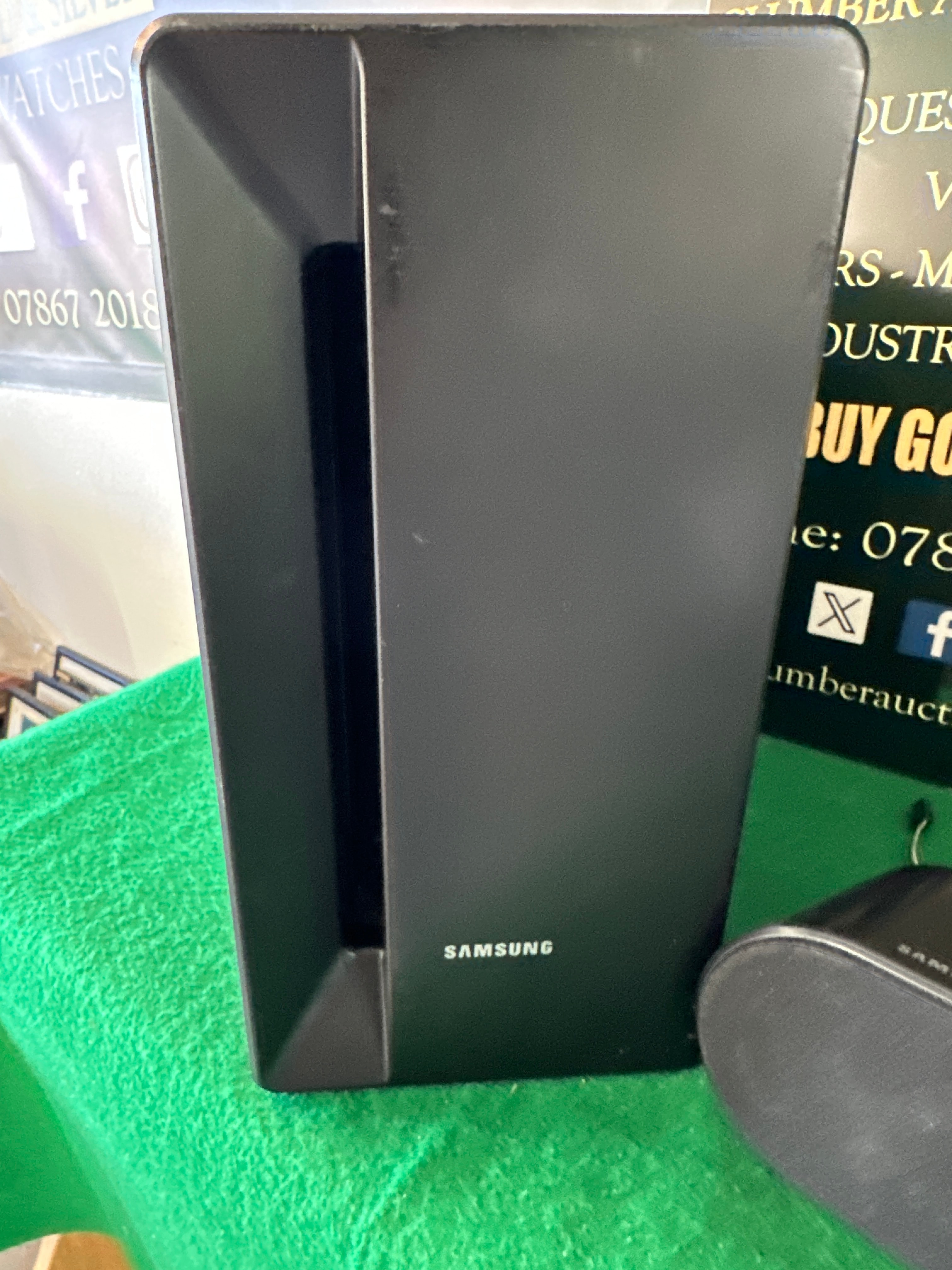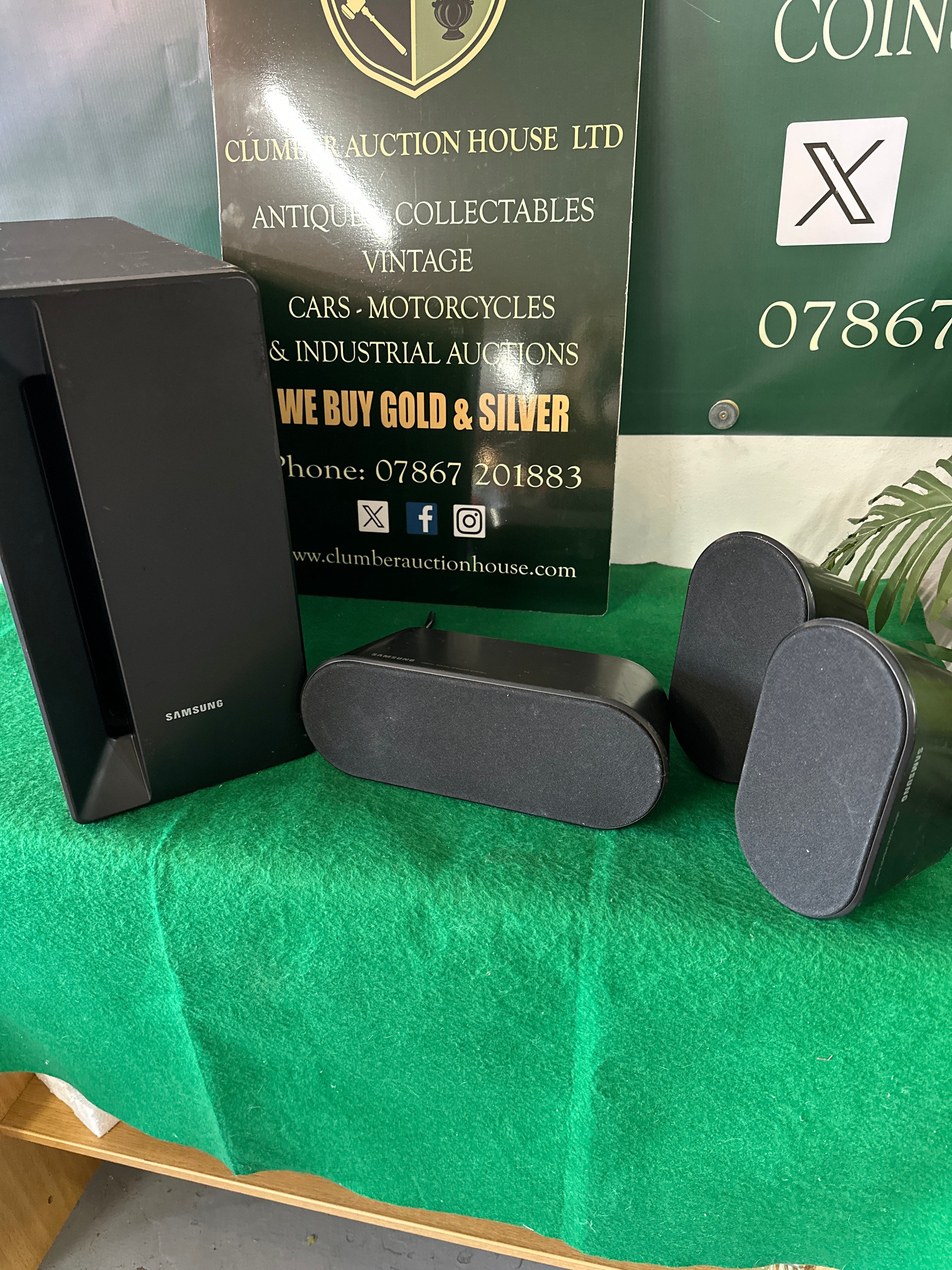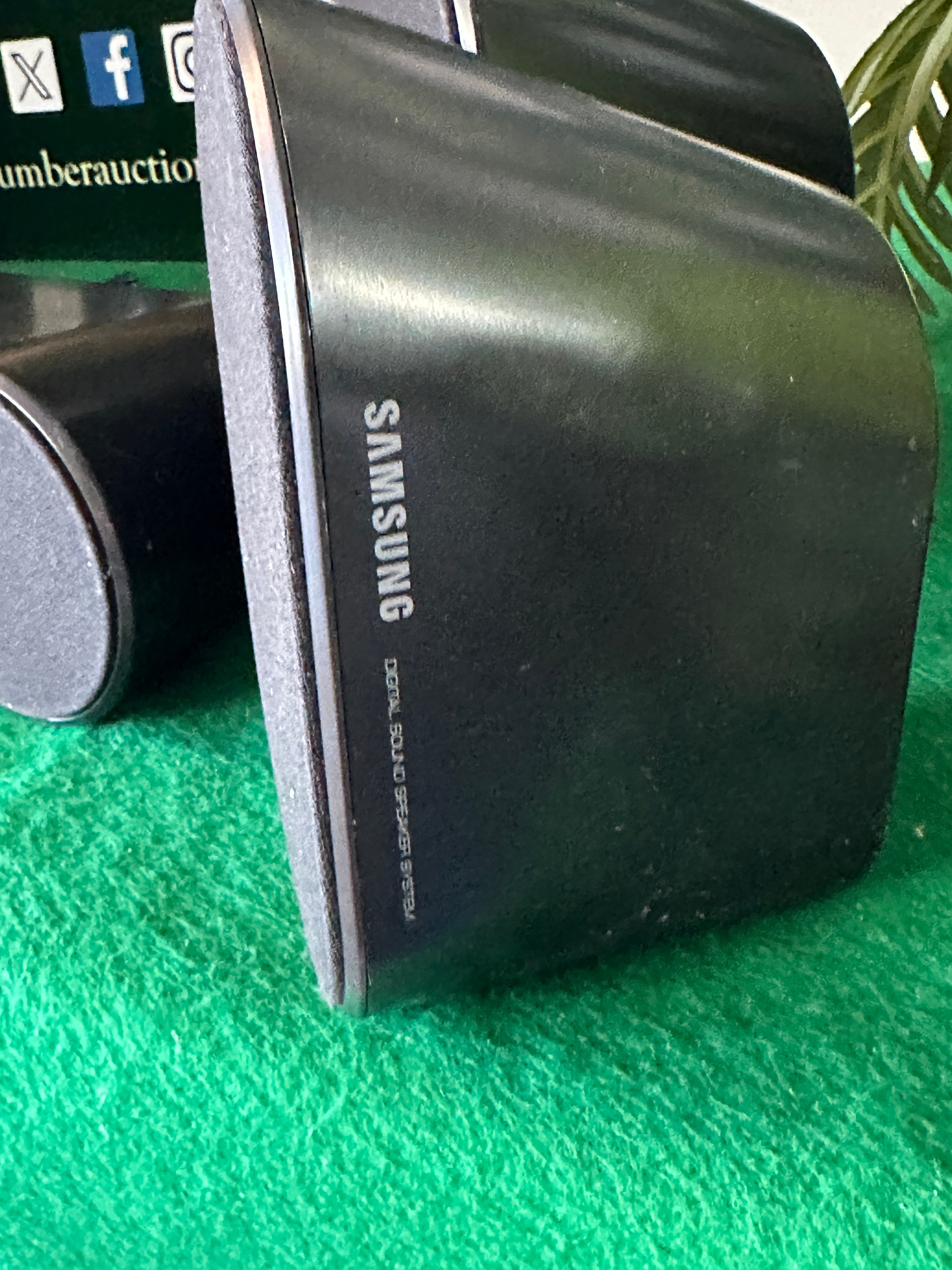 A Samsung Digital Sound Speaker System, comprising one taller, rectangular main unit and three smaller, oval-shaped satellite speakers. The components are primarily constructed of black plastic with visible fabric speaker grilles, exhibiting a modern aesthetic. “SAMSUNG” is clearly visible on the main unit and the smaller speakers, with “DIGITAL SOUND SPEAKER SYSTEM” also marked on at least two of the smaller units. An associated bundled cable is included.
