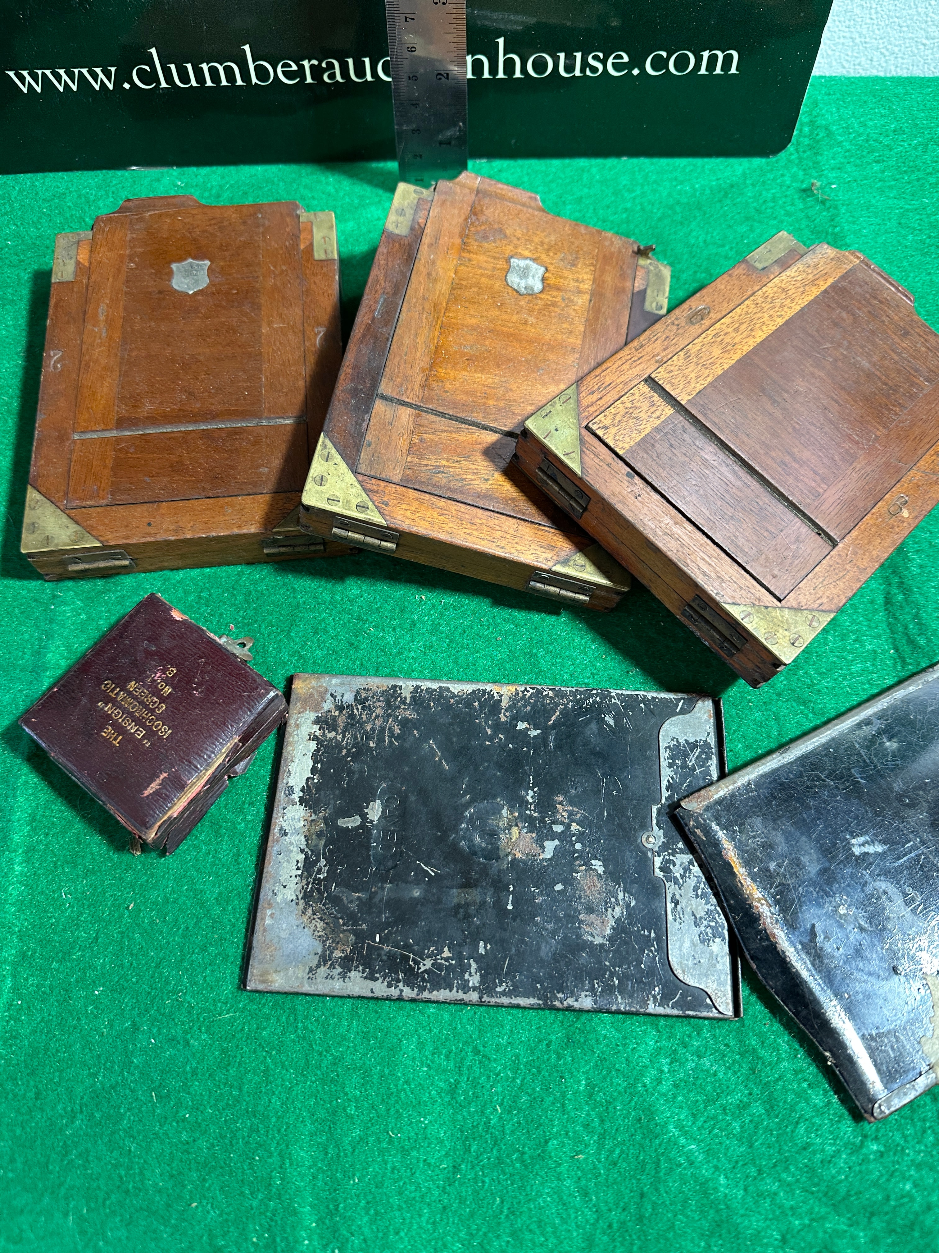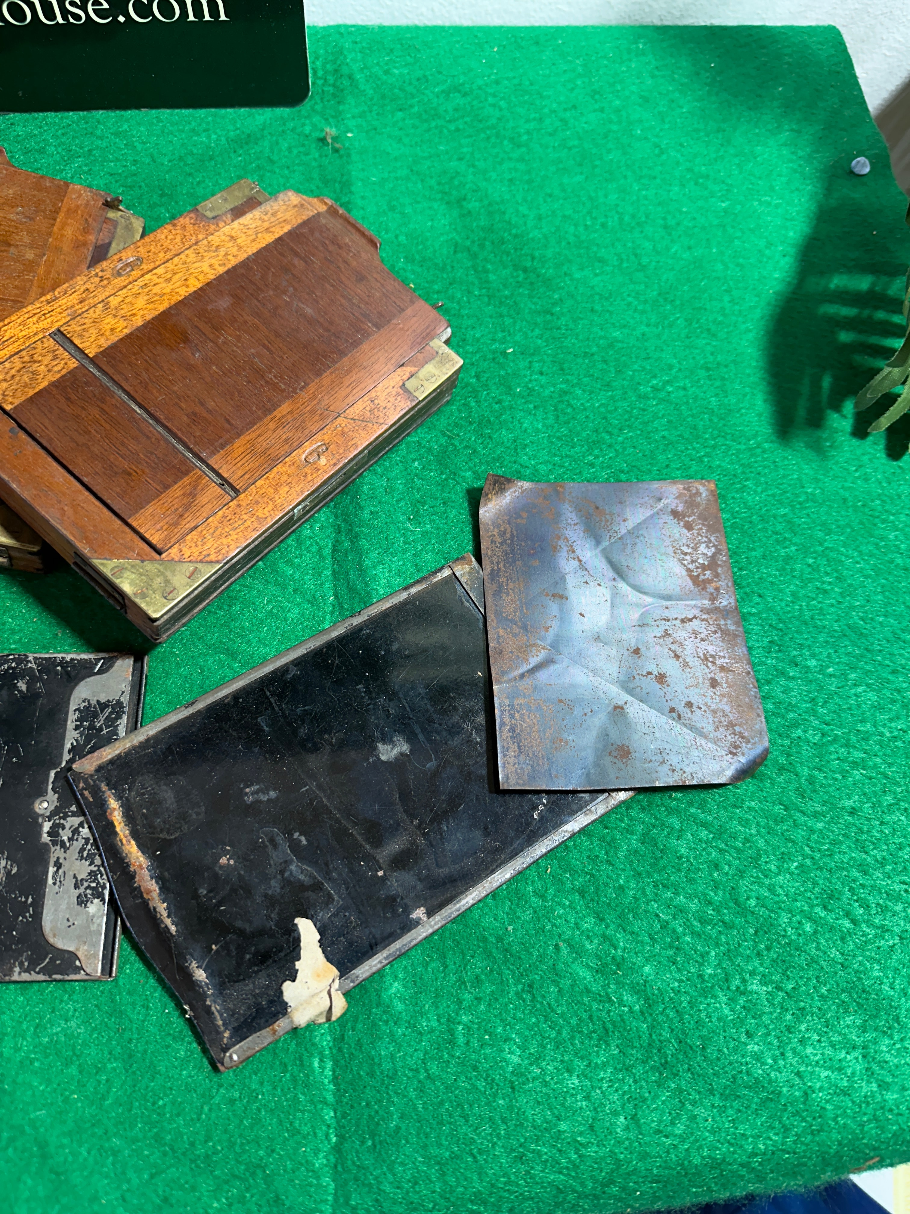 A collection of antique photographic equipment, centered around a late 19th or early 20th-century wooden field or plate camera. The camera features a leather handle, brass fittings, and an internal lens assembly. Accompanying the camera are a loose square-mounted lens, three wooden double plate holders with brass corner reinforcements and small silver-toned escutcheons, and several dark metal sheets appearing to be photographic plates or dark slides. A small, dark red fabric-covered box is also included, bearing the partially legible inscription “THE IMPERIAL HANDICAP CAMERA”. The items are predominantly crafted from polished wood, brass, leather, and metal.