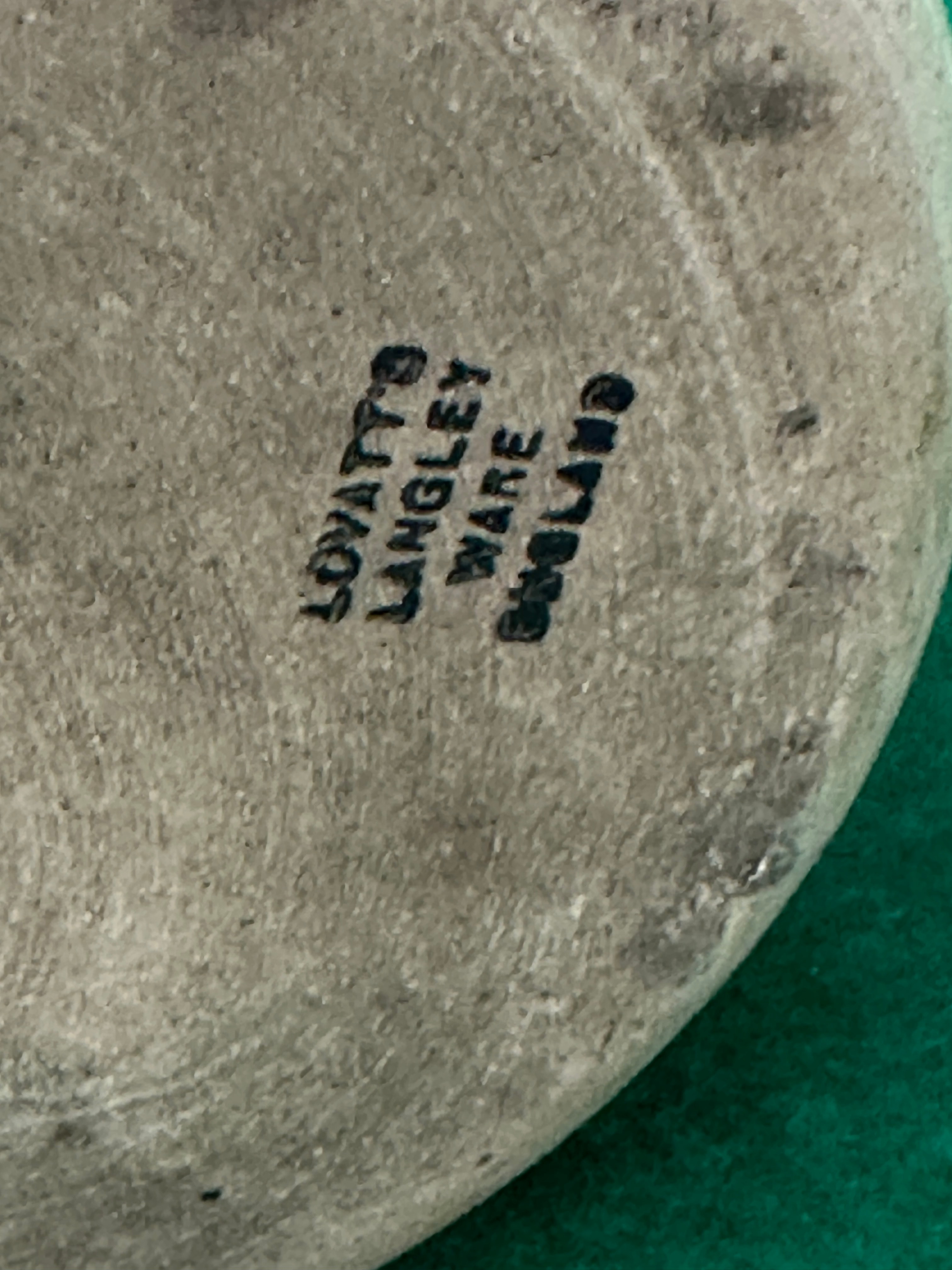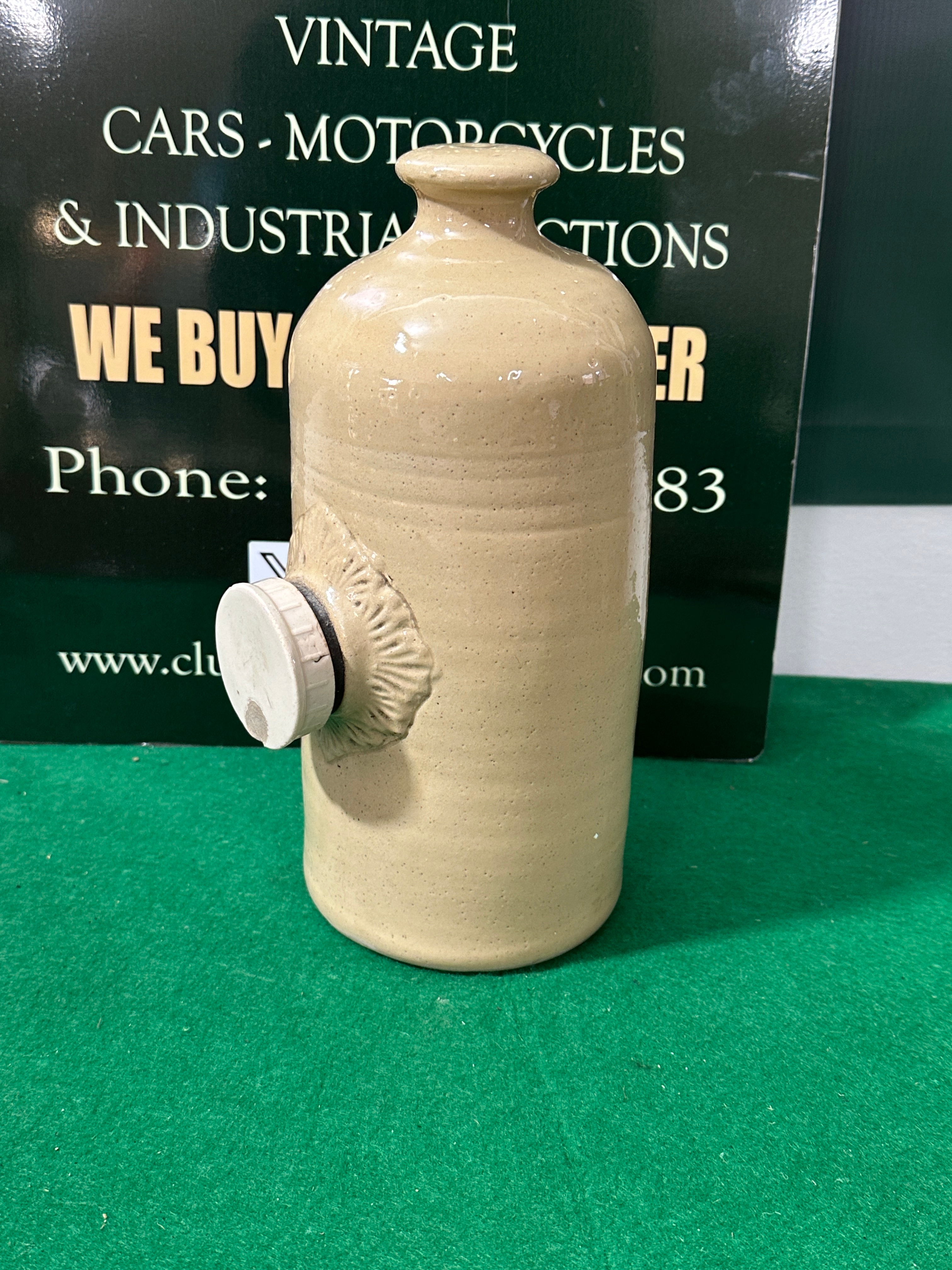 A vintage Lovatts Langley Ware stoneware hot water bottle, also known as a bed warmer. Crafted from speckled beige salt-glazed pottery, it features a narrow neck at the top and a prominent ceramic screw-stopper opening on its side, surrounded by a raised, decorative sunburst or shell-like motif. The base is impressed with the text “LOVATTO LANGLEY WARE ENGLAND.”