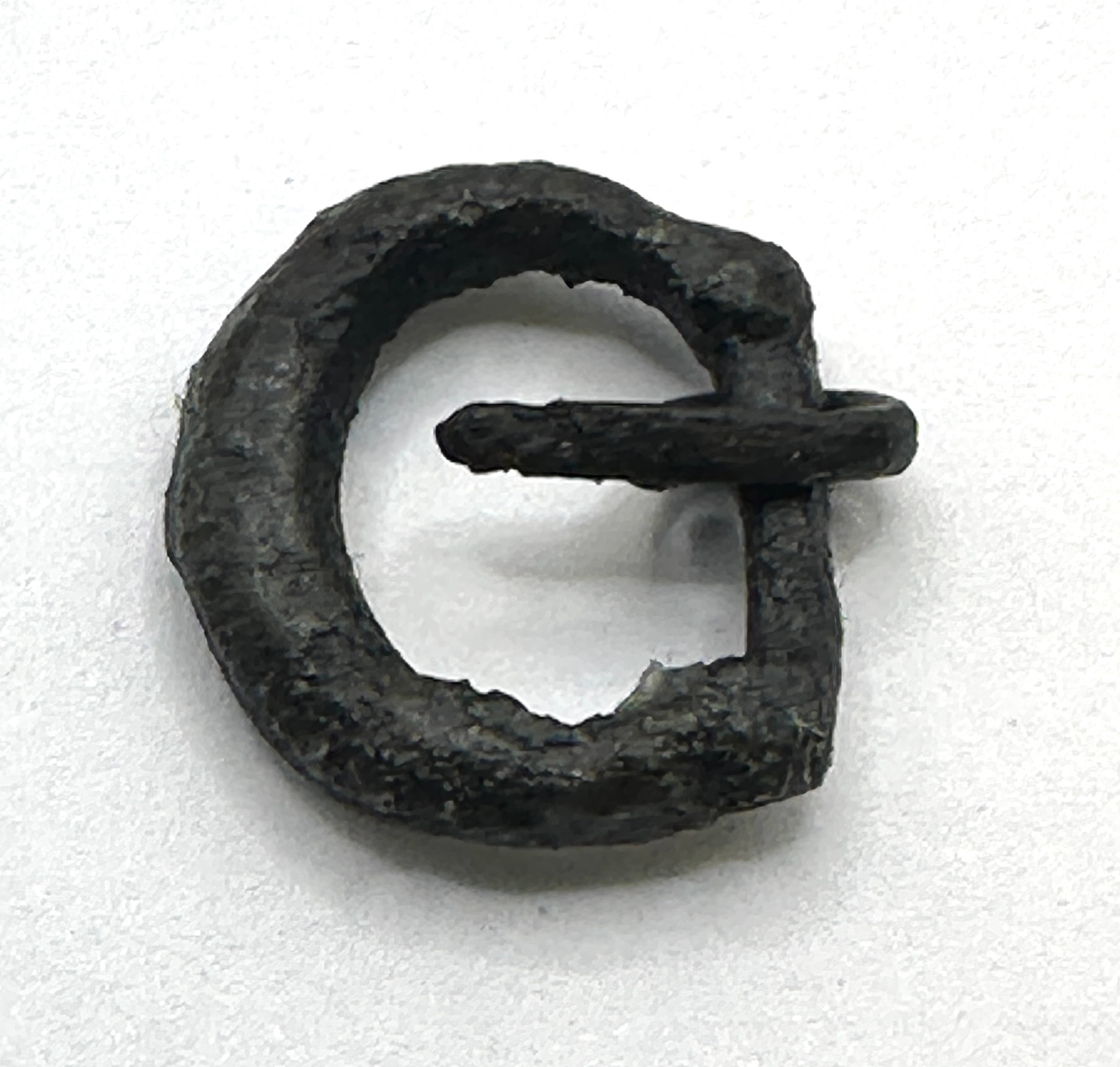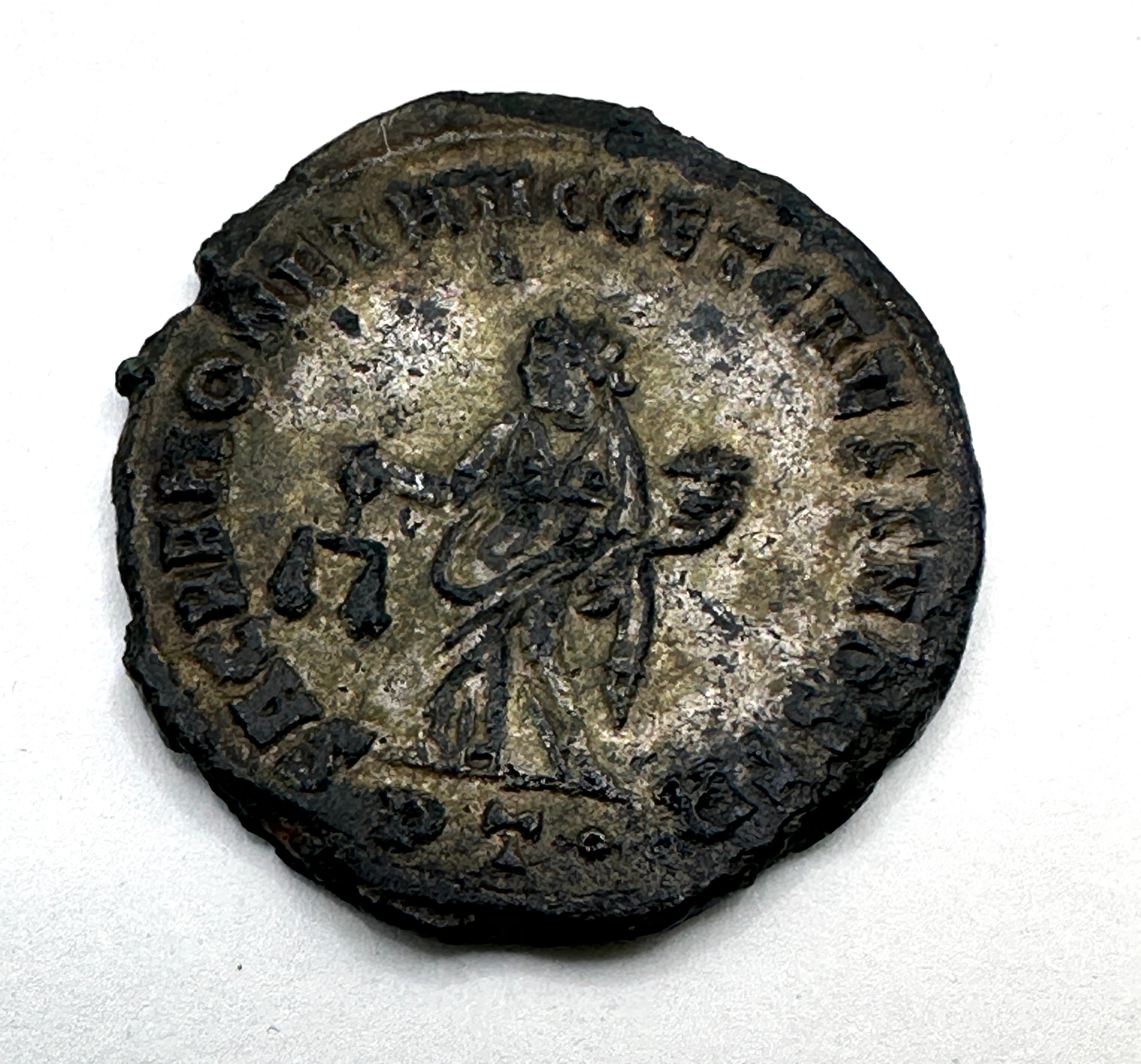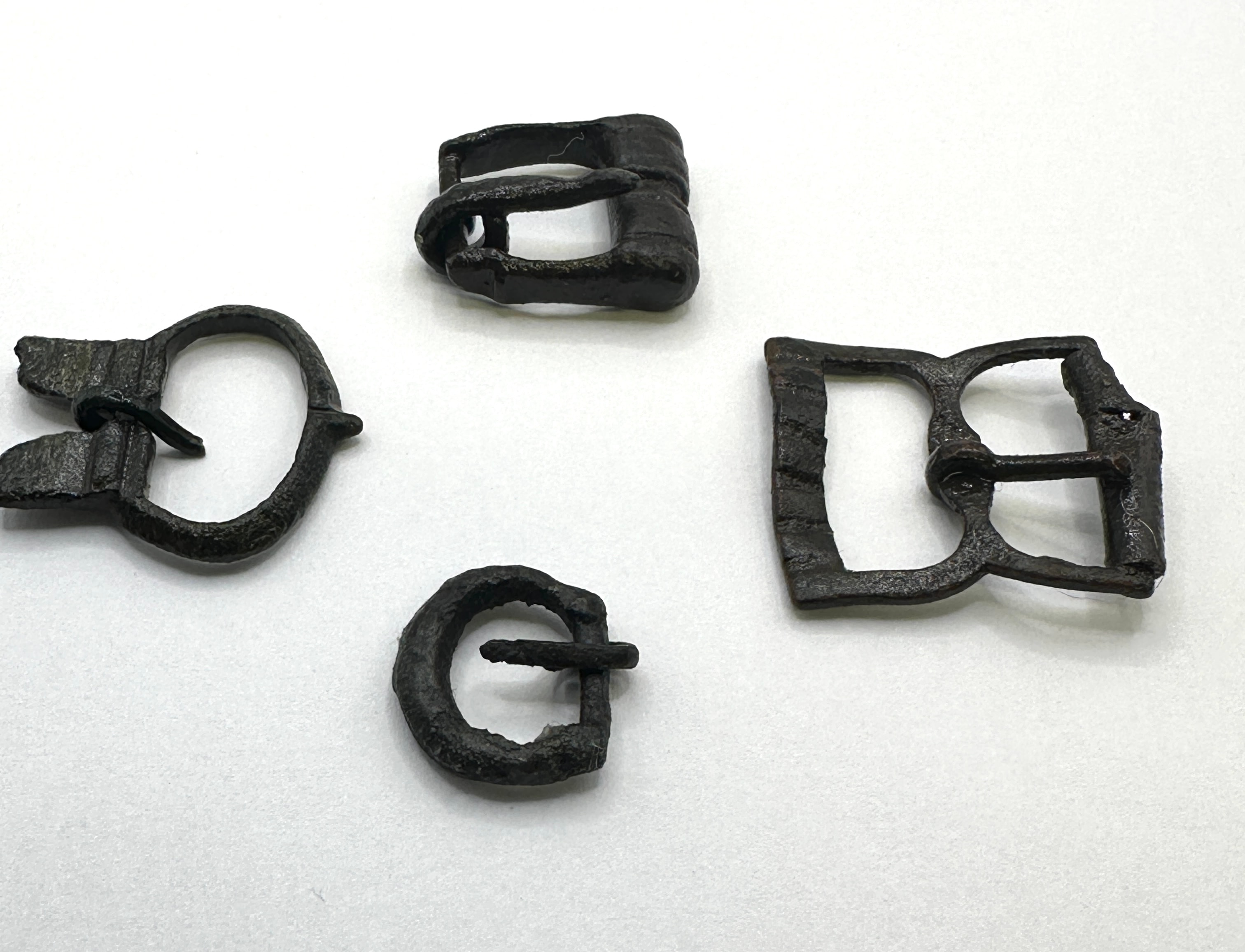A Roman bronze coin, likely of Constantius I, accompanied by a group of four Roman iron buckles. The coin features a male bust, likely an emperor, in profile on the obverse with partially legible Latin inscription around the rim, including “CONSTANTI…” and “AVG…”. The reverse depicts a standing female or allegorical figure holding scales, with partial Latin inscription “PROVIDENTIAE…”. The accompanying buckles vary in shape, including D-shaped, oval, and rectangular forms, and are consistent with excavated ferrous artifacts.