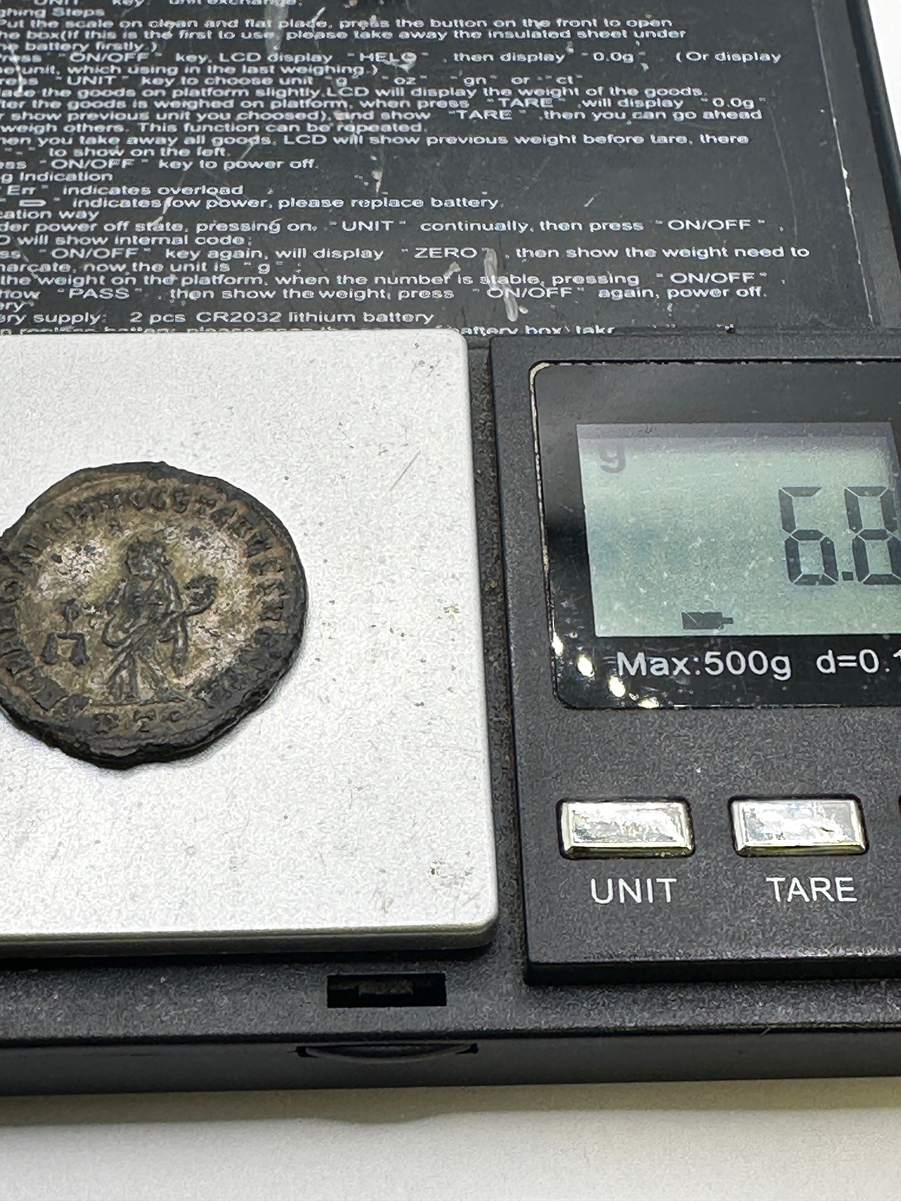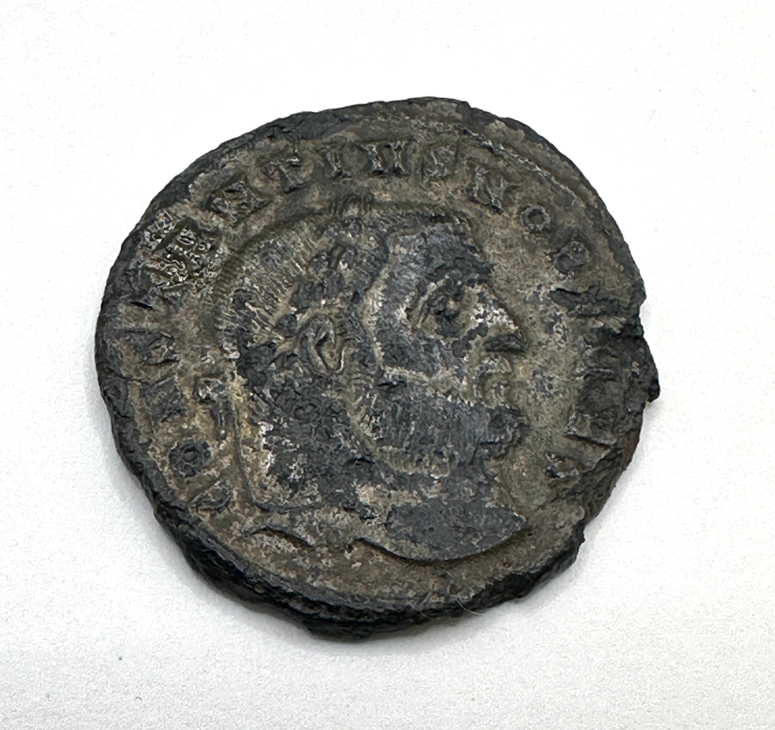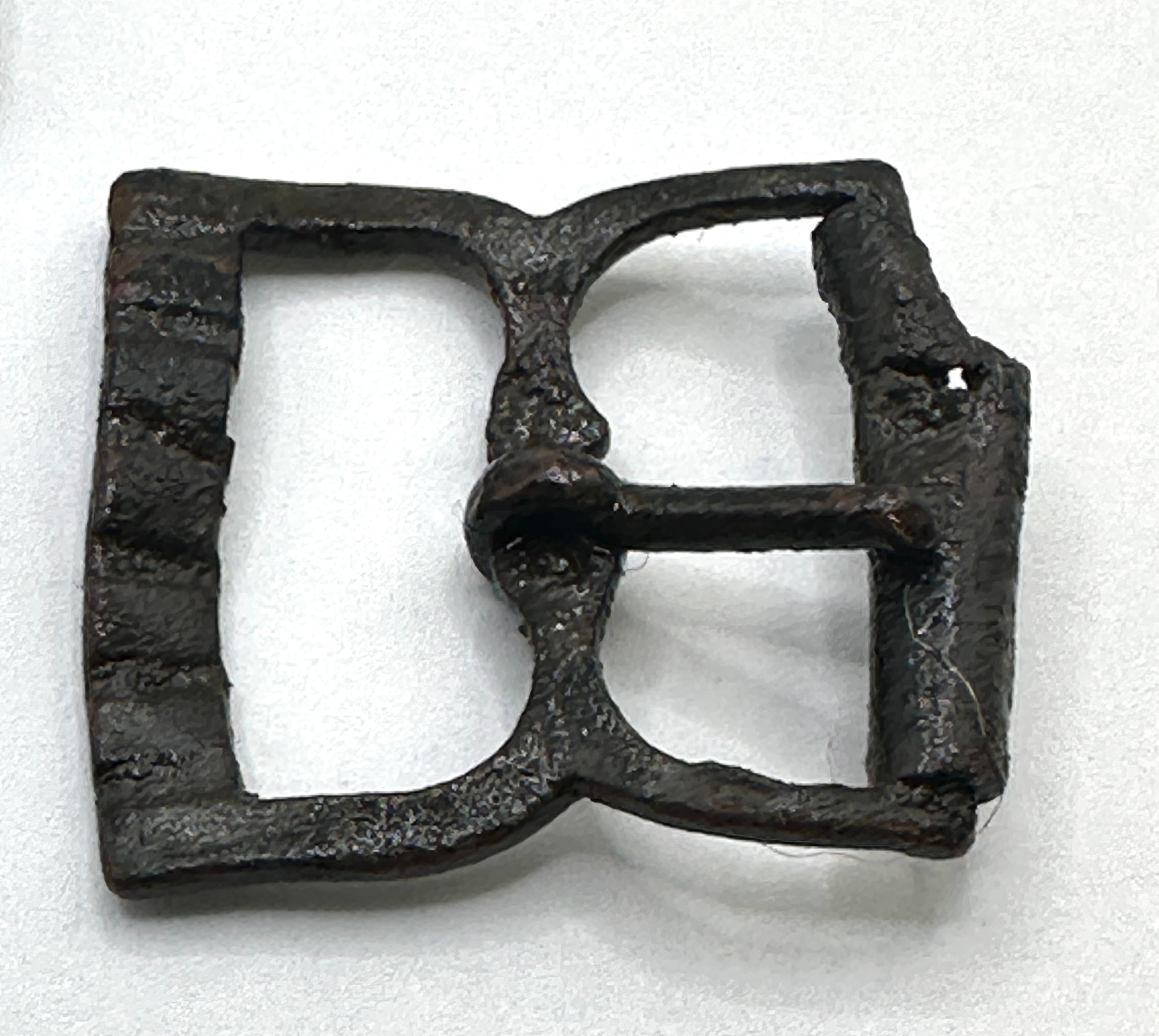 A Roman bronze coin, likely of Constantius I, accompanied by a group of four Roman iron buckles. The coin features a male bust, likely an emperor, in profile on the obverse with partially legible Latin inscription around the rim, including “CONSTANTI…” and “AVG…”. The reverse depicts a standing female or allegorical figure holding scales, with partial Latin inscription “PROVIDENTIAE…”. The accompanying buckles vary in shape, including D-shaped, oval, and rectangular forms, and are consistent with excavated ferrous artifacts.