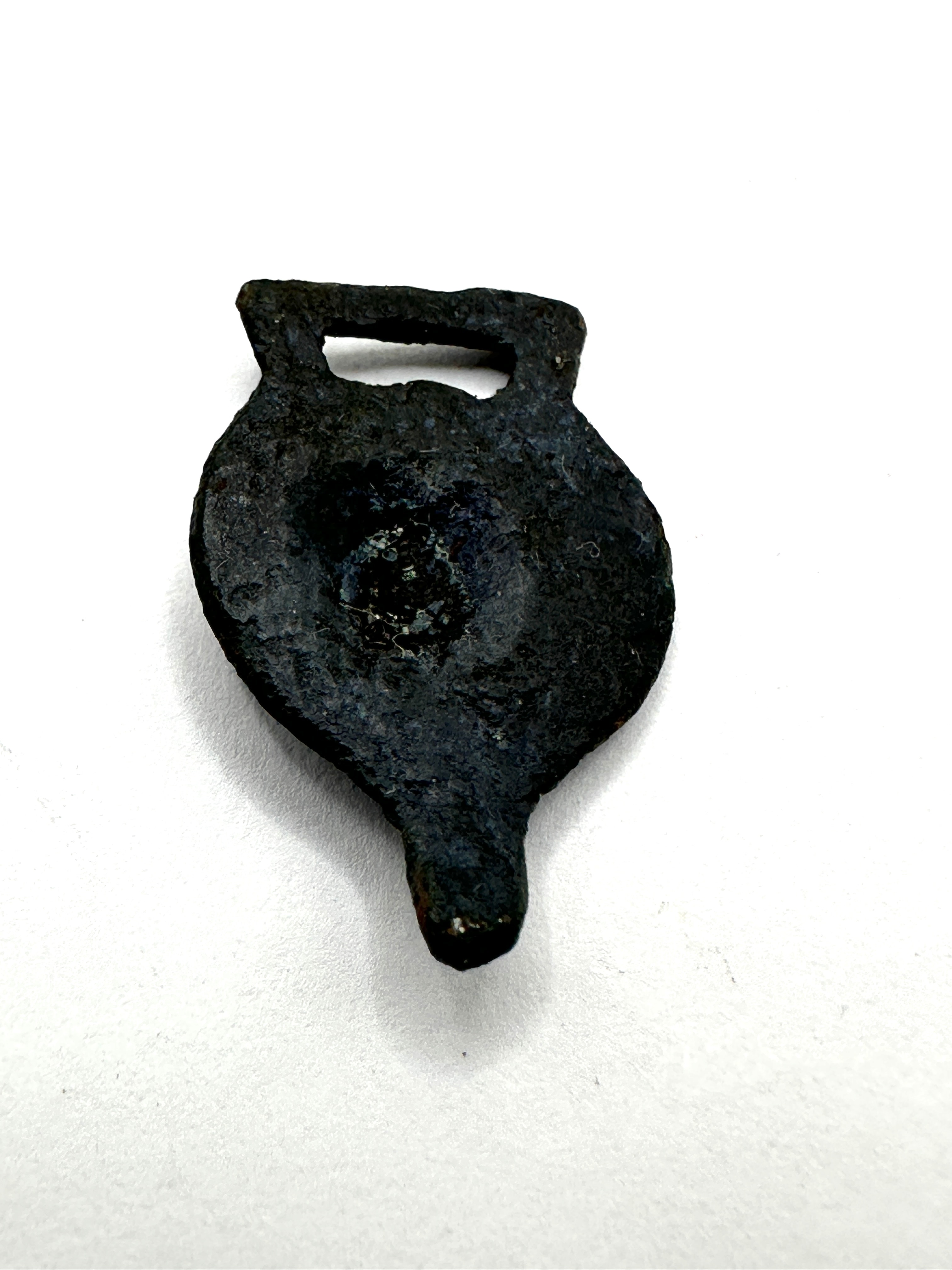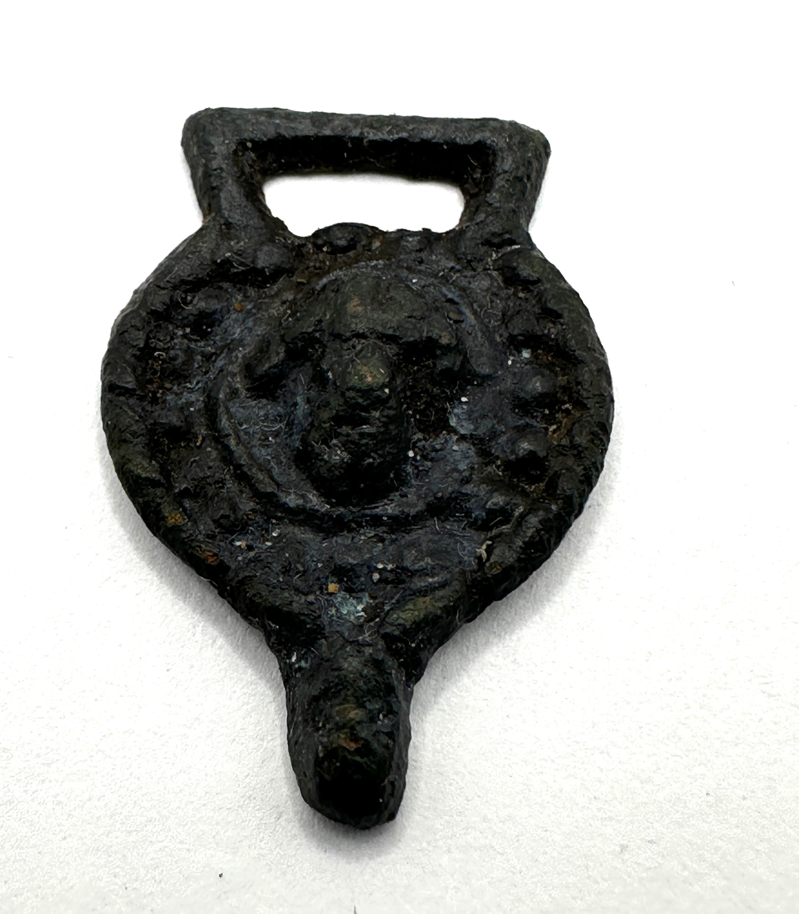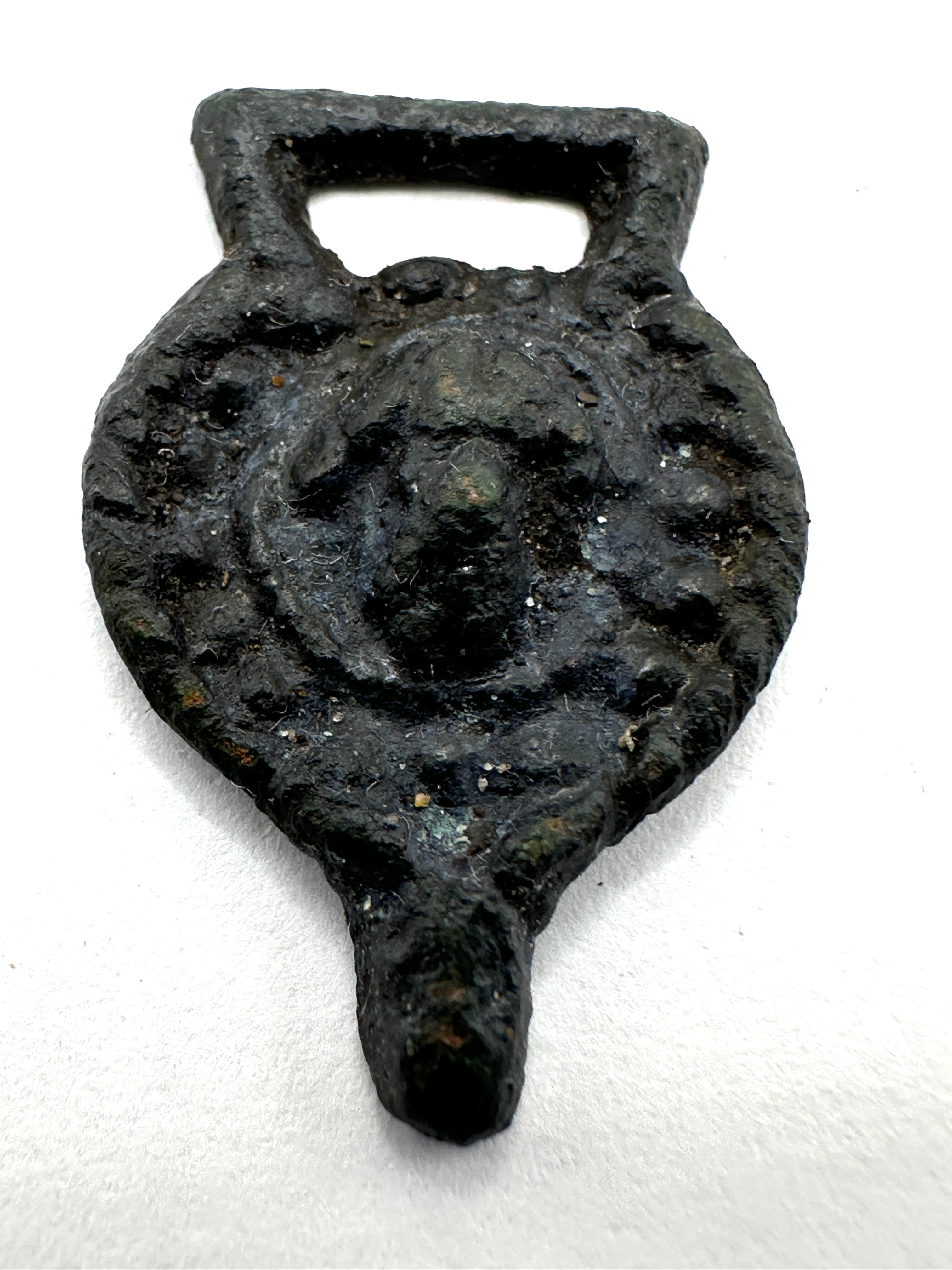 A Post-Medieval cast copper alloy hooked tag or clasp. The object features a distinct suspension loop at the top, a broad, somewhat shield or heart-shaped body, and a tapering projection at the base, consistent with a hooked fastener. The obverse displays a central, deeply cast relief of a stylized, possibly anthropomorphic or mask-like face, surrounded by concentric raised lines or decorative elements. The reverse is comparatively plain with a central depression or boss. The object is formed from a copper alloy.