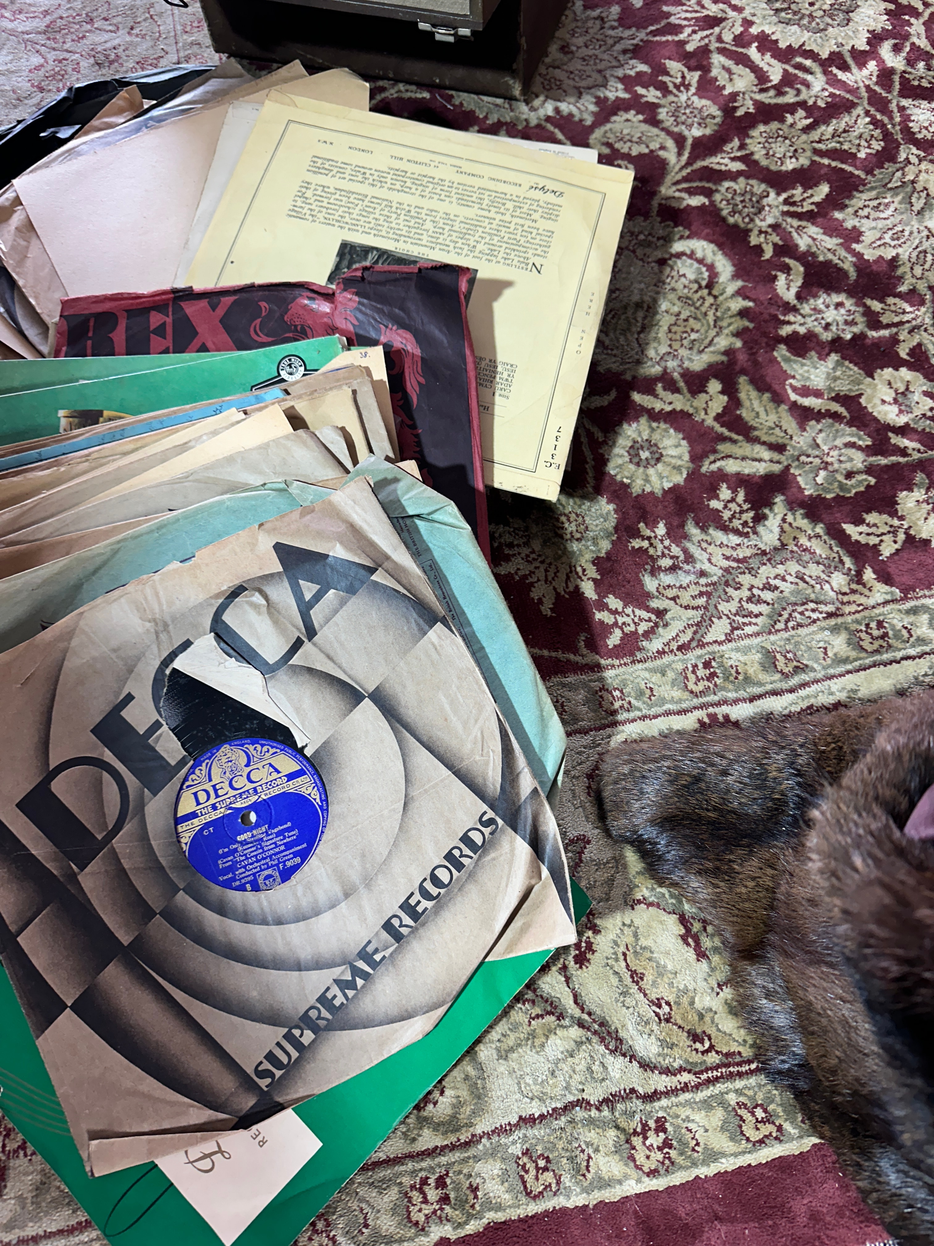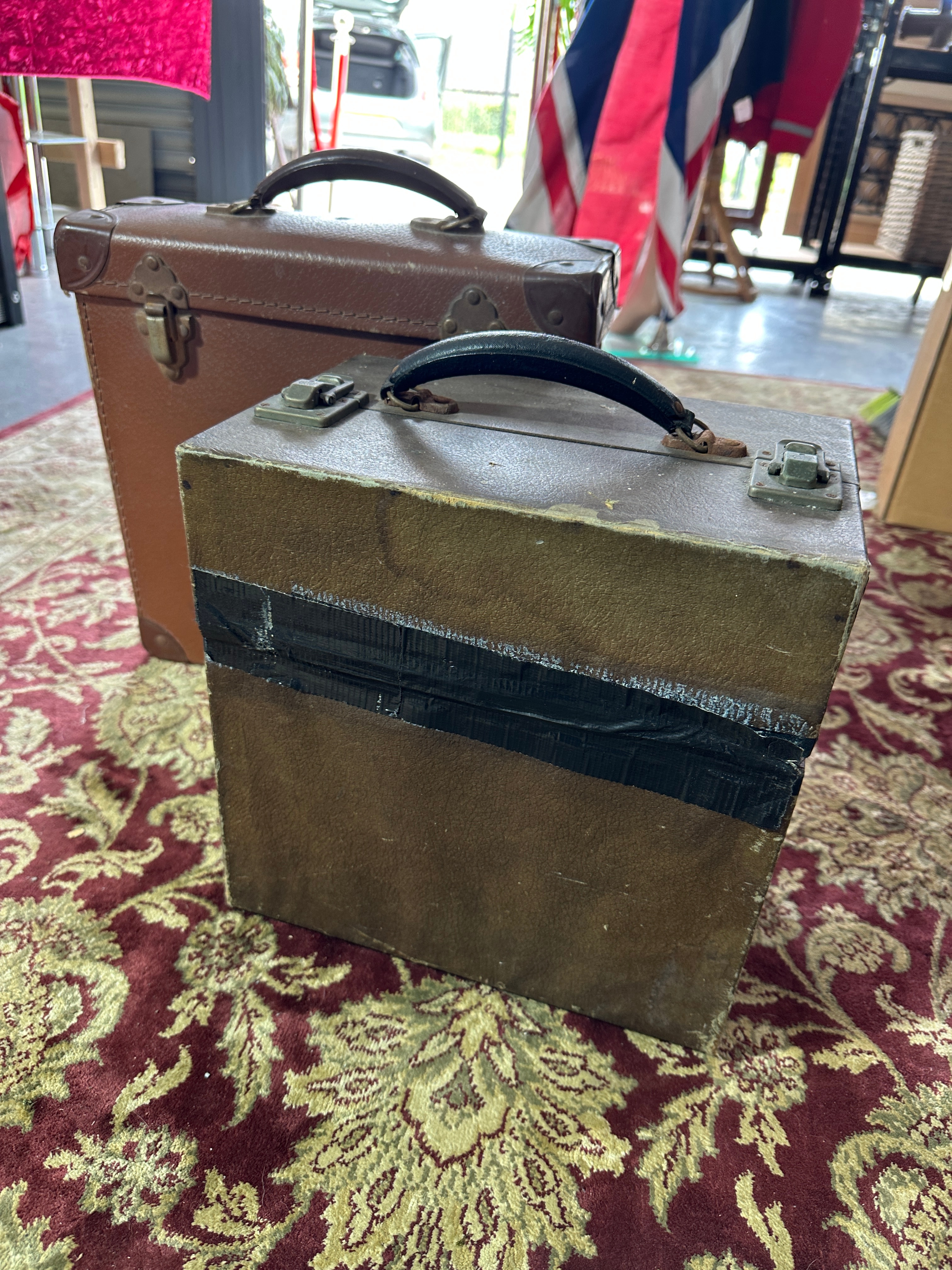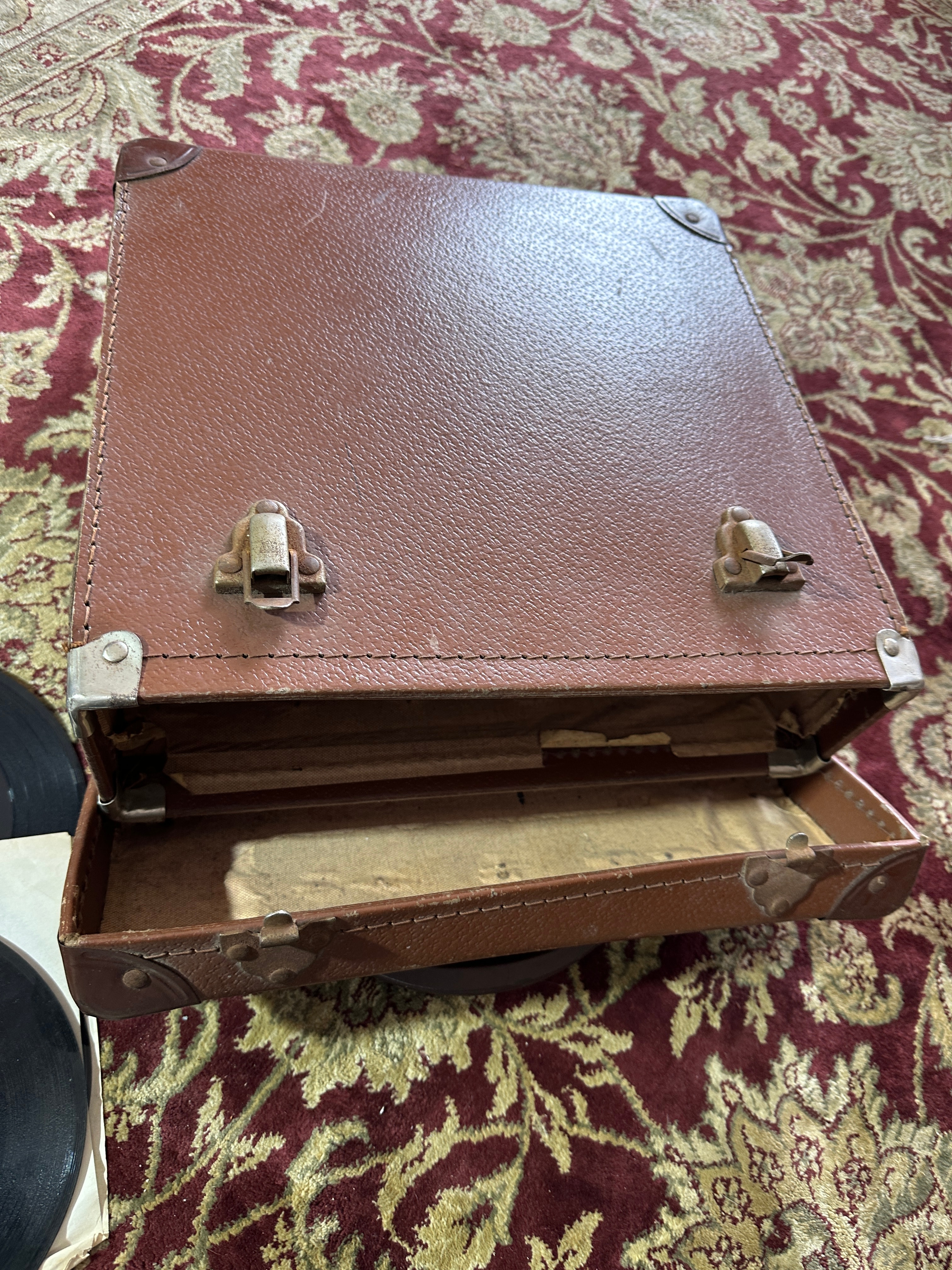 This lot comprises a collection of vintage records, primarily a mix of 78 rpm shellac discs and 45 rpm vinyl singles, dating from the early to mid-20th century. The records are housed in various paper and cardboard sleeves, many branded with visible text including “DECCA” (one blue label clearly reads: “THE WEDDING OF JACK AND JILL, ” “Vocal with Orchestra, ” “Decca No. 27284-B, ” “RECORD MANUFACTURED IN U.S.A.”), “SUPREME RECORDS, ” “REX, ” “COLUMBIA, ” “MERCURY, ” “HMV, ” and “Capitol Records, ” alongside other generic and specific release information inserts. The collection is accompanied by two portable record cases, constructed from faux leather or a similar composite material, featuring metal latches and handles.
