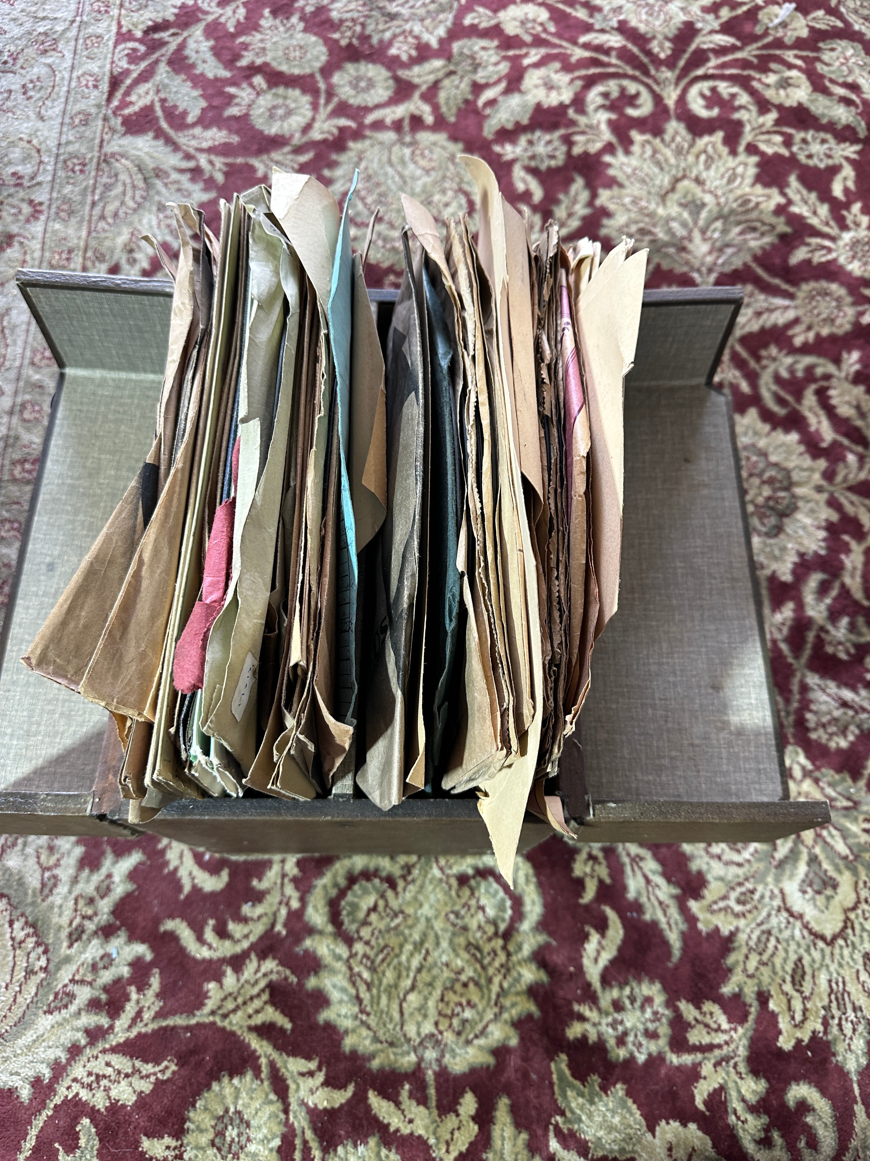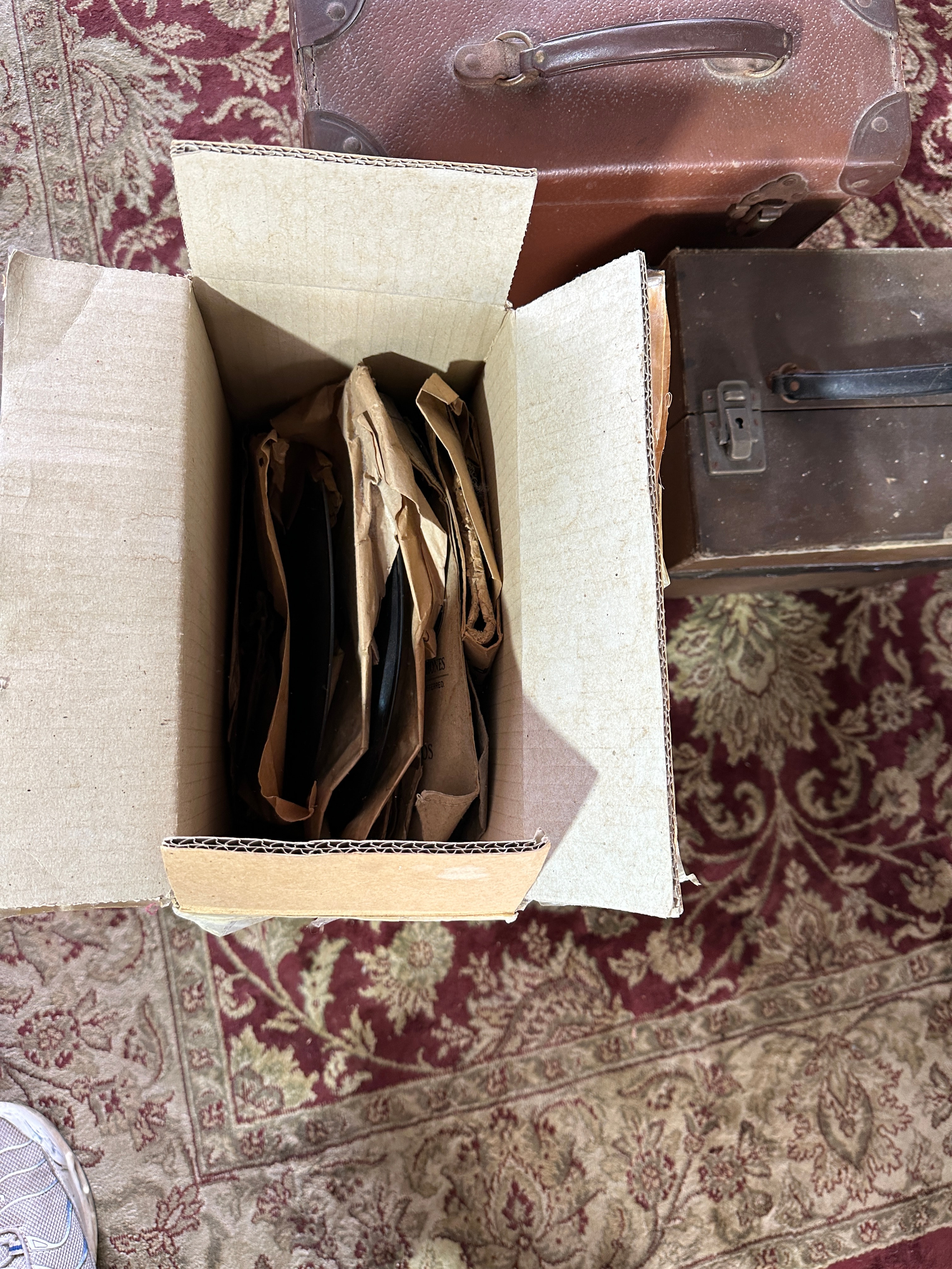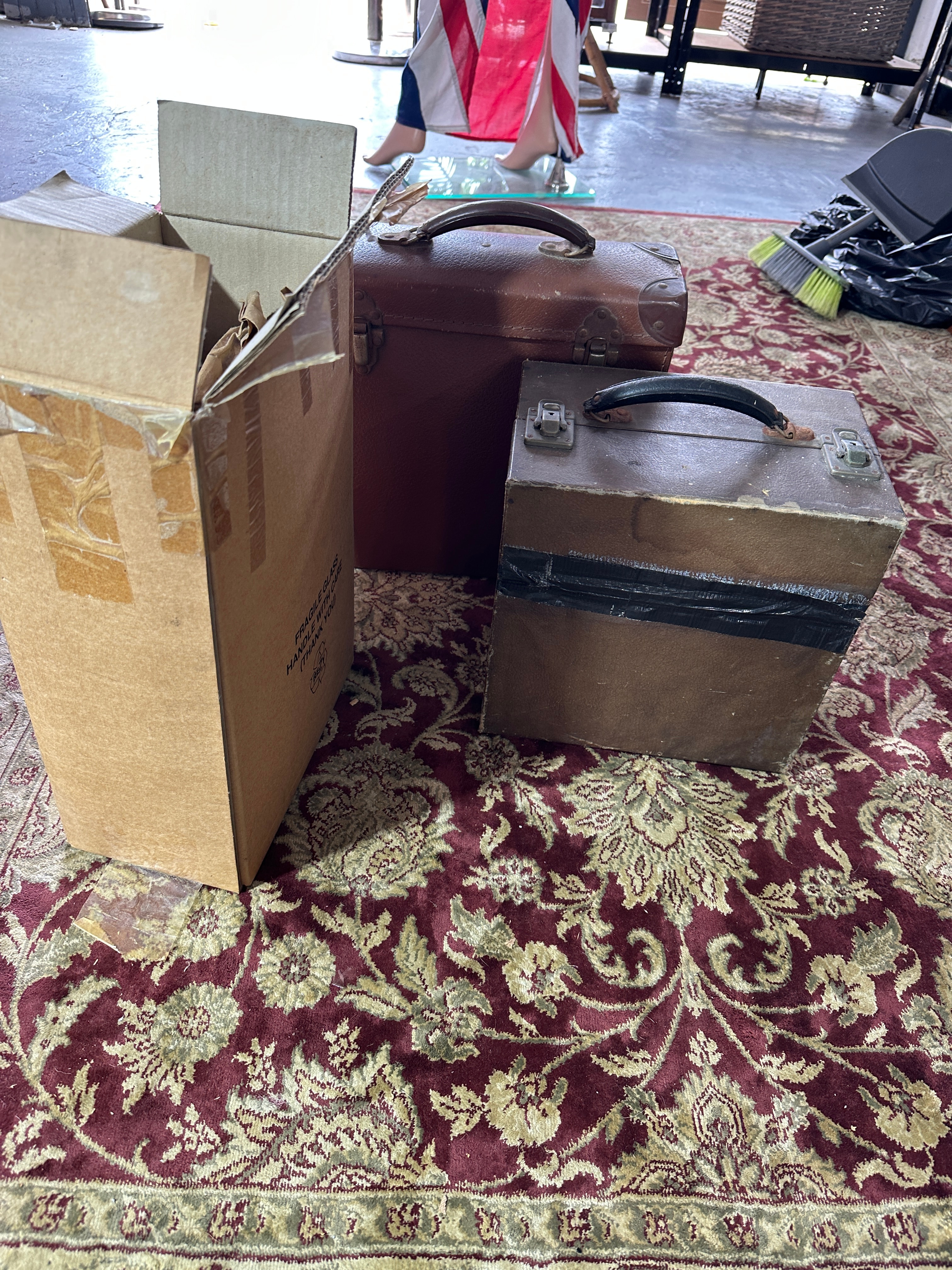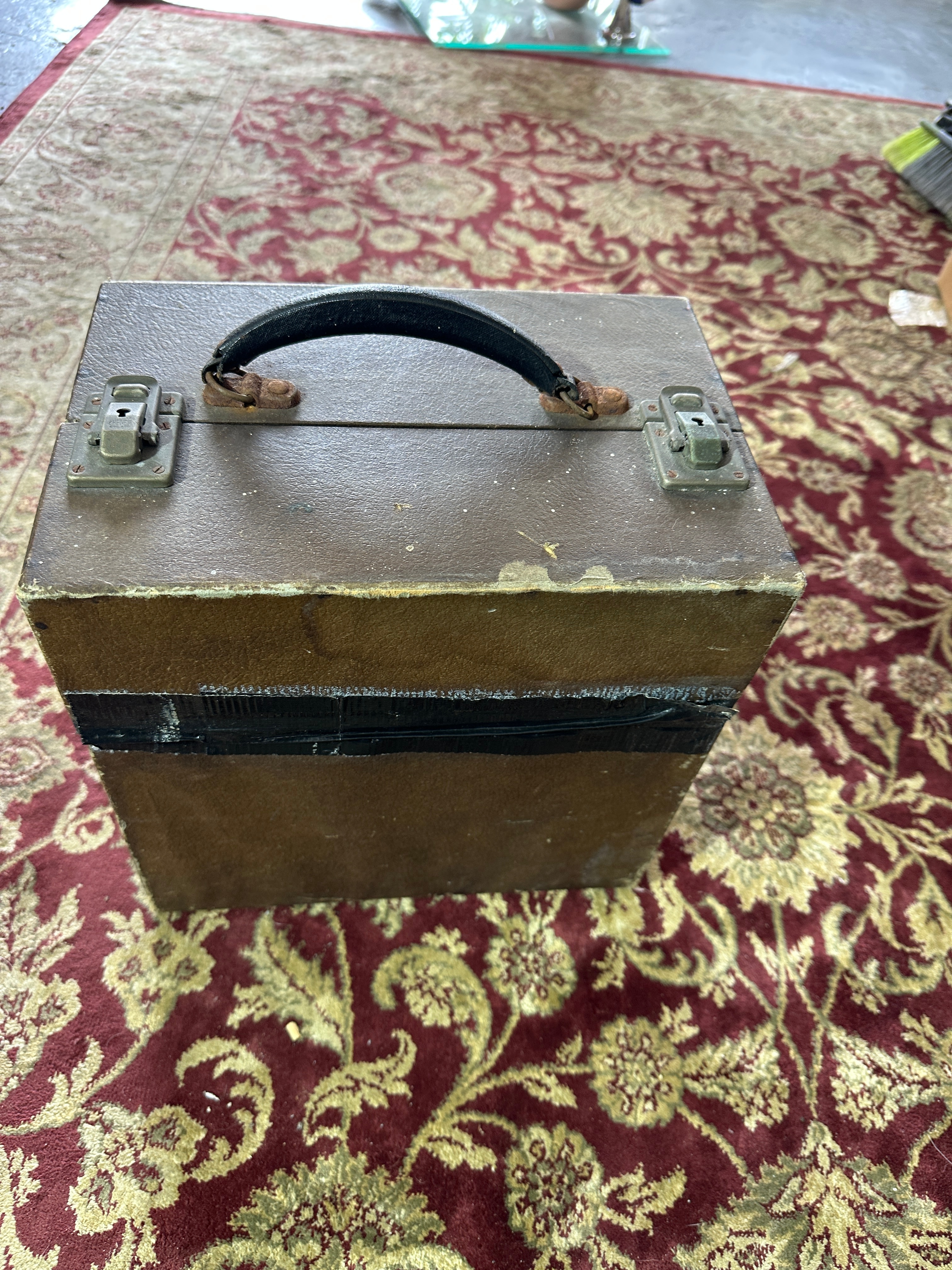This lot comprises a collection of vintage records, primarily a mix of 78 rpm shellac discs and 45 rpm vinyl singles, dating from the early to mid-20th century. The records are housed in various paper and cardboard sleeves, many branded with visible text including “DECCA” (one blue label clearly reads: “THE WEDDING OF JACK AND JILL, ” “Vocal with Orchestra, ” “Decca No. 27284-B, ” “RECORD MANUFACTURED IN U.S.A.”), “SUPREME RECORDS, ” “REX, ” “COLUMBIA, ” “MERCURY, ” “HMV, ” and “Capitol Records, ” alongside other generic and specific release information inserts. The collection is accompanied by two portable record cases, constructed from faux leather or a similar composite material, featuring metal latches and handles.