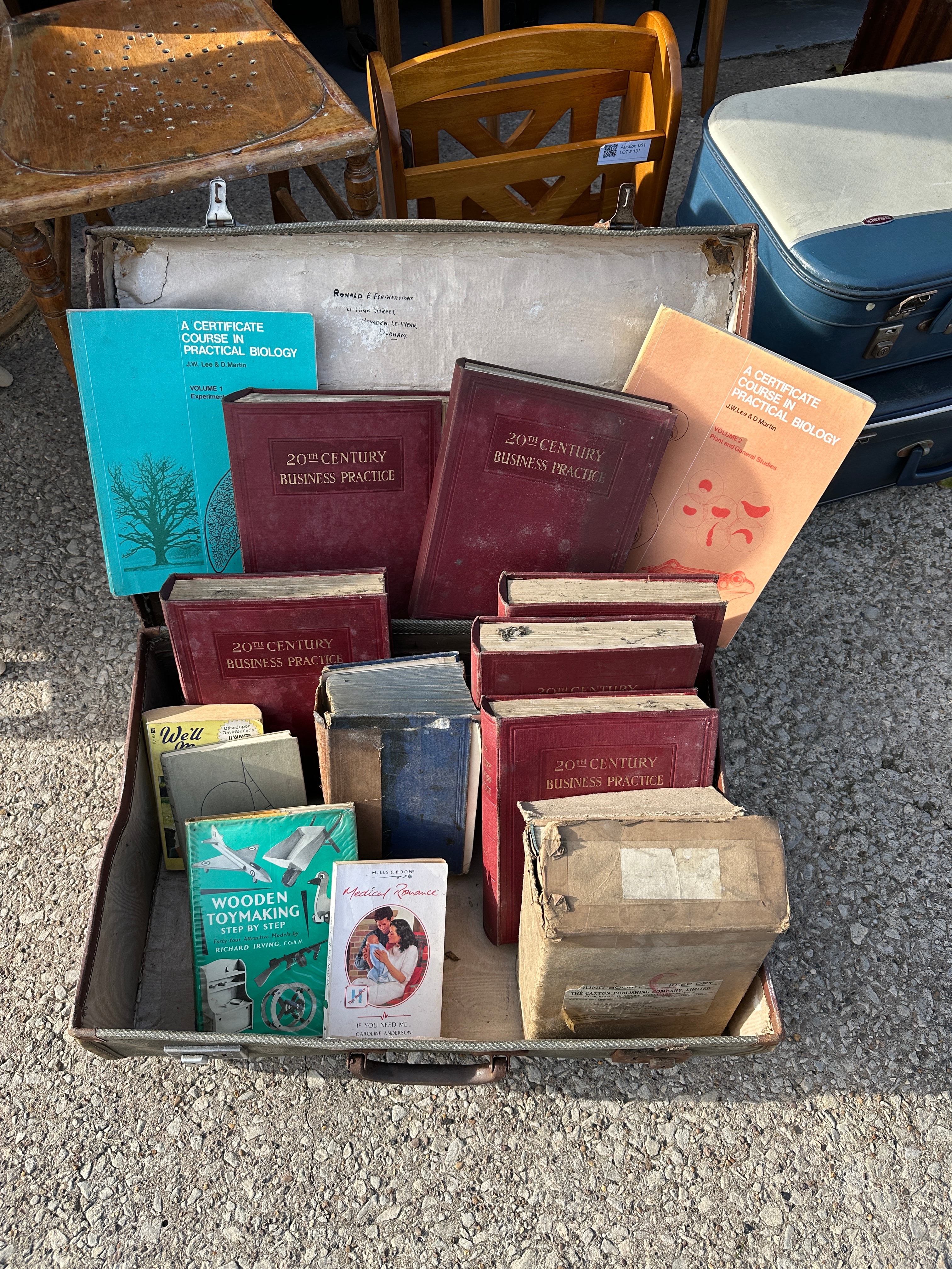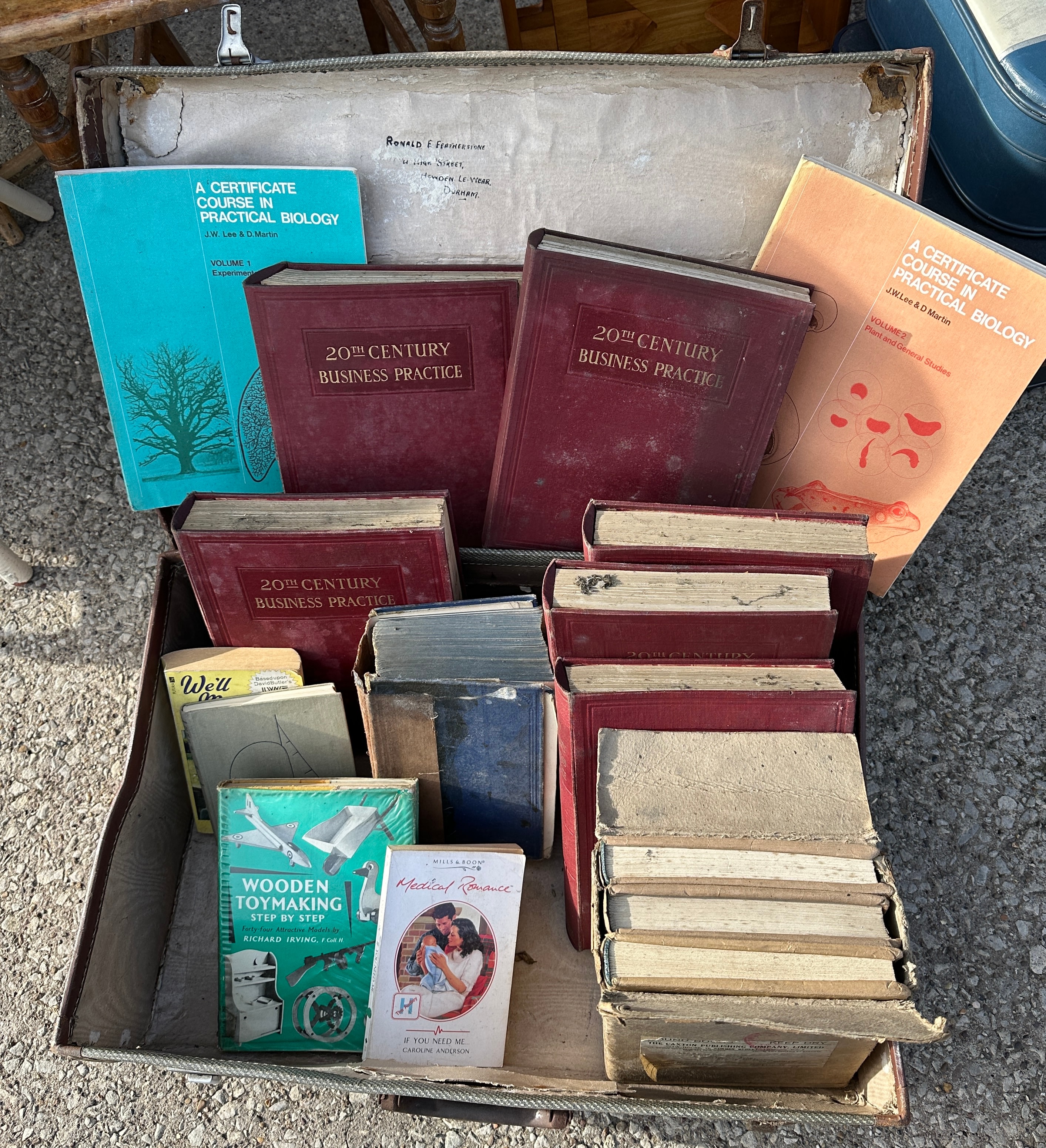 A collection of approximately 25-30 assorted books, primarily educational and technical, presented within a vintage brown hardshell suitcase. Identifiable titles include multiple copies of “A CERTIFICATE COURSE IN PRACTICAL BIOLOGY” (one marked “VOLUME 1”), “20TH CENTURY BUSINESS PRACTICE,” and “WOODEN TOYMAKING STEP-BY-STEP.” Also present are a smaller light green book titled “Medical Manual” and a paperback romance novel from the “Medical Romance” series, “If You Need Me, I’m With You.” The brown hardshell suitcase features leather straps and metal hardware. The interior lid bears faint handwritten inscriptions, including a name, possibly “RONALD T. Stovendeaver,” a date “January 17, 1956,” and a partial address “21st/24th Crescent.”