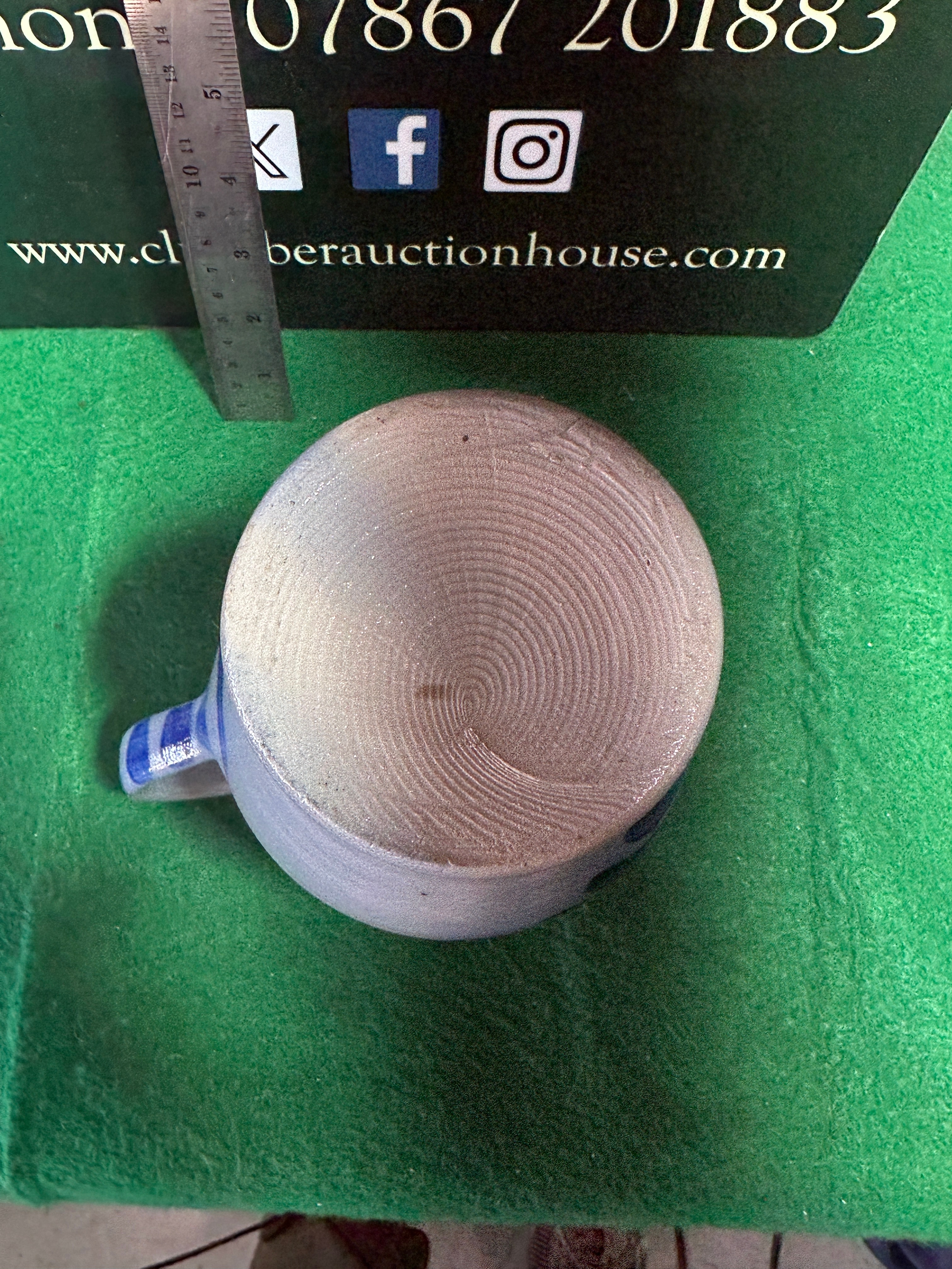 A German salt glazed stoneware pitcher, often referred to as ‘Handarbeit’ (handmade). The pitcher features a light grey body with cobalt blue decoration. The design includes a wide band of horizontal ribbed lines around the neck and handle, complemented by a scrolled foliate pattern covering the main body. The base exhibits concentric turning marks.