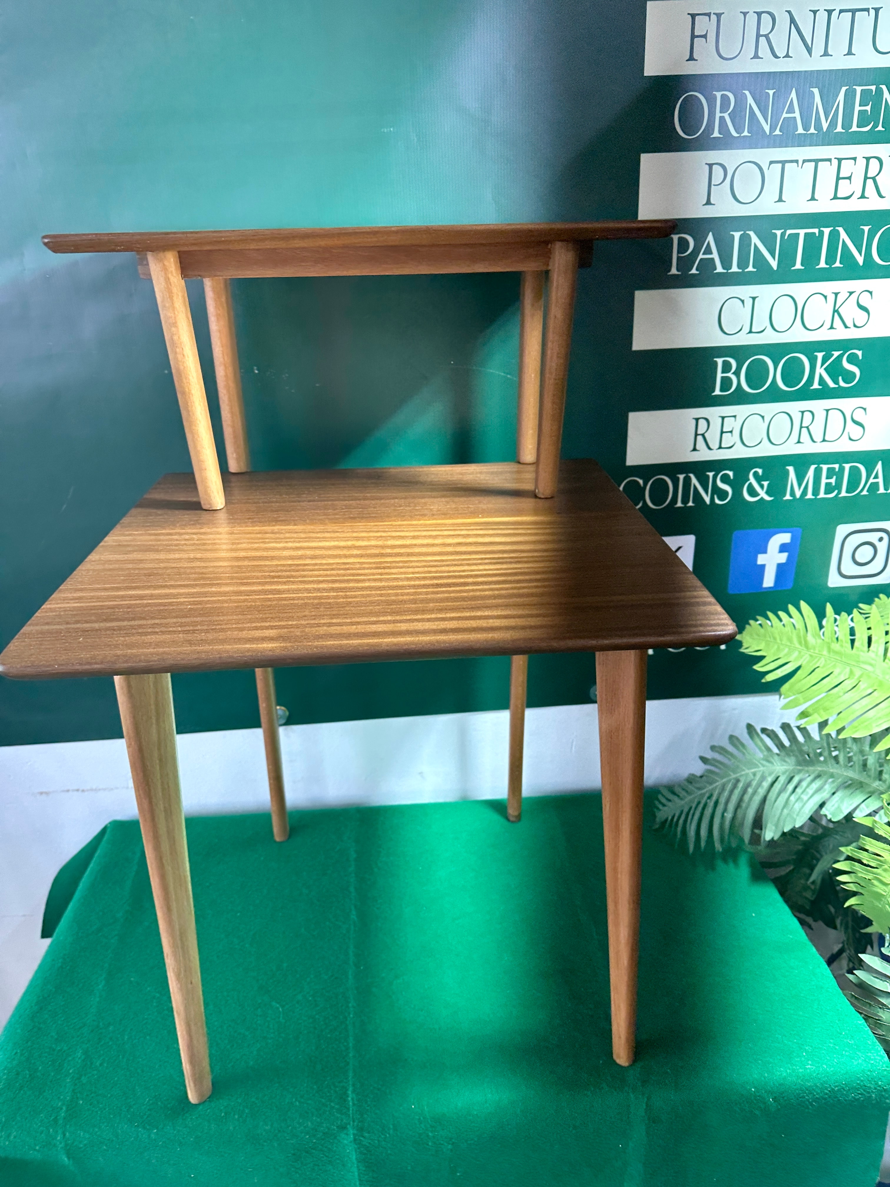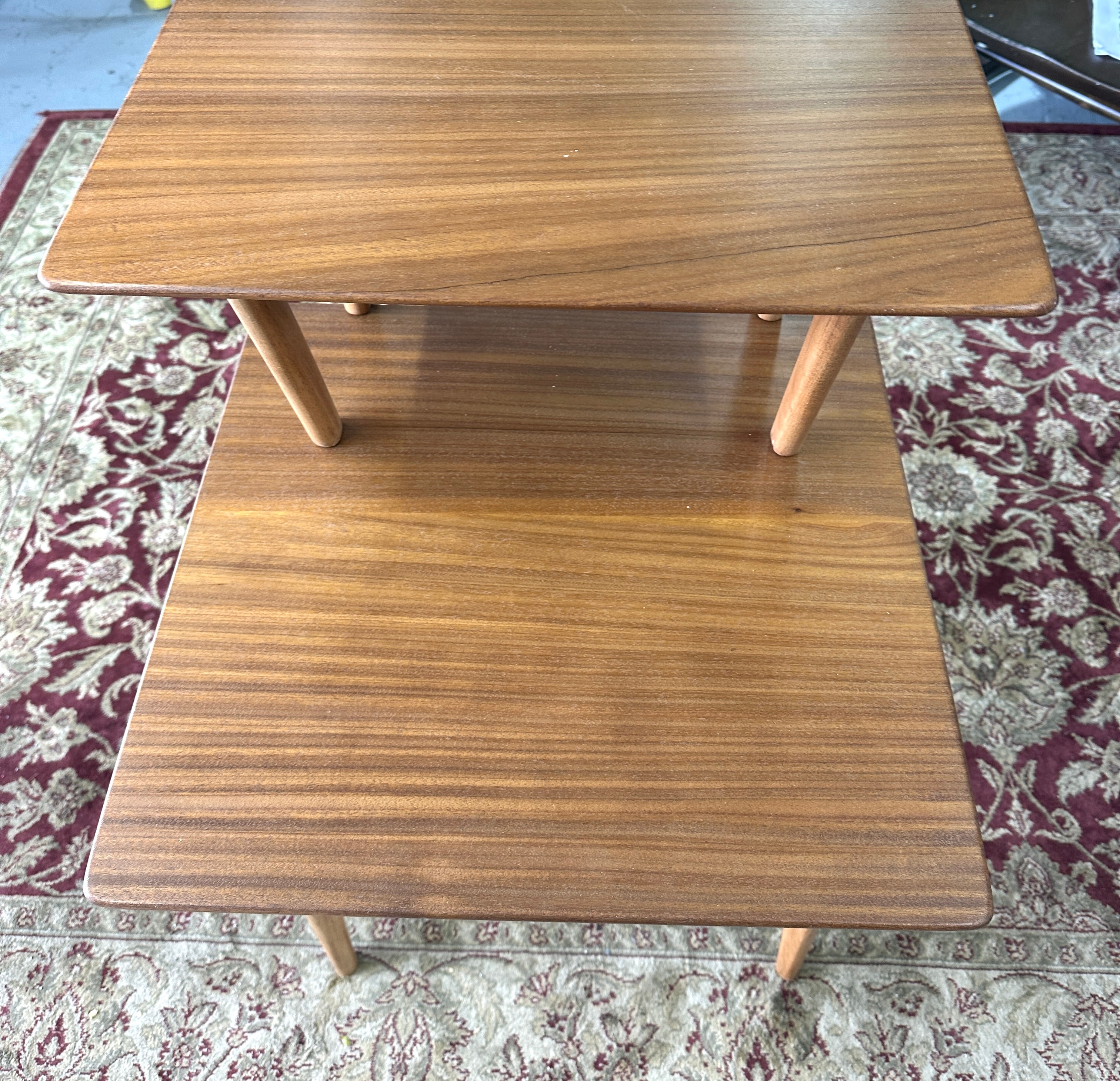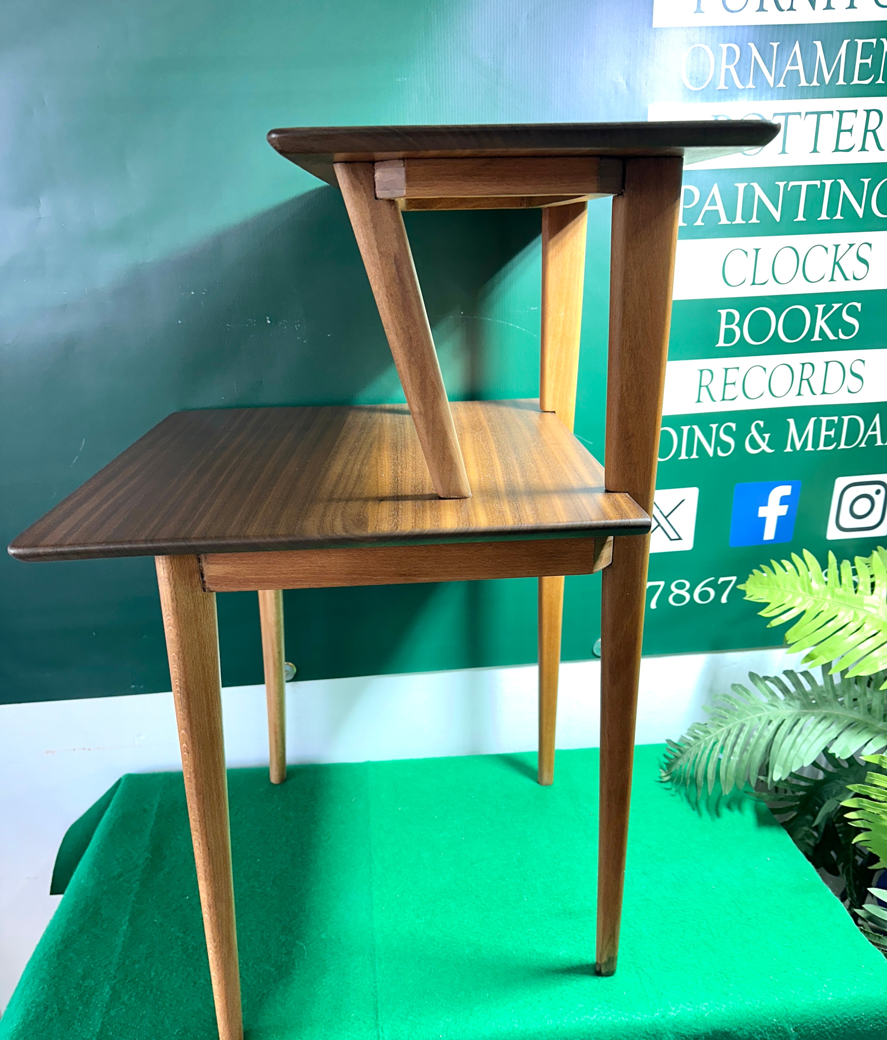 A Vanson Two-Tier Side Table, designed by Peter Hayward, circa 1960s. Crafted from wood, likely walnut, with a distinctive grain, this table features two rectangular tops and four tapered, splayed legs. The smaller upper tier is offset and supported by two shorter legs resting on the larger lower tier. A metal plaque affixed to the underside of the upper tier reads ‘THIS IS A Vanson PRODUCTION’.