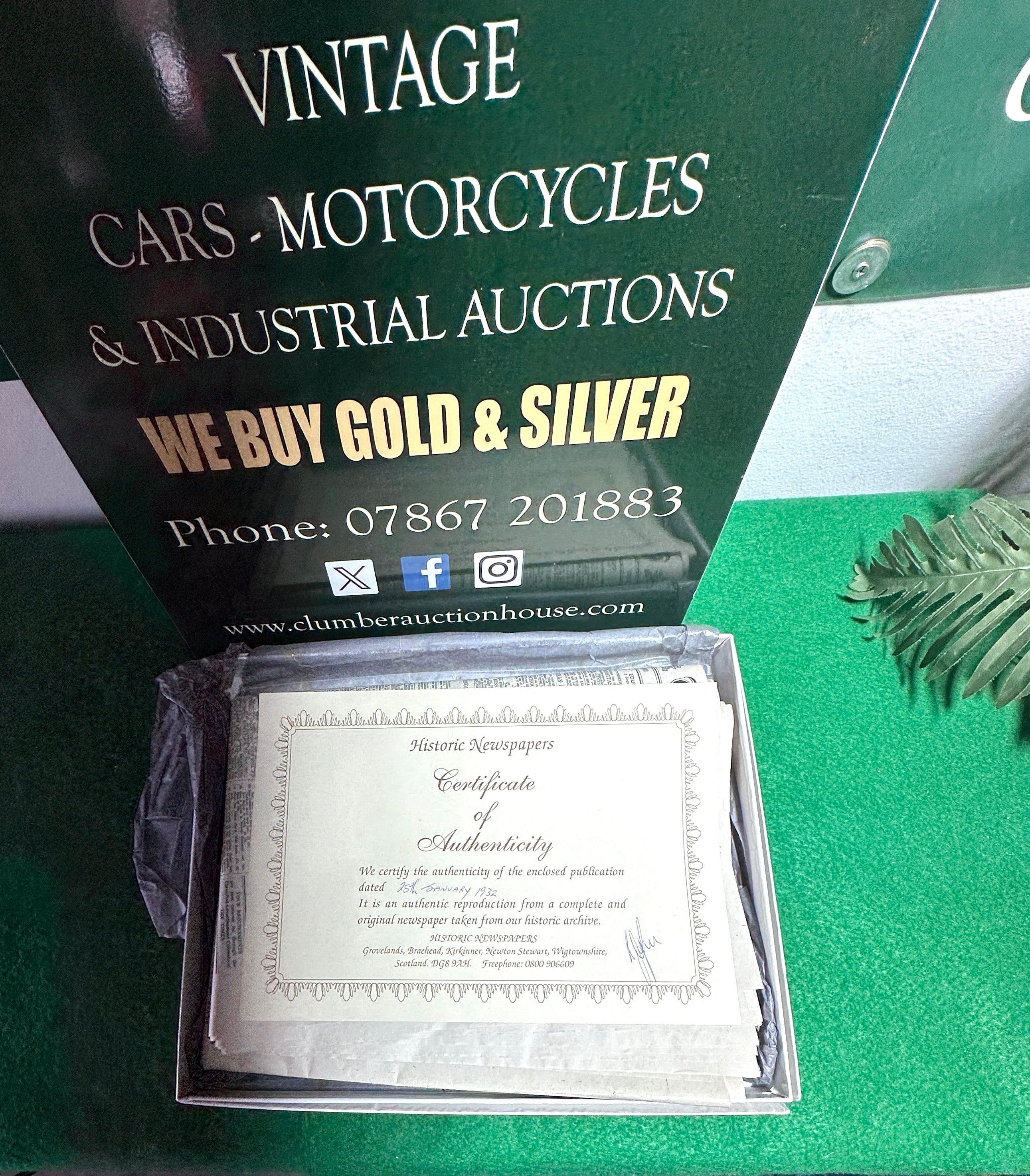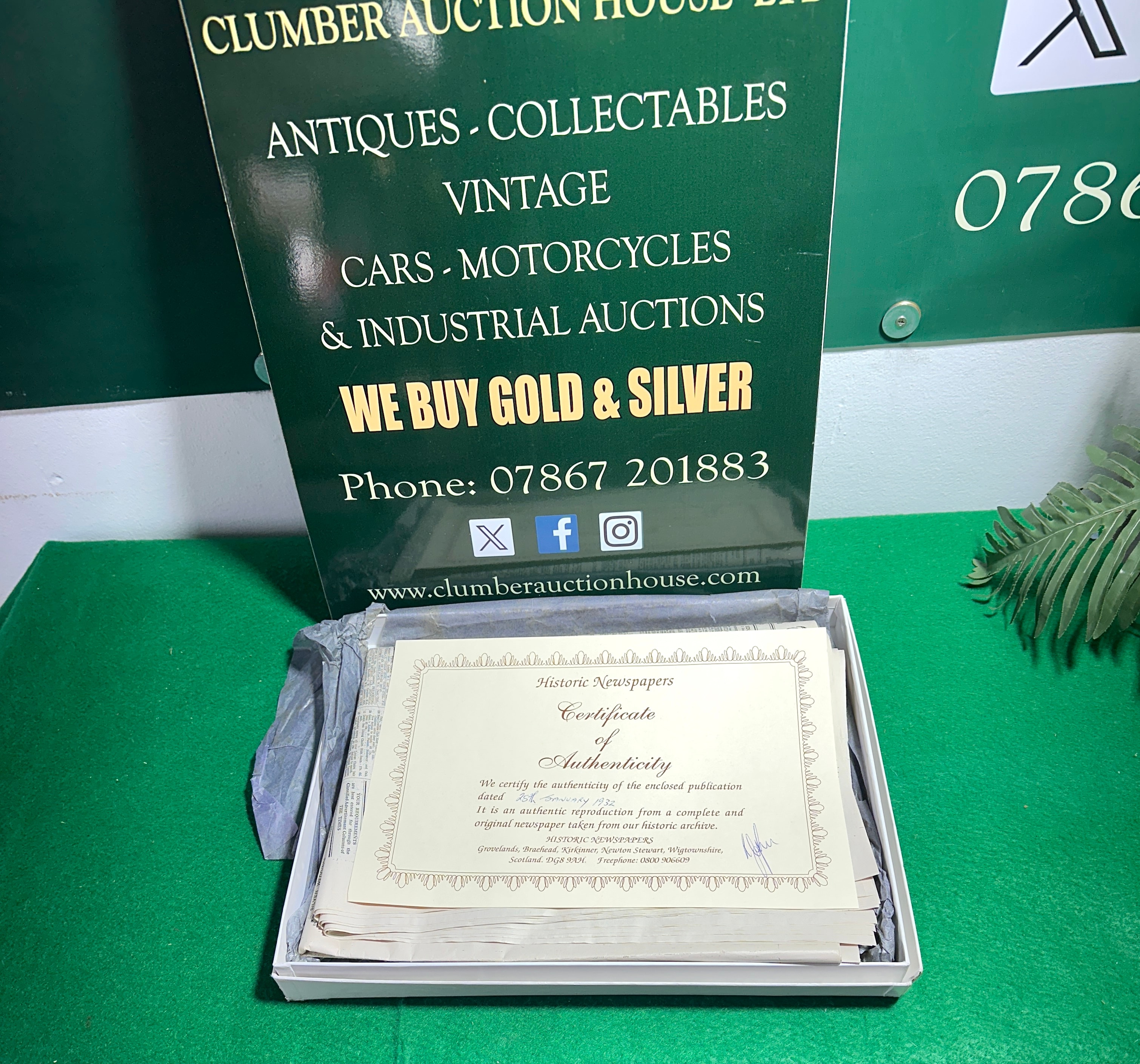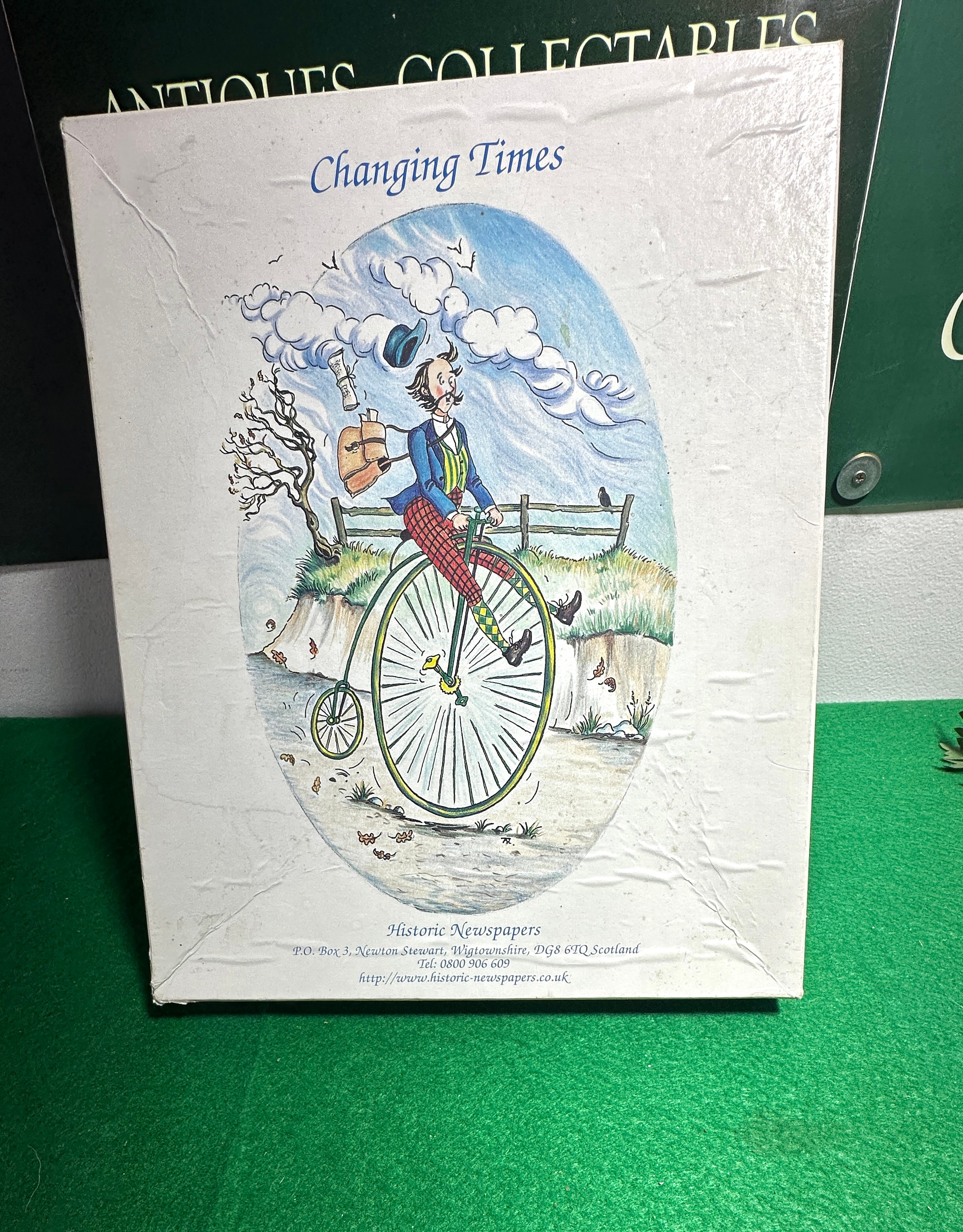 A boxed set of historic newspaper reproductions, titled ‘Changing Times’. The set includes a reproduction of ‘The Times’ newspaper dated January 31, 1891, accompanied by a ‘Certificate of Authenticity’ from ‘Historic Newspapers’. The certificate confirms the publication as an authentic reproduction from their historic archive. The cardboard box features an illustration of a man on a penny-farthing bicycle and includes contact details for ‘Historic Newspapers’.