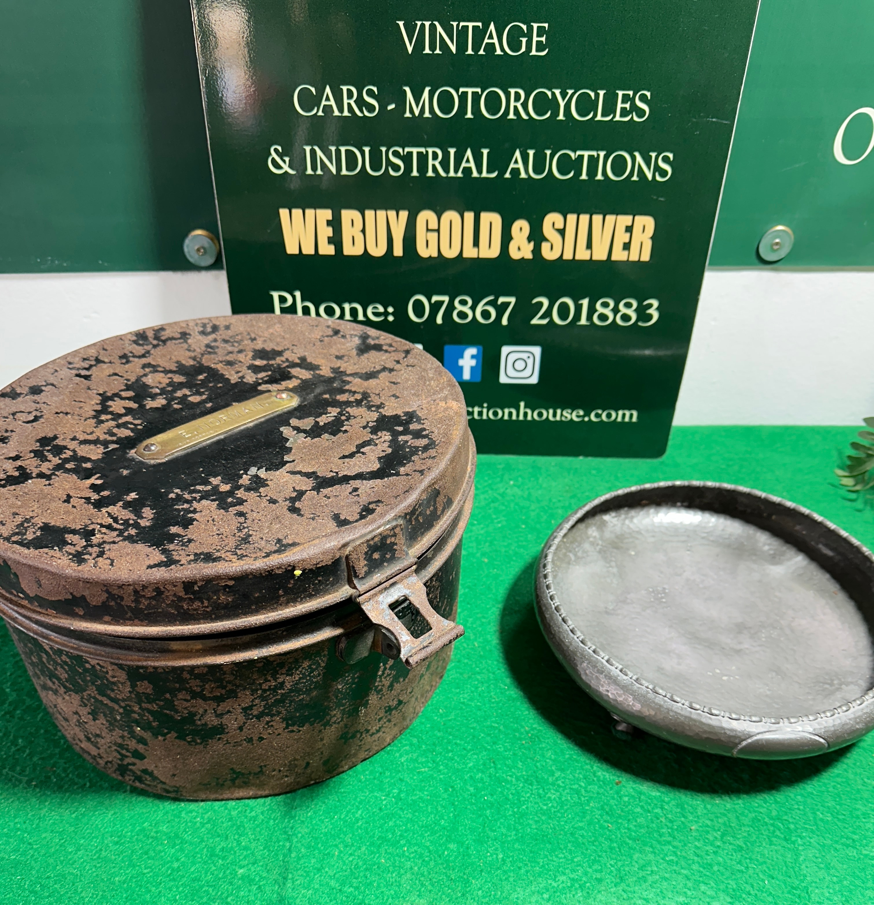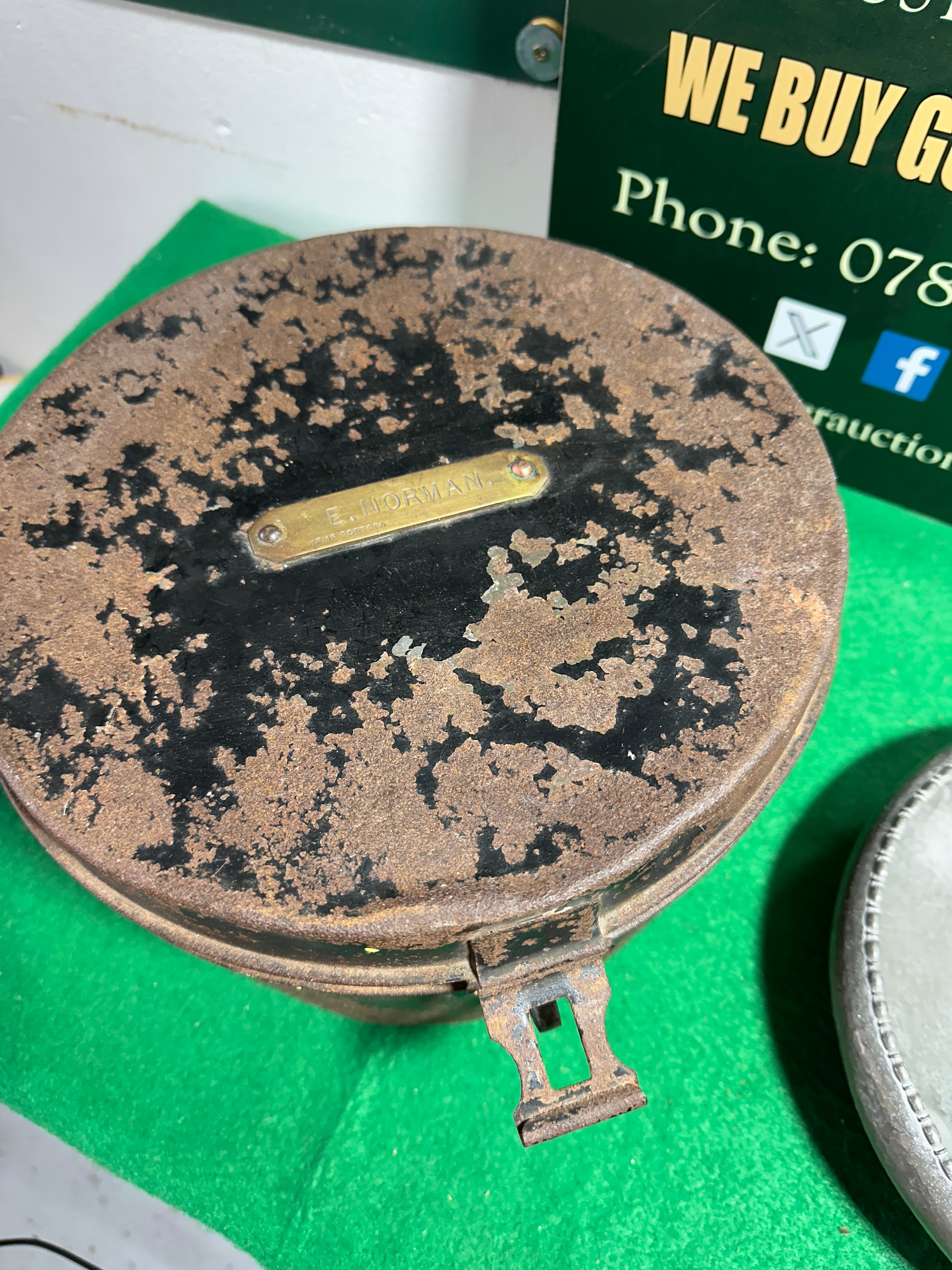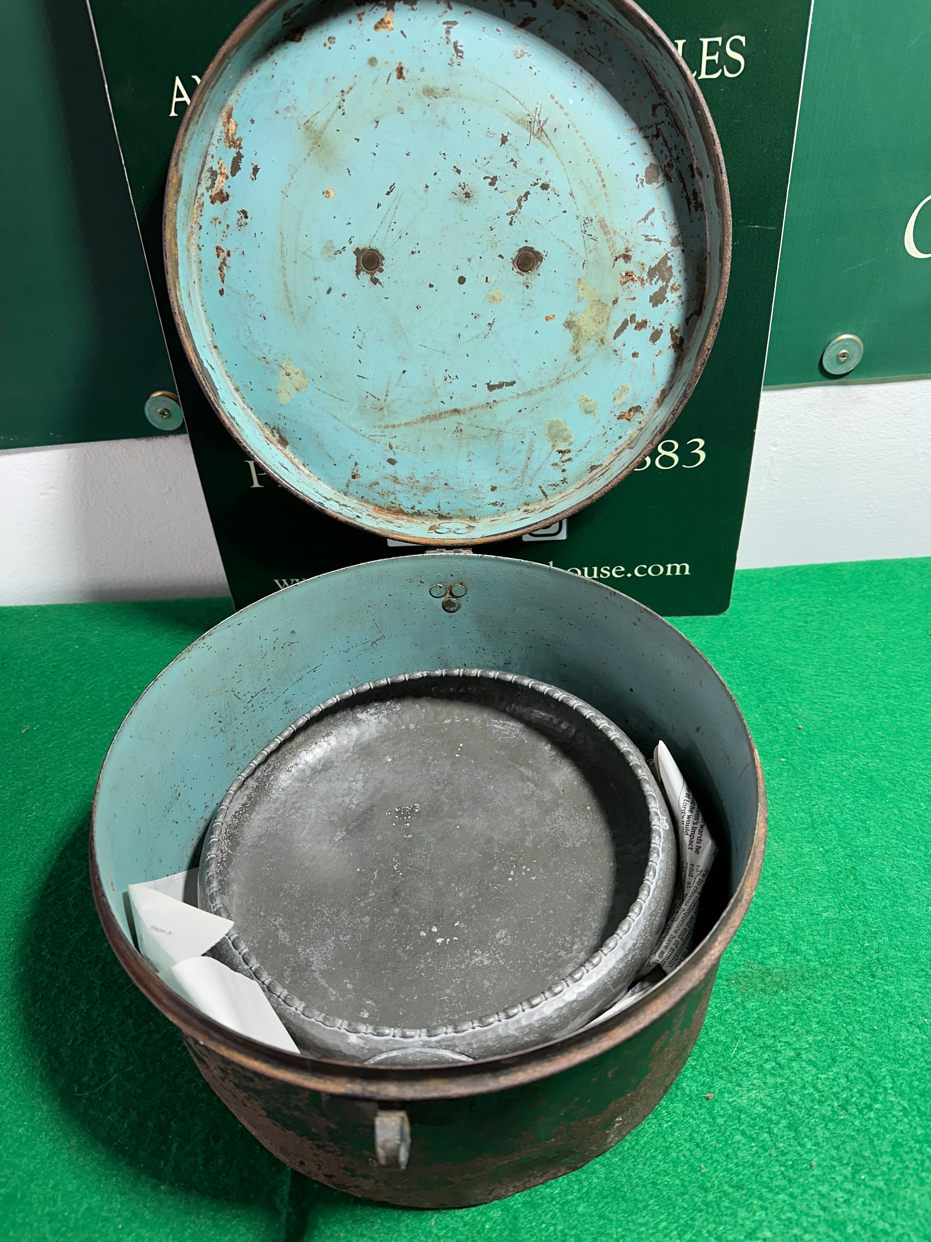 A cylindrical lidded metal container, likely tin or steel, featuring a brass plaque affixed to the lid, engraved ‘E. HOFFMANN’ above ‘BERLIN’. The lid is secured by a simple metal clasp. The exterior is painted black, and the interior is painted a lighter blue. Accompanying the main container is a separate, shallow, round dish made of a dull, tarnished metal, possibly pewter, which also shows signs of age and use.