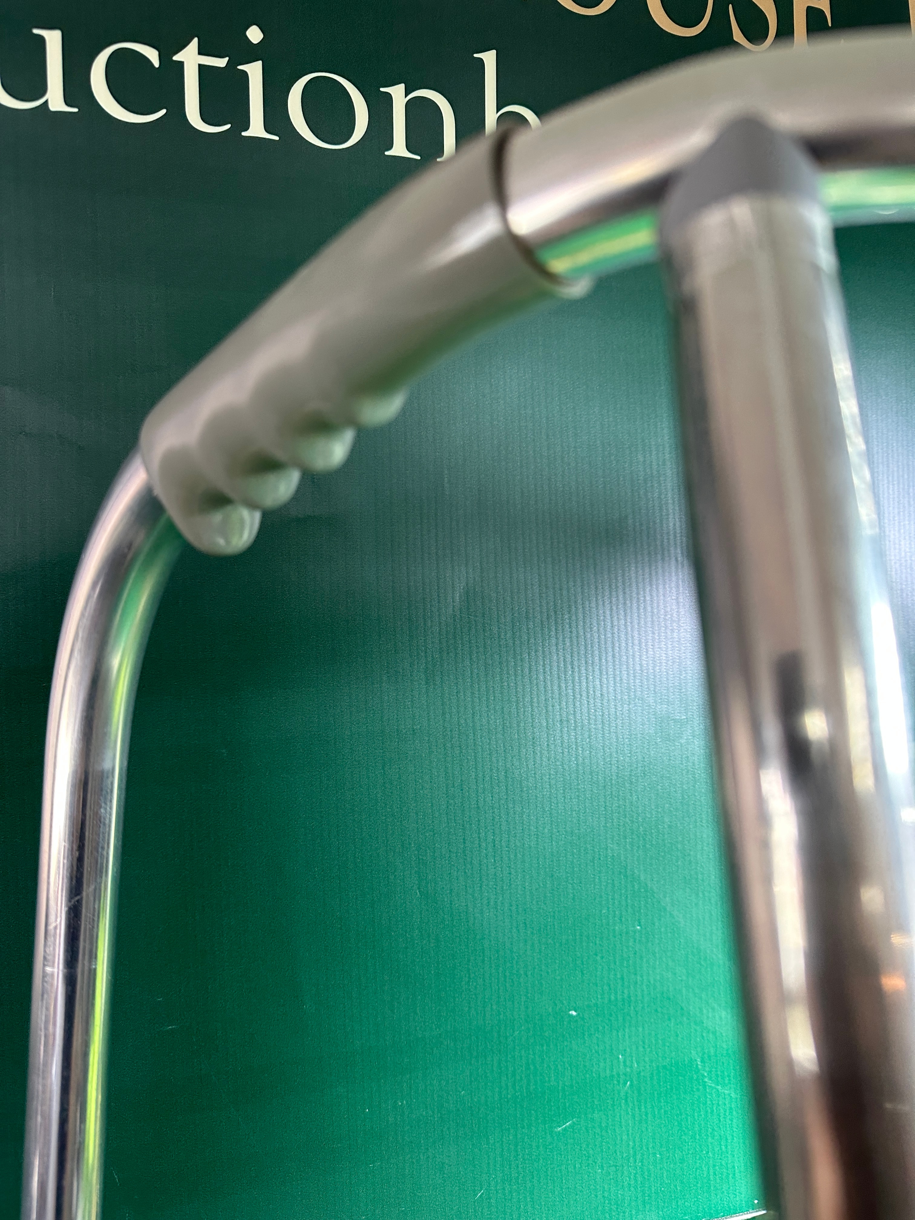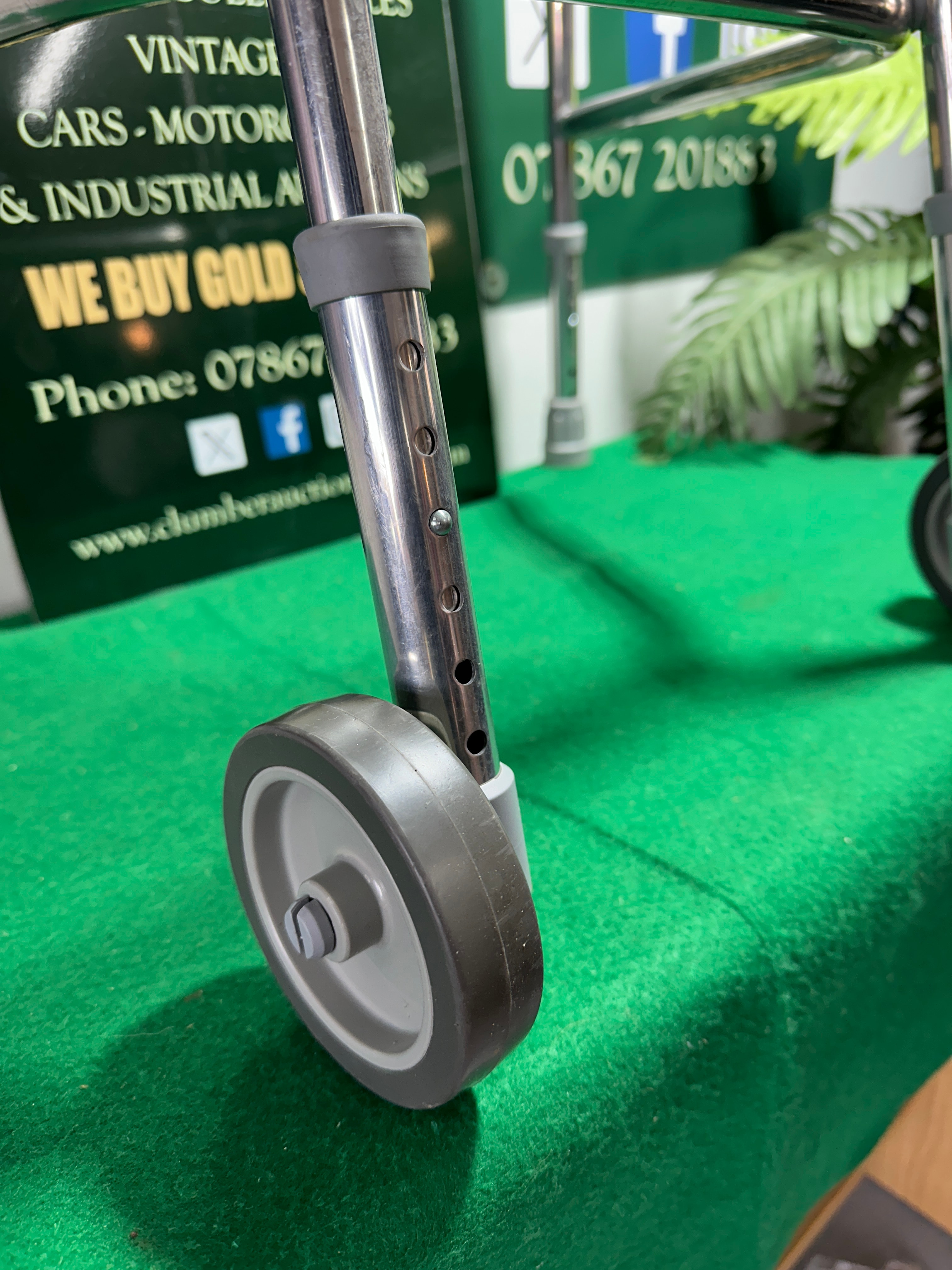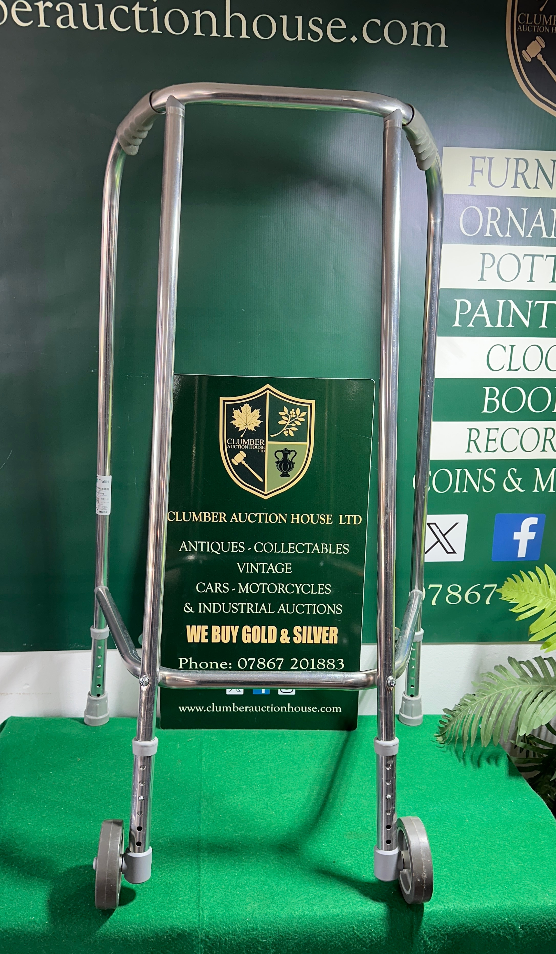 A modern walking frame with wheels, constructed from lightweight, polished metallic tubing, likely aluminum. It features grey rubberized handgrips at the top, with two adjustable front legs fitted with grey plastic wheels, and two adjustable rear legs terminating in grey plastic glides. The design is functional and utilitarian, consistent with contemporary mobility aids. No specific brand markings are visible.