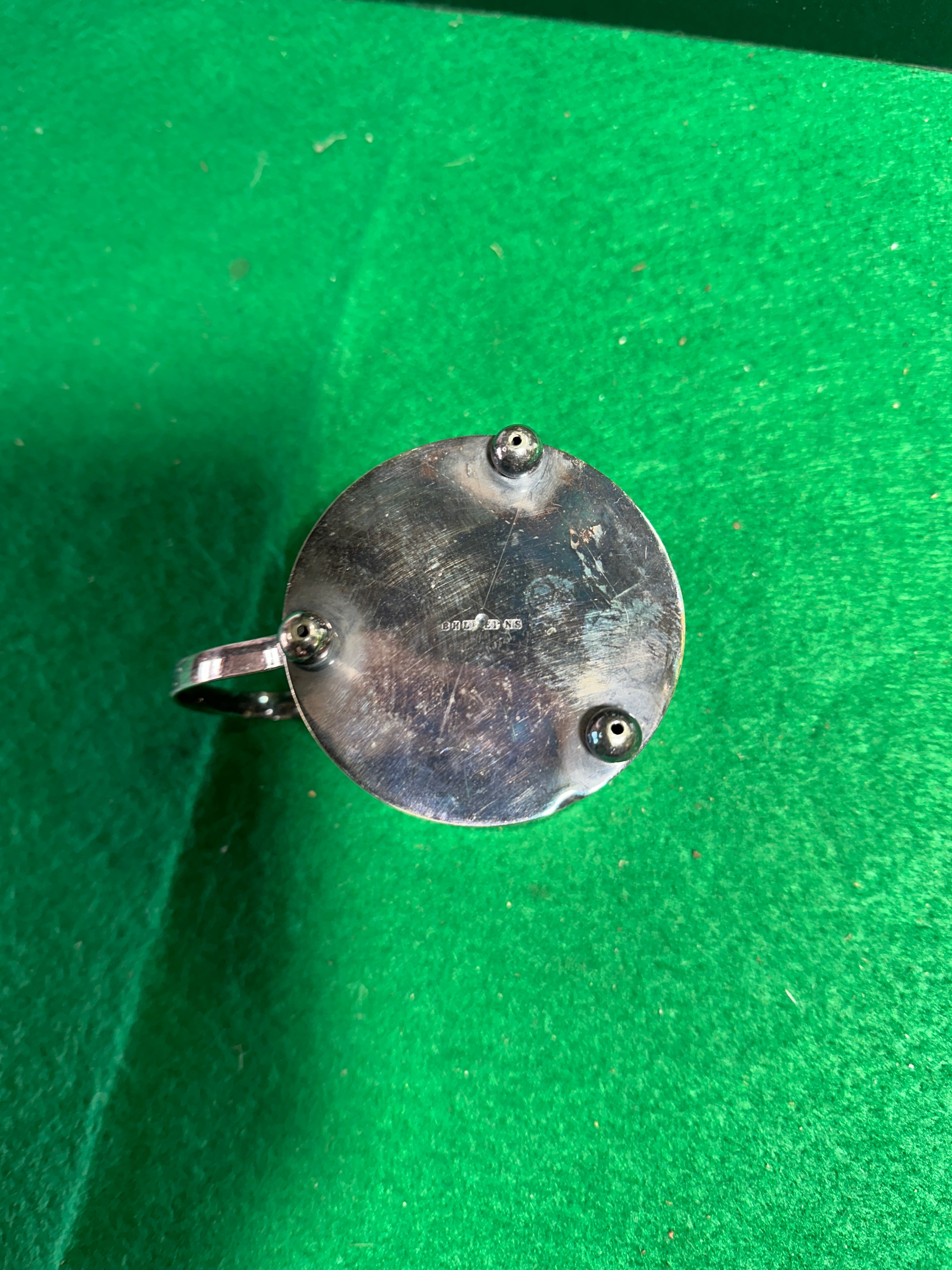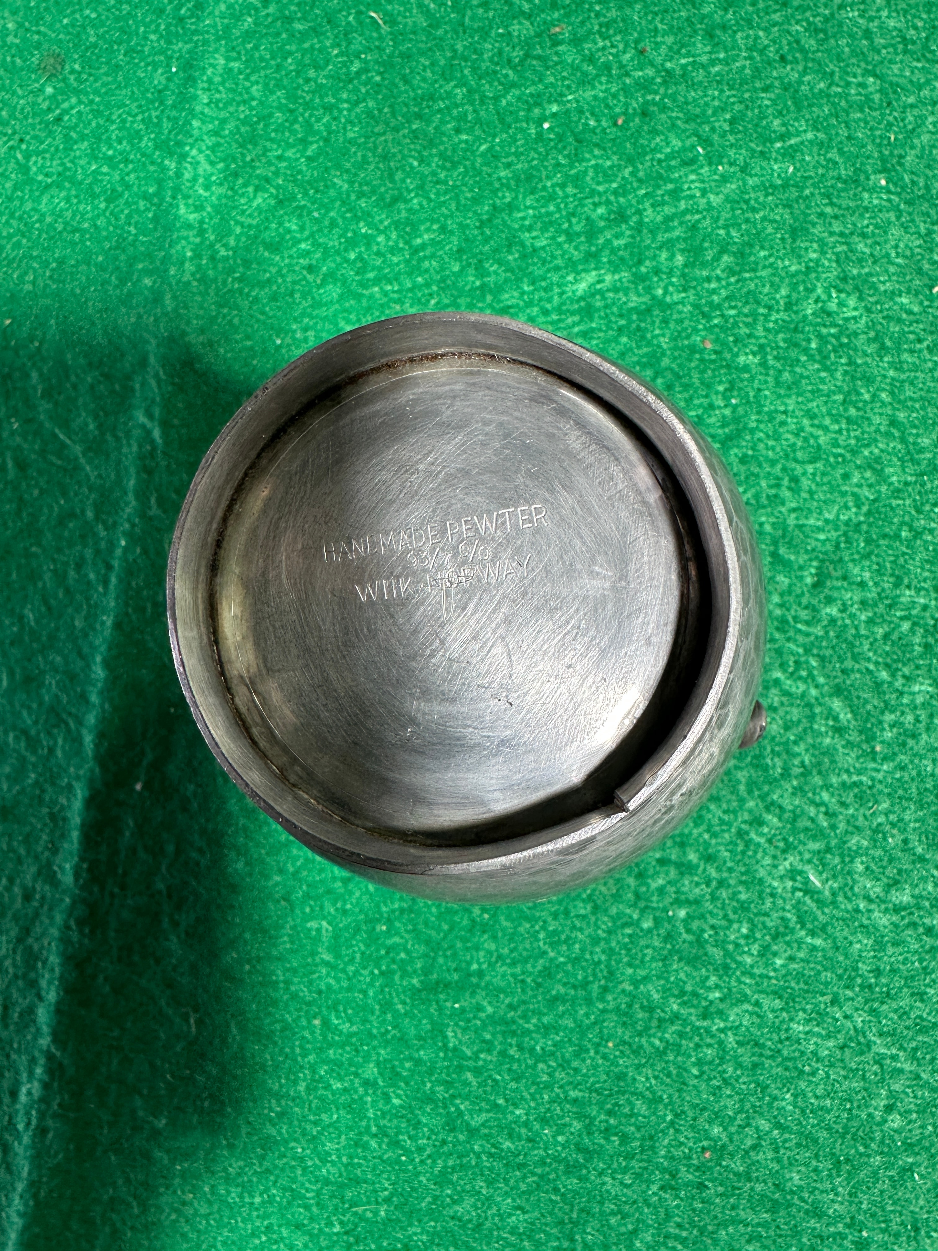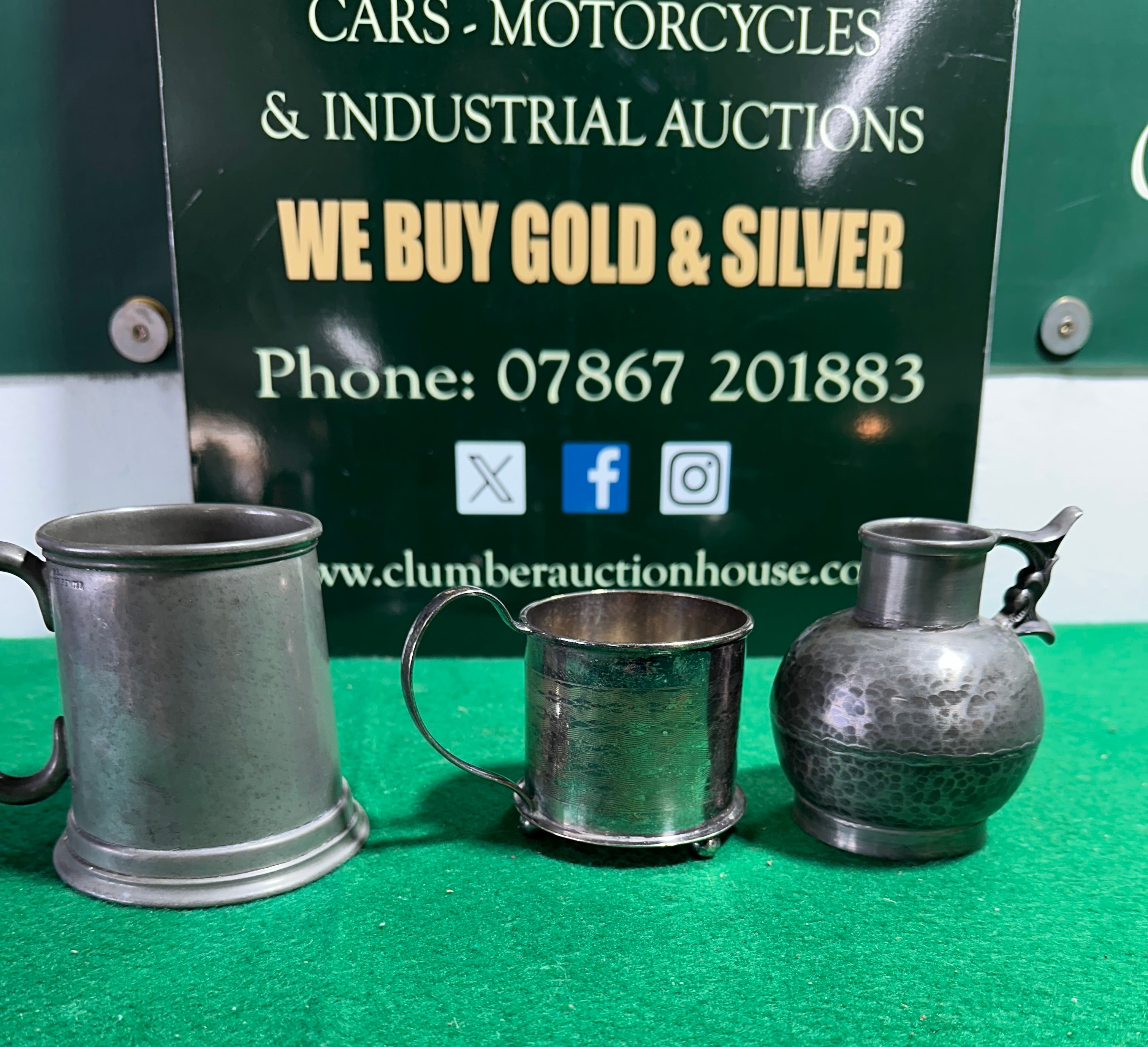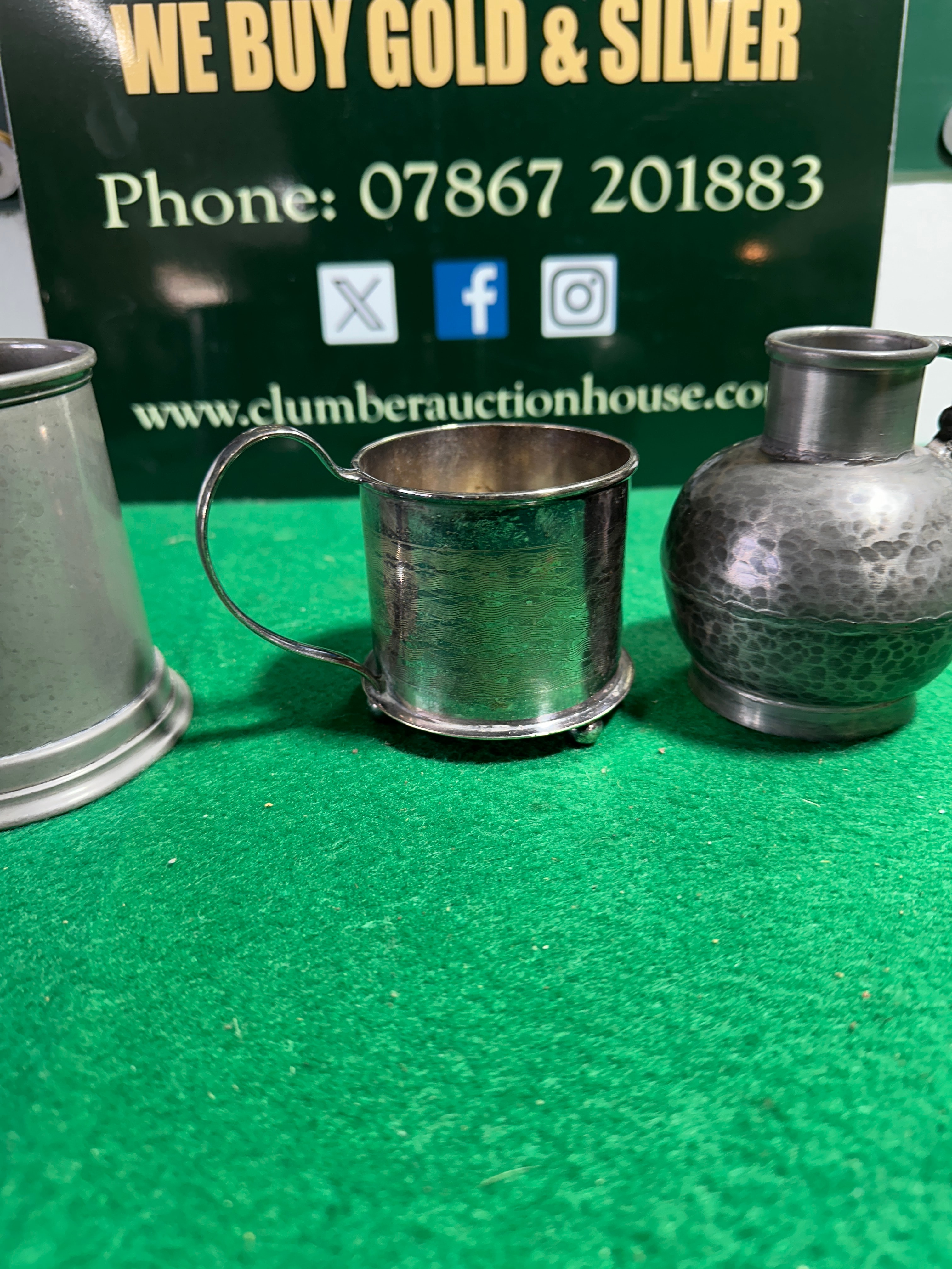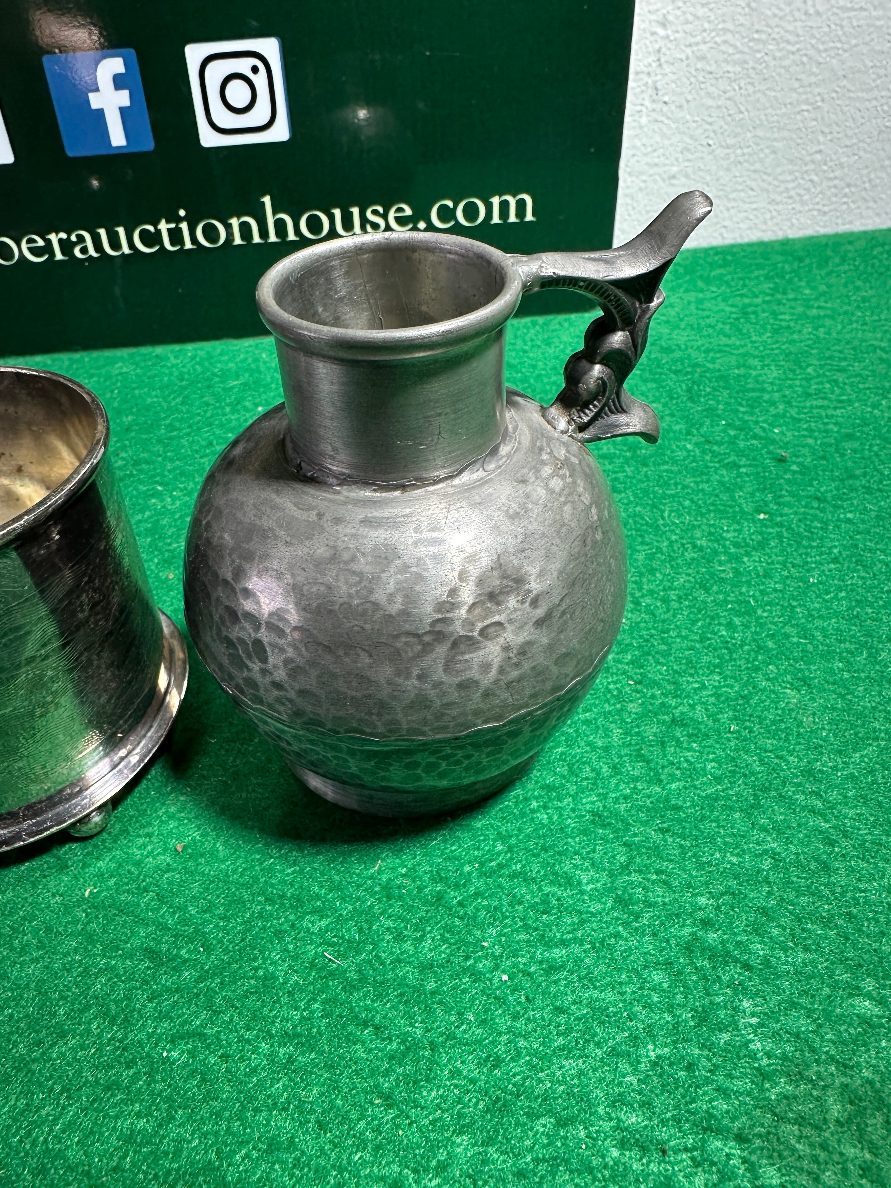 A group of three assorted metal vessels. Comprising a traditional pewter tankard with a C-scroll handle, tapering body, and flared base, bearing the mark “PEWTER” on its side and a base stamp including “SHEFFIELD” and “ALLIANCE” (partially obscured). Also included is a smaller, cylindrical cup with a bright silvered finish standing on three ball feet, marked “EPNS” on its underside. The third item is a spherical pewter jug with a distinctive hammered texture and an ornate handle depicting a stylized creature; its base is marked “HAND MADE PEWTER” and “WIIN NORWAY”.