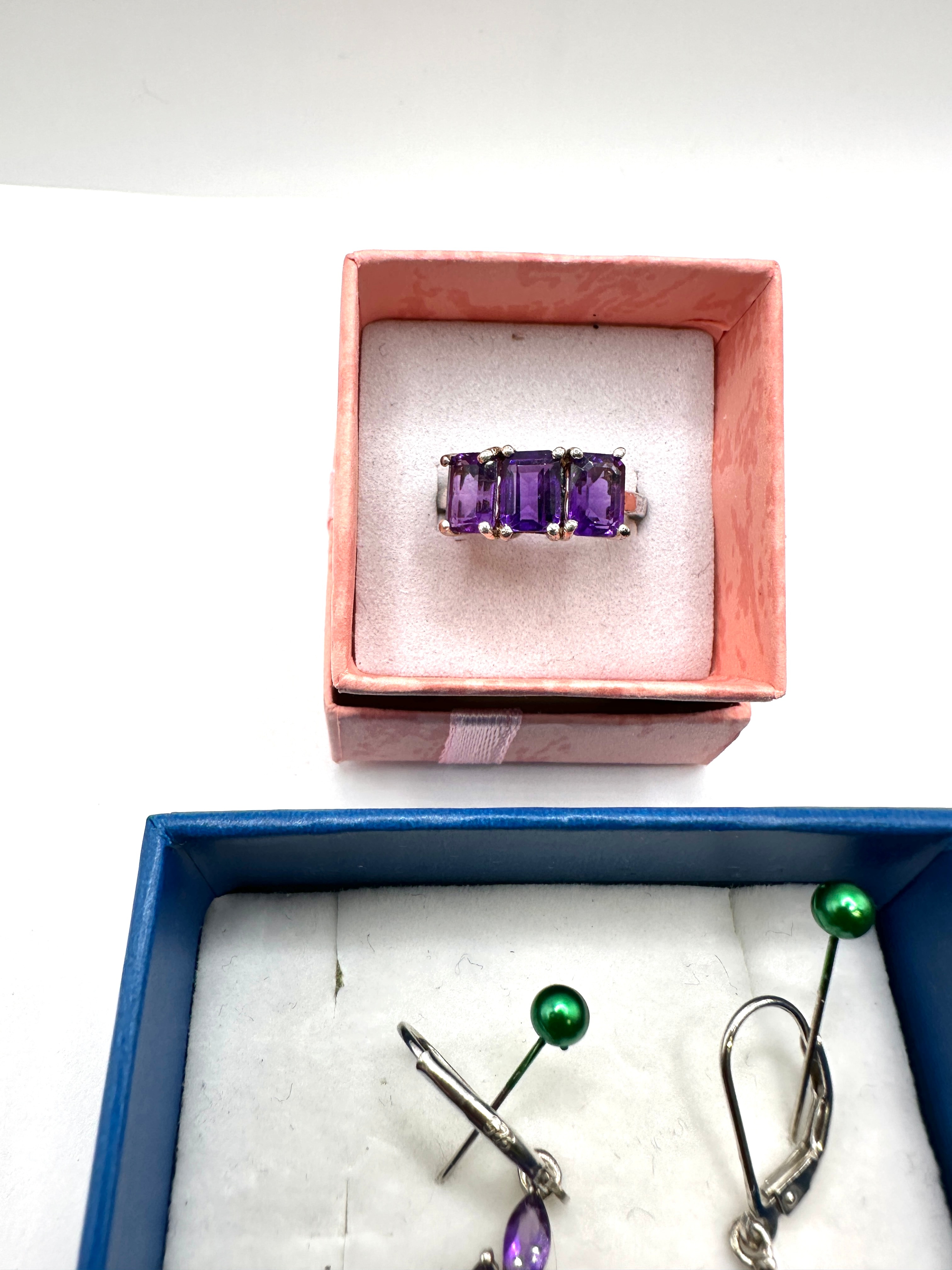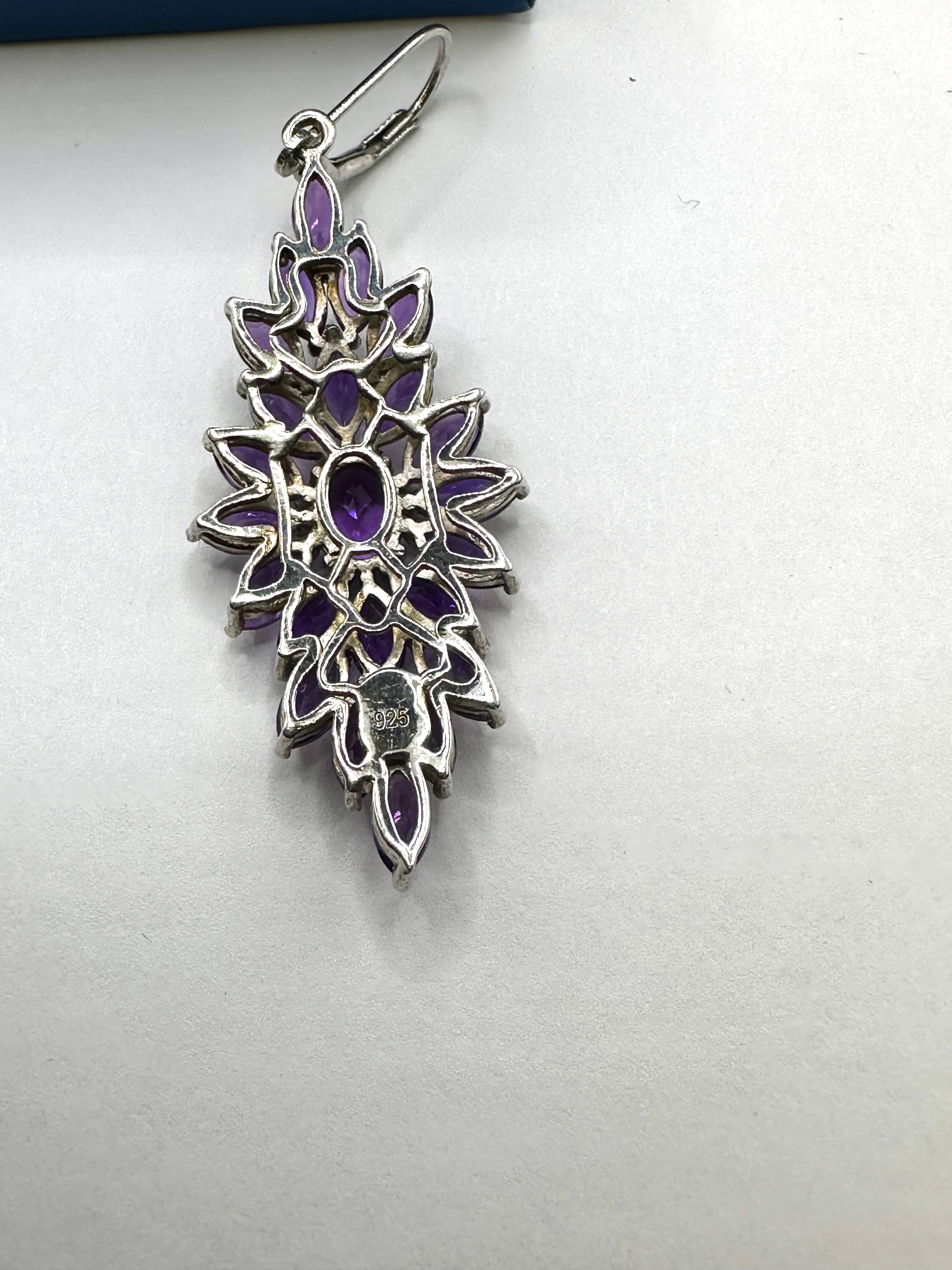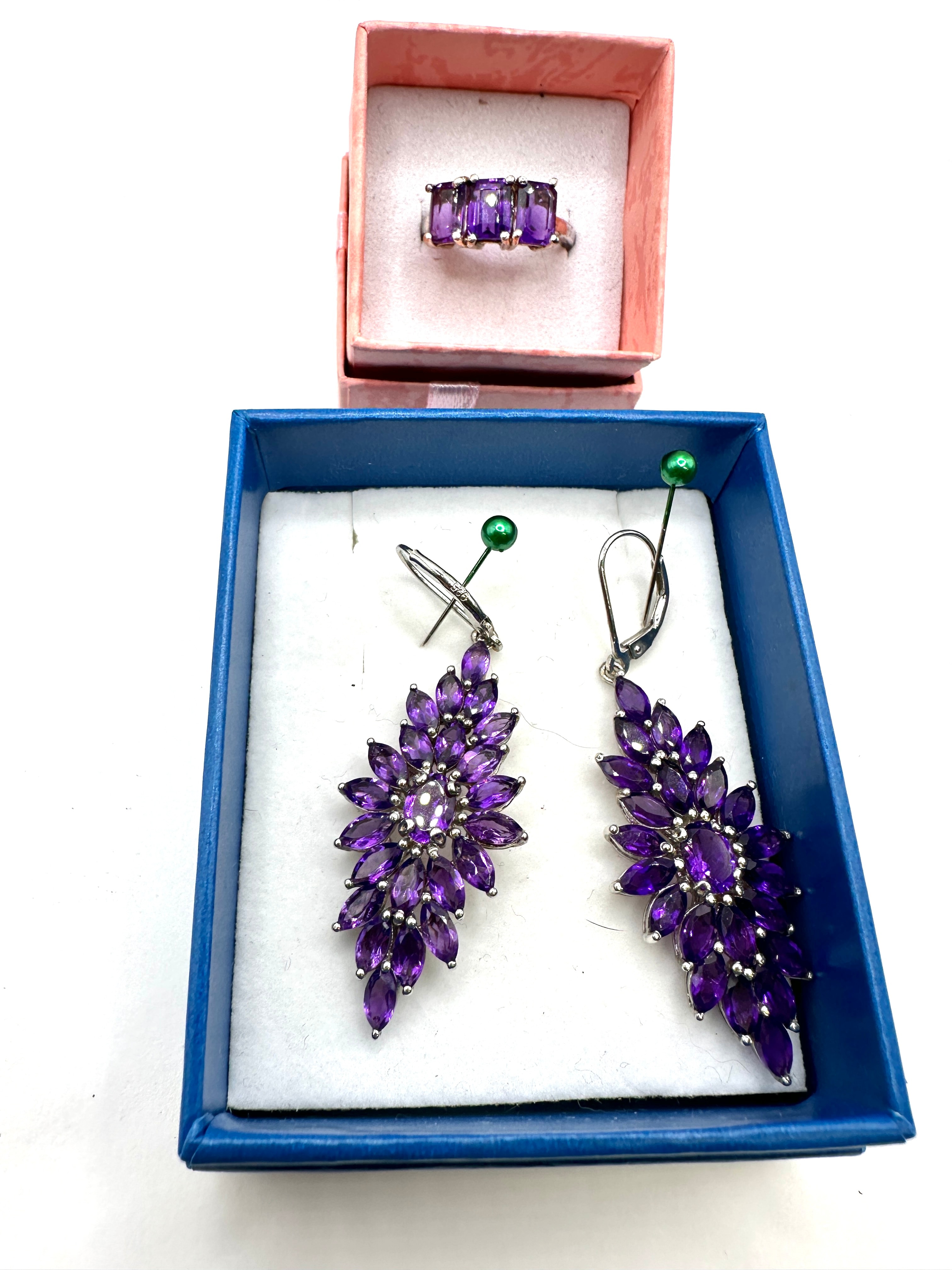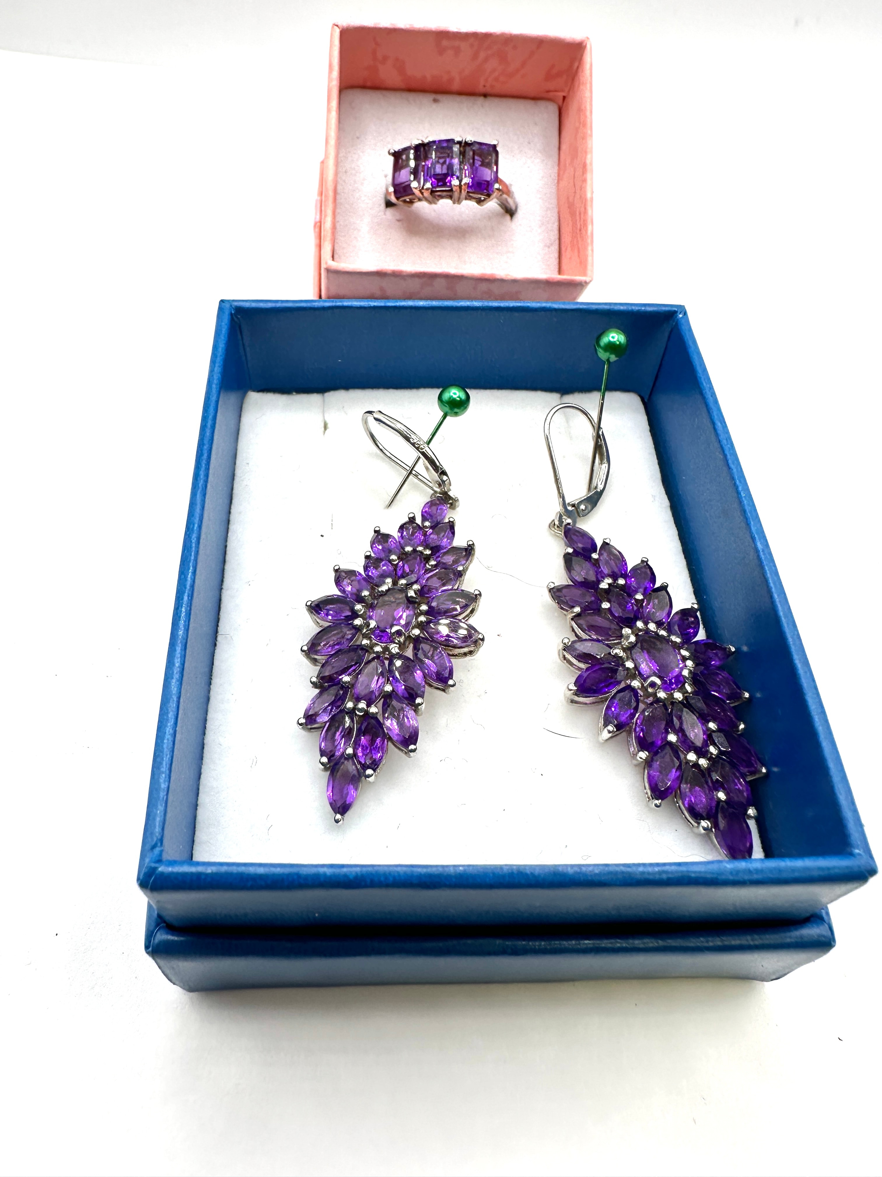 A coordinated set of 925 silver jewelry, comprising a ring and a pair of dangle earrings, each adorned with Rhodolite Garnet gemstones. The ring features three emerald-cut Rhodolite Garnet gemstones, horizontally set. The elaborate dangle earrings are designed with multiple marquise and oval-cut Rhodolite Garnet gemstones arranged in a stylized floral or starburst pattern. A ‘925’ hallmark, indicating sterling silver, is visible on the reverse of one earring, confirming the 925 silver material.