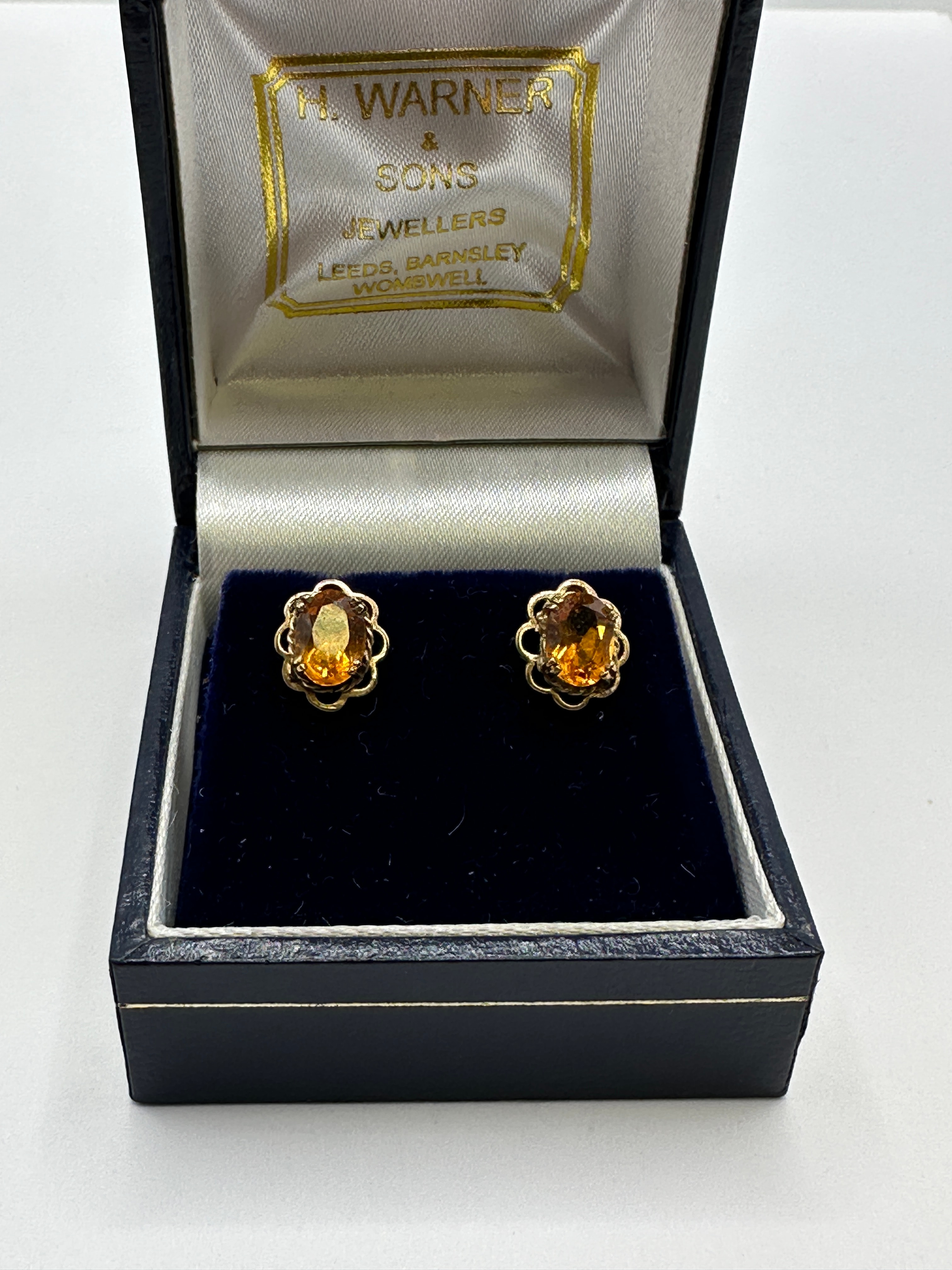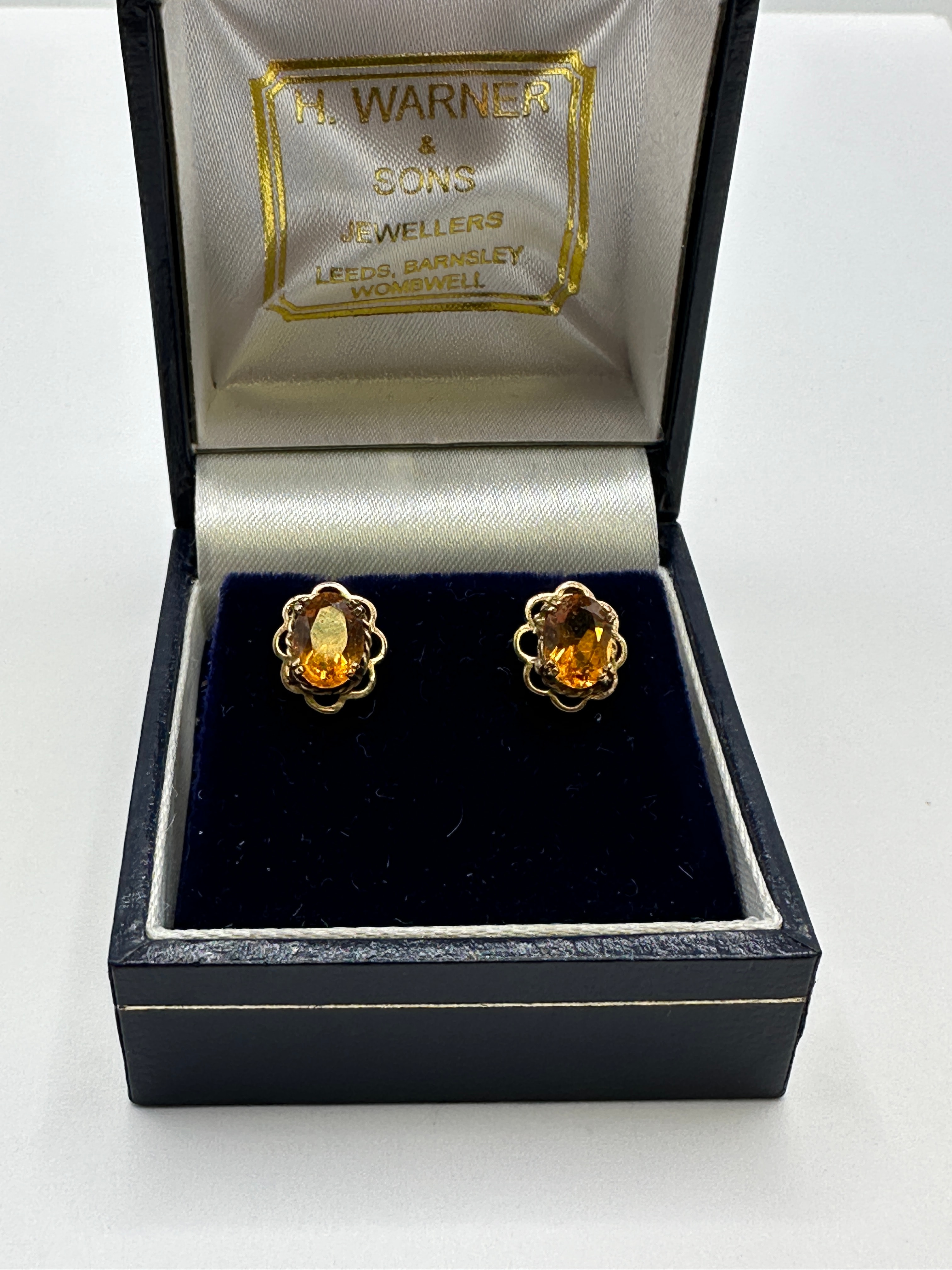 A pair of 9k yellow gold stud earrings, each featuring an oval-cut, amber-colored gemstone. The gemstones are securely set within a decorative scalloped bezel. The earrings are presented in a dark blue, possibly leatherette, hinged jewelry box. The box’s interior lid is lined with white satin, displaying the text “H. WARNER & SONS JEWELLERS LEEDS, BARNSLEY, WOMBWELL” in gold lettering, while the base holds a dark blue velvet insert that securely displays the earrings.