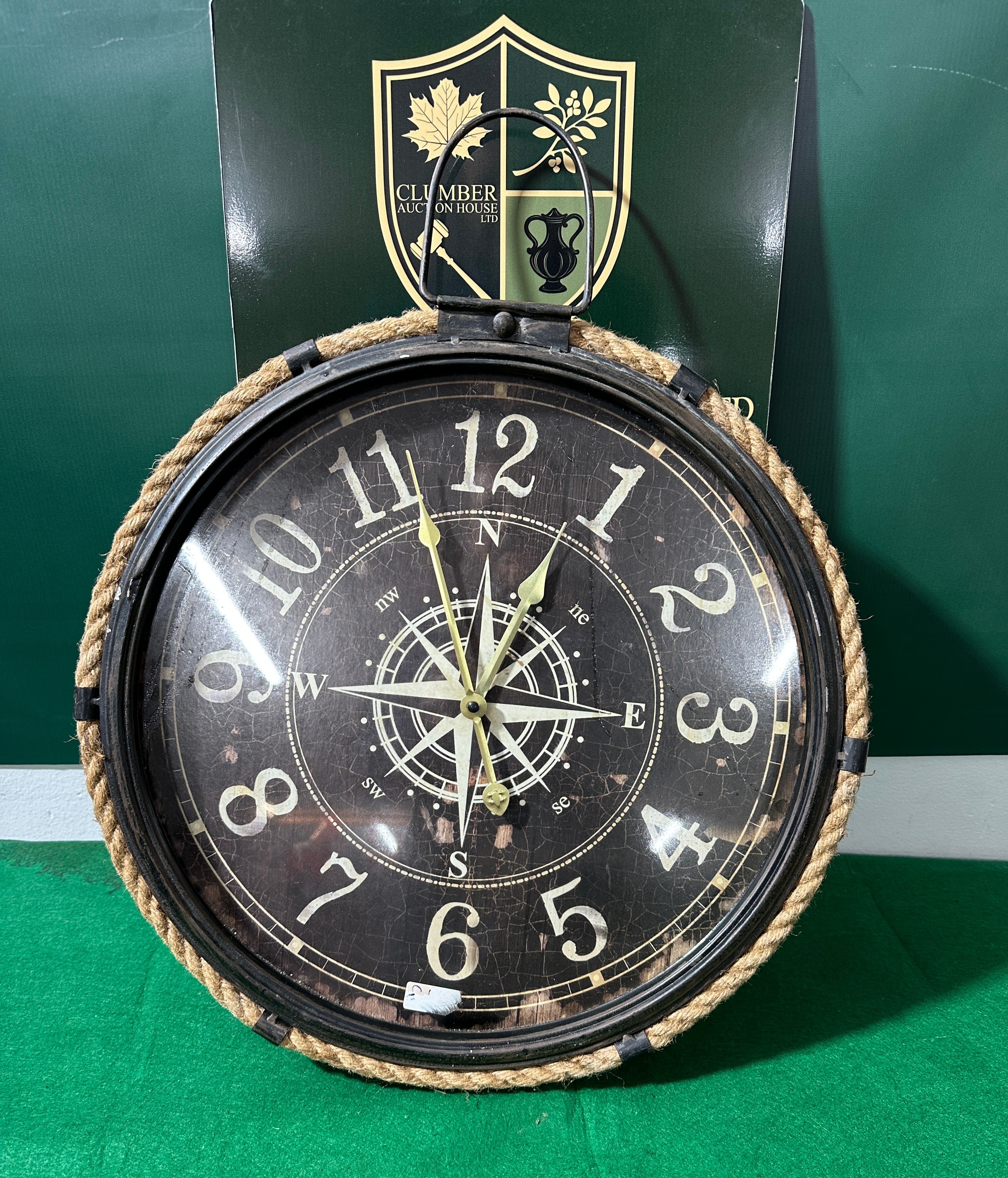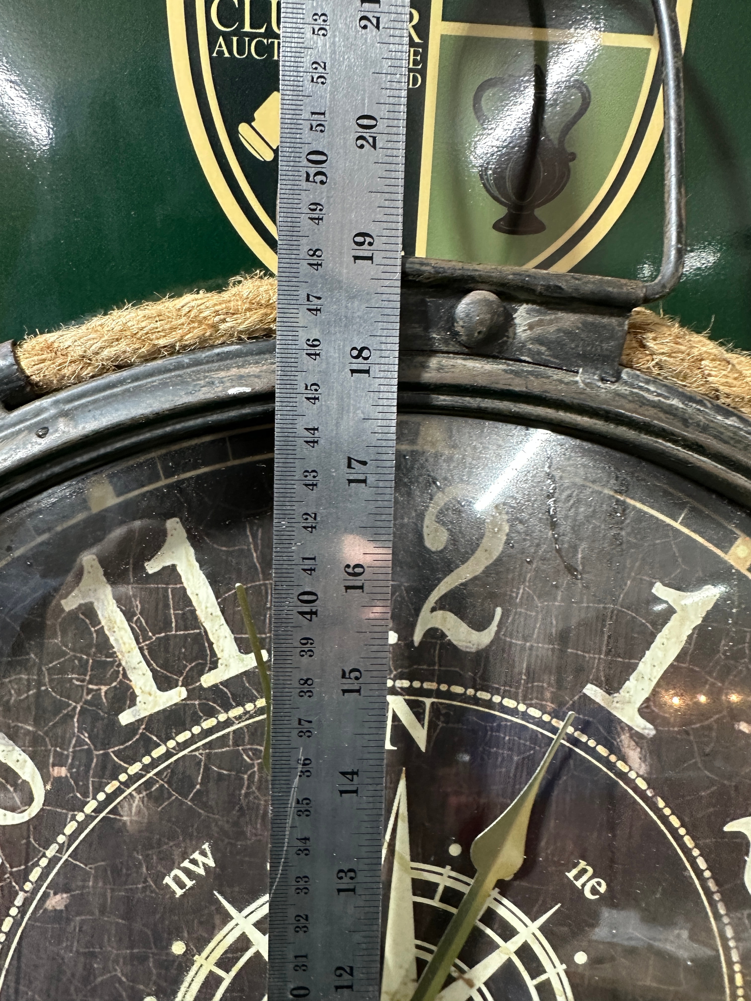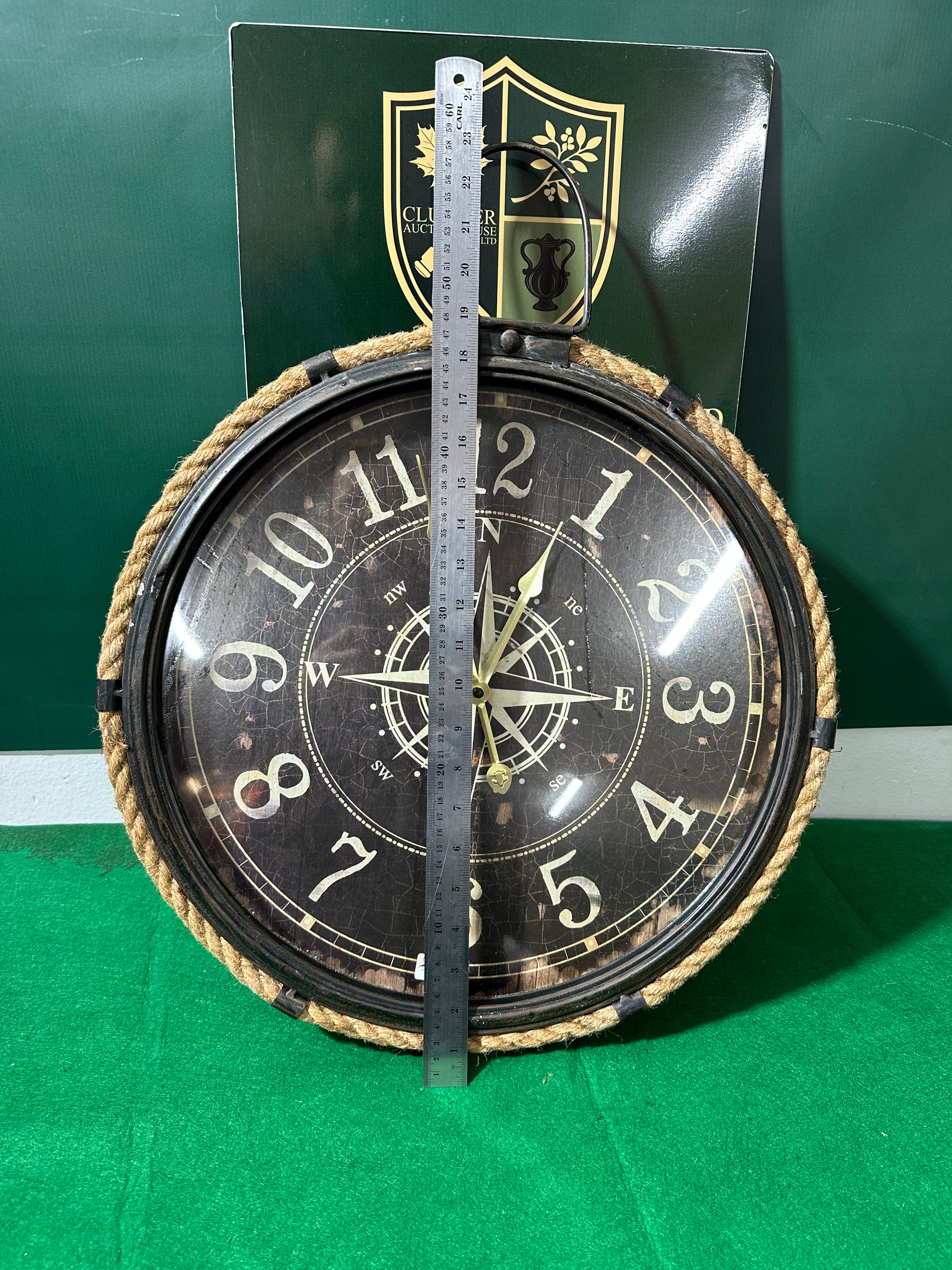 A large, circular wall clock designed in a rustic, nautical-themed vintage style. It features a dark metal frame accented with a thick, natural fiber rope. The clock face is protected by a domed clear cover. The distressed dial has a faux-cracked dark brown or black background with large cream-colored Arabic numerals. A central compass rose motif displays cardinal and intercardinal directions (N, NE, E, SE, S, SW, W, NW). The clock is fitted with gold-toned hour and minute hands.
