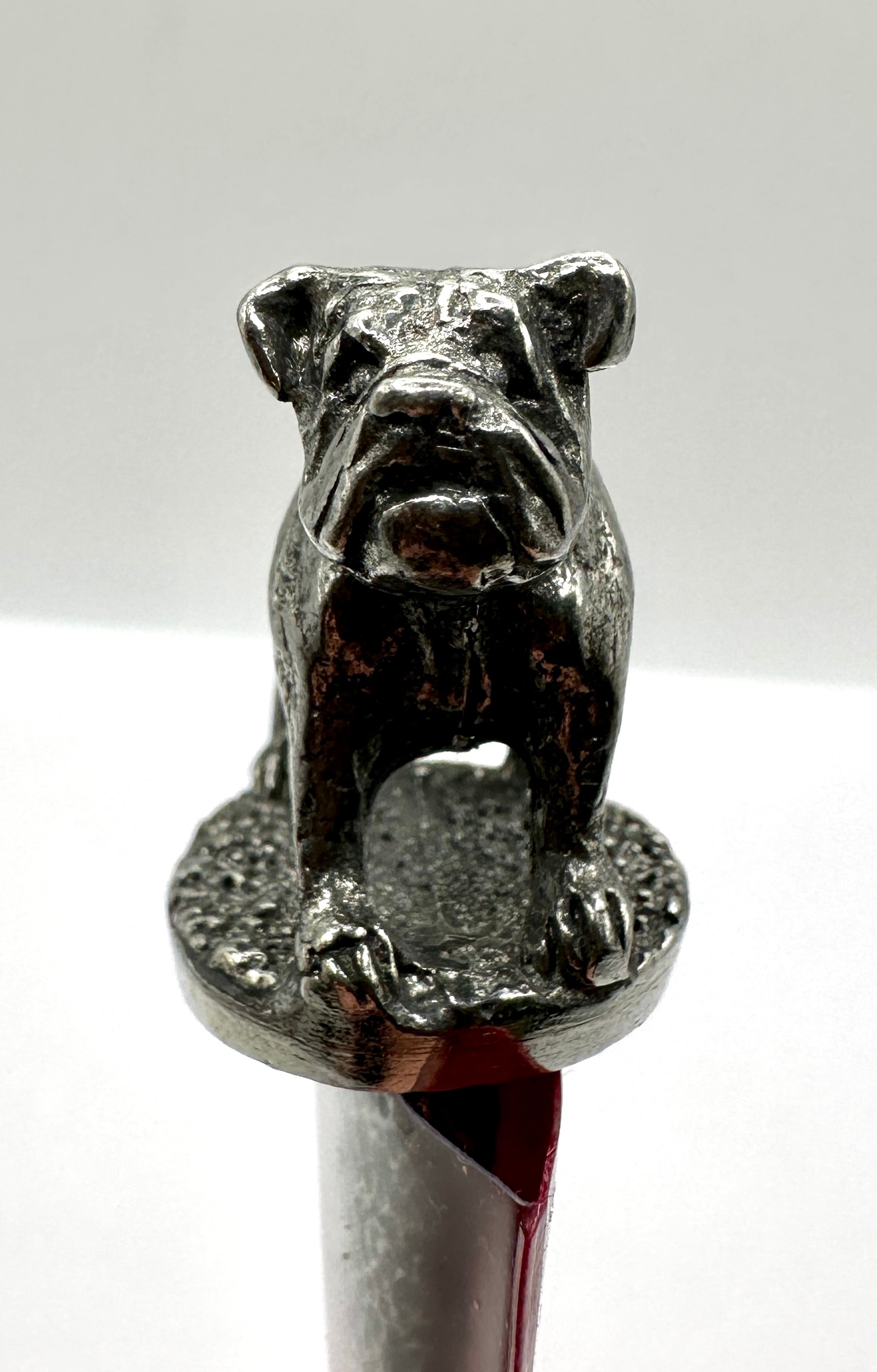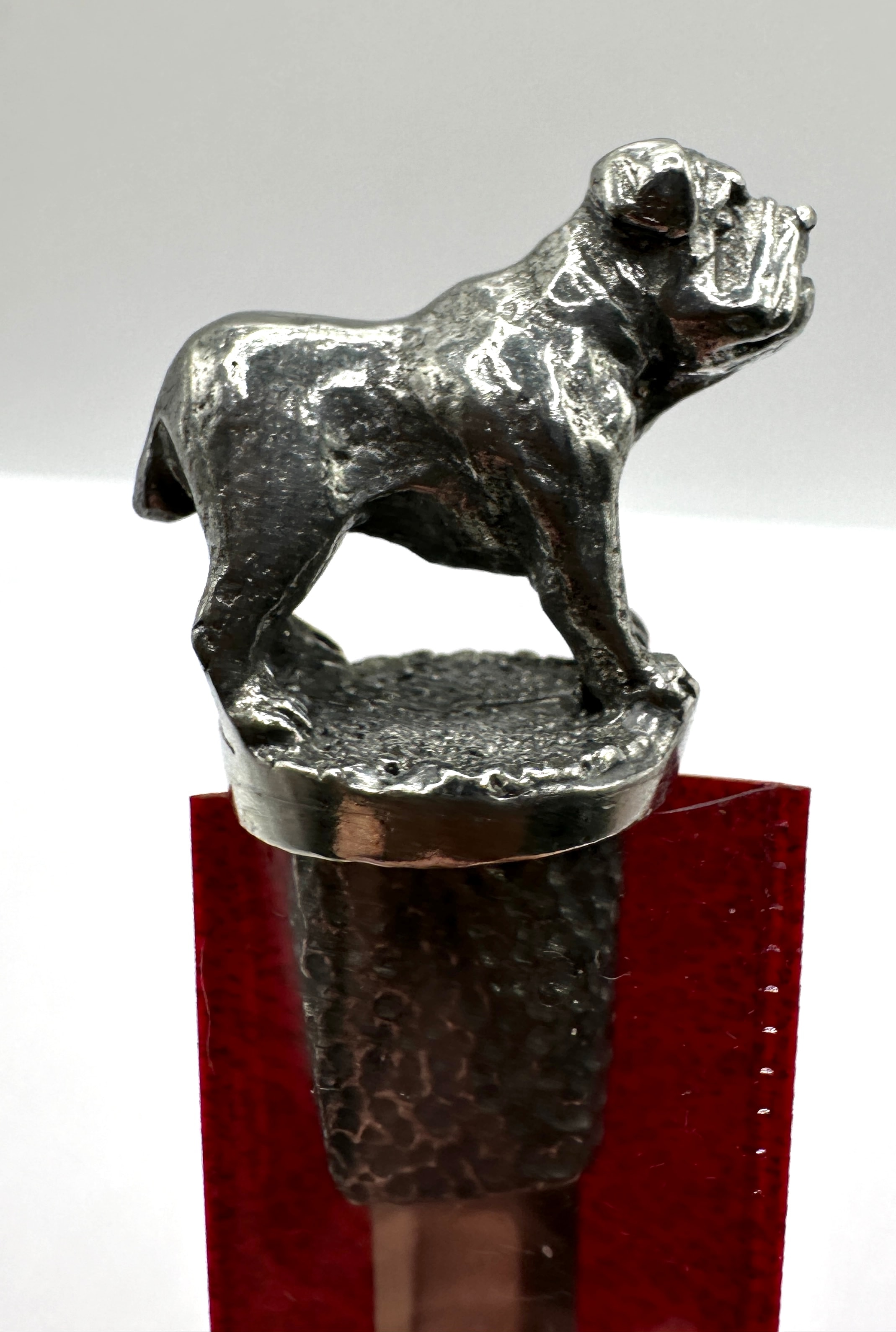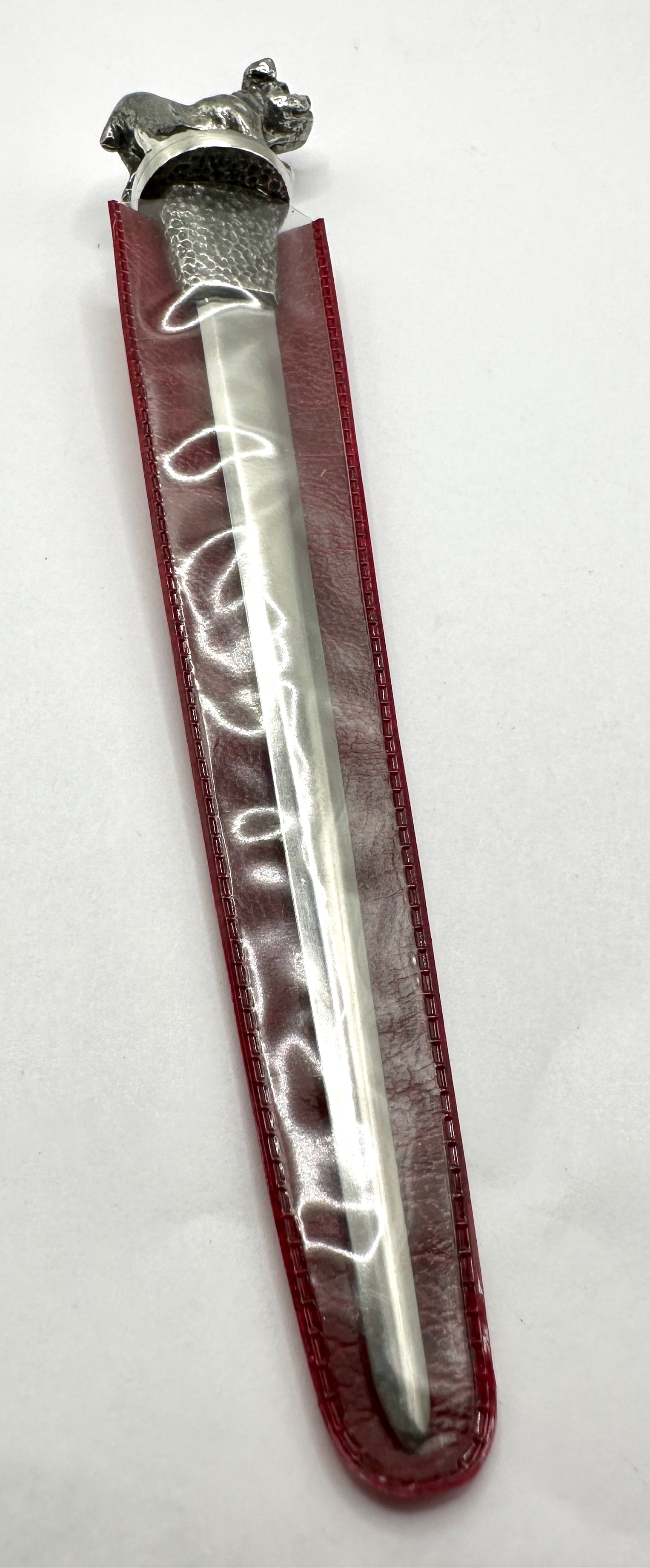This item is a decorative letter opener featuring a prominent figural handle. The handle is primarily composed of a silver-toned metal, depicting a detailed bulldog sculpture atop a textured, hammered, or stippled grip section. The blade is a plain, polished silver-toned metal, tapering to a rounded point. The letter opener is housed within a red protective sleeve, likely made of vinyl or faux leather, with a clear plastic front and stitched edges. No discernible manufacturer’s marks or specific period indicators are visible.