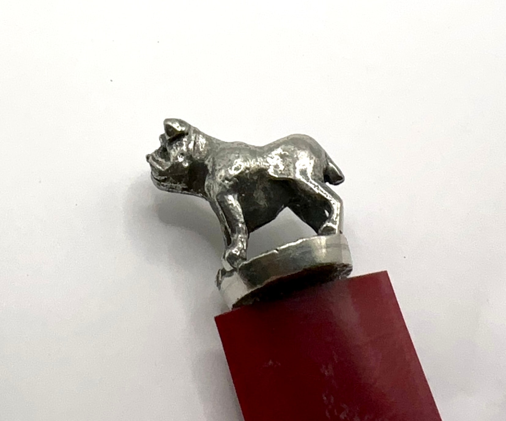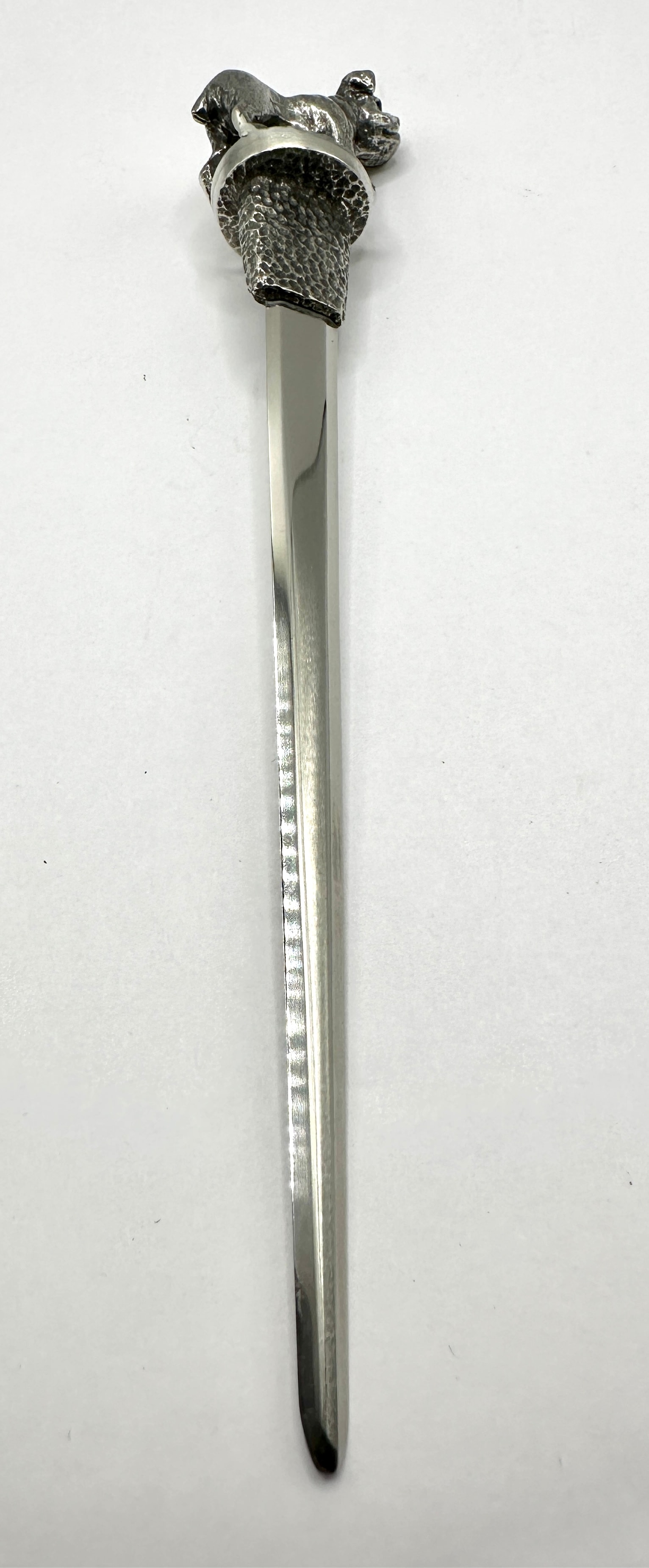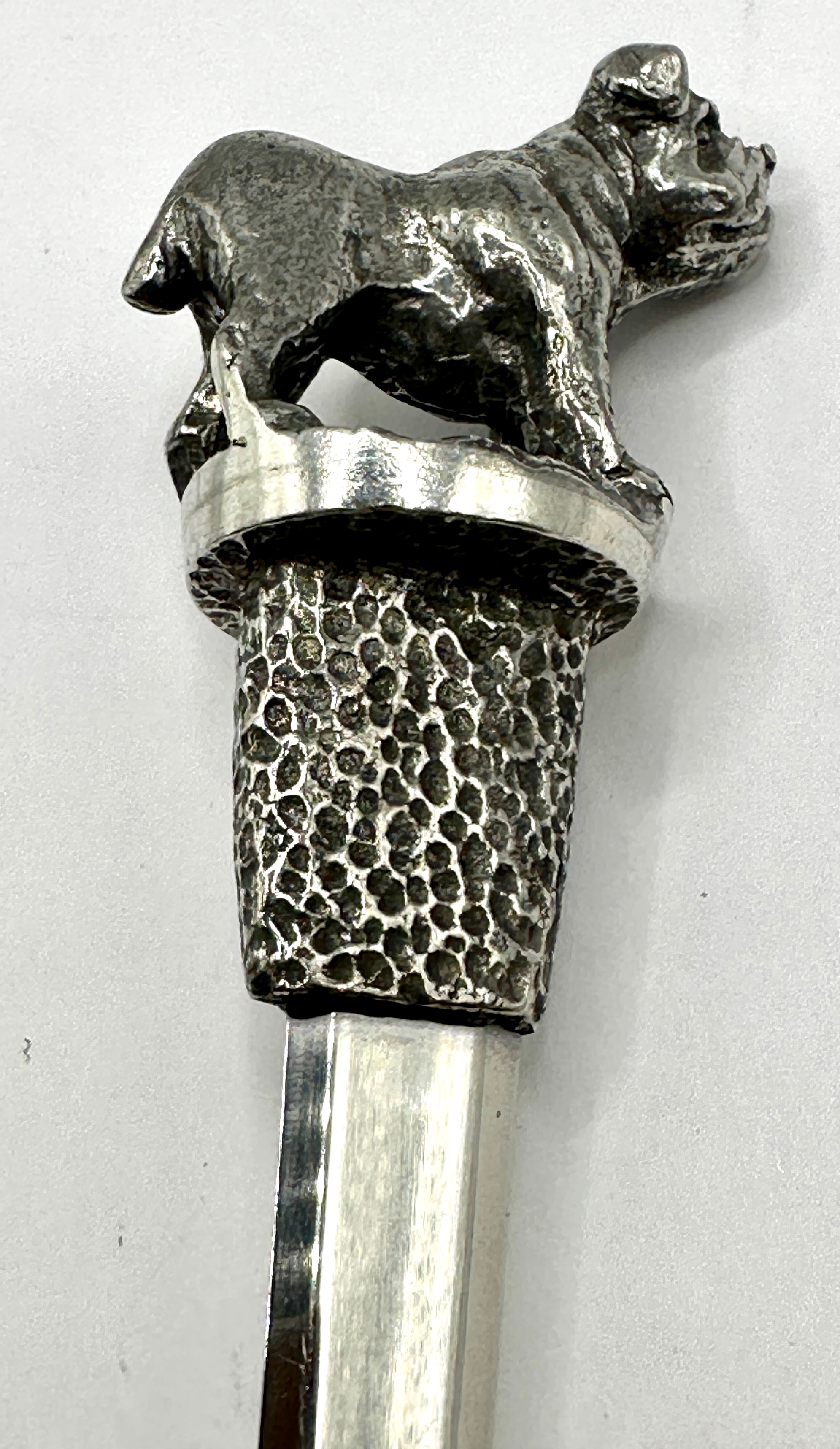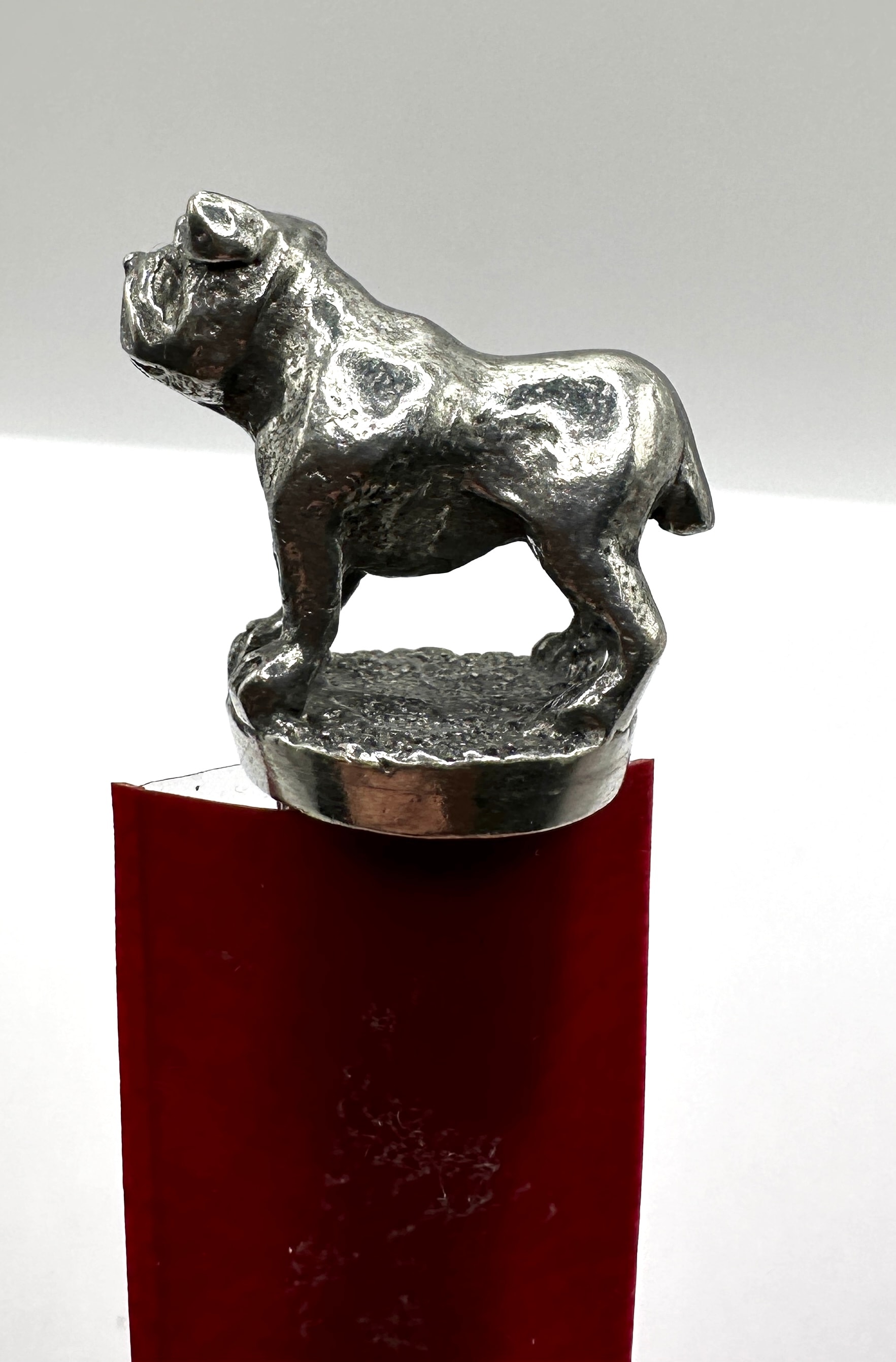 This item is a decorative letter opener featuring a prominent figural handle. The handle is primarily composed of a silver-toned metal, depicting a detailed bulldog sculpture atop a textured, hammered, or stippled grip section. The blade is a plain, polished silver-toned metal, tapering to a rounded point. The letter opener is housed within a red protective sleeve, likely made of vinyl or faux leather, with a clear plastic front and stitched edges. No discernible manufacturer’s marks or specific period indicators are visible.