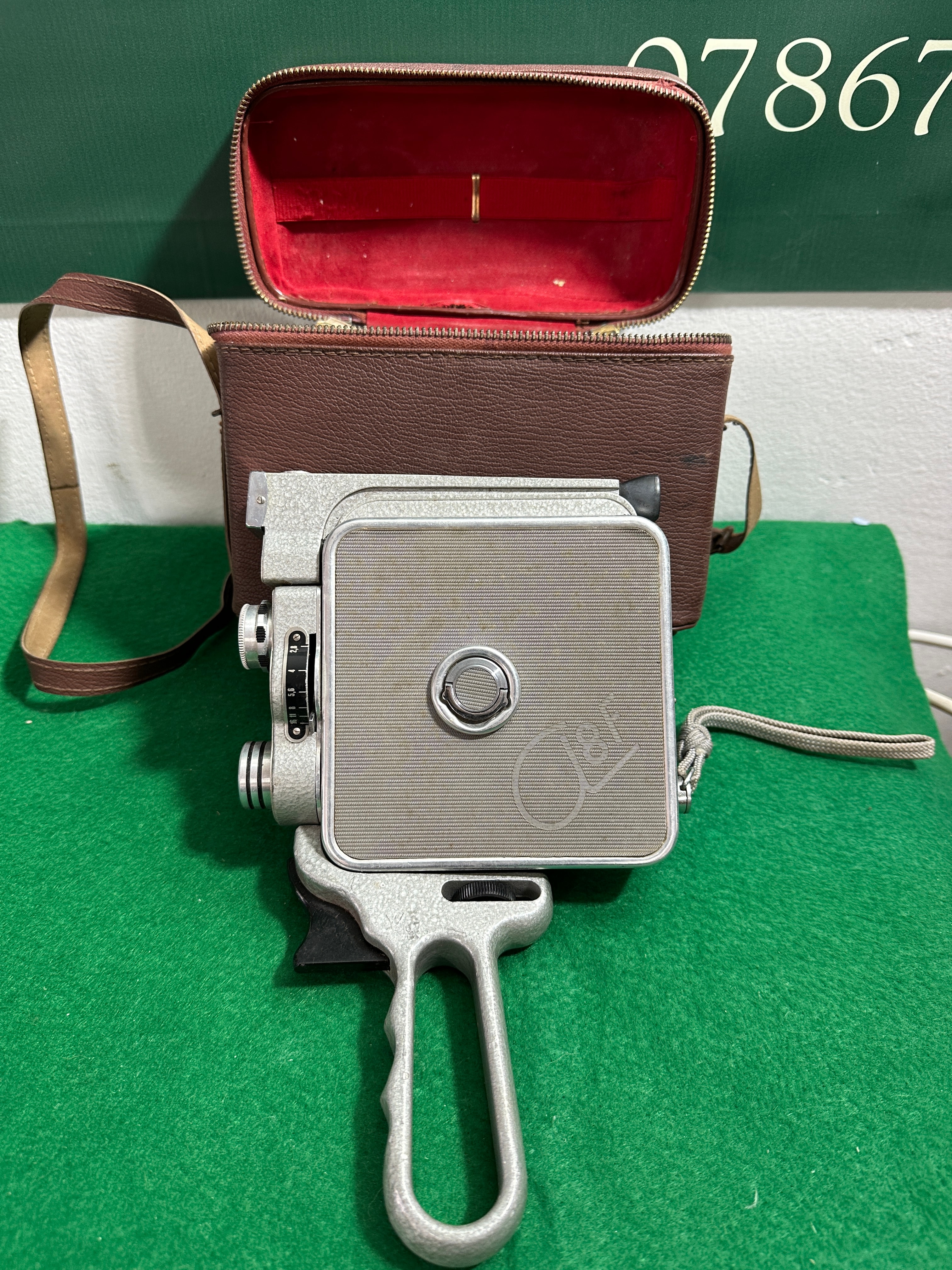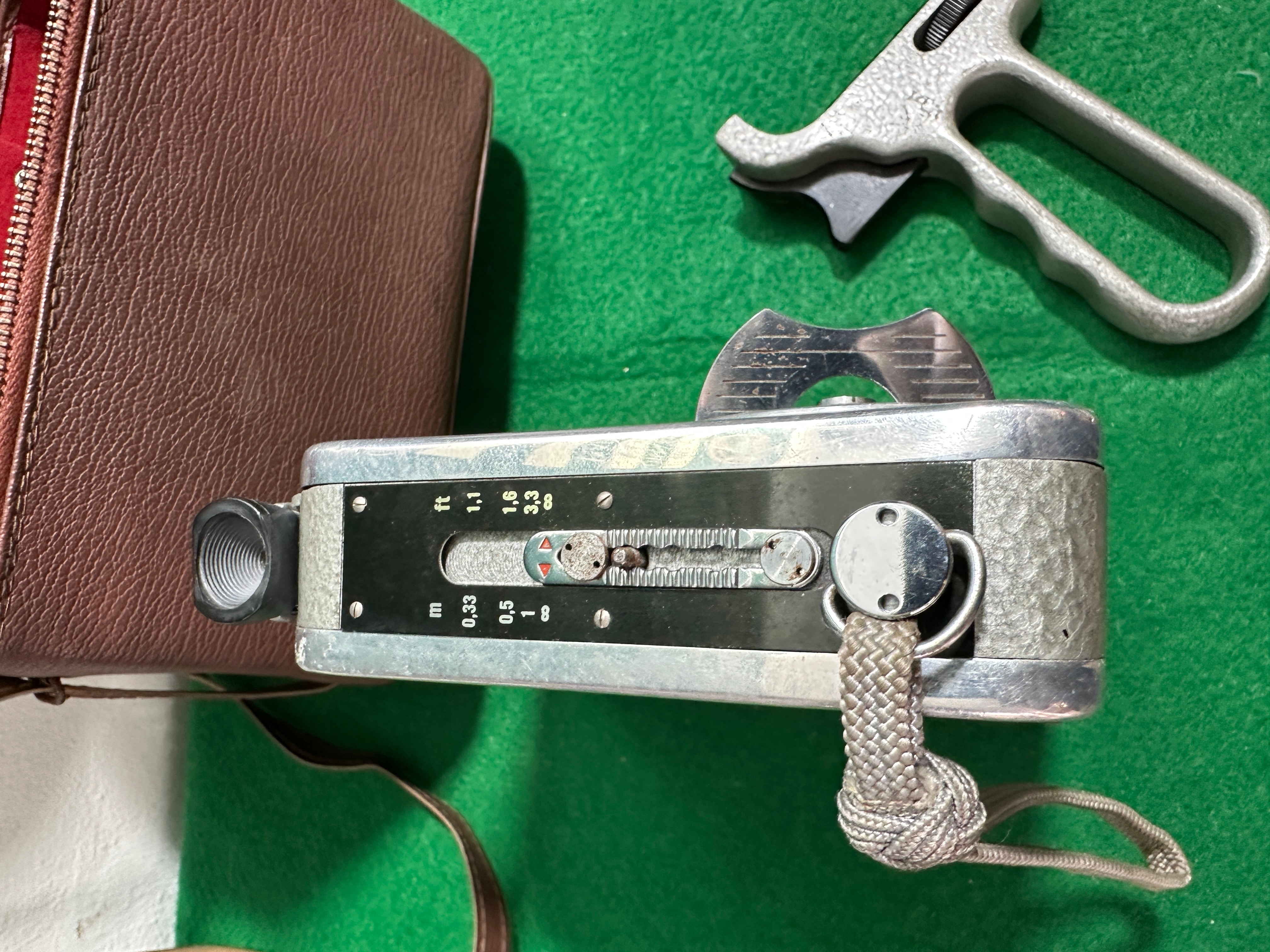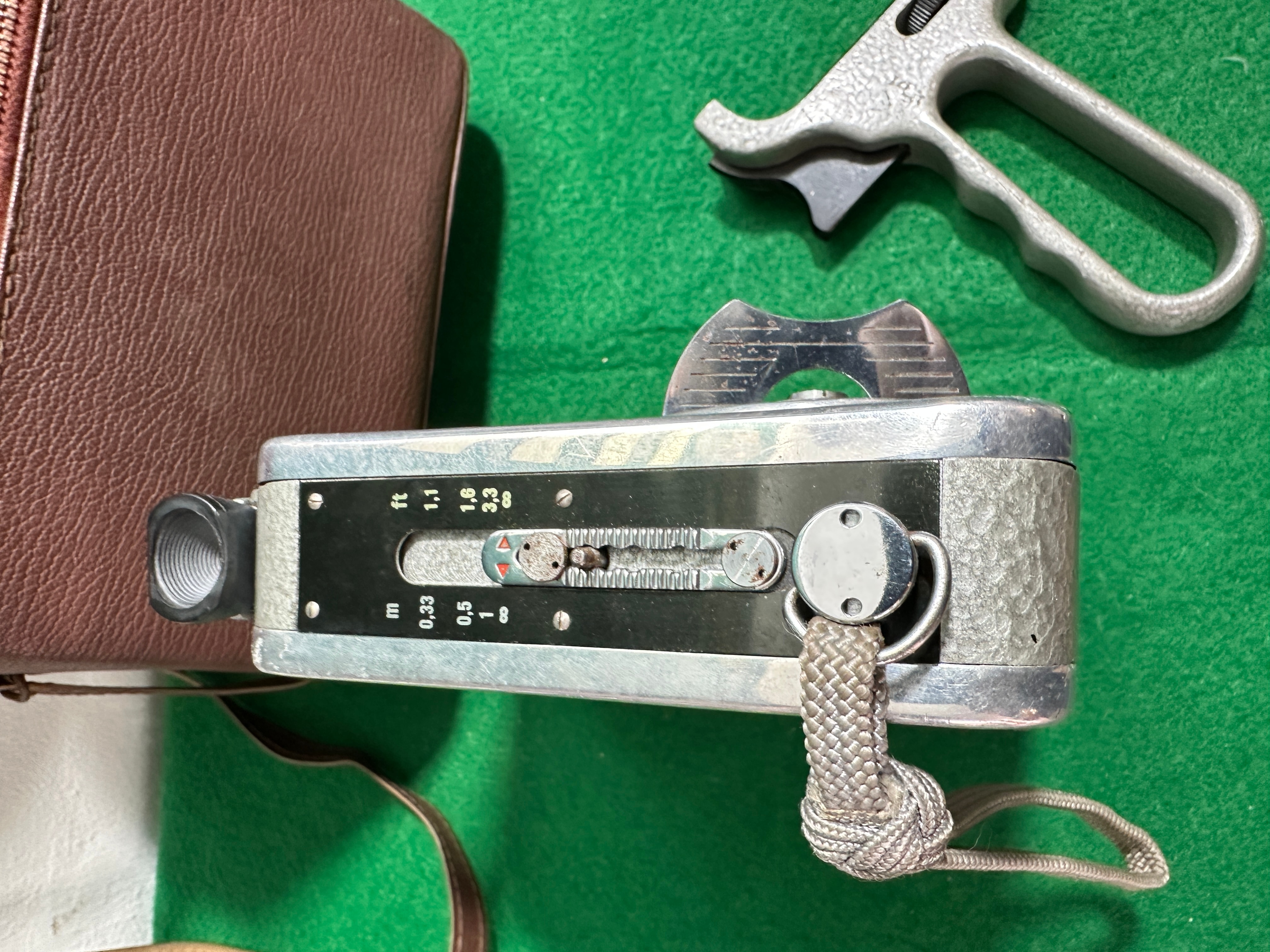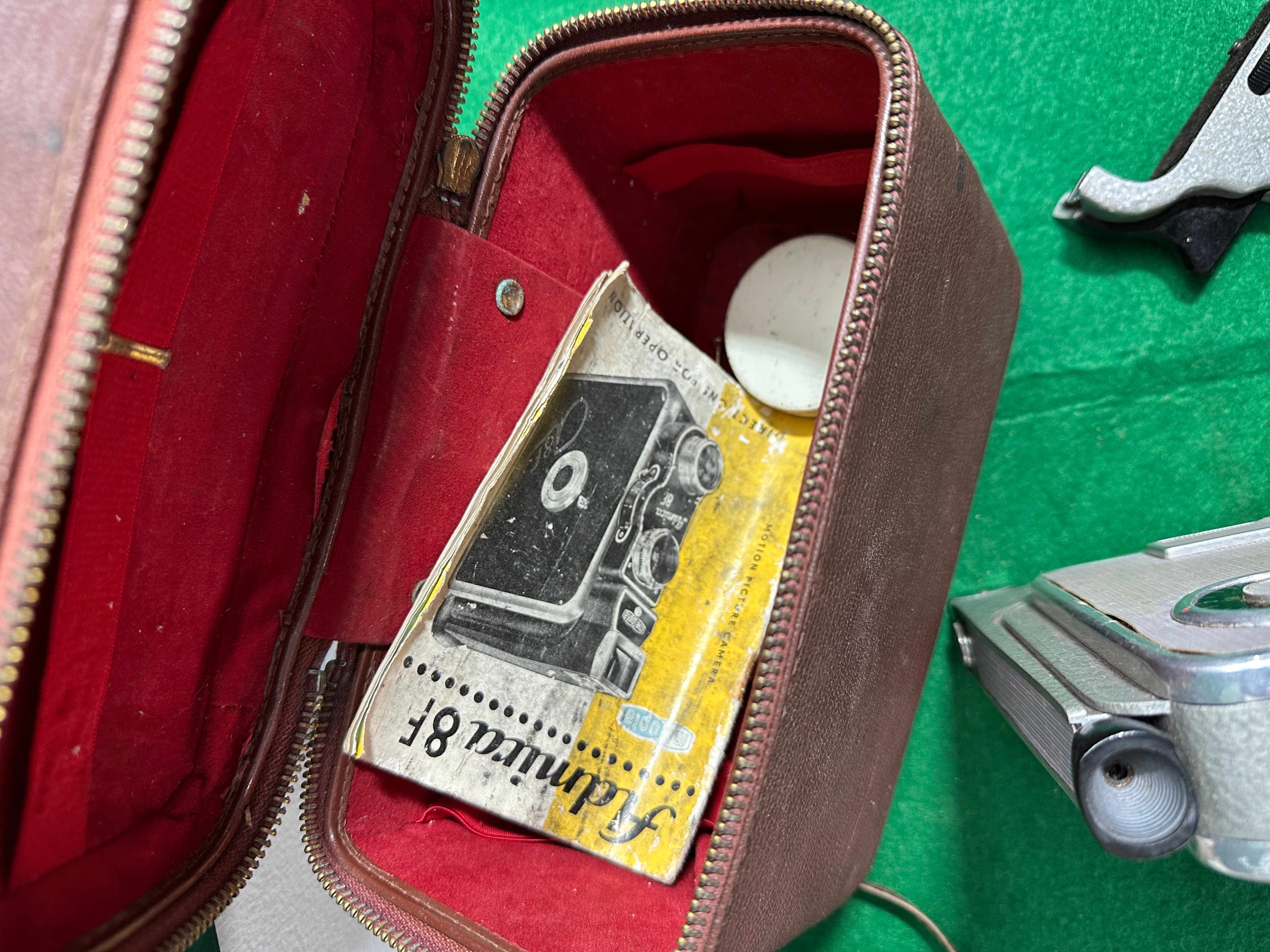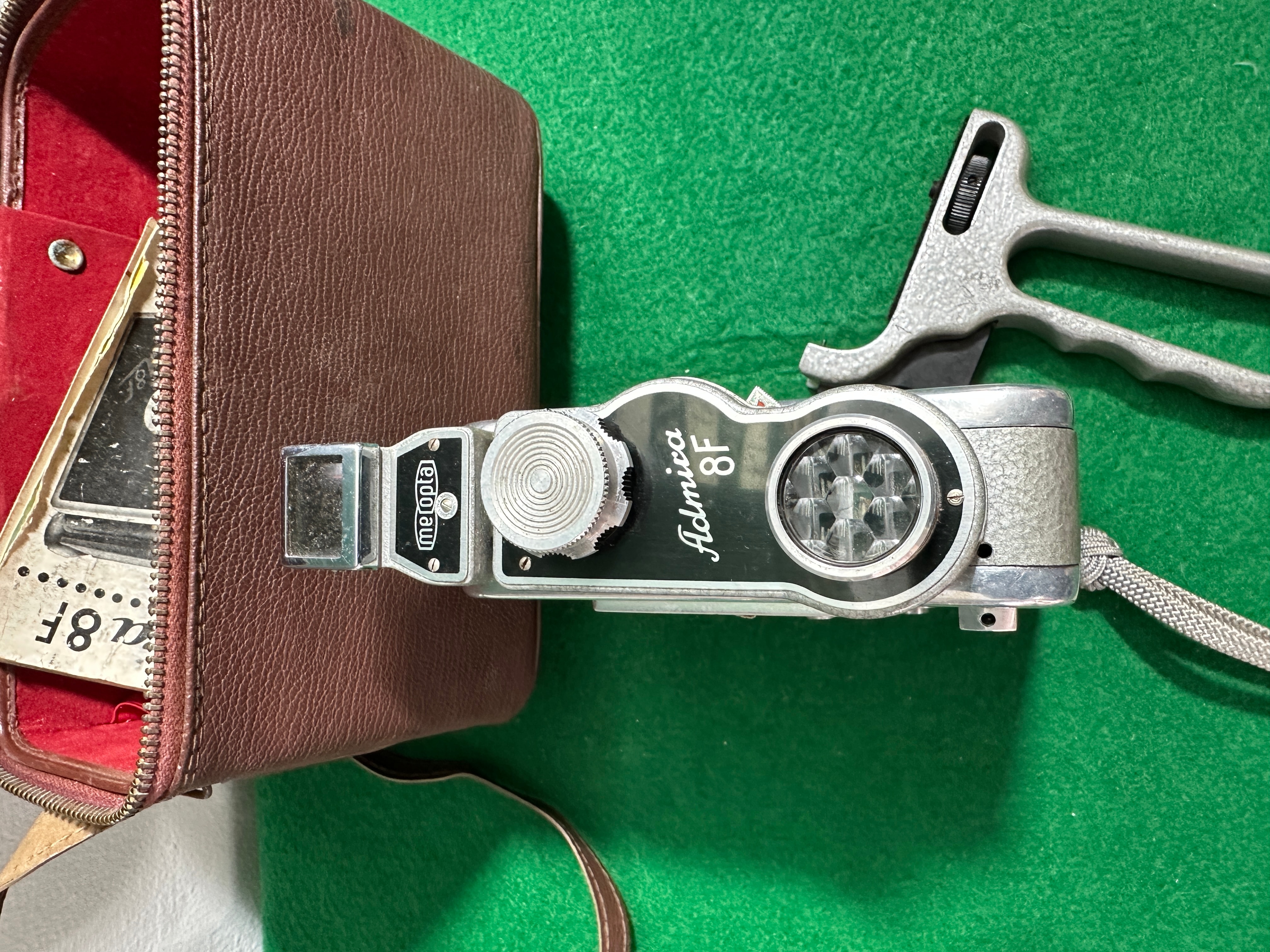 A Meopta Admica 8F 8mm movie camera, likely mid-20th century. The camera is primarily constructed of silver-toned metal with a textured main body. It features engravings including “Admirica 8F”, “Meopta”, and a “C & R” logo, alongside technical markings for distance in feet and meters, and aperture settings. Accompanying the camera is its original brown, textured, leather-like carrying case with a red velvet interior, a detached metal pistol grip, and a folded instruction manual clearly labeled “Admirica 8F” and identifying itself as an “8mm movie camera” with “instructions for operation”.