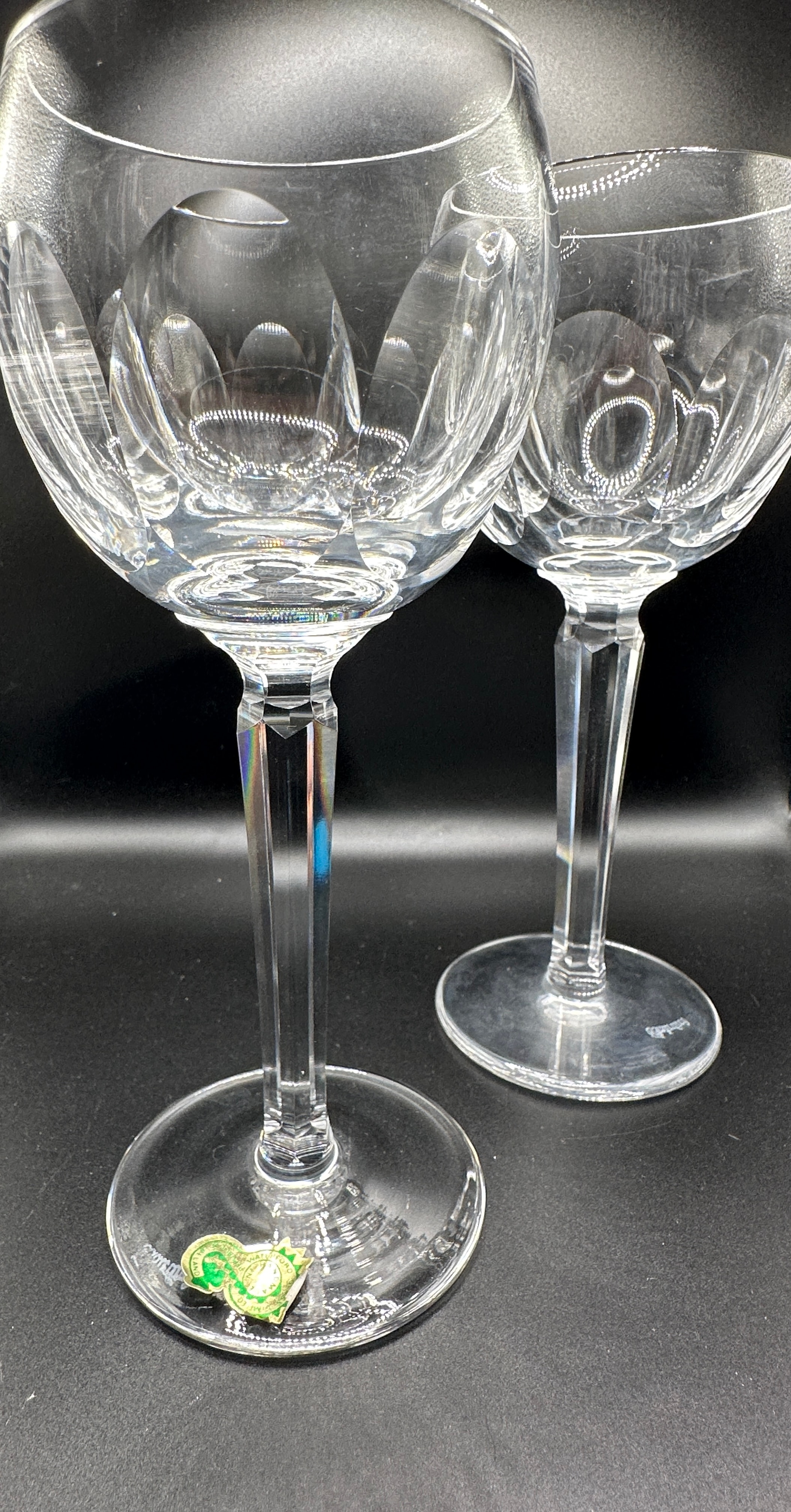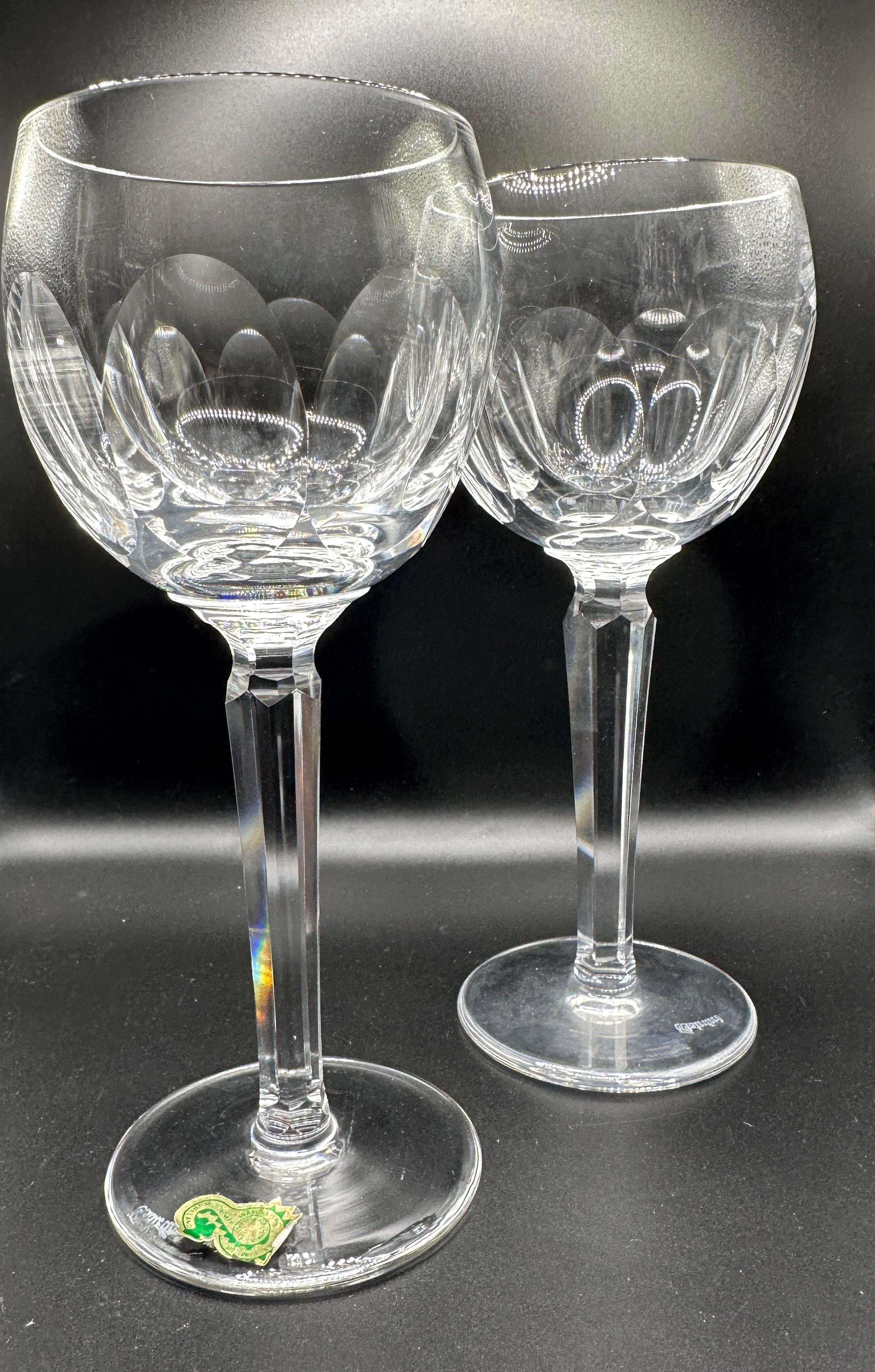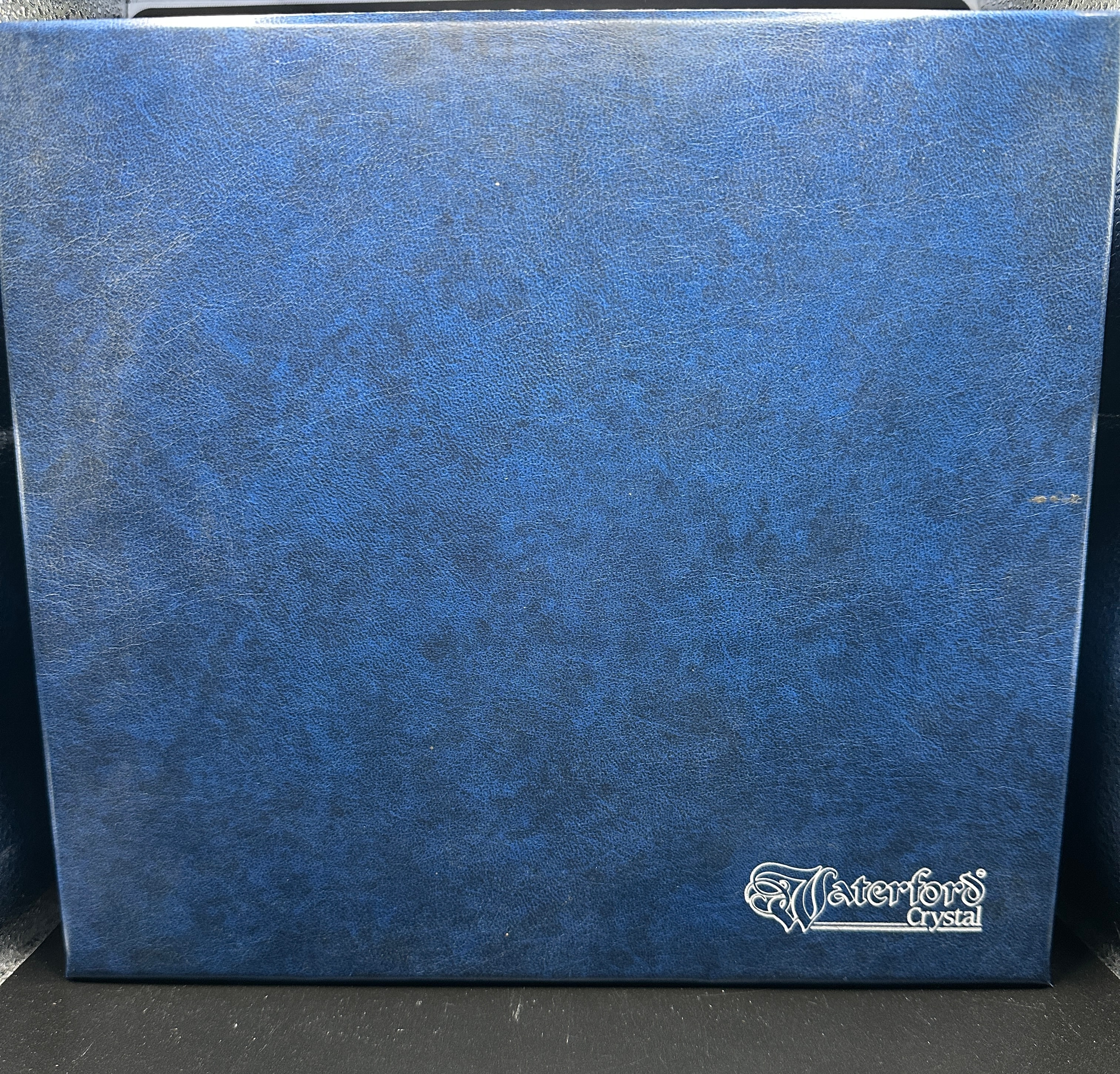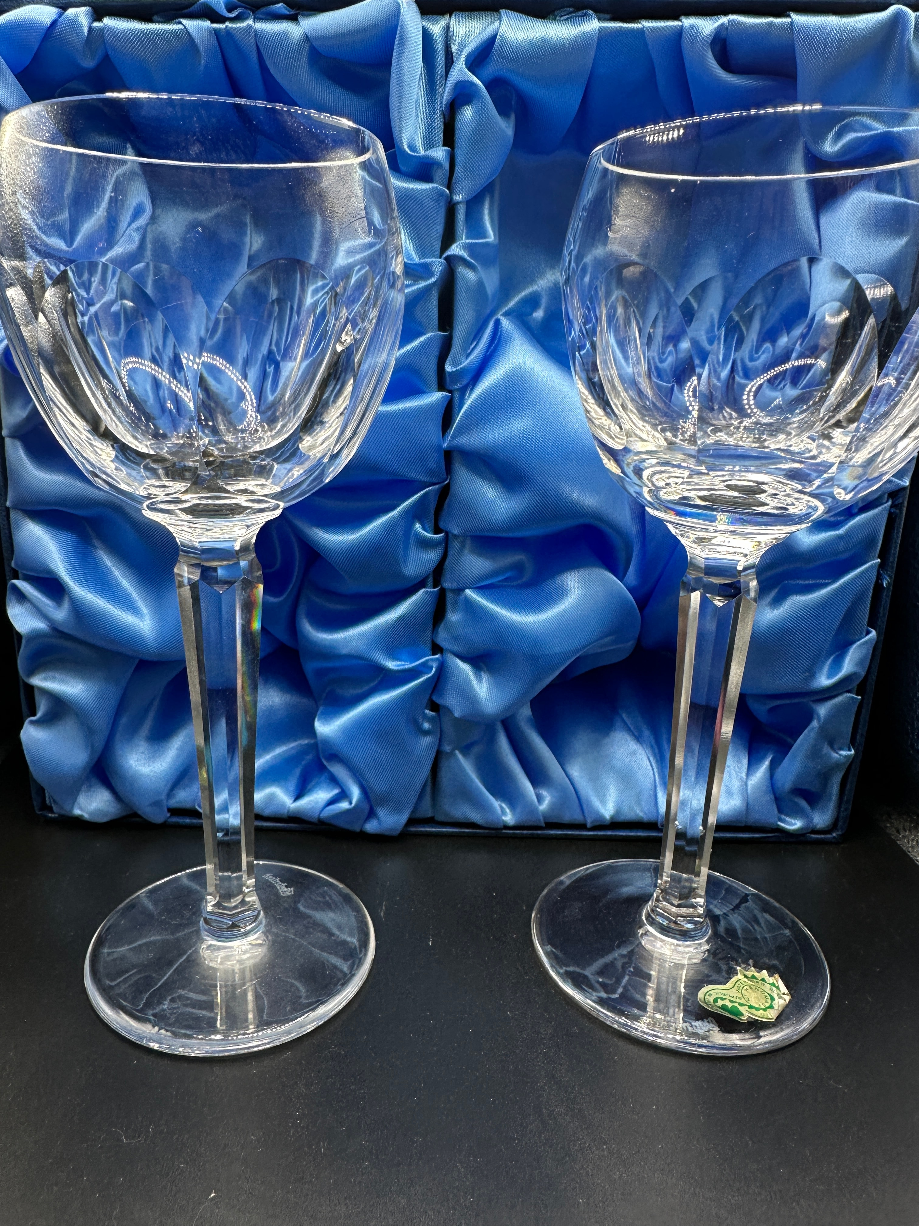 A pair of Waterford clear lead crystal stemmed glasses, likely wine or water goblets. Each features a traditional cut design with faceted bowls and stems, resting on a plain circular foot. The base of at least one glass is etched with the “Waterford” mark, further corroborated by a green and gold foil sticker on its foot. The glasses are accompanied by their original blue textured presentation box with a satin interior, which is printed with “Waterford crystal” on the front.