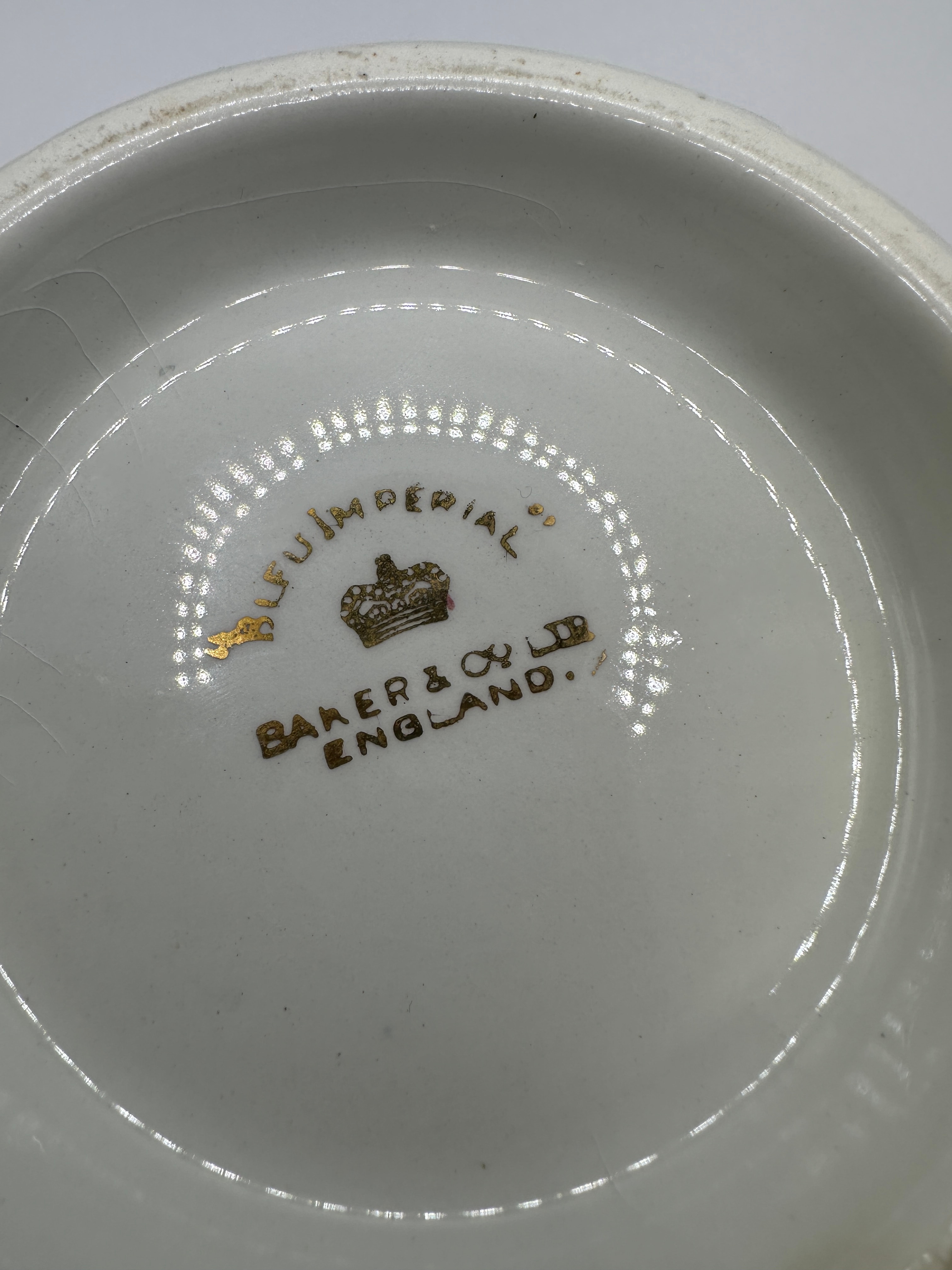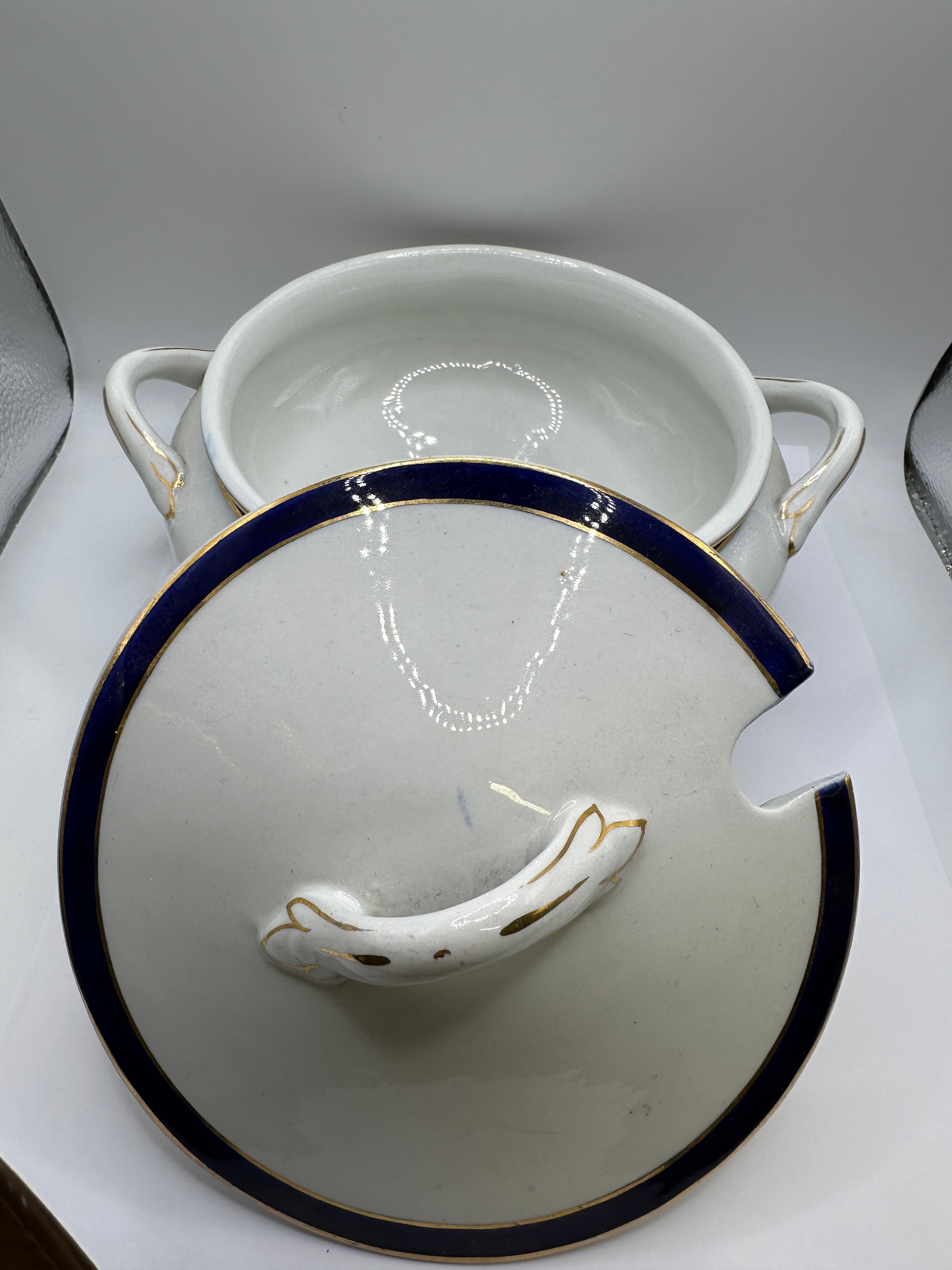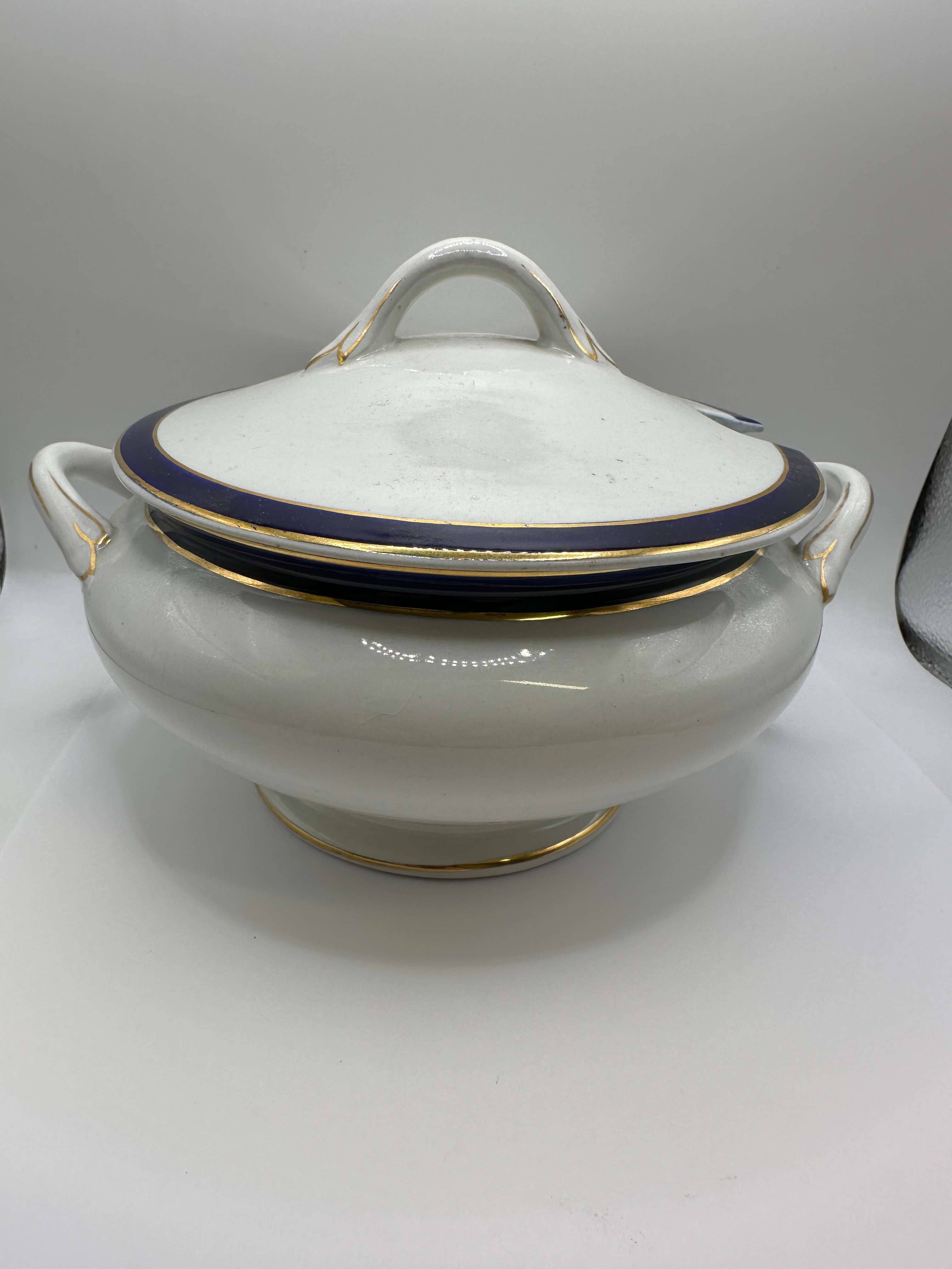 A covered tureen by Imperial Baker & Co. Ltd. England, dating to the early to mid-20th century. This white glazed ceramic or porcelain tureen features a traditional form with a dark blue (cobalt) band and gold trim accents on the rims of both the bowl and the domed lid. The handles and lid finial are also accented with gold. The lid includes a cut-out notch designed for a serving ladle. The base is marked in gold with ‘IMPERIAL’ arced above a crown emblem, followed by ‘BAKER & CO LTD ENGLAND’.