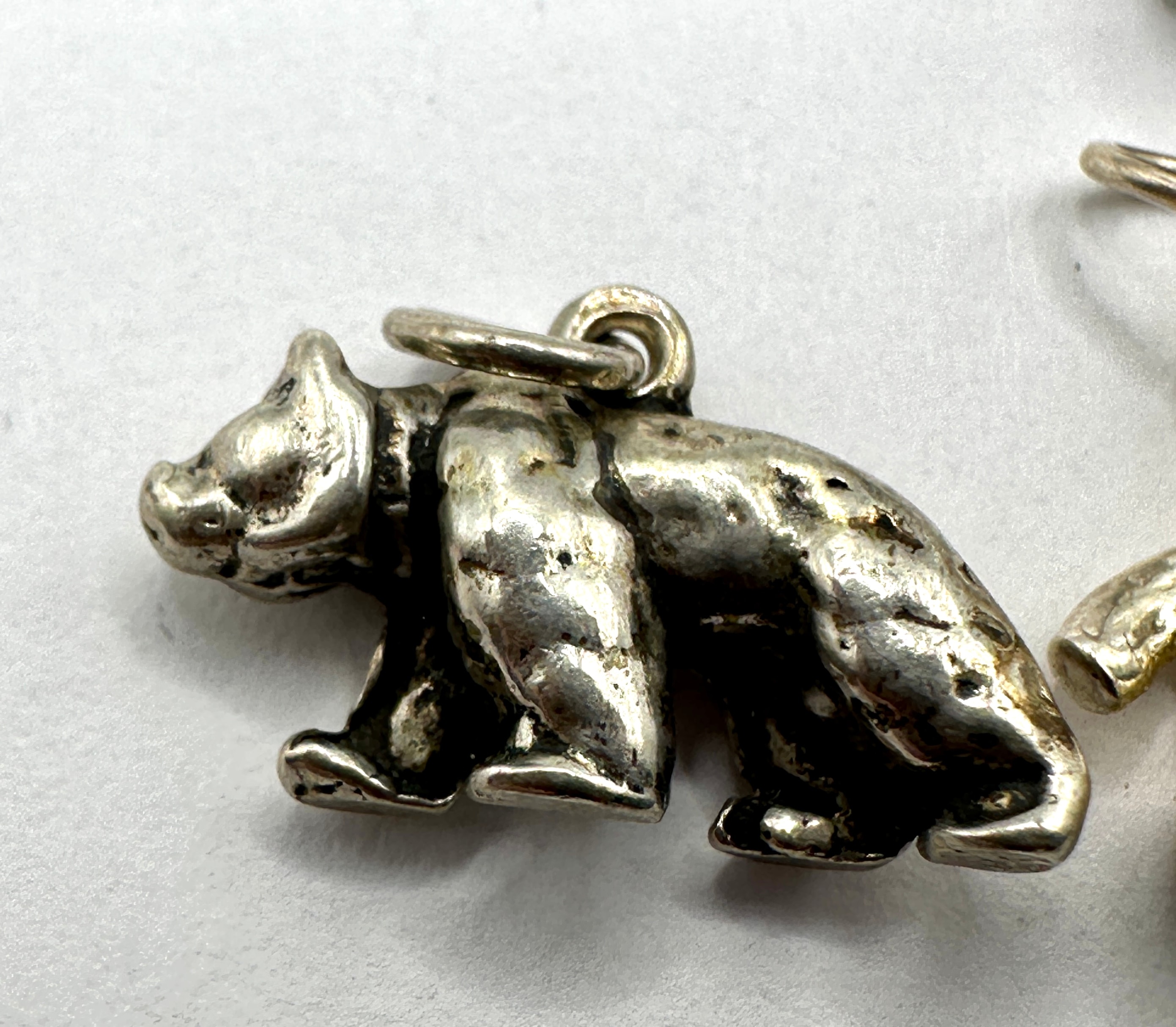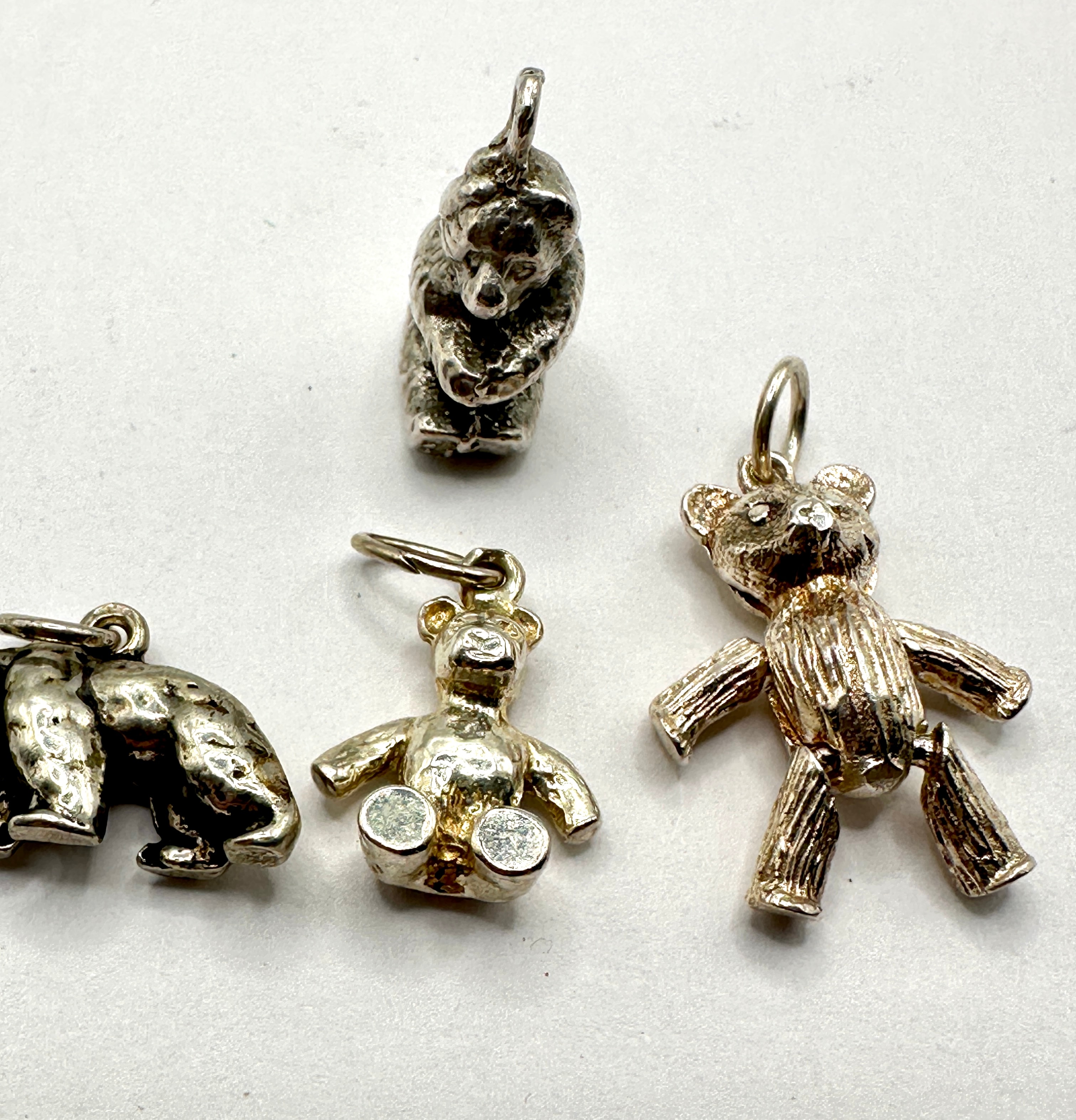 A group of four sterling silver bear and teddy bear charms. This lot comprises four small, figurative charms or pendants, crafted from sterling silver. Two charms offer a more realistic portrayal of bears: one standing on its hind legs with textured fur, and another walking on all fours with a smoother finish. The remaining two are stylized teddy bear figures; one smaller, seated with a relatively smooth surface, and a larger standing one featuring a ribbed texture suggestive of plush fur. Each item includes an integral or attached jump ring for suspension.
