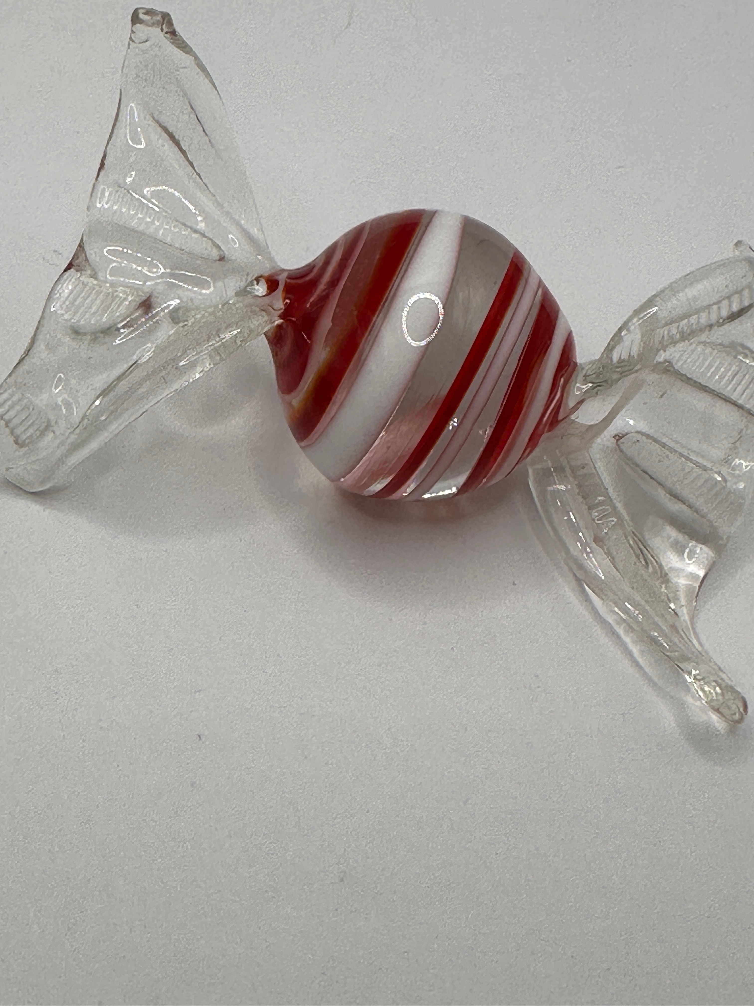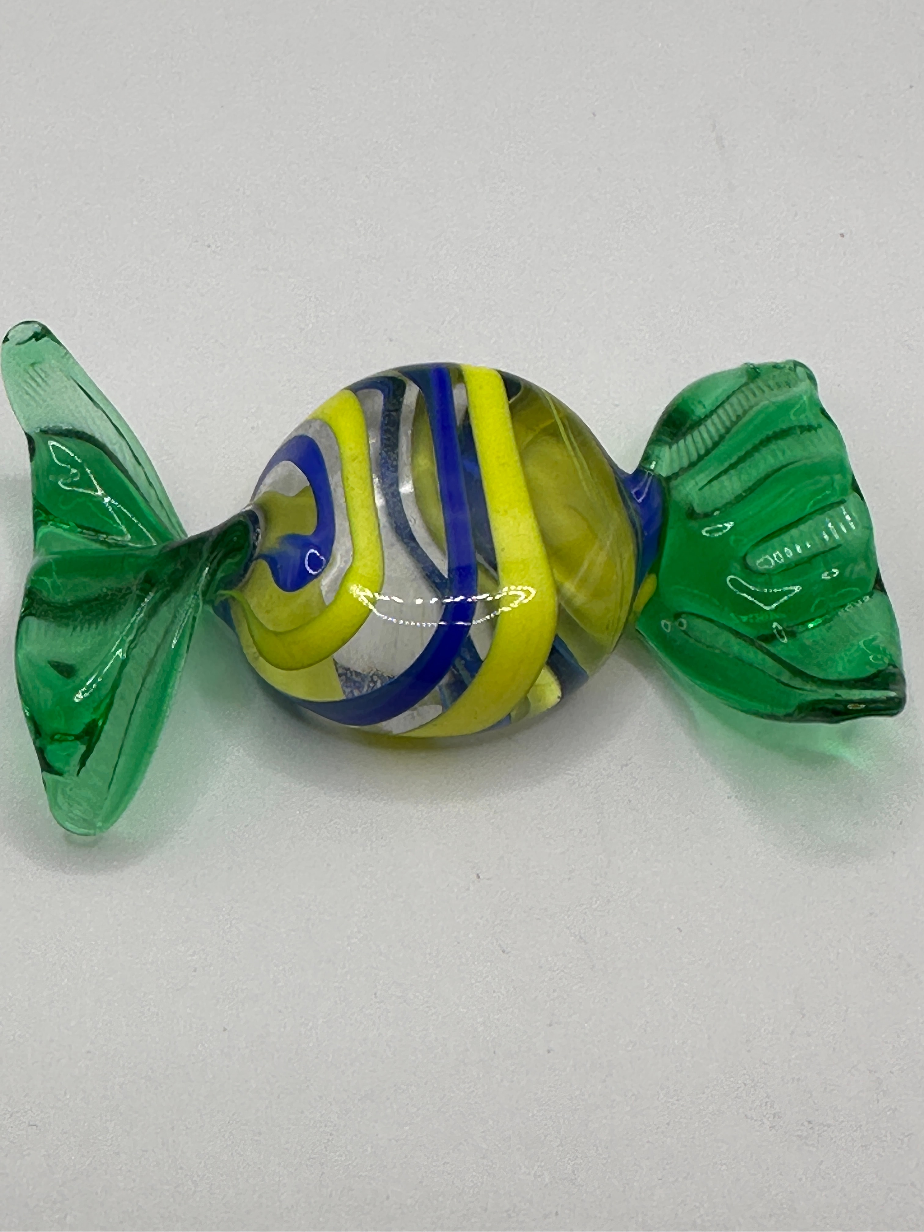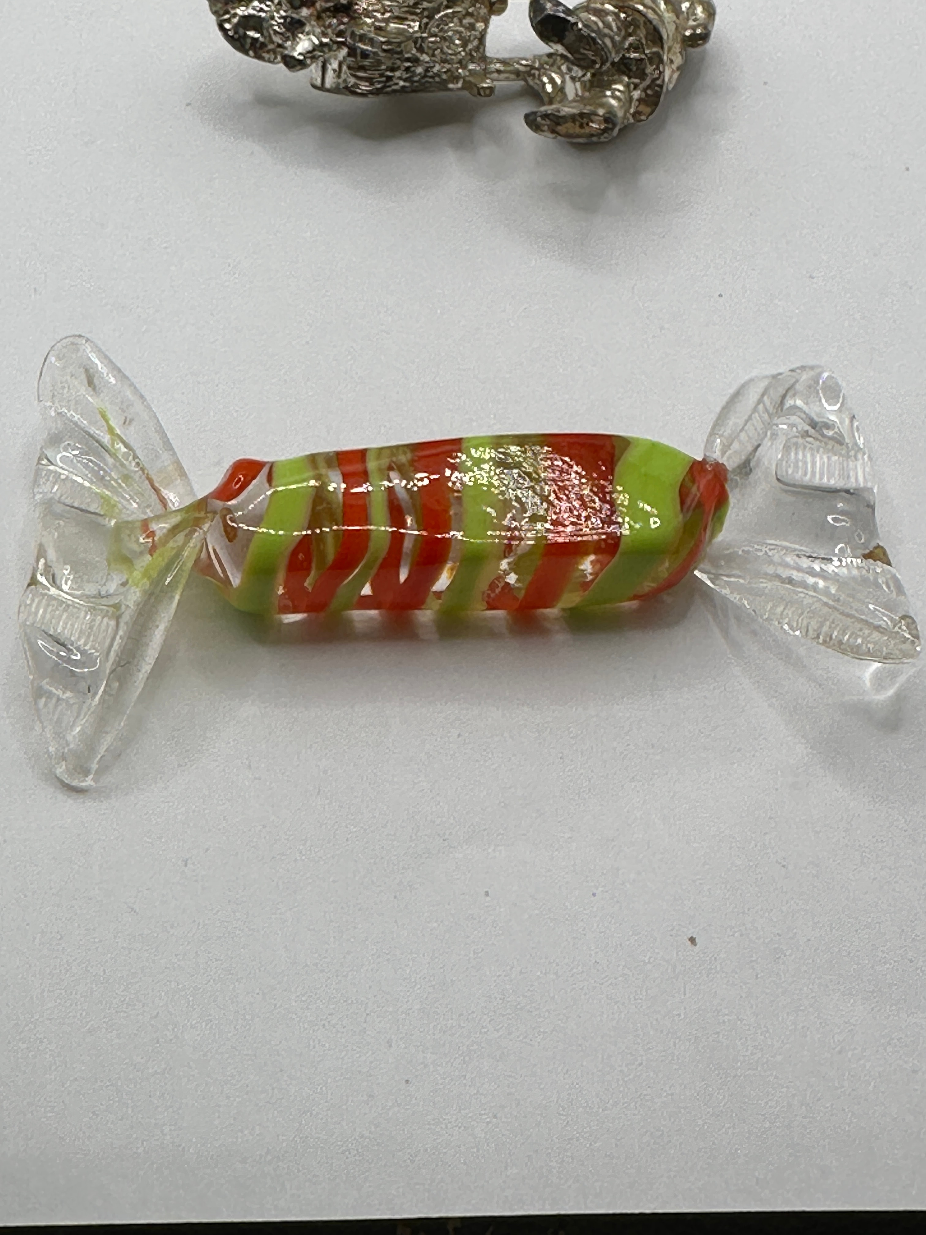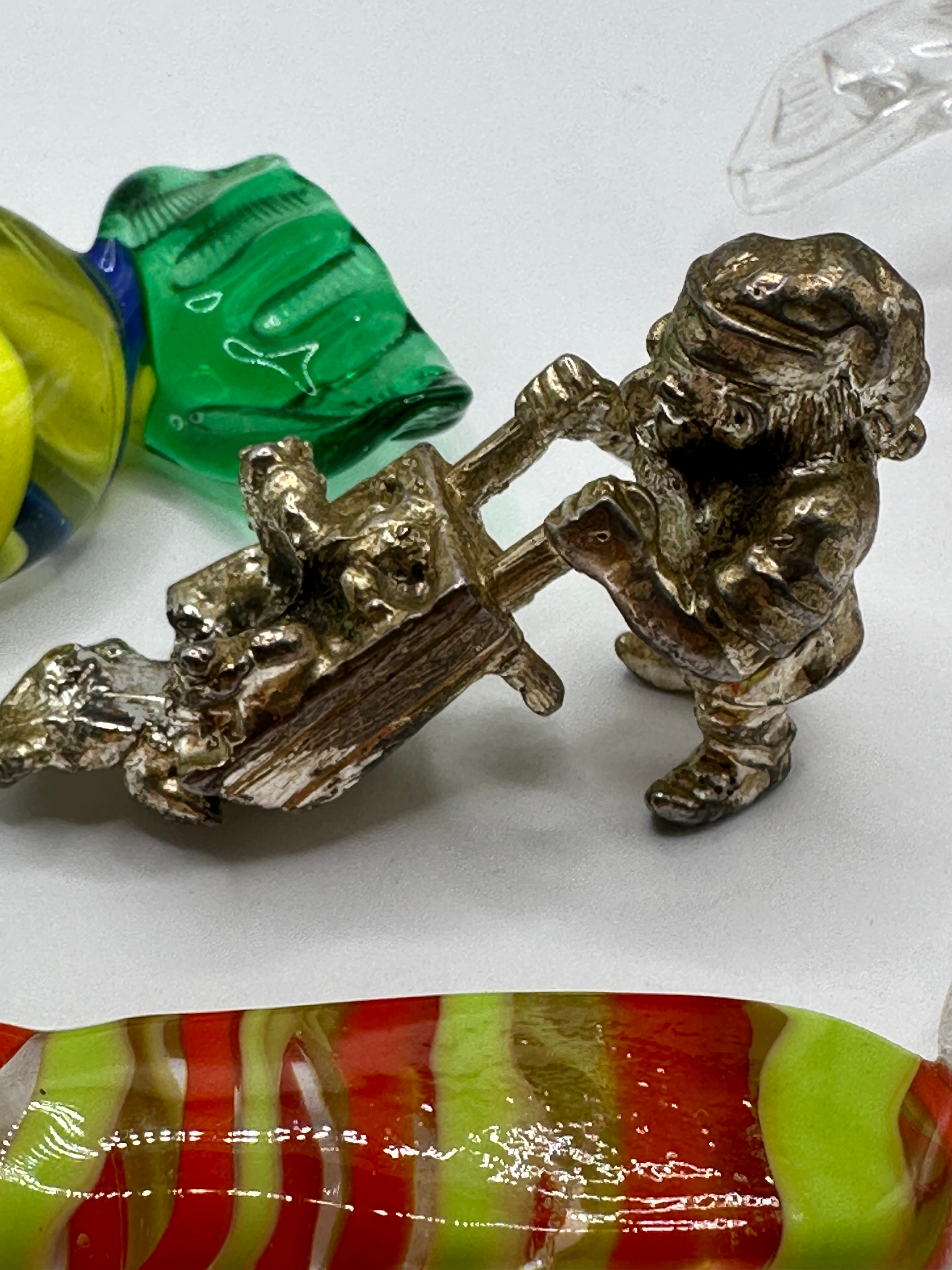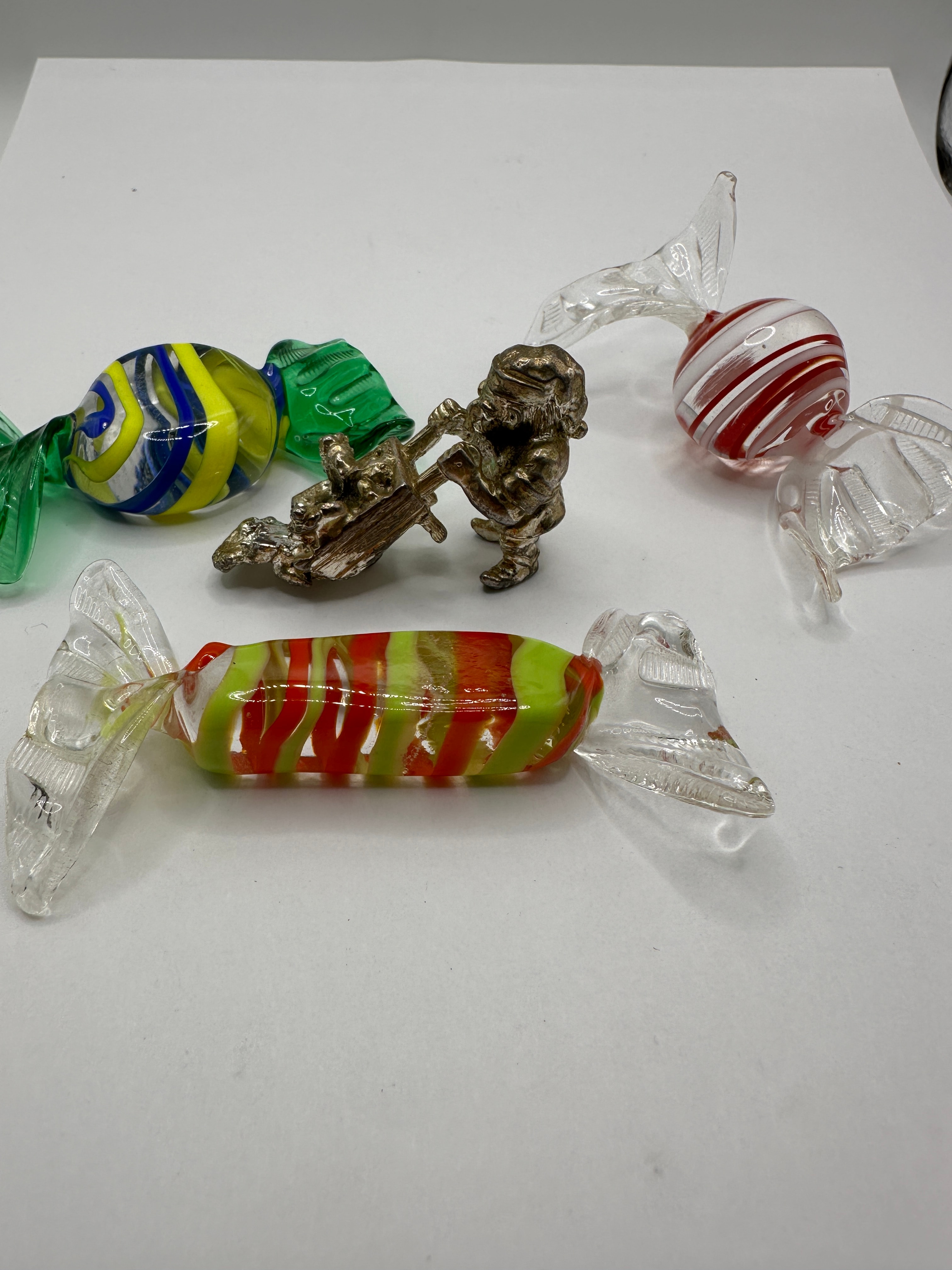 A group comprising three Murano Style art glass candies and one figural metal sculpture. The blown glass candies feature internal spiraling designs: one spherical with red and white stripes, another spherical with yellow, blue, and green stripes, and an oblong piece with red and lime green stripes, each with clear or colored glass “wrapper” ends. The accompanying metal sculpture depicts a larger standing, bearded figure pushing a smaller figure on a cart, rendered in a tarnished silver-toned metal. No visible text or markings are apparent on any of the items.