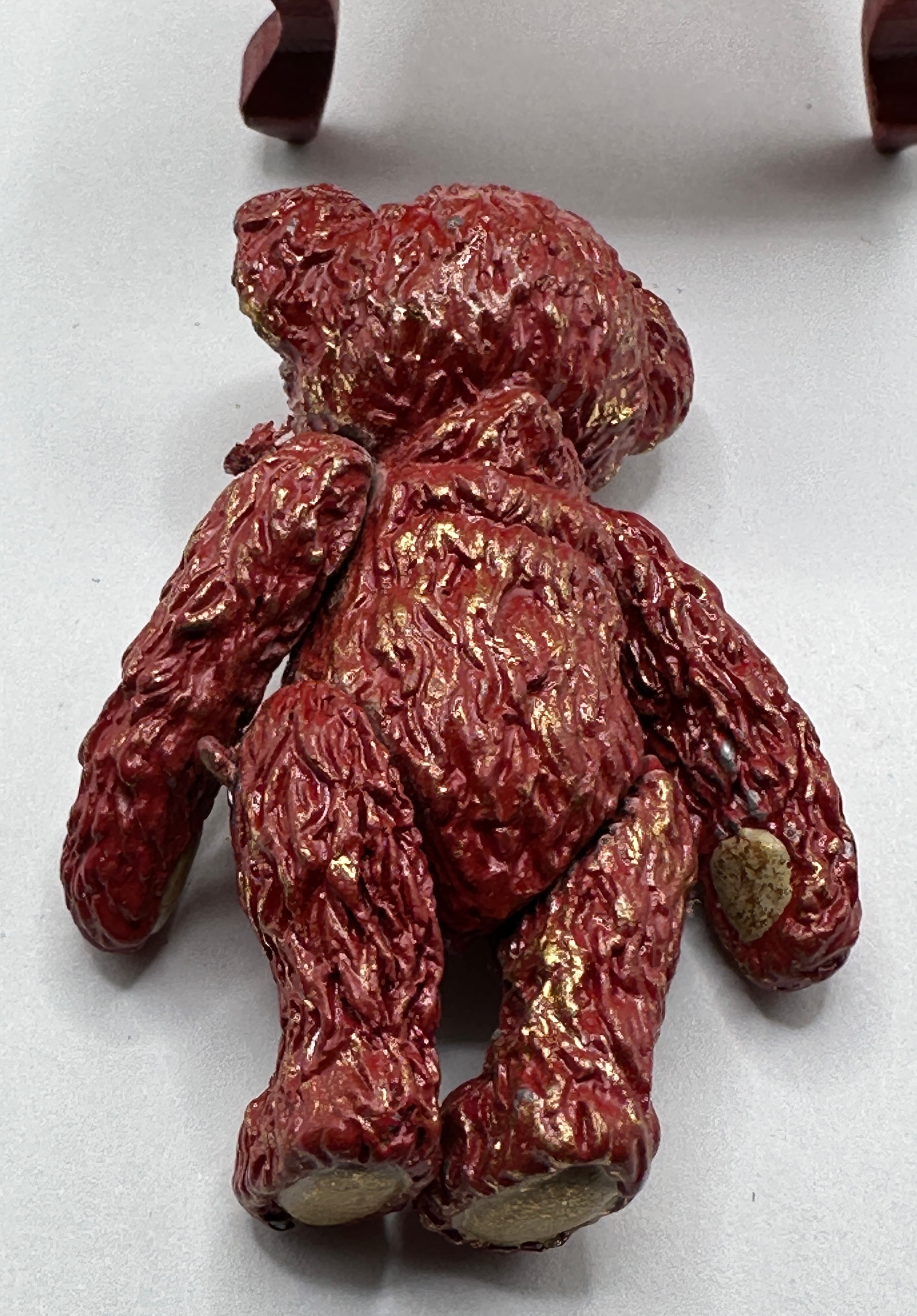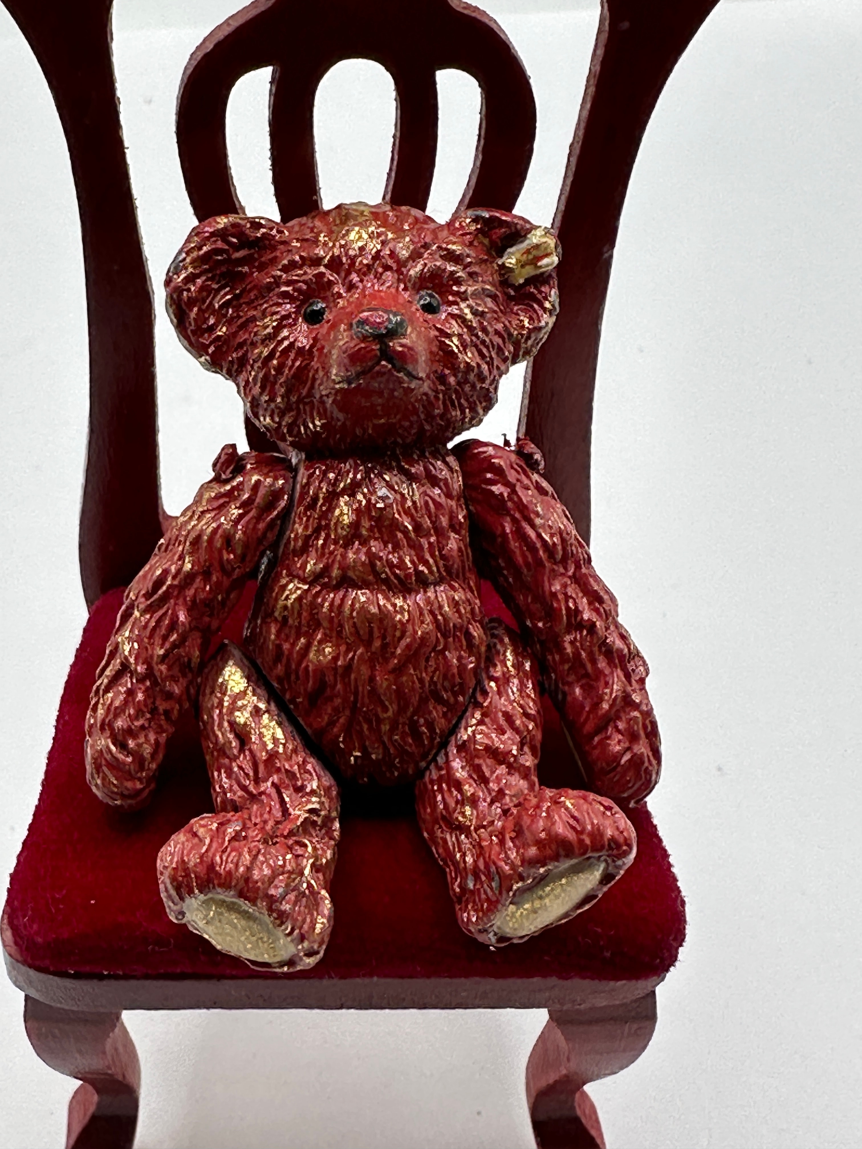 A Steiff Dew Drop Rose Porcelain Bear seated on a miniature wooden chair. The bear, crafted from porcelain, features a heavily textured surface painted in a dark red or burgundy hue with gold accents, and exhibits visible articulation at its limbs. A small, plain gold-colored tag is visible on its left ear, and a small heart-shaped tag, also plain, is attached near its rear left hip. The accompanying chair, styled as a miniature Queen Anne or Chippendale type, is constructed from dark red-stained or painted wood, featuring a carved shell motif on the crest rail, a pierced splat, and cabriole-style front legs, with a rectangular seat upholstered in red velvet-like fabric.