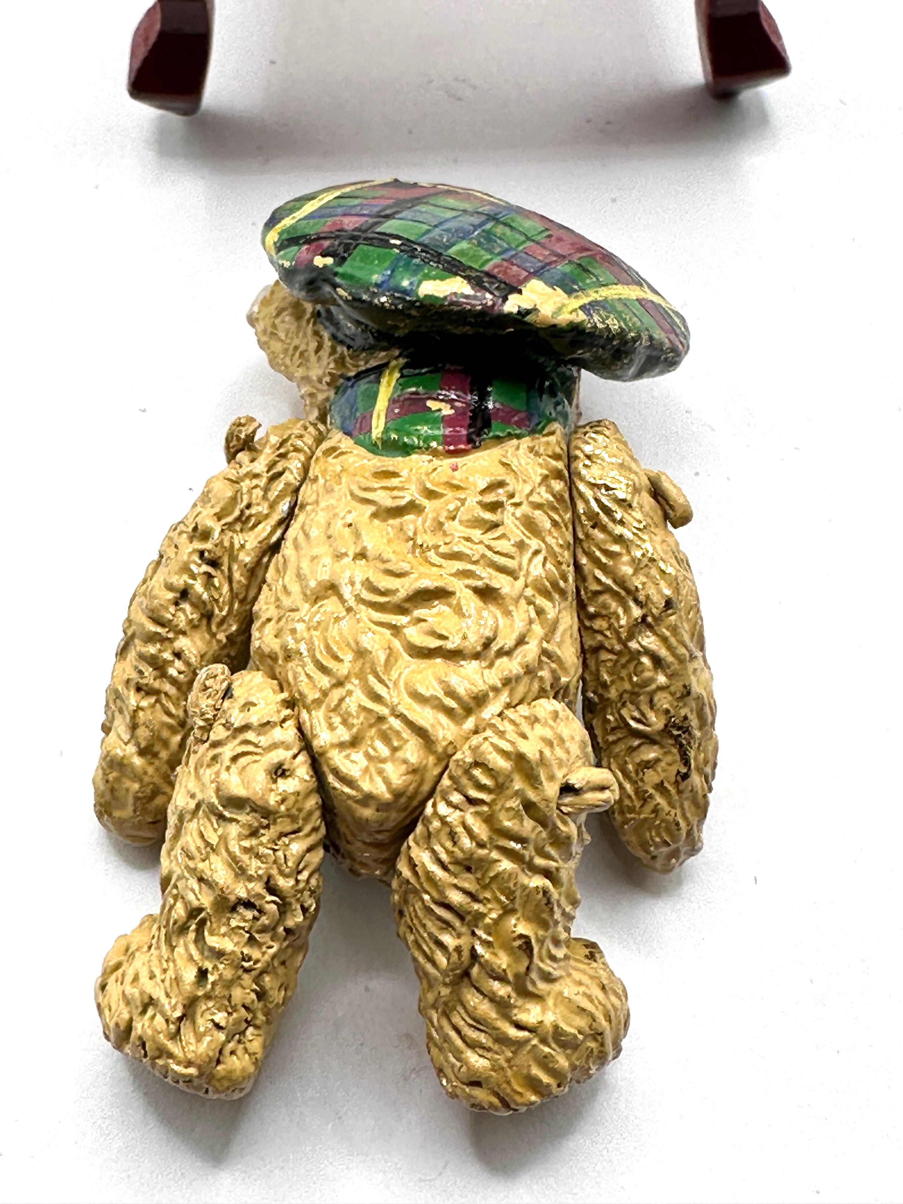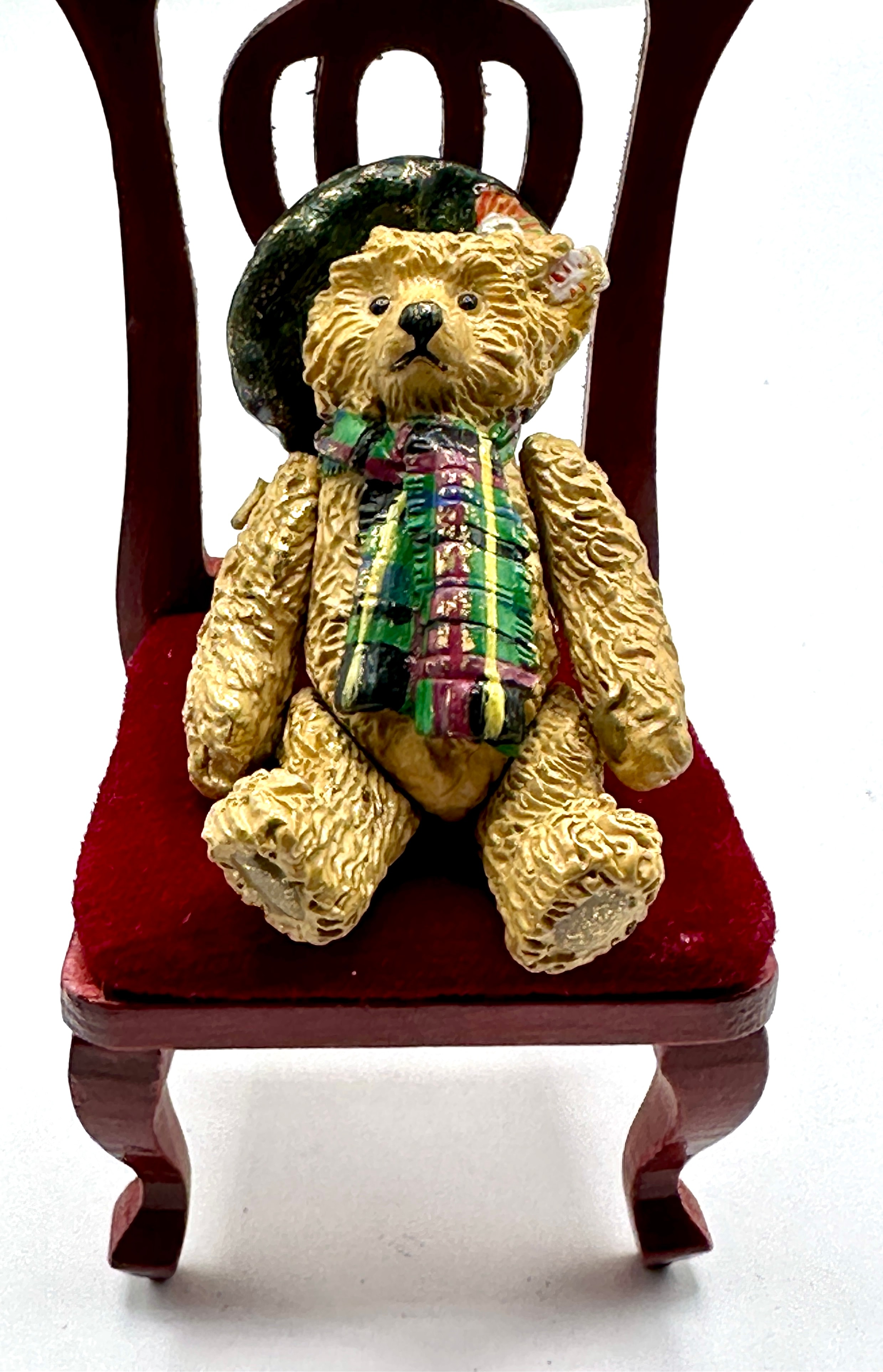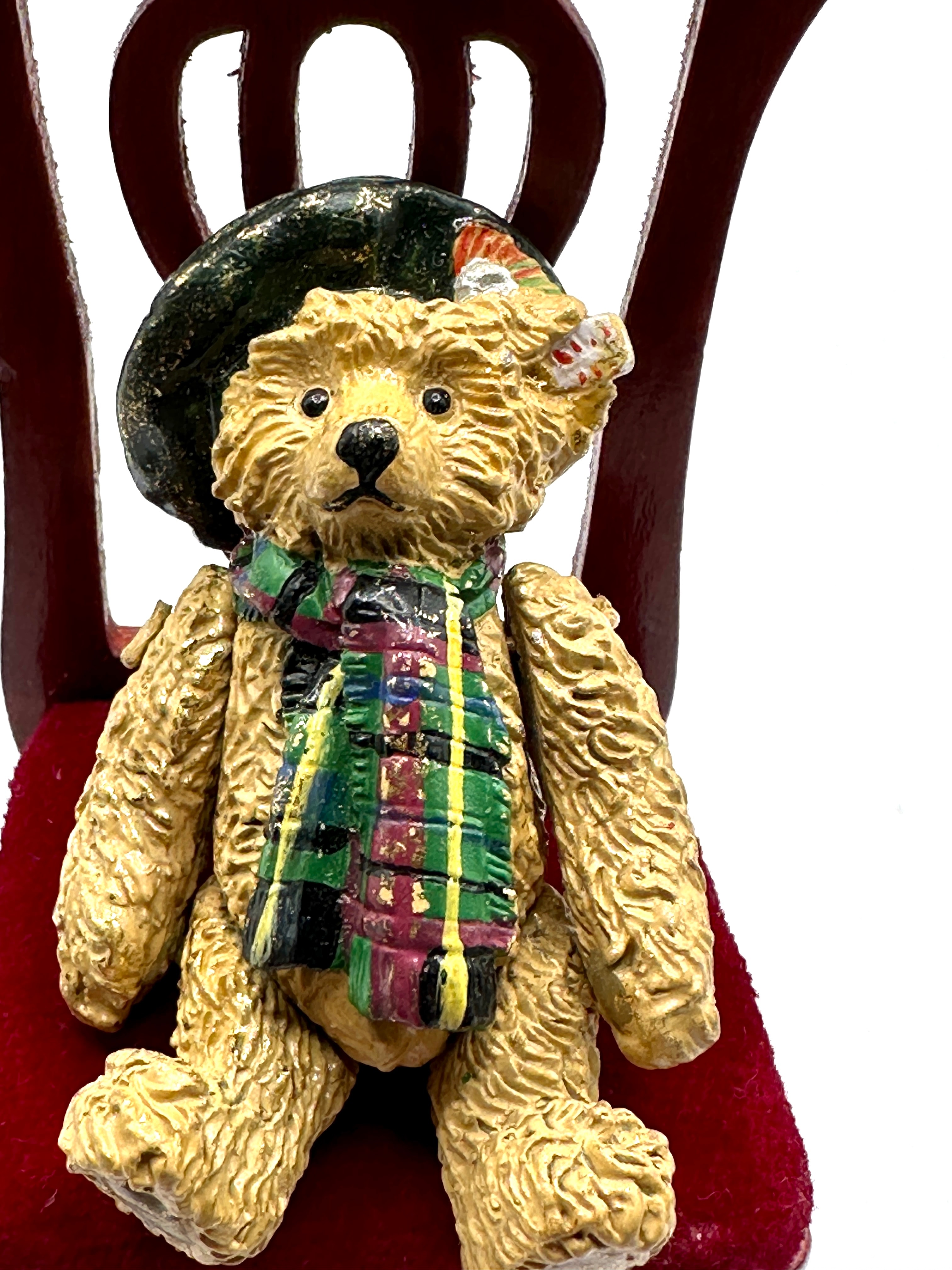 A Steiff miniature bear seated on a miniature wooden chair. The bear, crafted from a painted composite or resin material with a textured ‘fur’ effect, is dressed in a dark green beret with a feather-like accent and a multi-colored tartan scarf, suggesting a Scottish theme. The miniature chair features a dark stained wooden frame and a red velvet-upholstered seat. No discernible markings or text are visible.