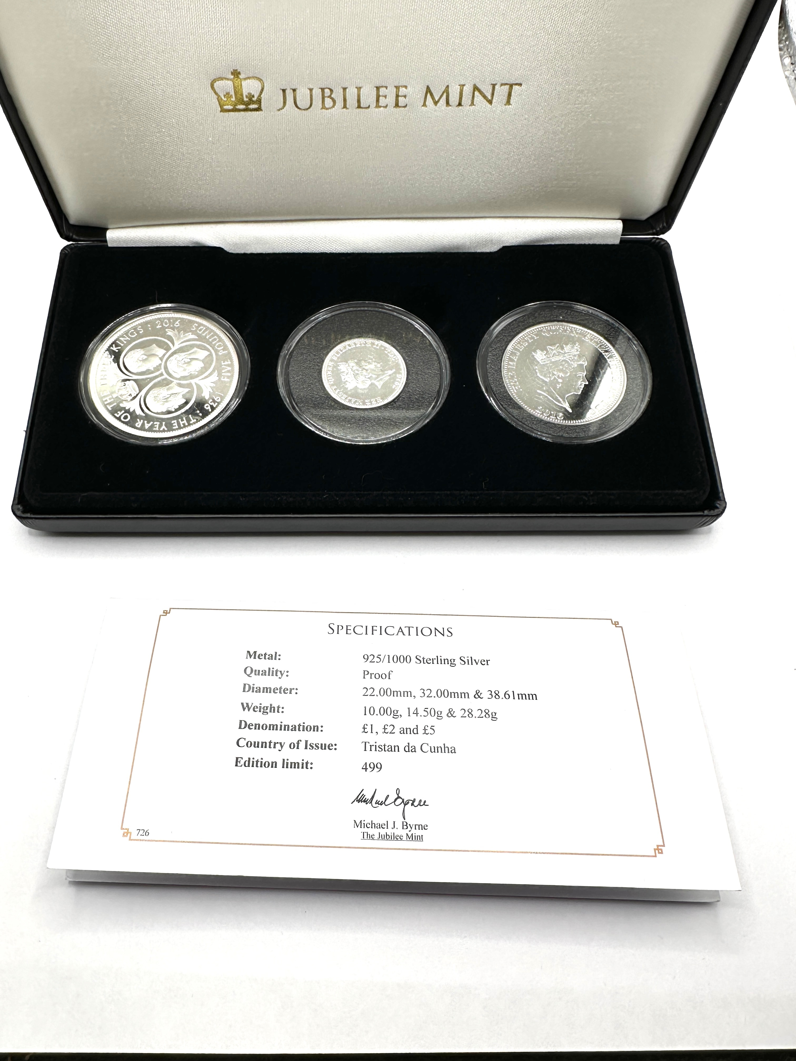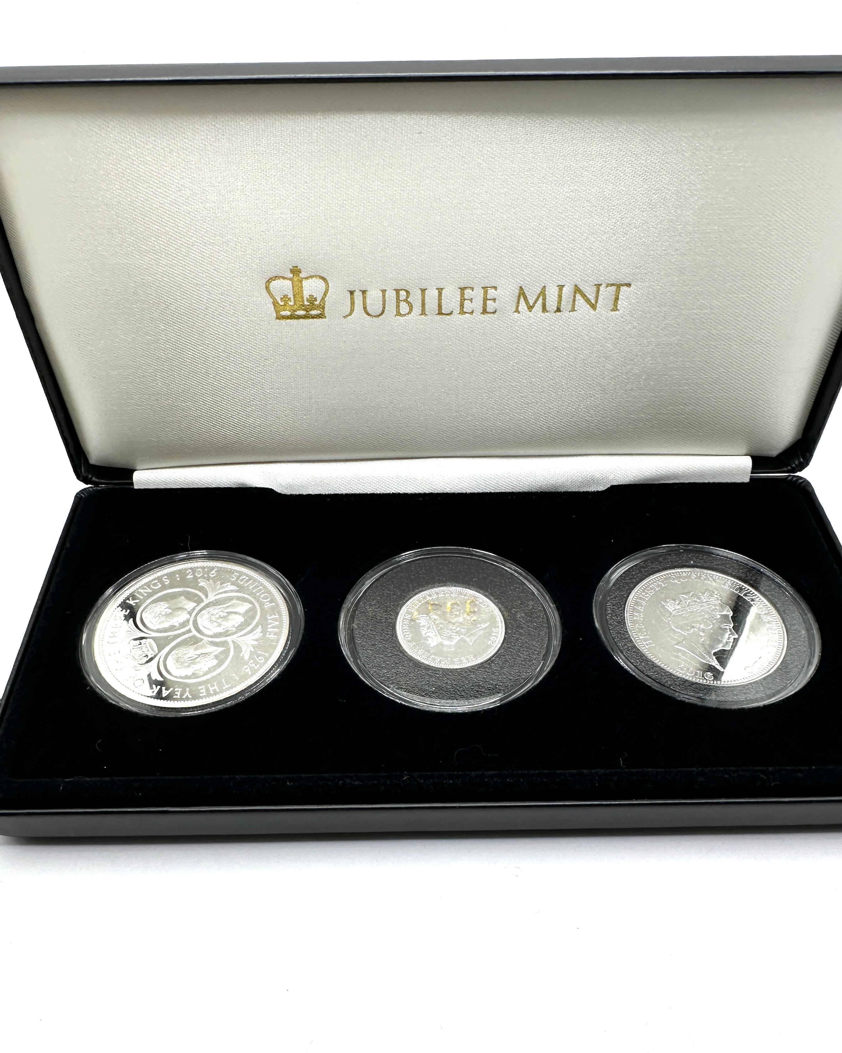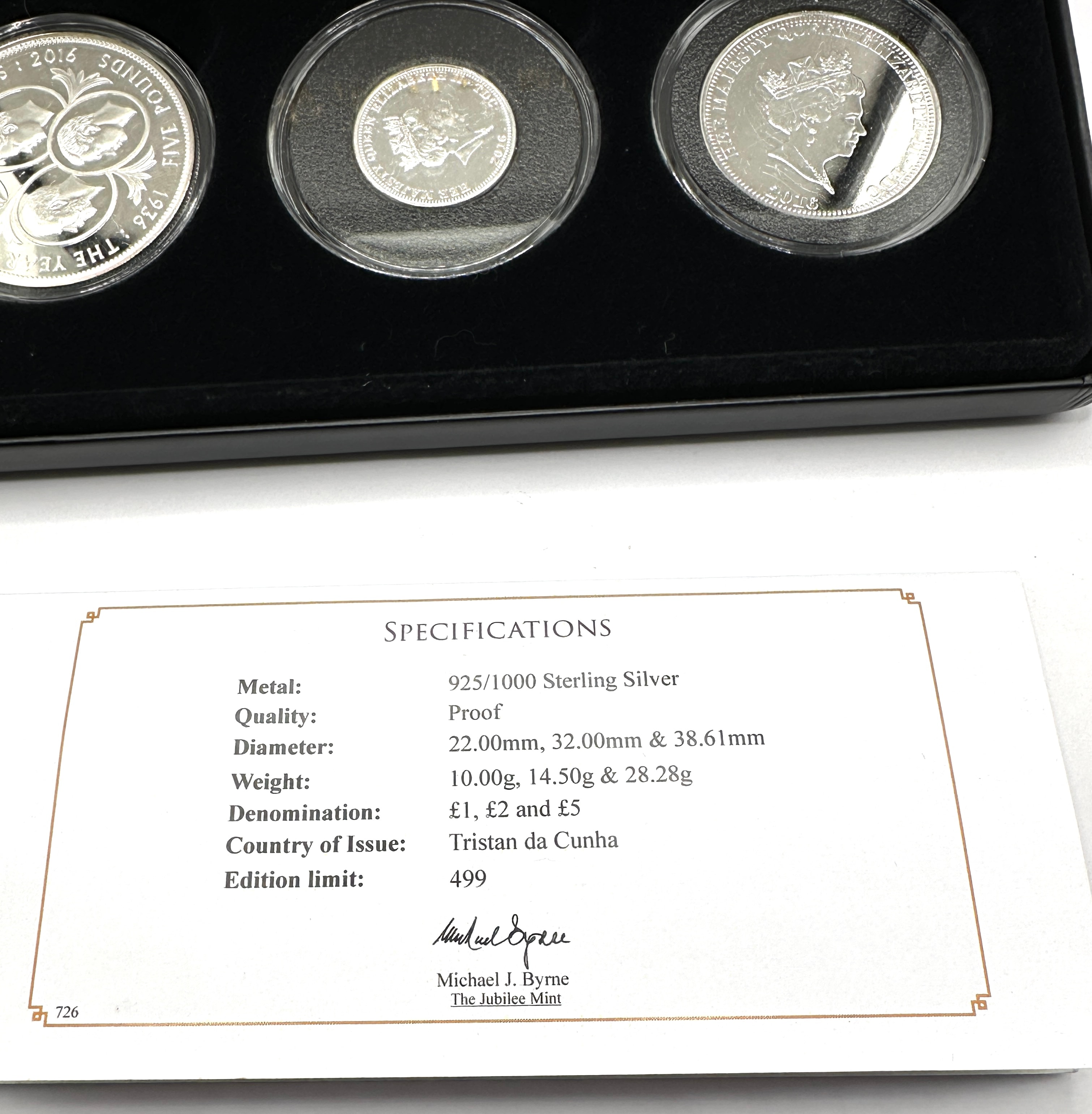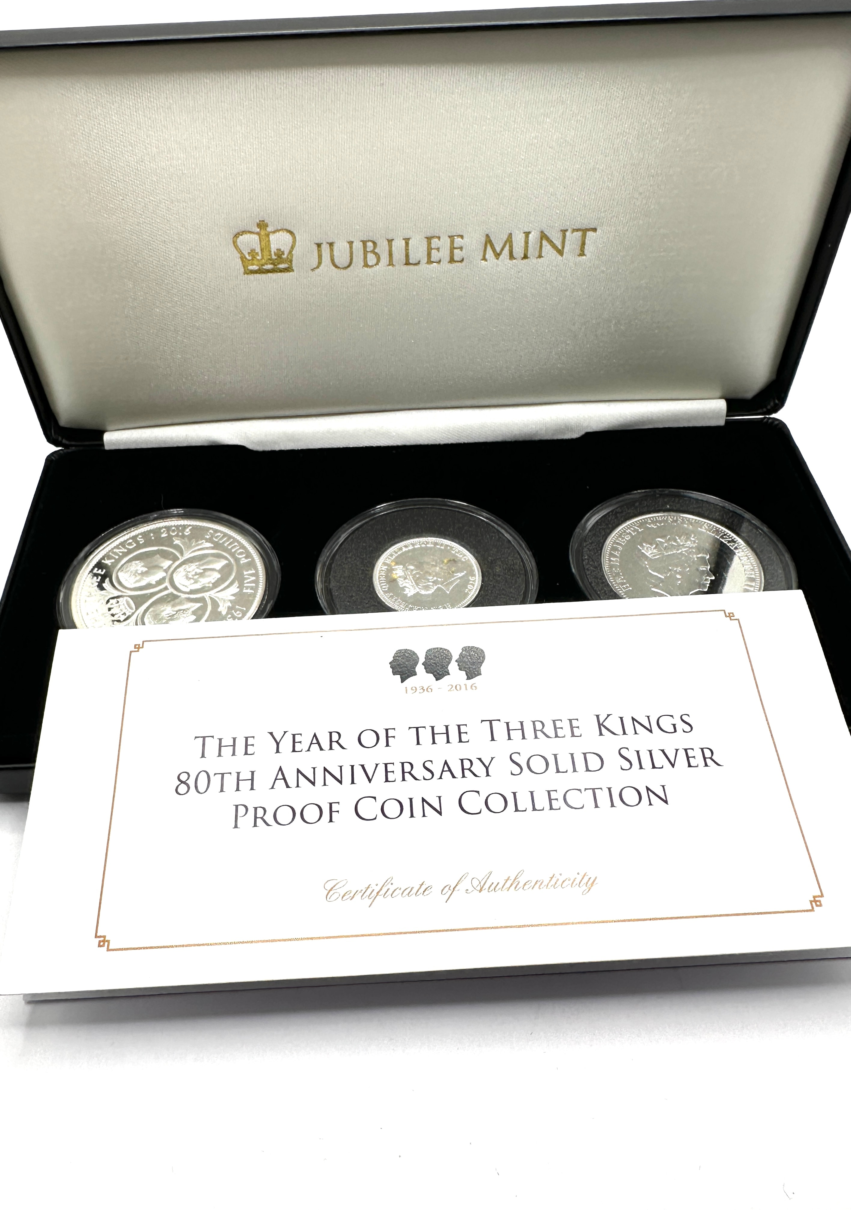 A Jubilee Mint “The Year of the Three Kings 80th Anniversary Solid Silver Proof Coin Collection,” spanning the period 1936-2016. This three-piece collection is presented in a black hinged display box featuring a “JUBILEE MINT” logo and crown motif in gold on its cream satin interior lining. Each of the three coins is encapsulated in clear plastic and set in a black velvet-lined insert. The coins are confirmed to be 925/1000 Sterling Silver with a ‘proof’ finish, issued by Tristan da Cunha. Denominations include £1, £2, and £5. One coin features a portrait of Queen Elizabeth II and the date “2016,” while the largest coin shows a stylized “80” and “THE YEAR OF THE THREE KINGS 1936 2016 FIVE POUNDS.” A “Certificate of Authenticity” details these specifications and an edition limit of 499, bearing the signature of Michael J. Byrne from The Jubilee Mint.