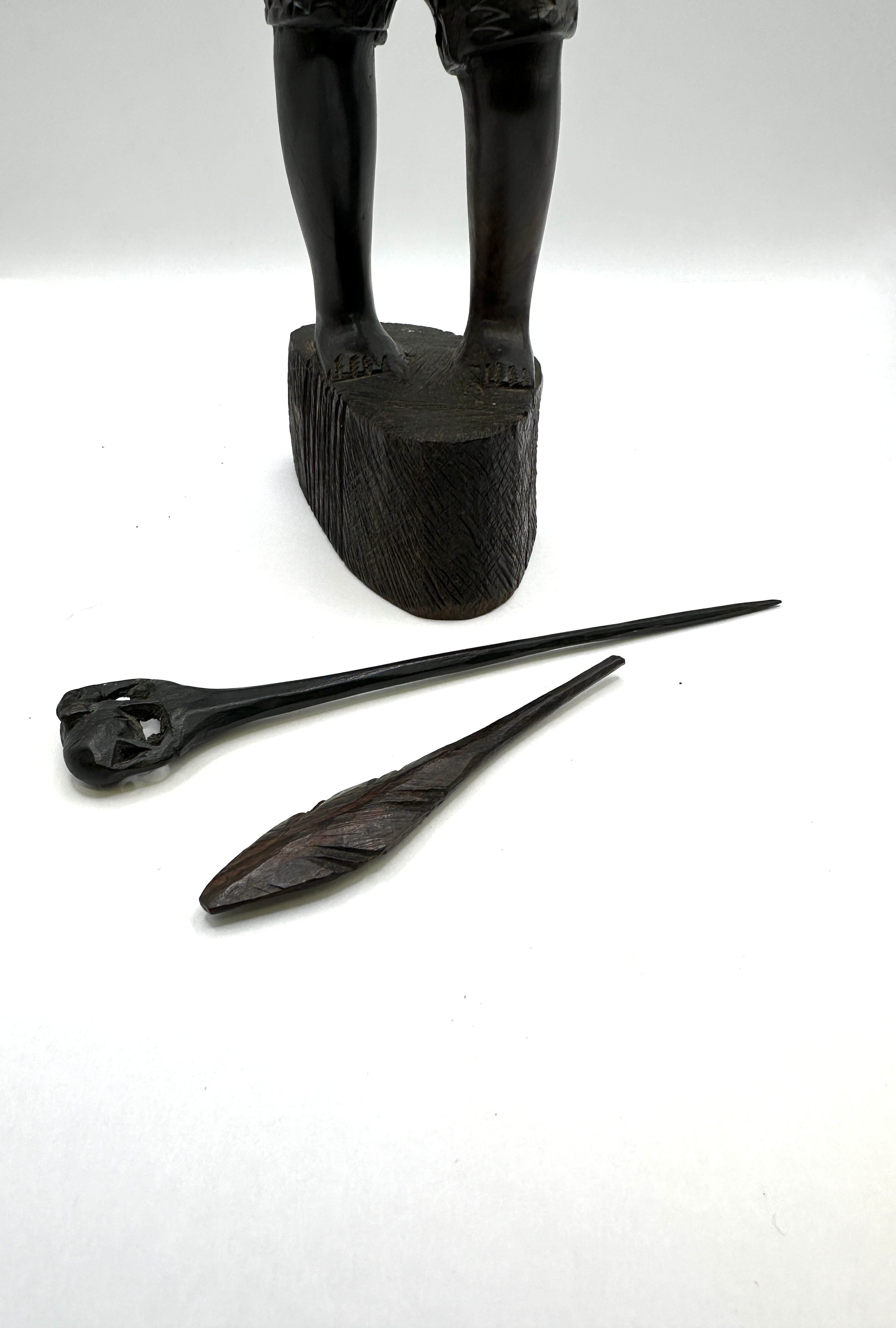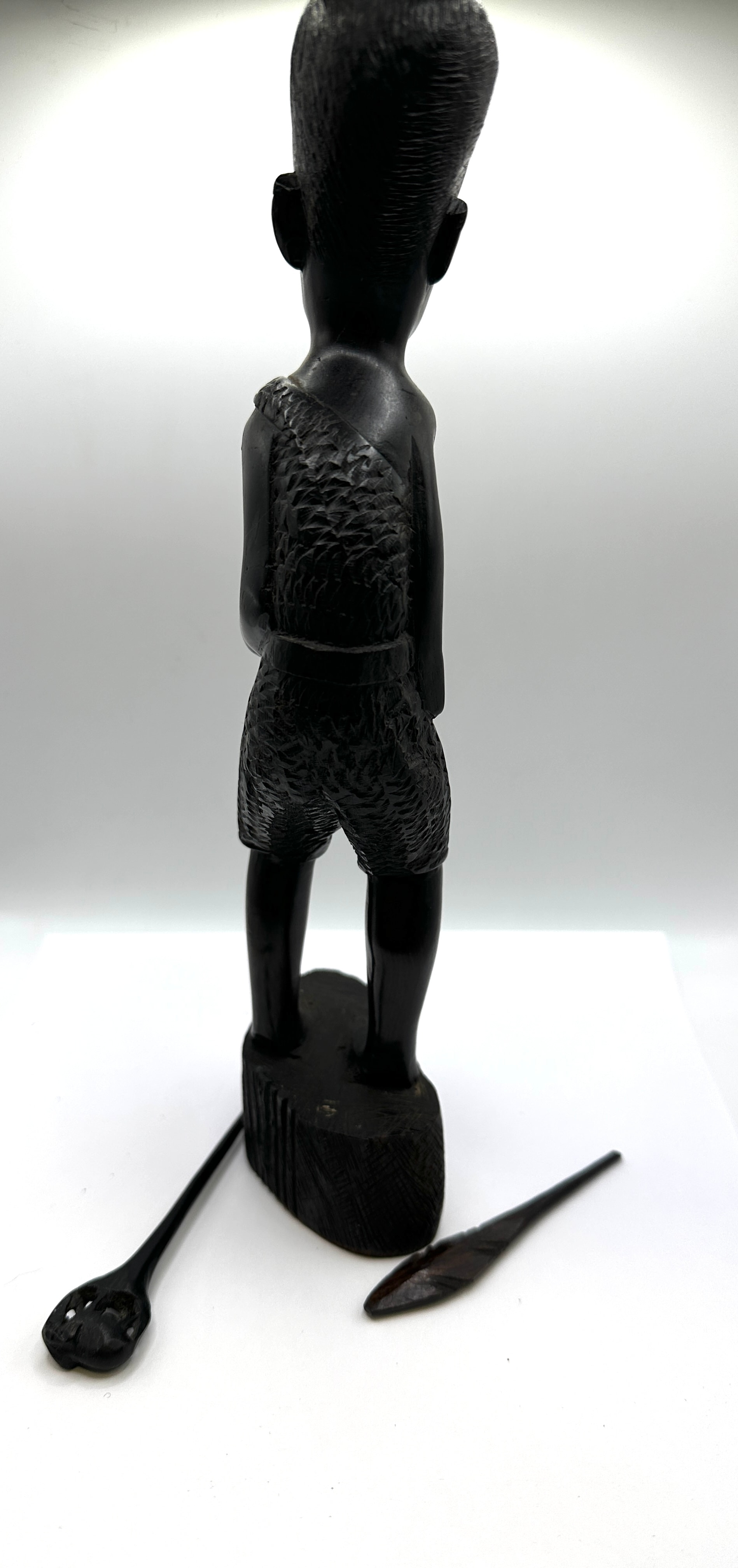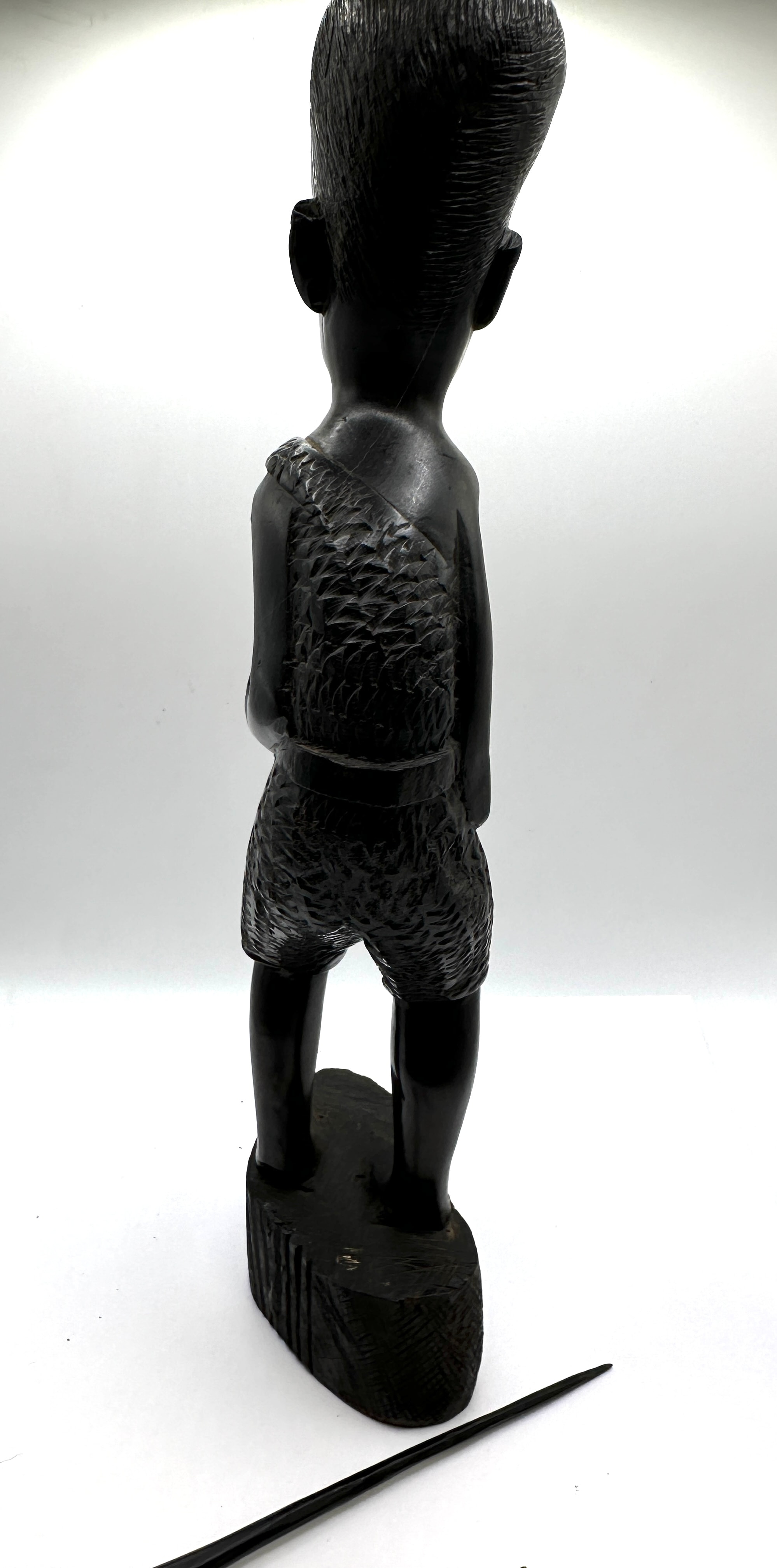 A dark carved wooden figurine depicting a standing male figure in an apparent tribal style. The figure features an elongated head, prominent facial features, and a stern expression. It wears carved patterned shorts and a sash, standing on an integral, roughly textured rectangular base. The piece is designed to hold two separate, dark carved wooden implements: a long staff or spear with a stylized head, and a shorter, leaf-shaped object. A faint “M” or “W” marking is visible on the top surface of the base.