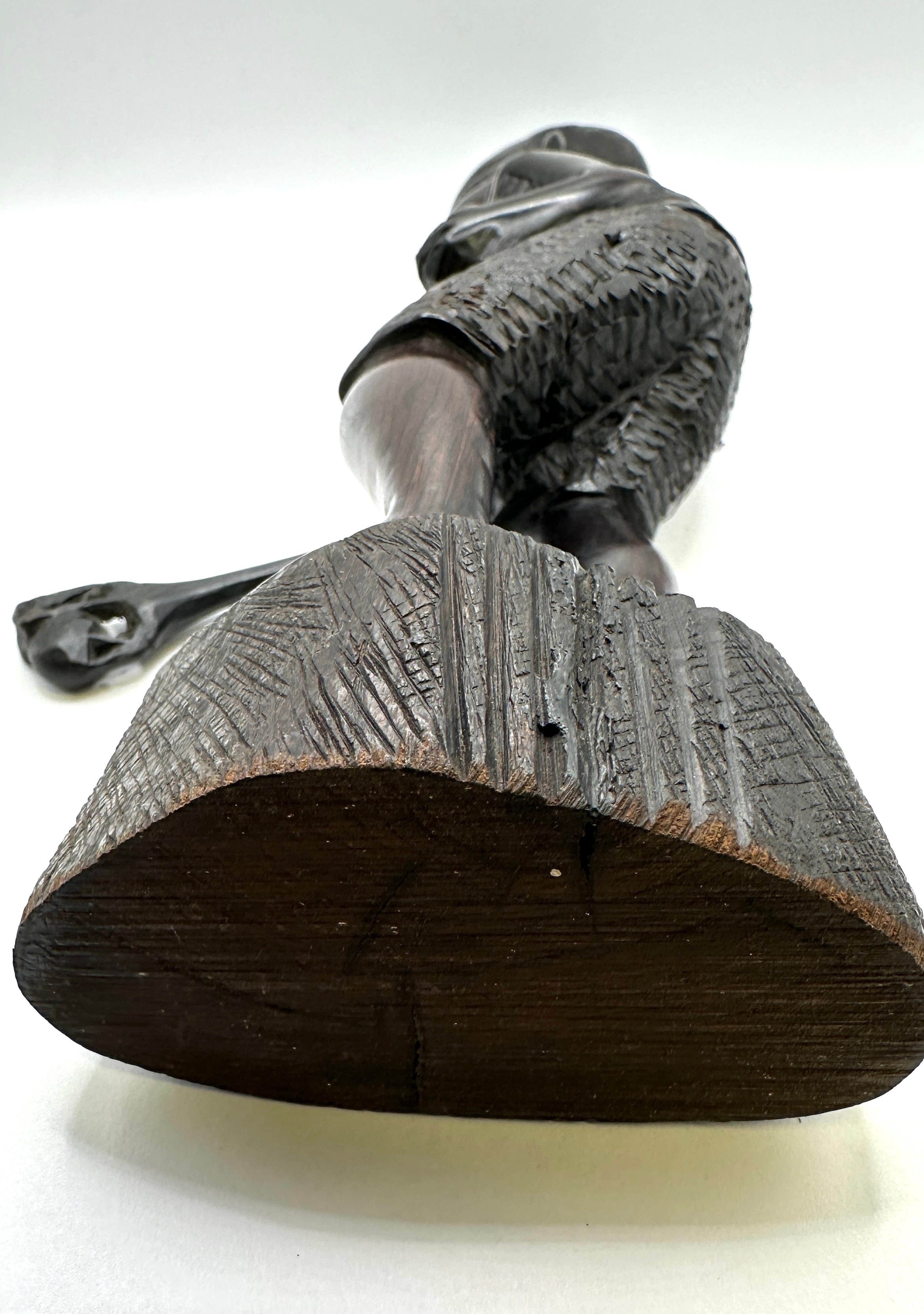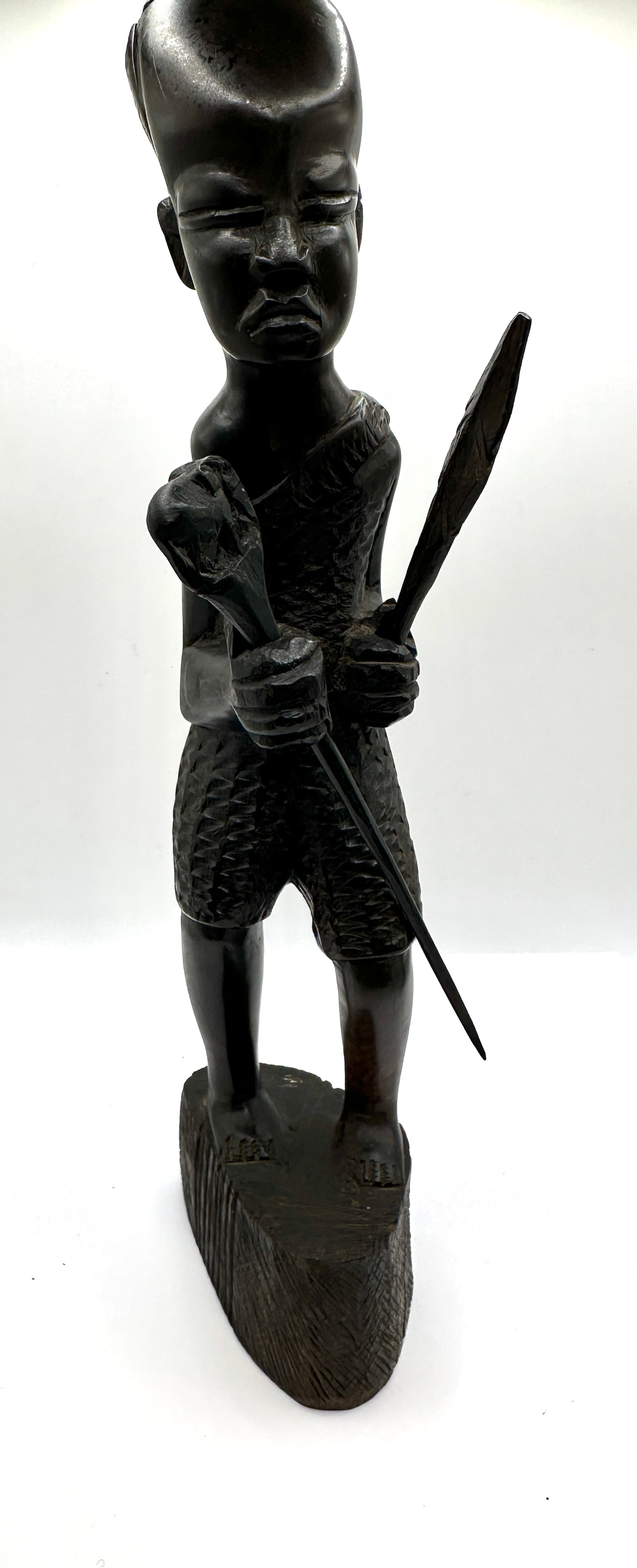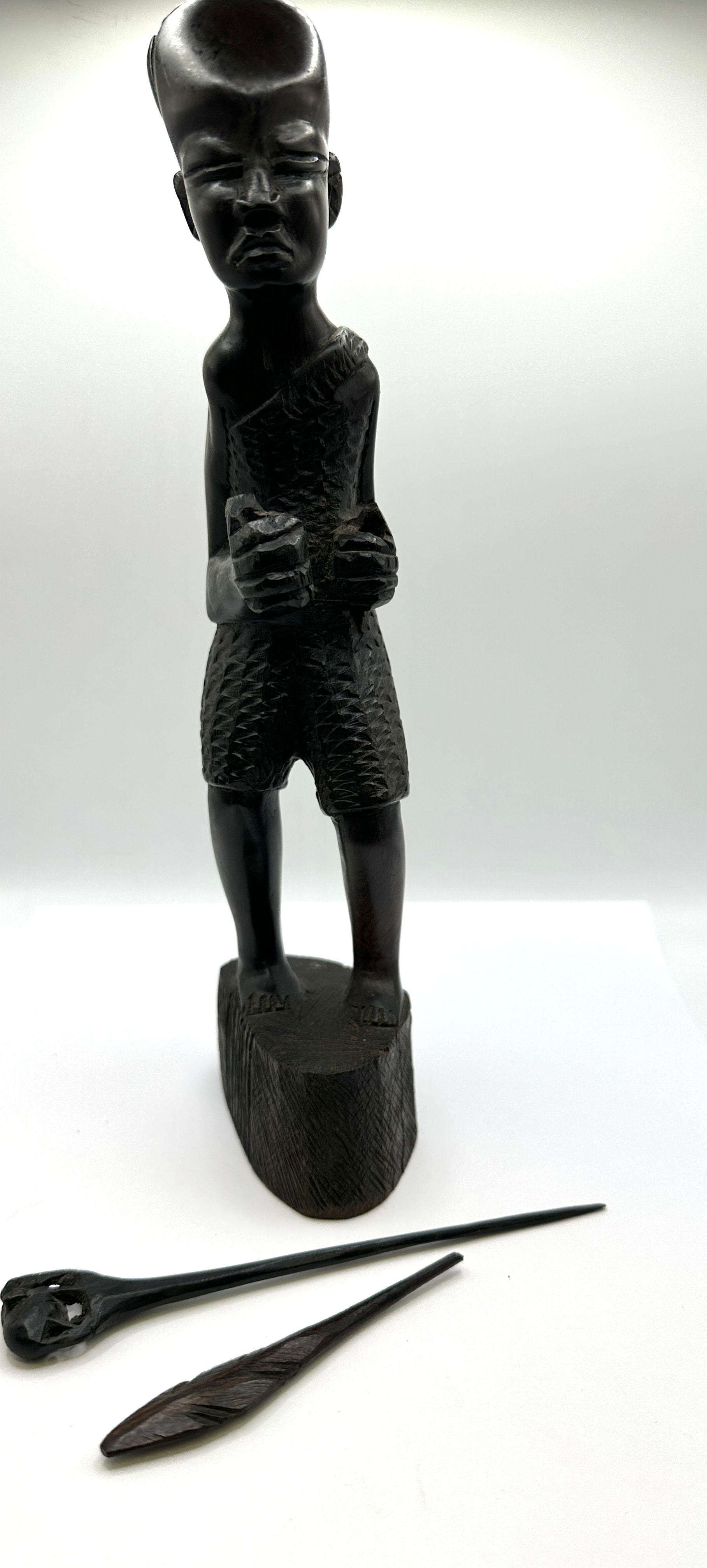 A dark carved wooden figurine depicting a standing male figure in an apparent tribal style. The figure features an elongated head, prominent facial features, and a stern expression. It wears carved patterned shorts and a sash, standing on an integral, roughly textured rectangular base. The piece is designed to hold two separate, dark carved wooden implements: a long staff or spear with a stylized head, and a shorter, leaf-shaped object. A faint “M” or “W” marking is visible on the top surface of the base.