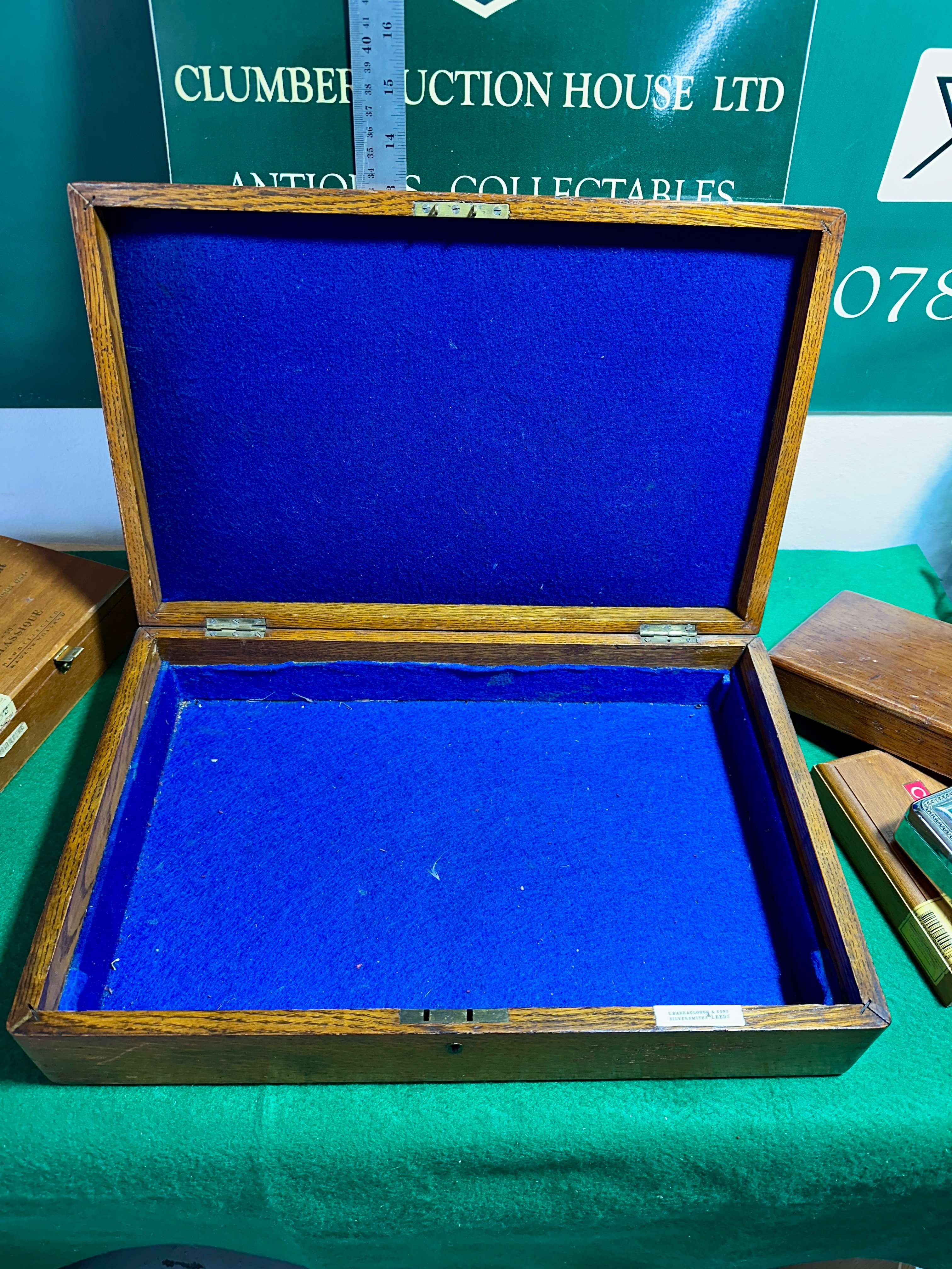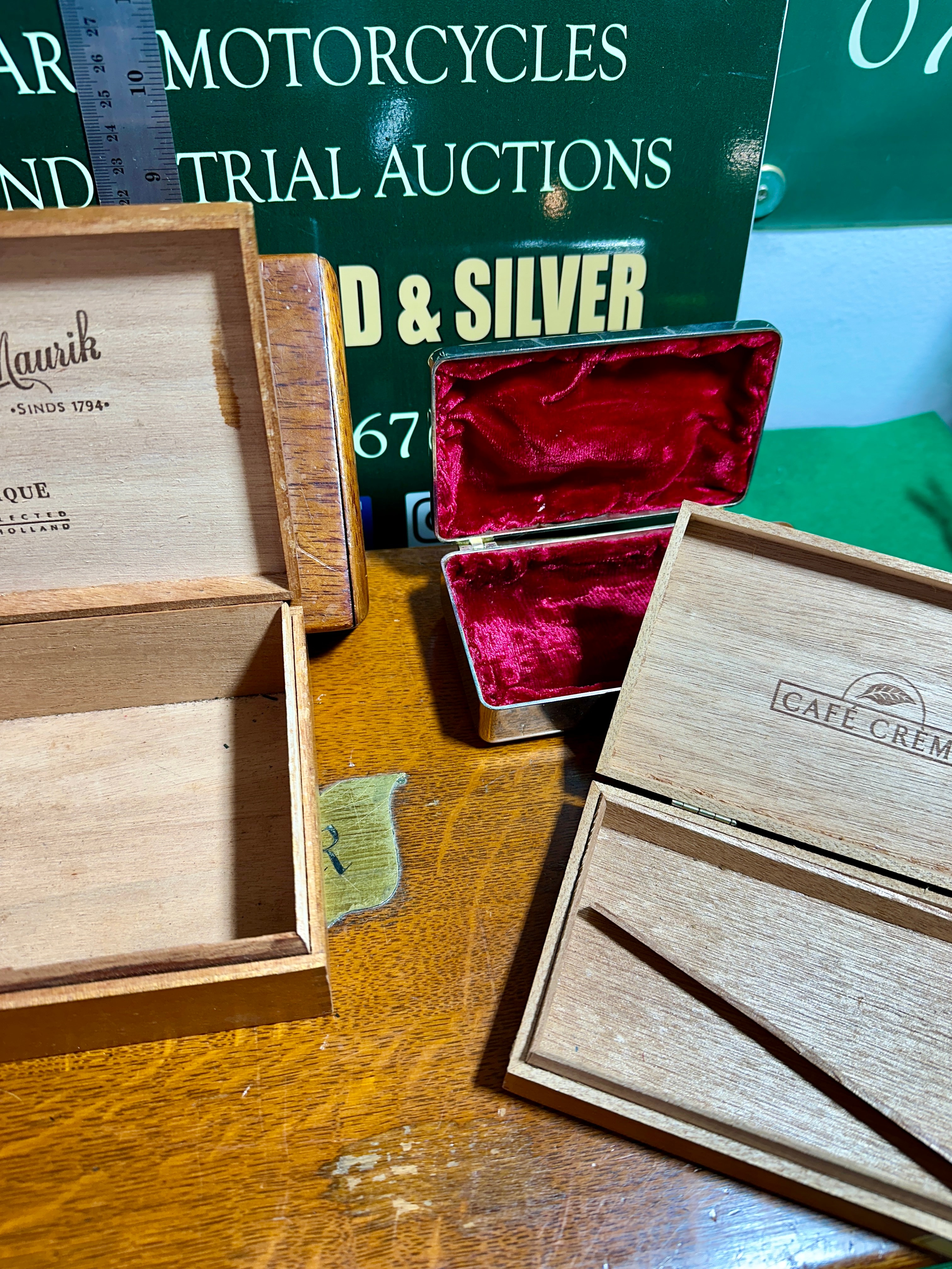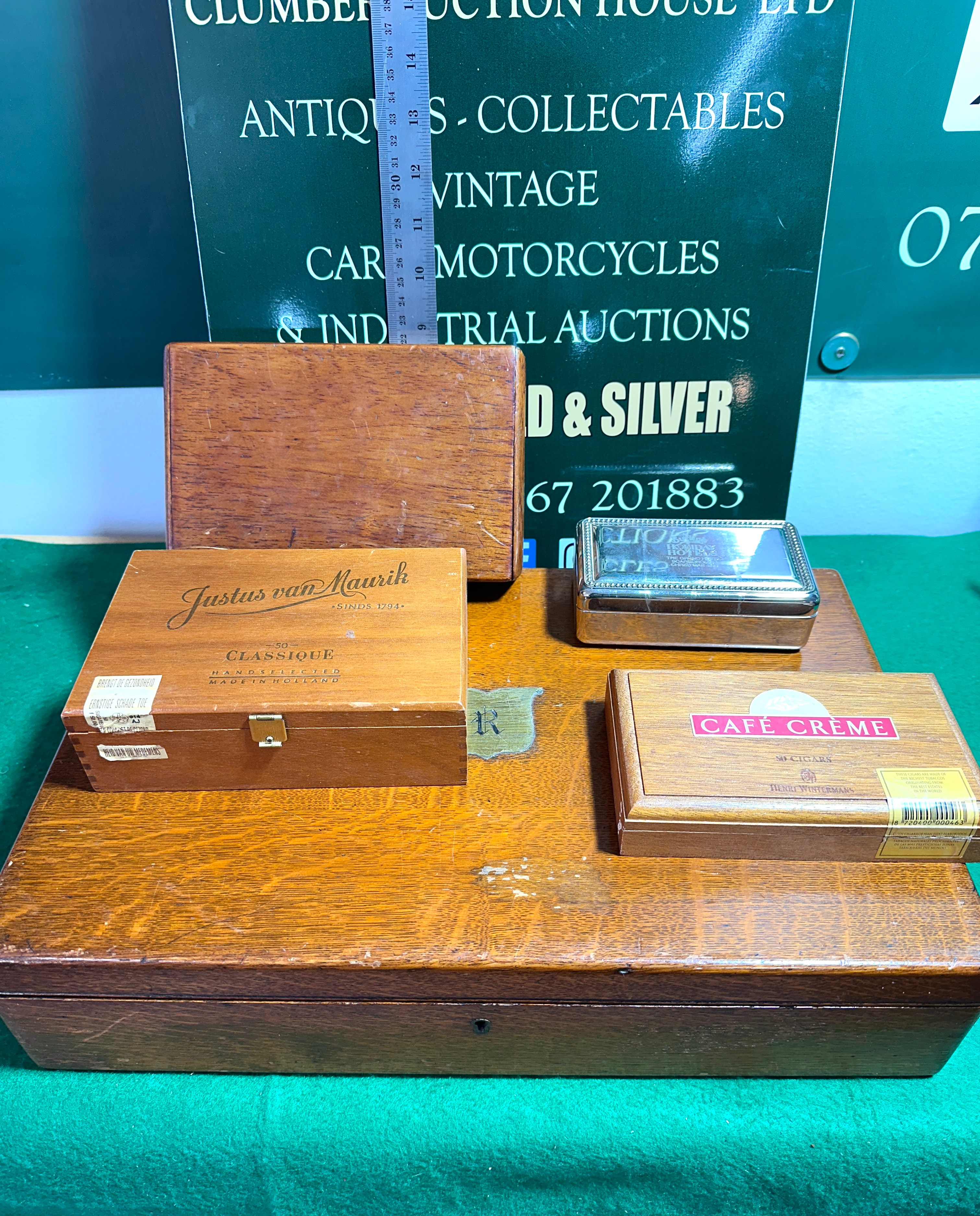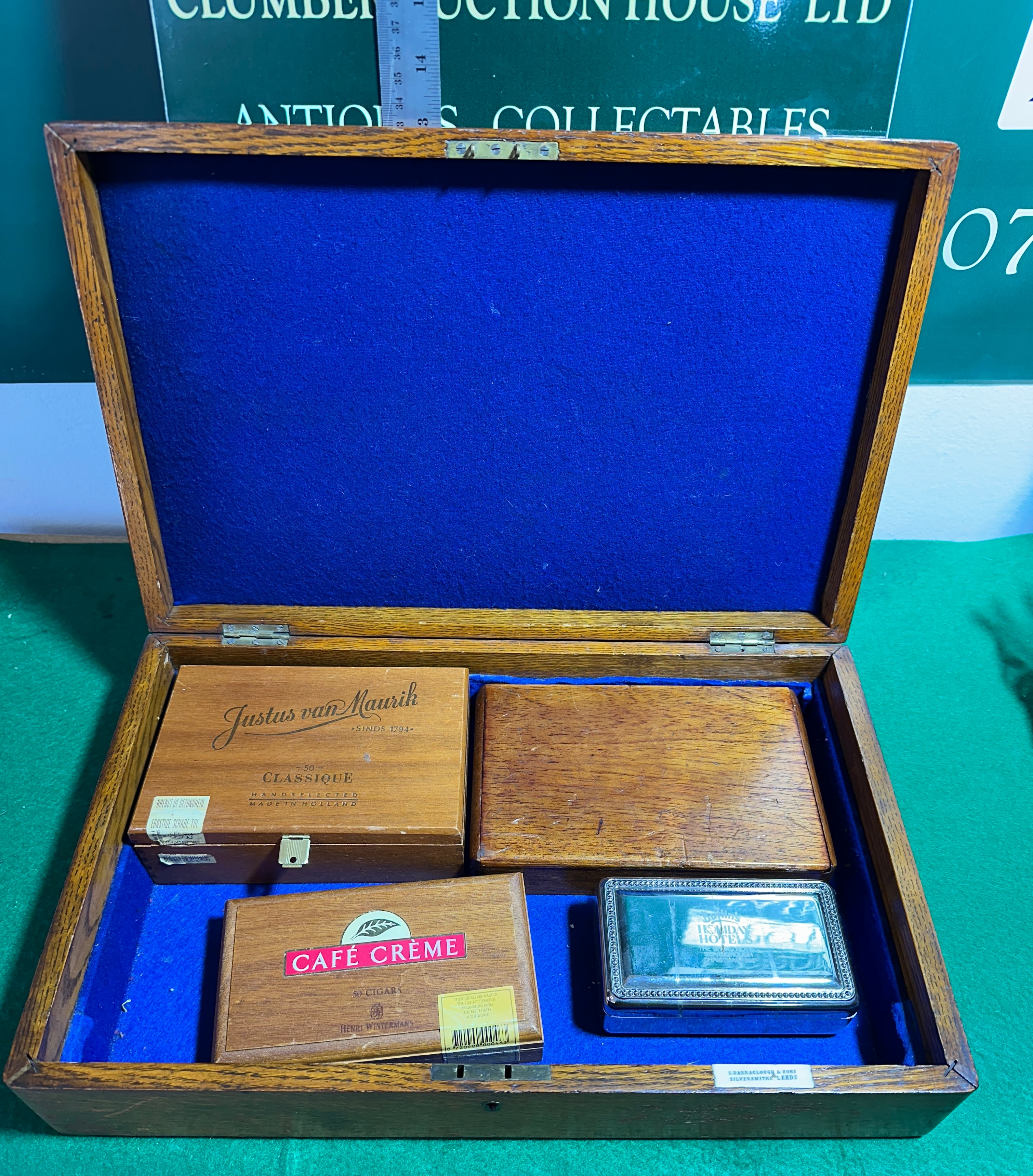 This lot comprises a diverse collection of wooden and one metal box. The primary item is a rectangular wooden box, likely oak, featuring a brass escutcheon with an engraved “K” on its lid and a blue felt-lined interior. Contained within this larger box are three smaller wooden boxes: one marked “Justus van Maurik SINDS 1794 CLASSIQUE HANDGELECTEERD HOLLAND” (Hand-selected), another marked “CAFÉ CRÈME SIGAREN HANDGELECTEERD Henri Wintermans” (Cigars Hand-selected), and one plain wooden box. Also inside the main oak box is a small rectangular metal box with ornate embossed decoration and a red velvet interior.