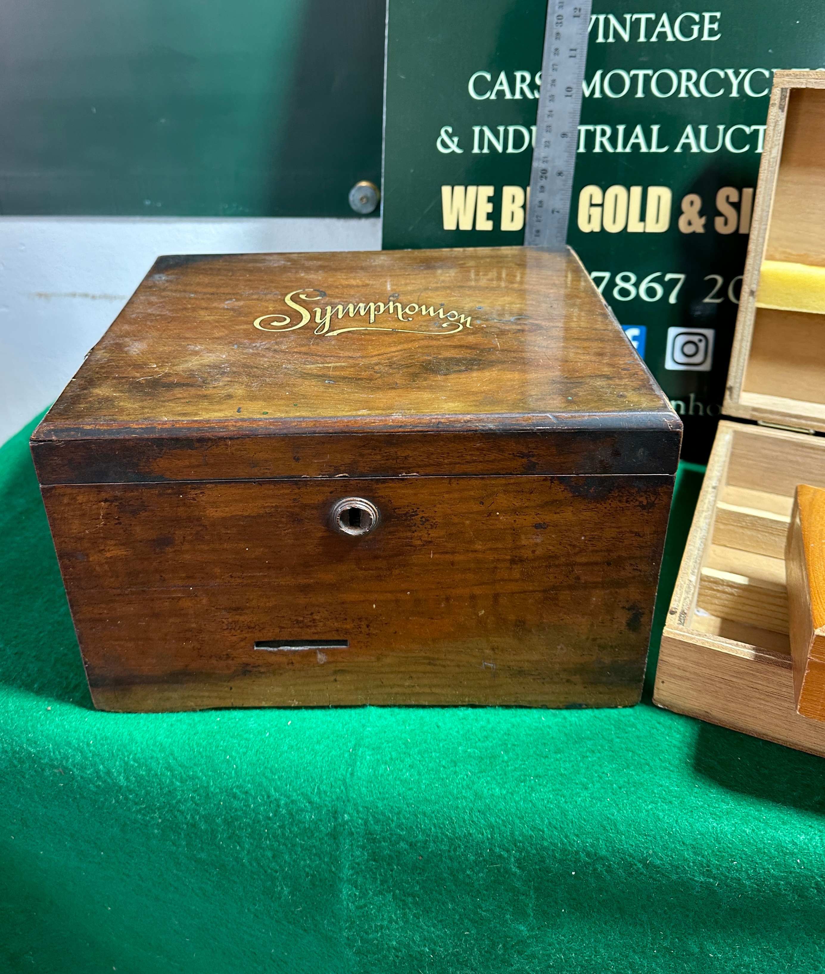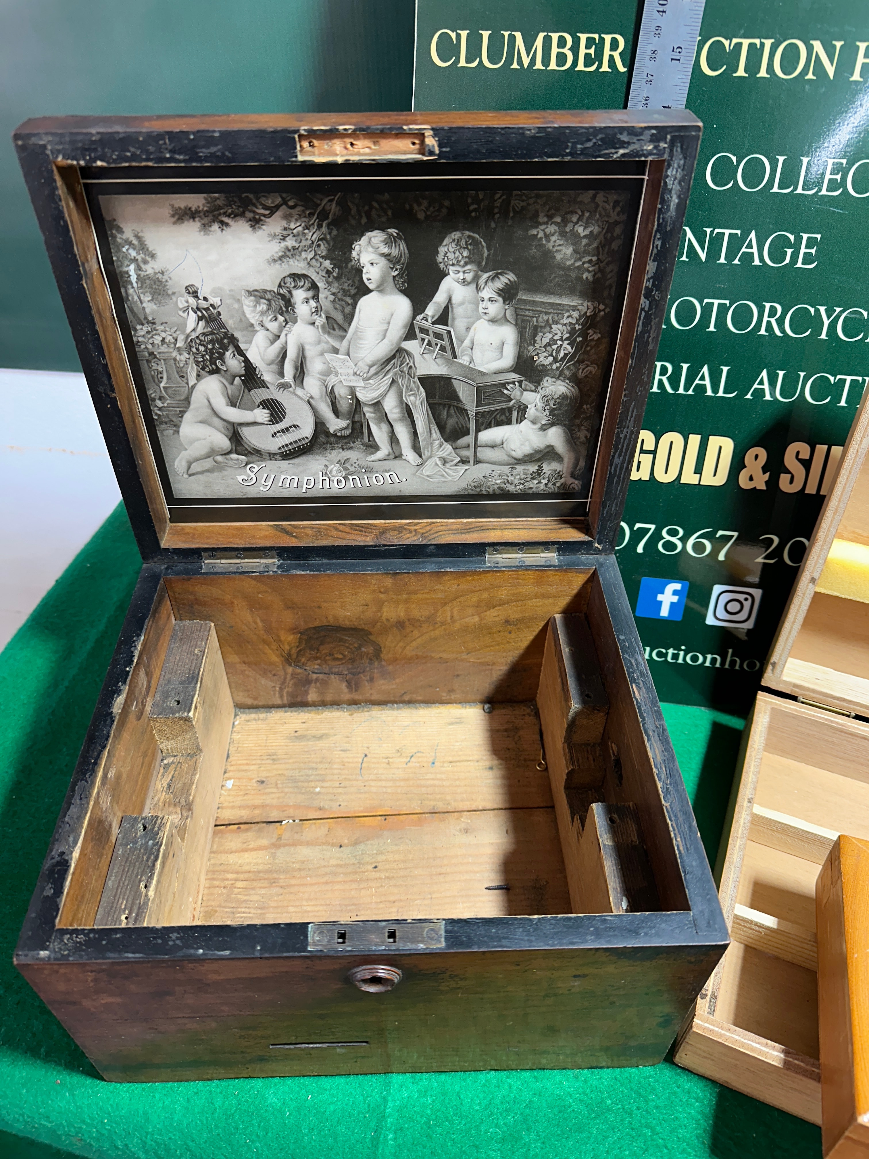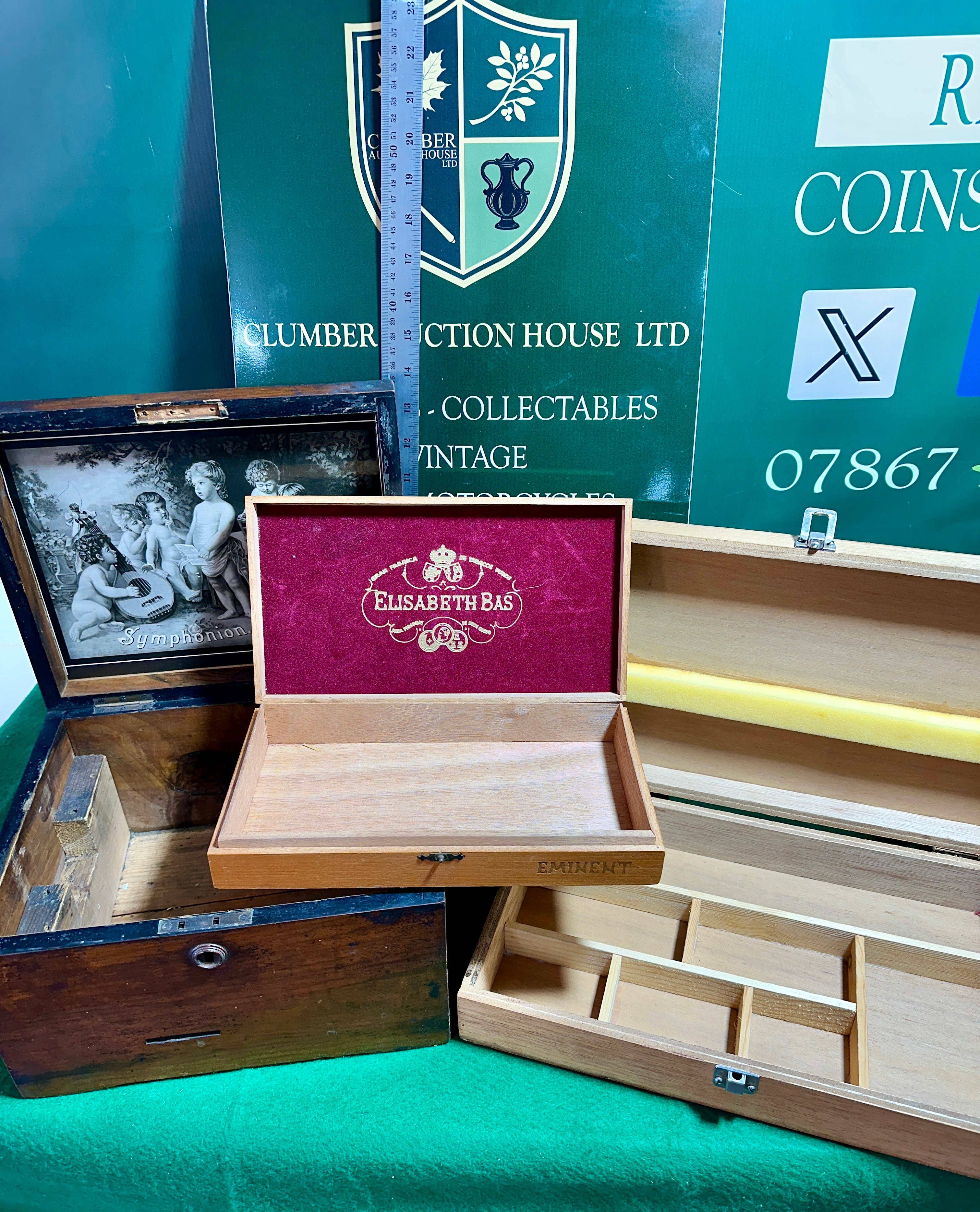 Accompanying these are additional boxes: a dark-stained wooden box, identified as a Symphonion music box casing, with “Symphonion” in gold lettering on the lid and a sepia-toned print of cherubs on the lid’s interior, though it appears to lack its internal mechanism. Further included are a light-colored wooden box with a red velvet-lined lid bearing “ELISABETH BAS” and “EMINENT”, and another light-colored wooden box with internal compartments and a yellow foam strip in its lid.