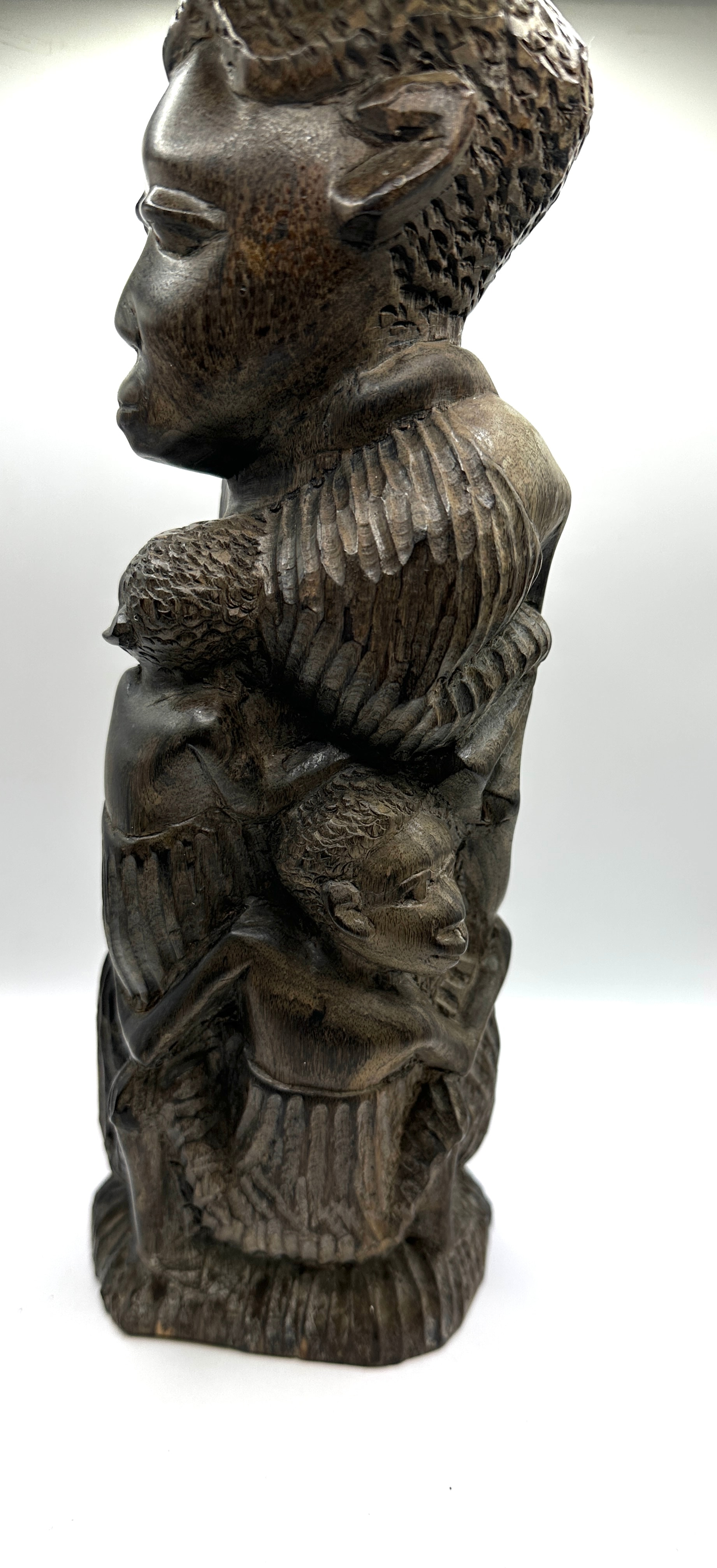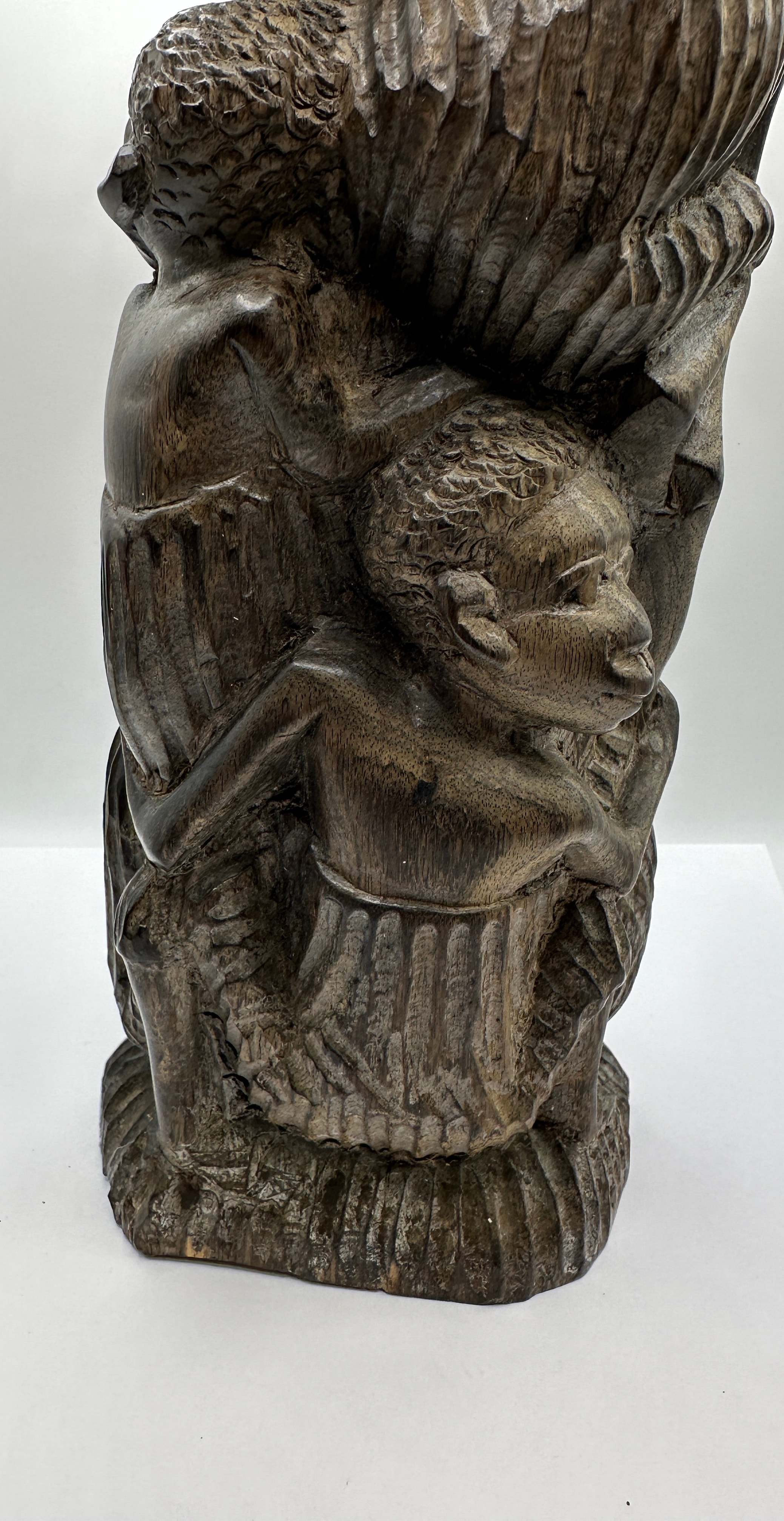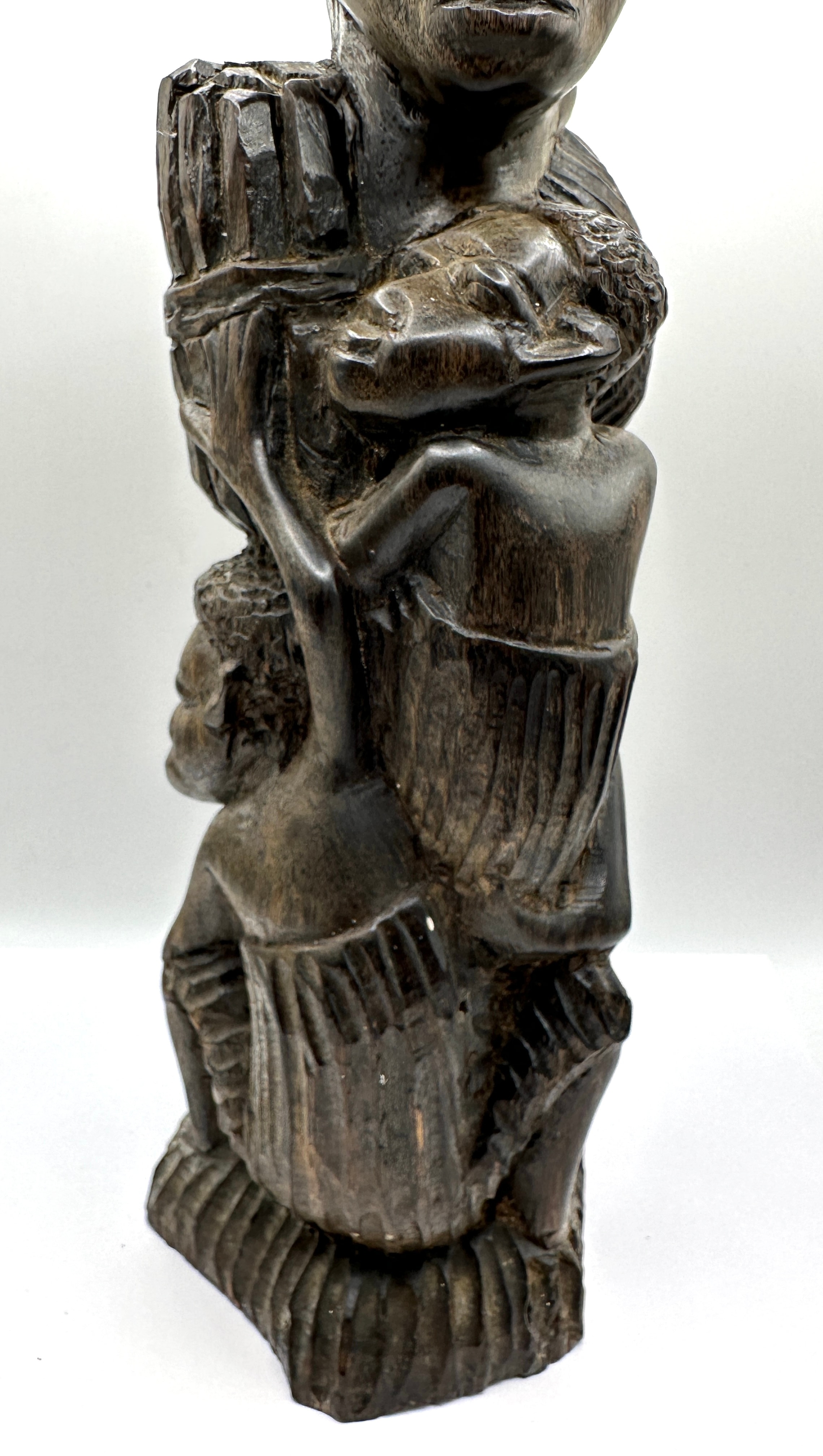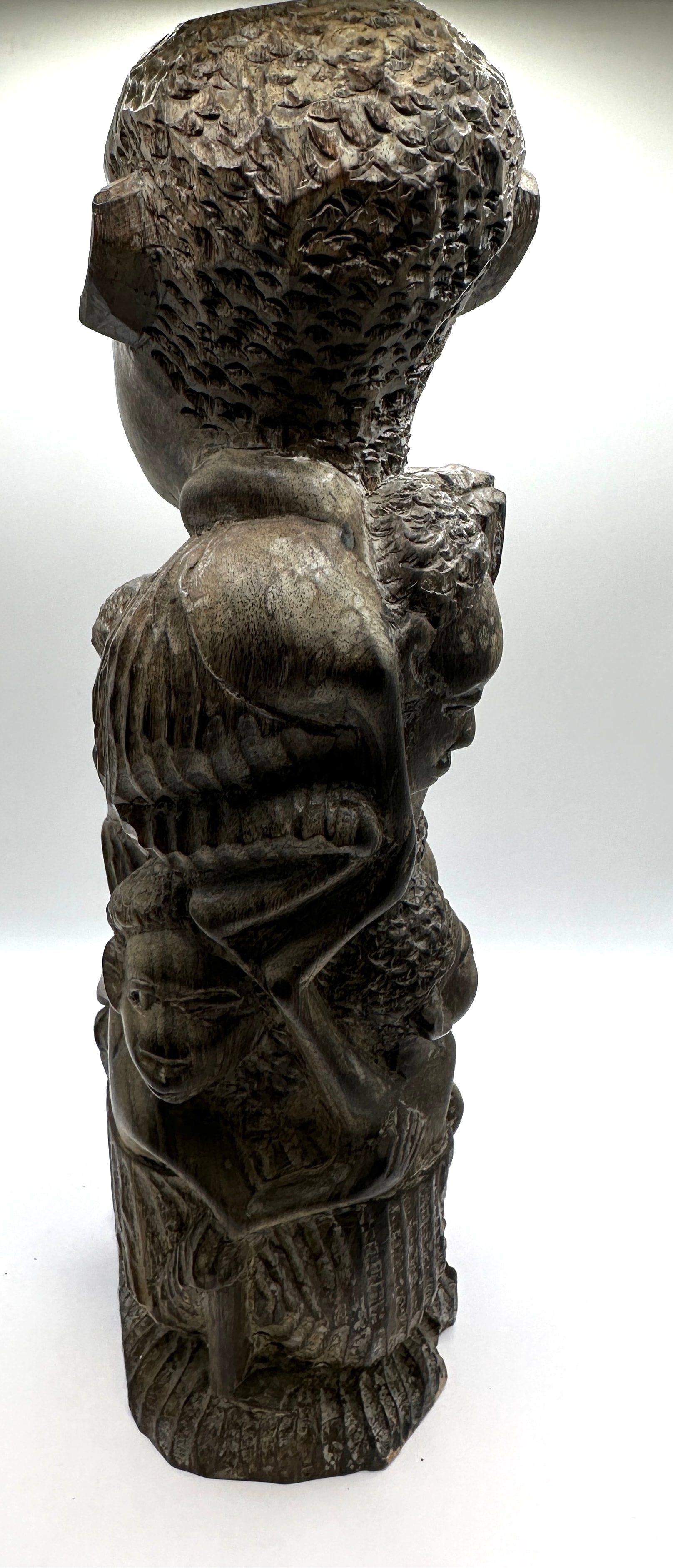 An African Makonde Tree of Life Family Ebony Wood Carving. This dark wood sculpture depicts a vertical stack of human figures in a stylized, ethnographic manner. The carving features rough-hewn textures, representing multiple individuals, with a prominent figure at the top carrying a large, textured object, supported by smaller figures below and around. No visible text or markings are present.